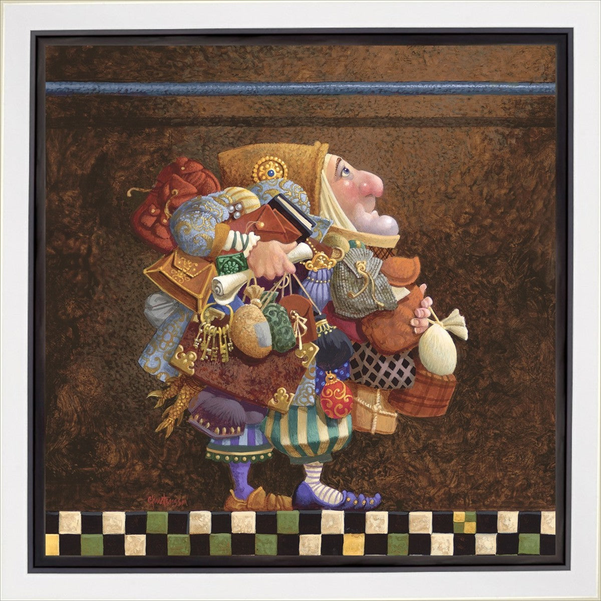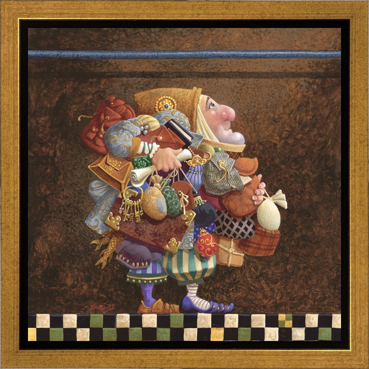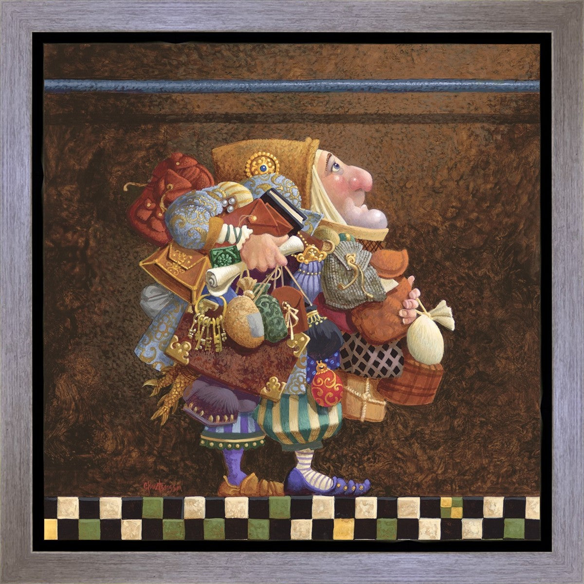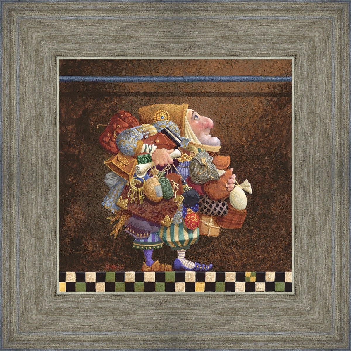 The character in "Hold to the Rod" finds himself so burdened with the mundane objects he has collected that, while he hopefully eyes the rod, he cannot reach up to hold it for fear of losing something else. The man has become little more than a vehicle for his adornments. He demonstrates that what is truly important is keeping sight of our true belief and faith, that they alone will guide us through.