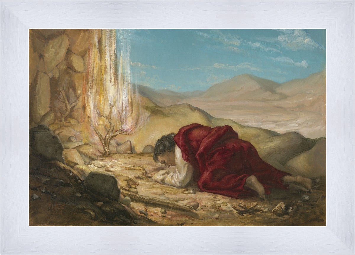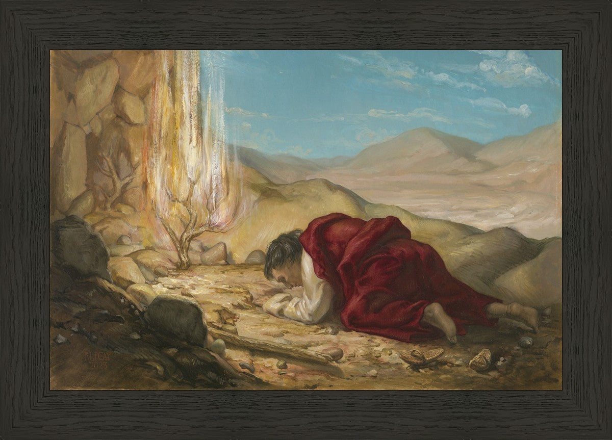 As Moses enters a holy space upon Mount Horeb, to see the bush that appears to be burning, he hears the voice of the lord speaking to him. In awe and respect he removes his sandals, and hides his face from the Lord. My desire in the creation of this work was to convey a sense of awe and reverence for the divine.