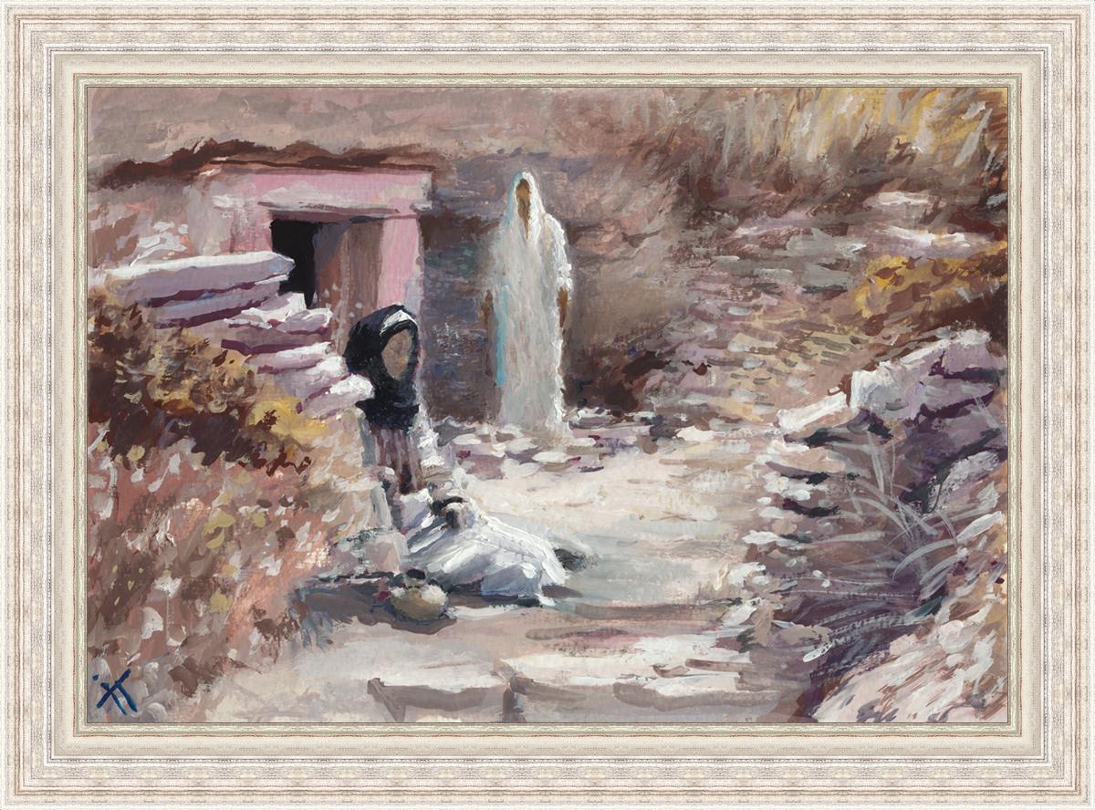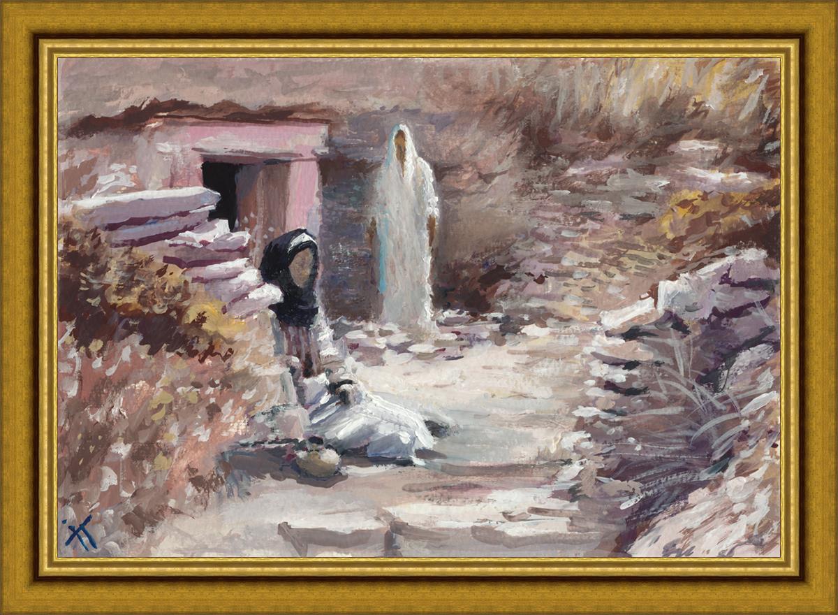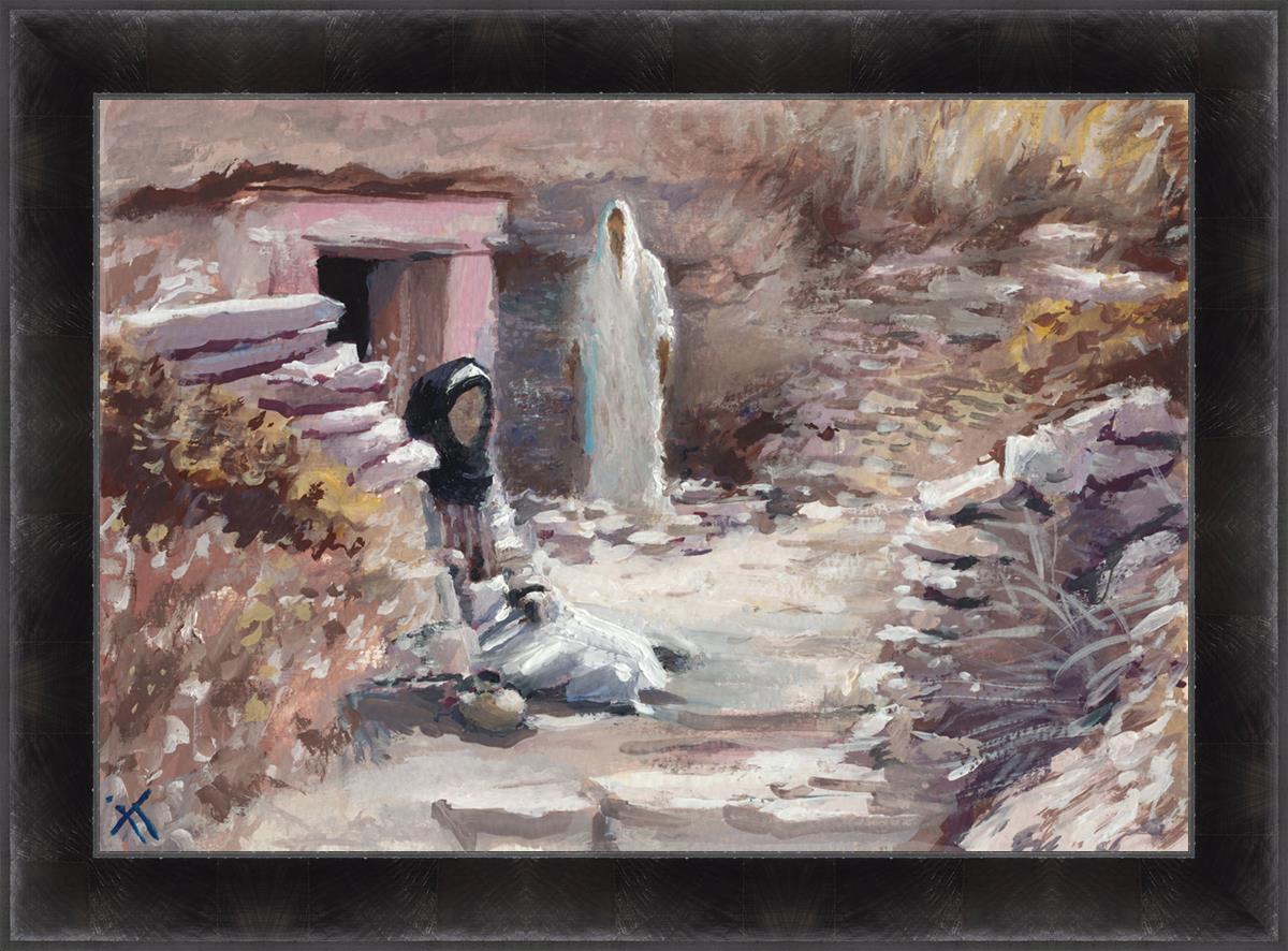This painting was a consolation gift to a sister in our Stake whose husband died. Sooner or later each of us will experience death of loved ones and will ask oneself the question "Will I still see you again?" The image of the resurrected Christ appearing to Mary is an attempt to give hope and comfort in the midst of grief and loss. This painting depicts the touching moment between grief and hopelessness and everlasting joy. It serves as a reminder that even in the darkest moments of life, there is hope and light, and that our loved ones who have passed away are not truly gone, but live on in the heavenly spheres.