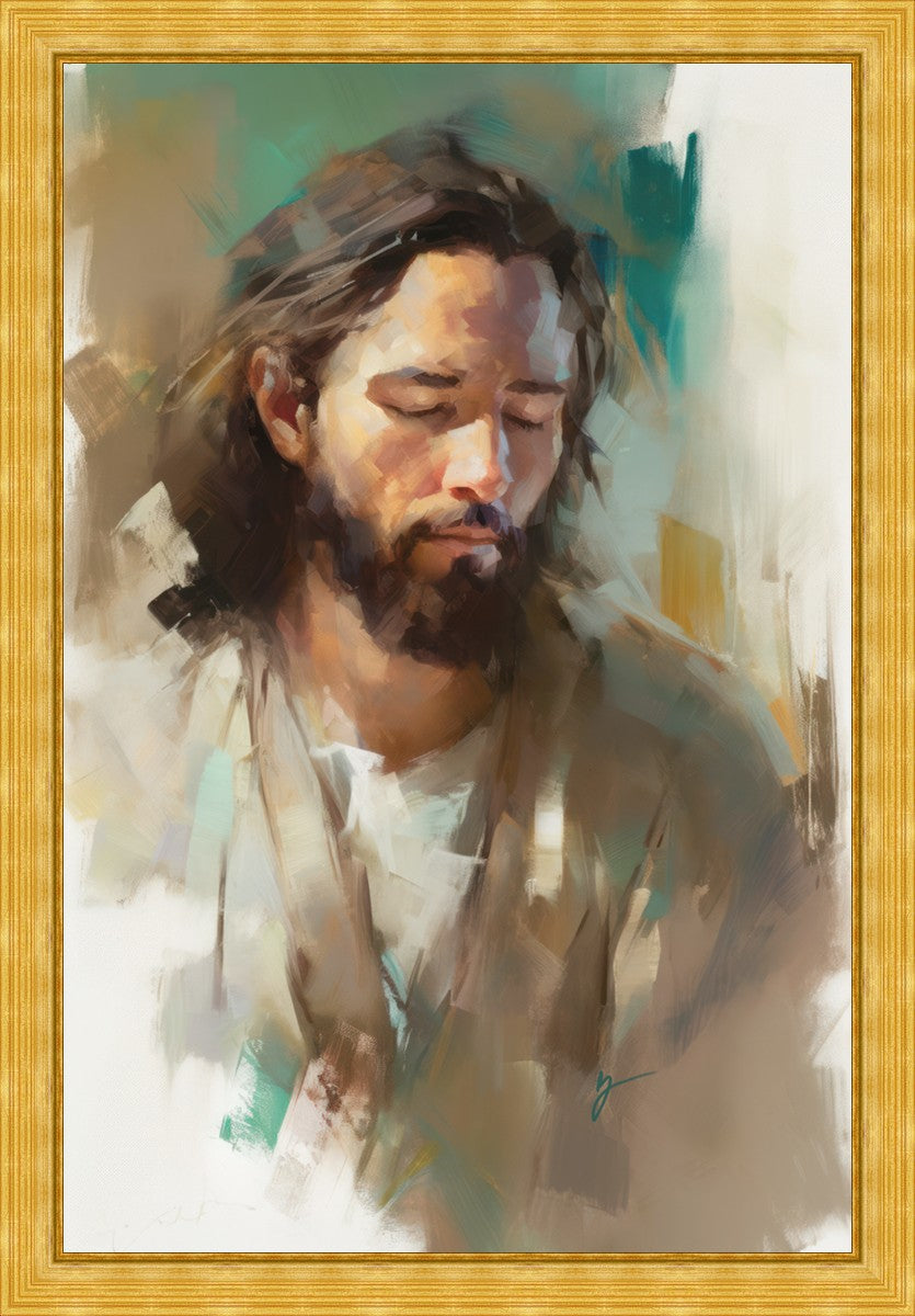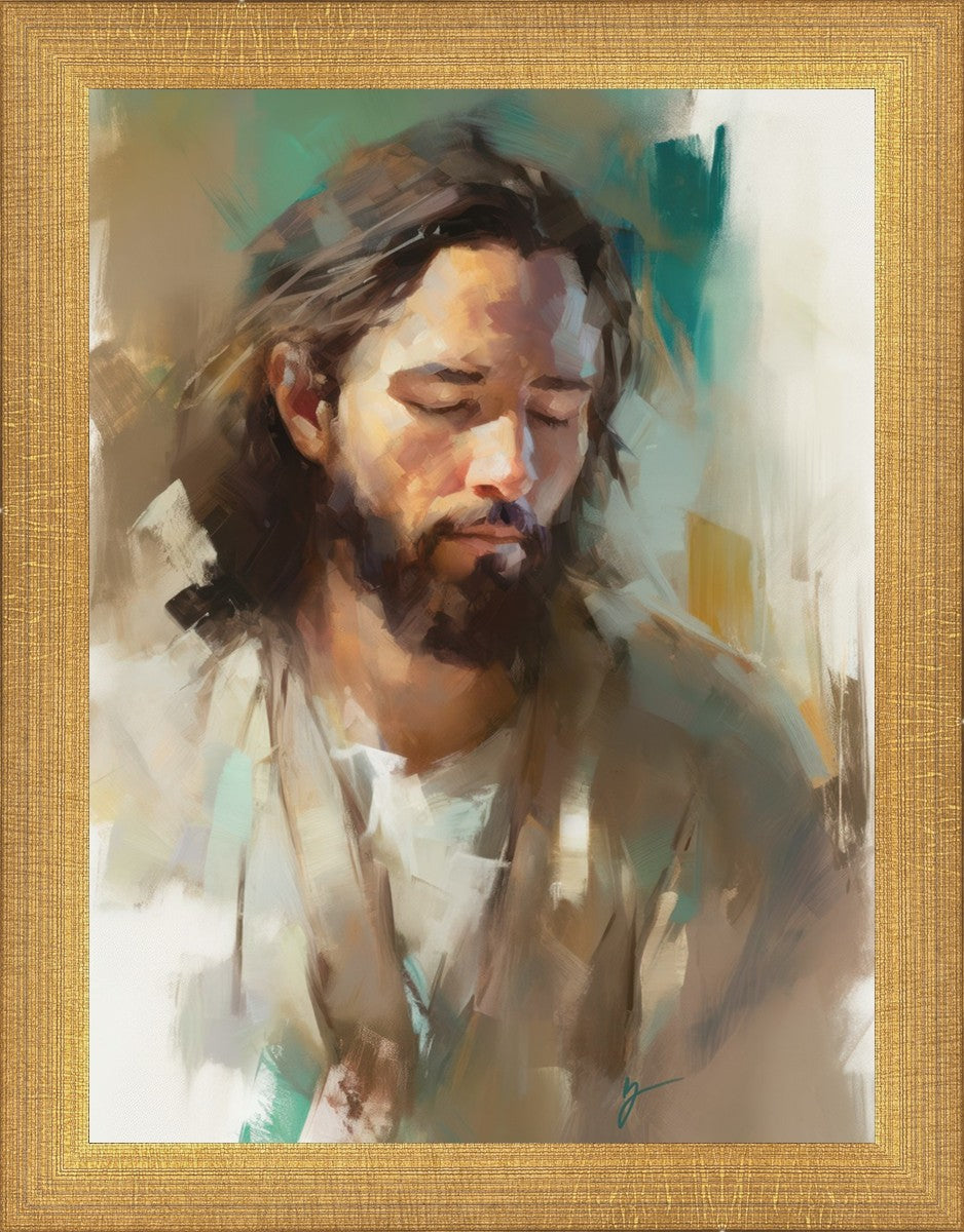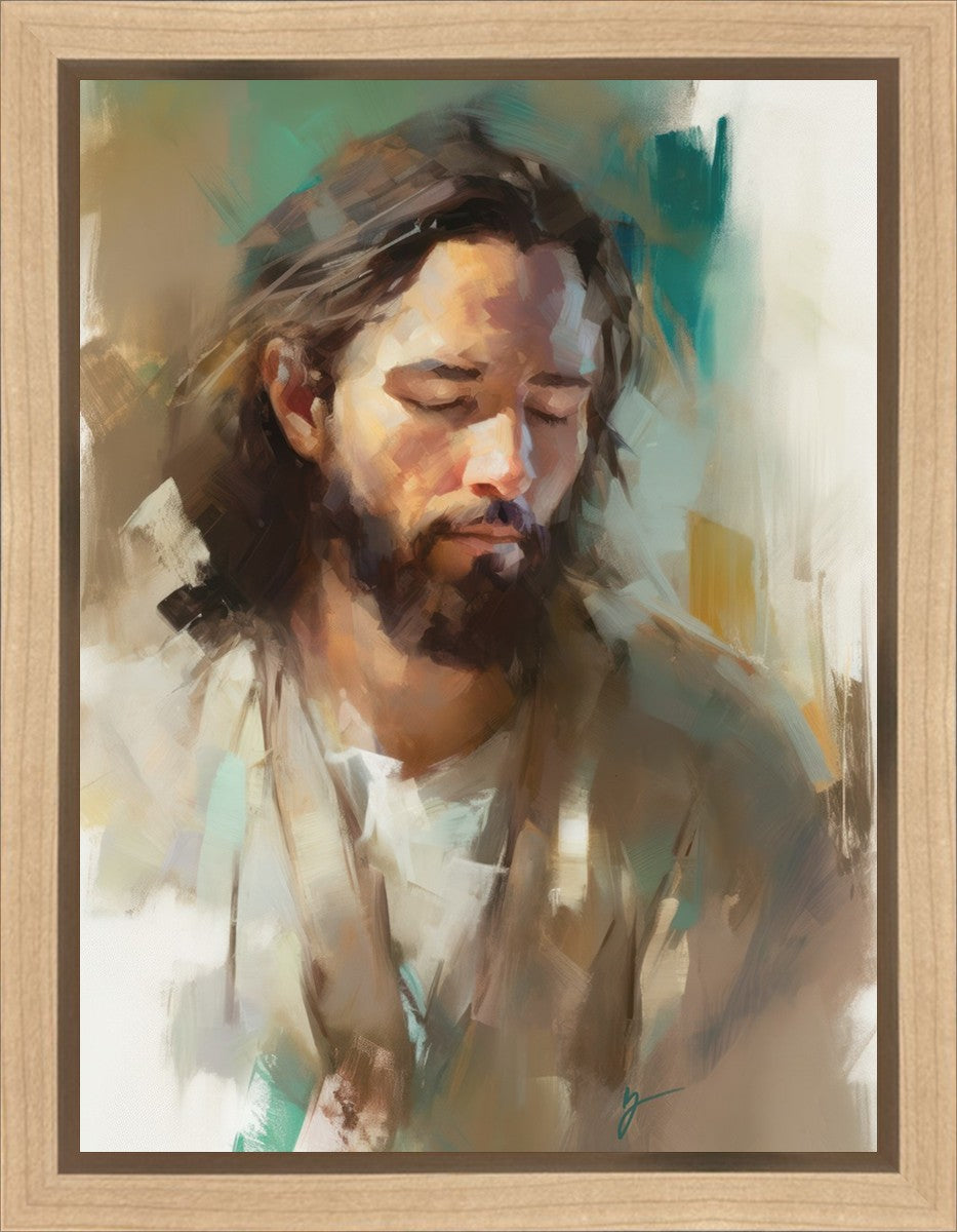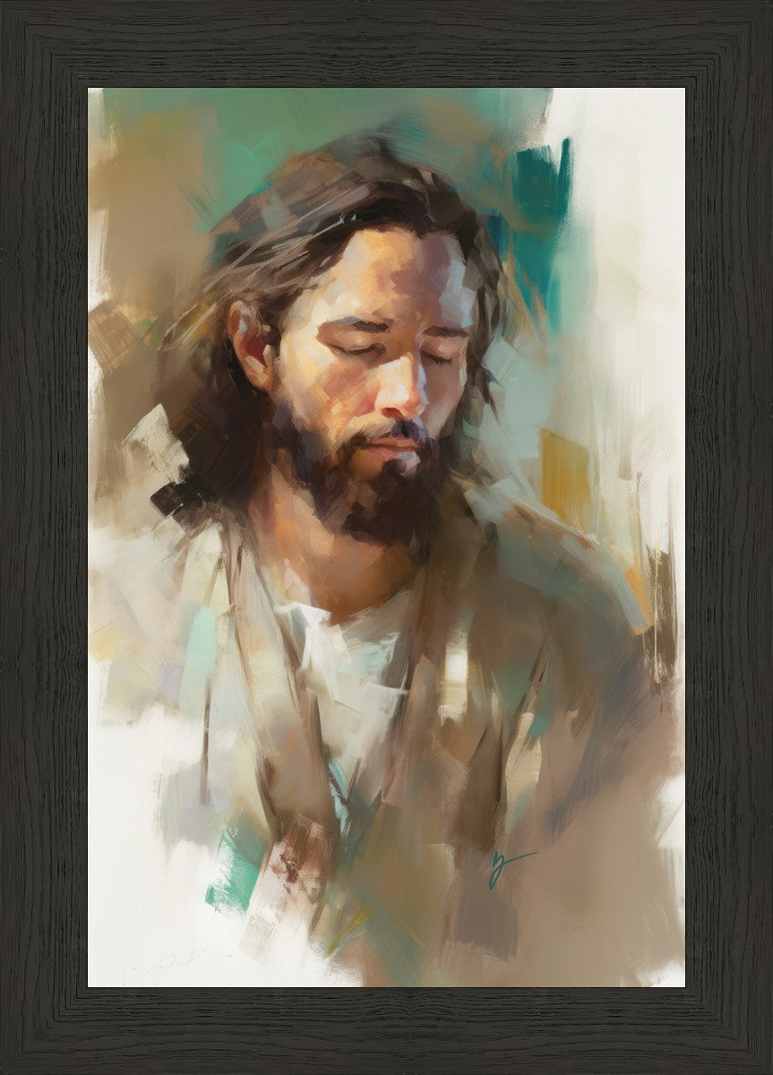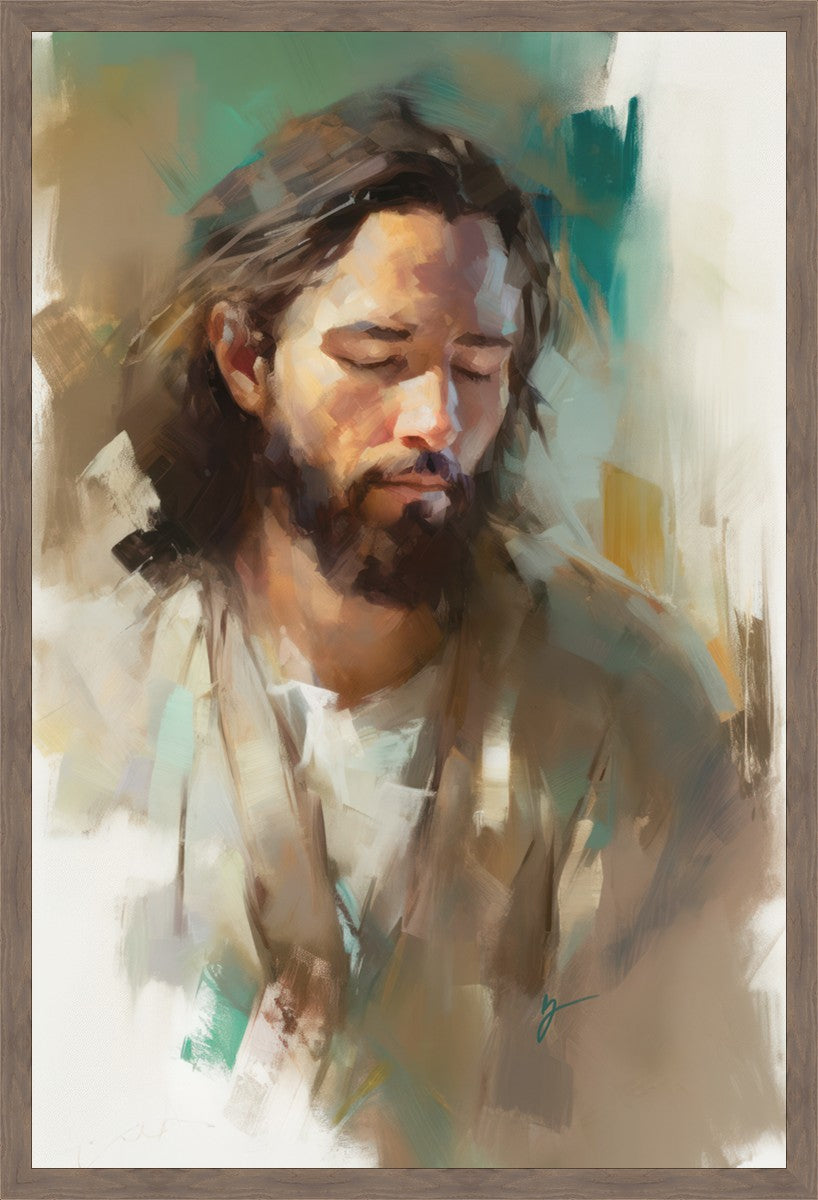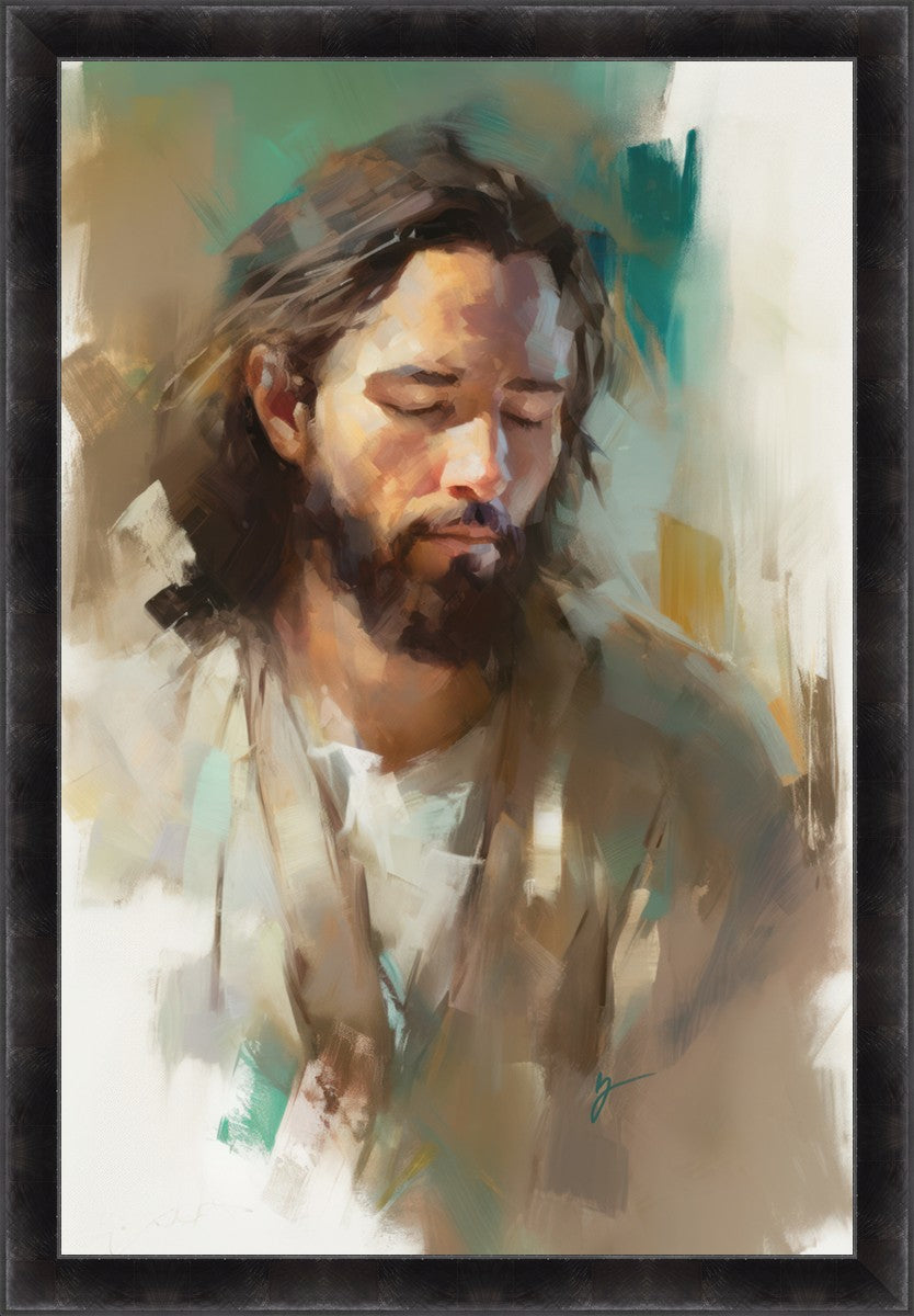 "I Am One With the Father" is a captivating abstract portrait of Jesus Christ. With its delicate loose brushwork and harmonious green and brown tones, this artwork radiates a sense of reverence and spiritual connection. Jesus, in deep communion with His Father, bows His head and closes His eyes, inviting us to join Him in unity. His heartfelt prayer echoes the desire for us to become one with Him, just as He is one with the Father.