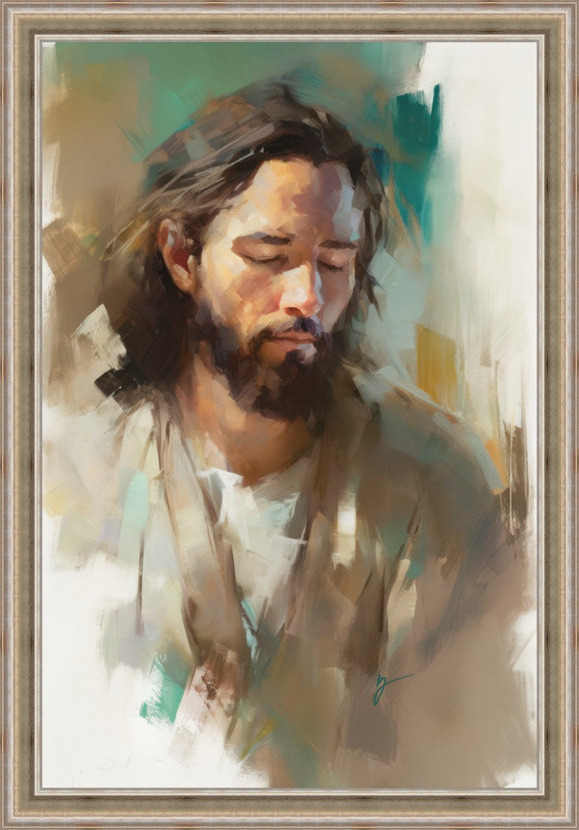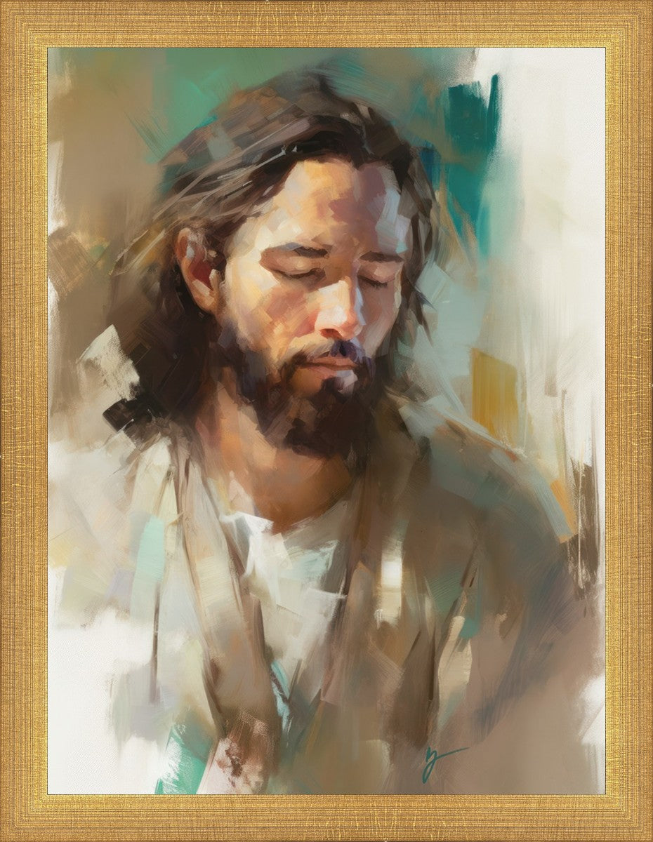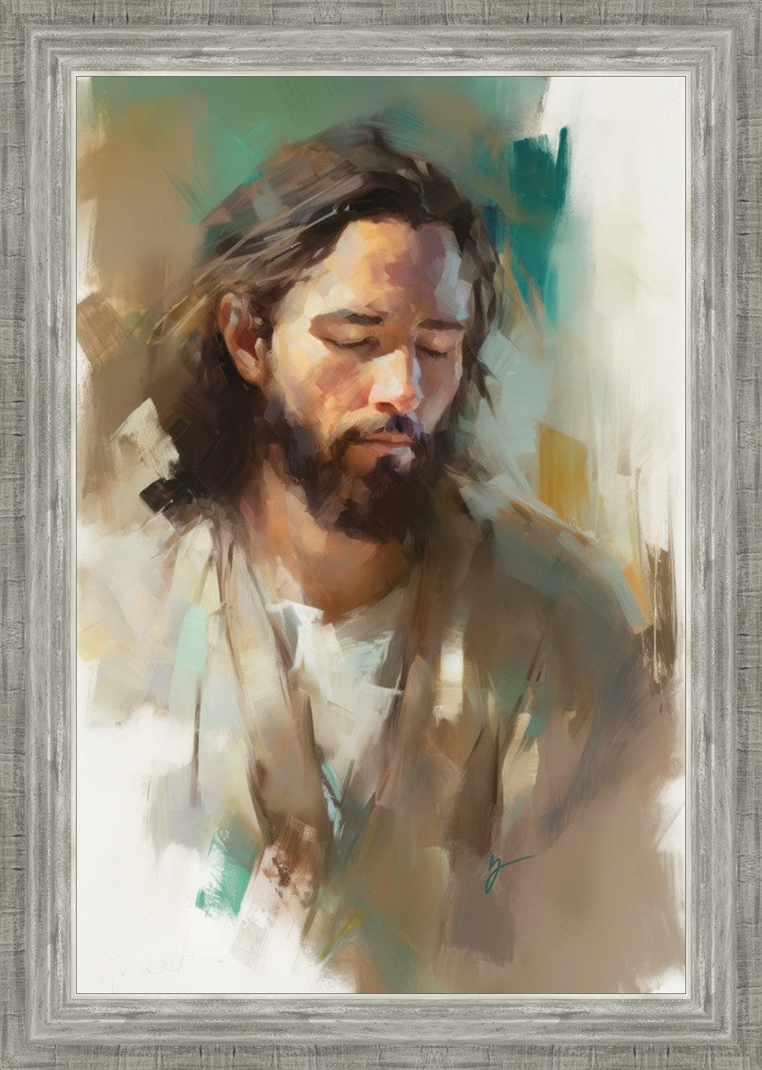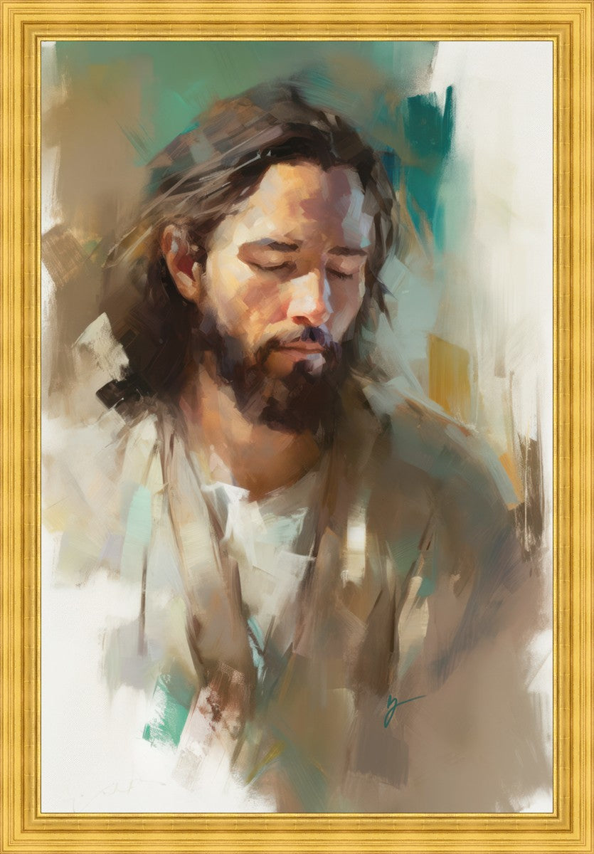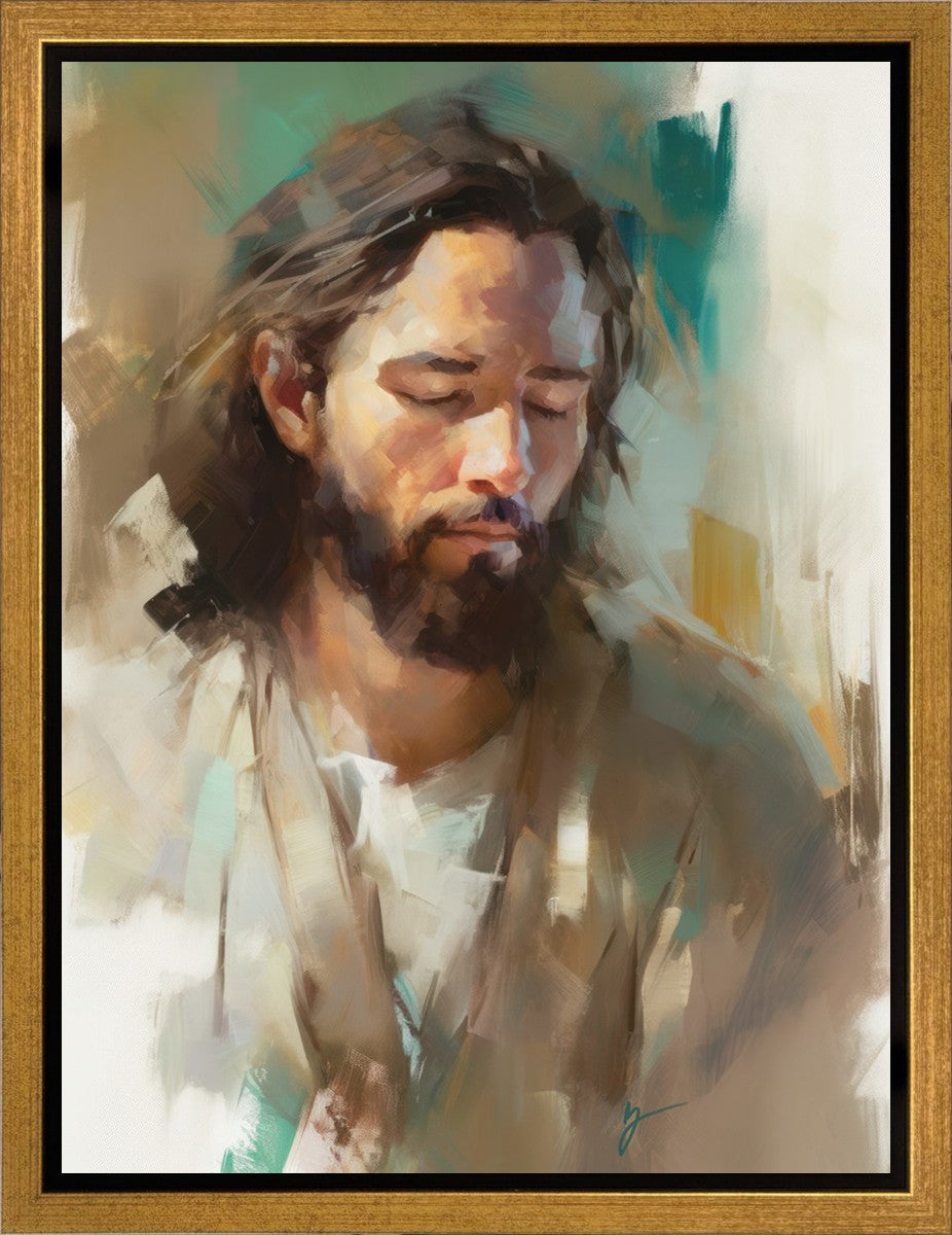 "I Am One With the Father" is a captivating abstract portrait of Jesus Christ. With its delicate loose brushwork and harmonious green and brown tones, this artwork radiates a sense of reverence and spiritual connection. Jesus, in deep communion with His Father, bows His head and closes His eyes, inviting us to join Him in unity. His heartfelt prayer echoes the desire for us to become one with Him, just as He is one with the Father.