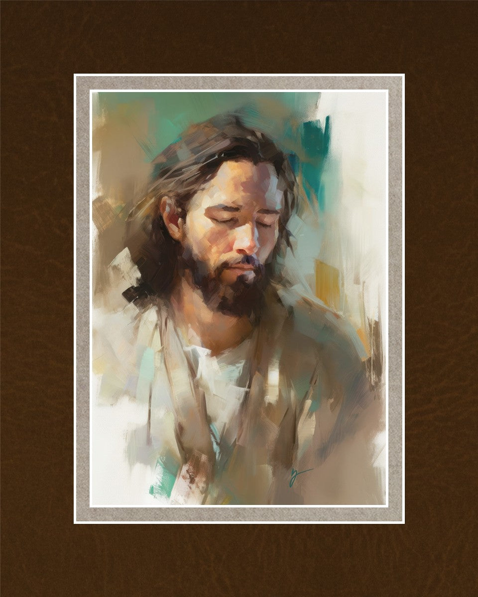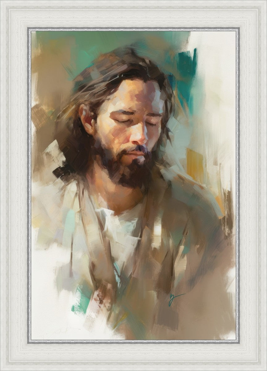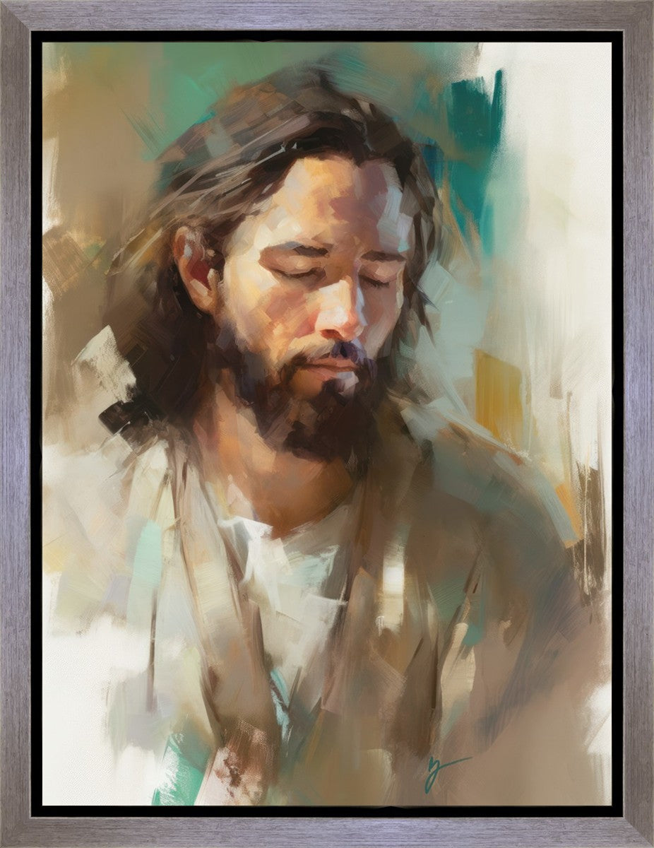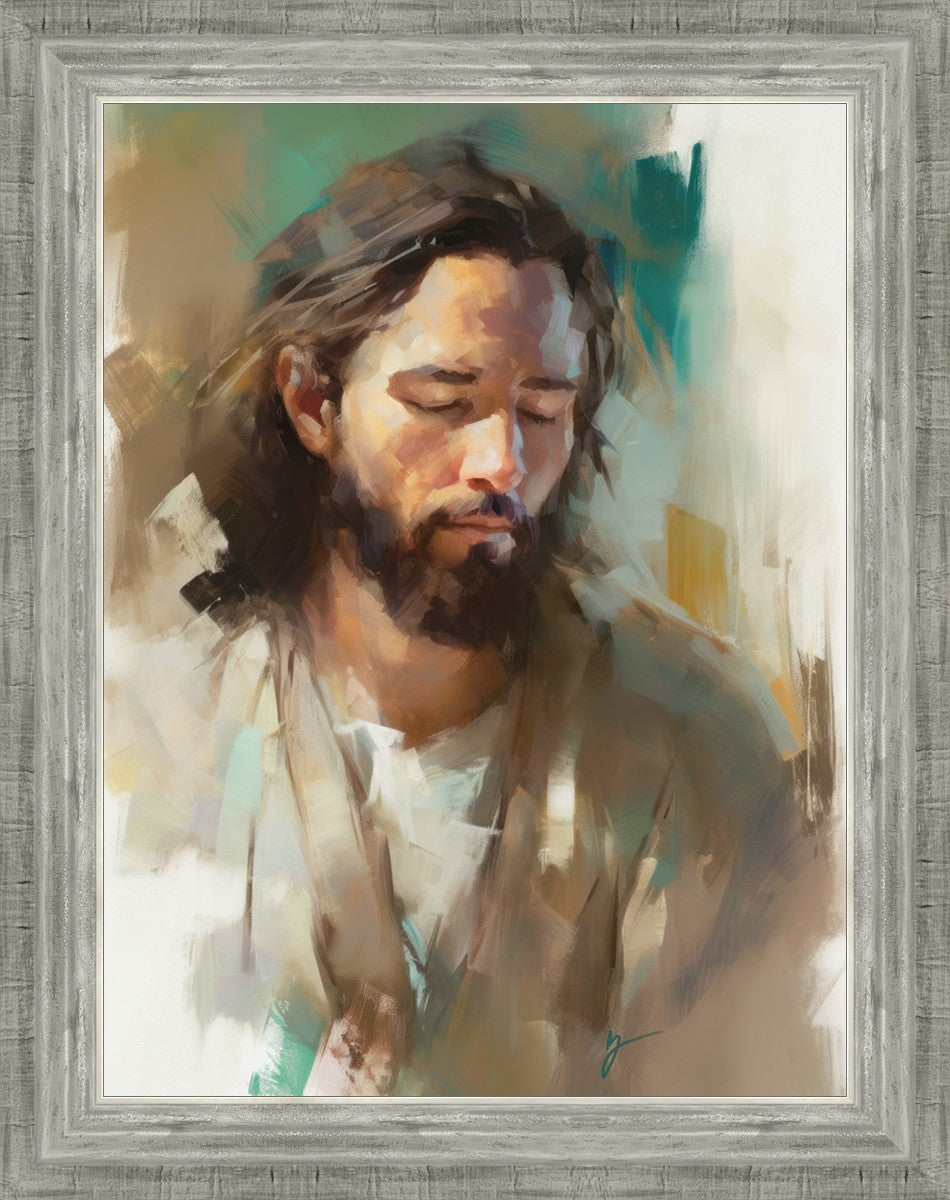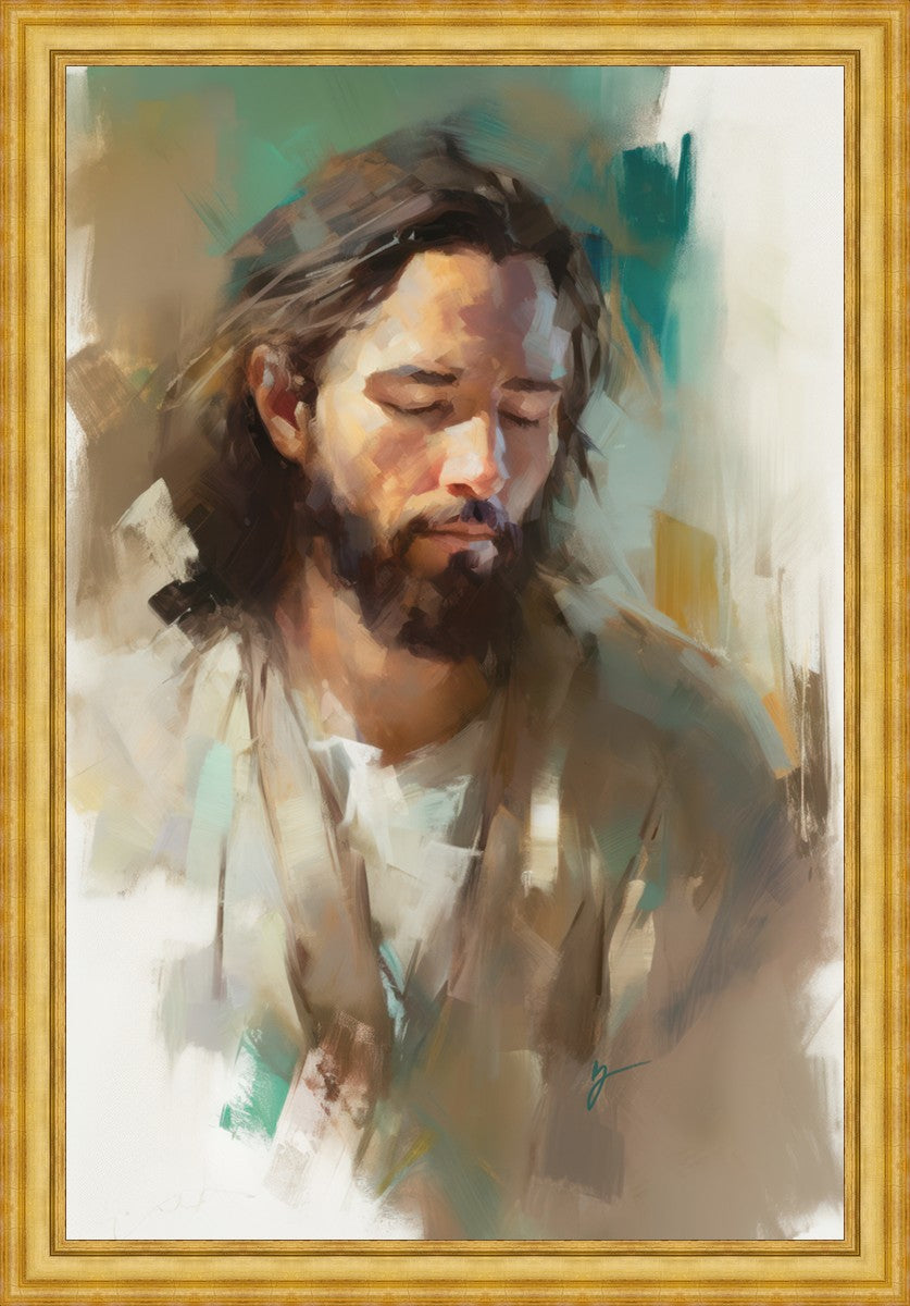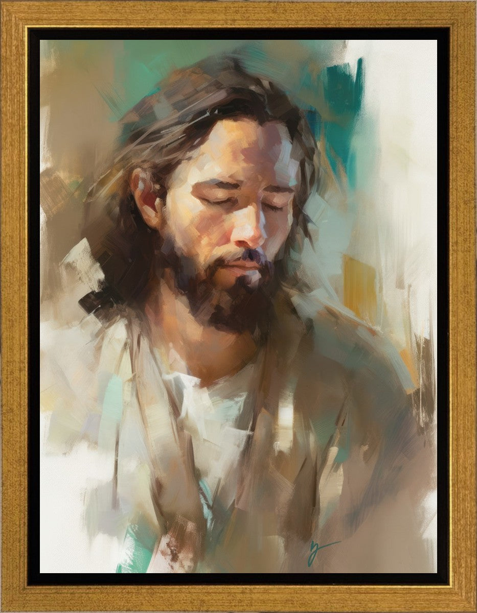"I Am One With the Father" is a captivating abstract portrait of Jesus Christ. With its delicate loose brushwork and harmonious green and brown tones, this artwork radiates a sense of reverence and spiritual connection. Jesus, in deep communion with His Father, bows His head and closes His eyes, inviting us to join Him in unity. His heartfelt prayer echoes the desire for us to become one with Him, just as He is one with the Father.