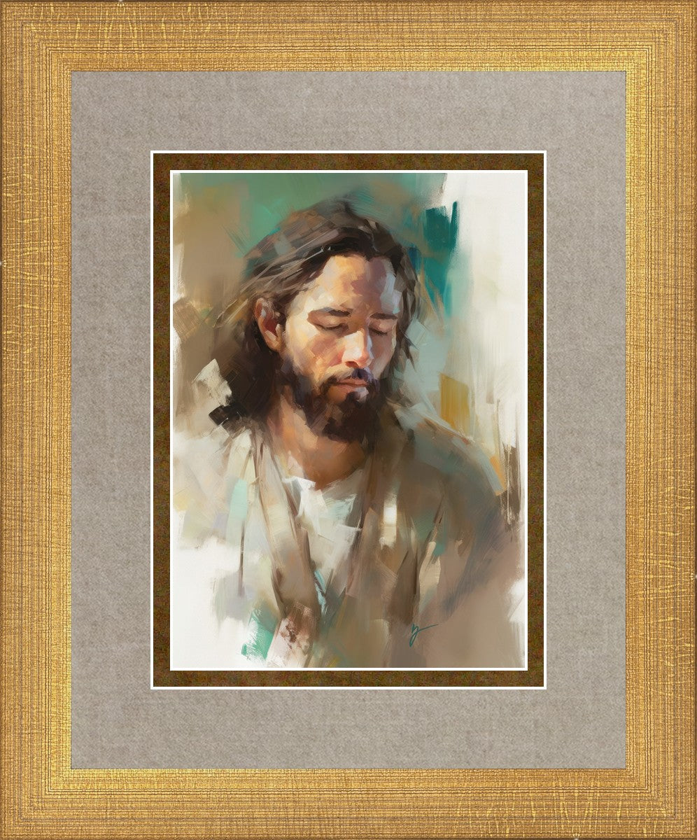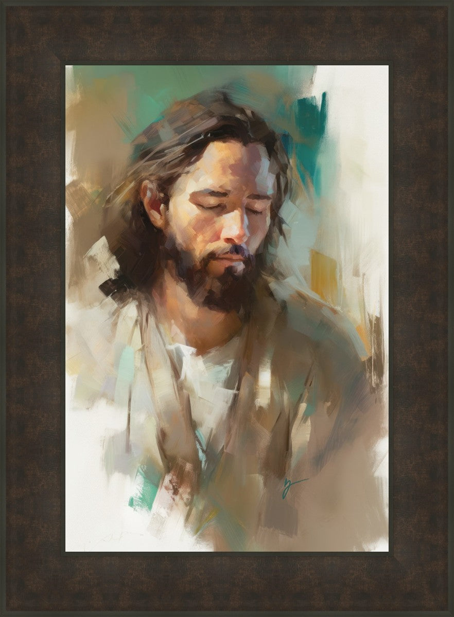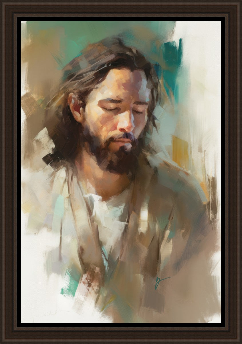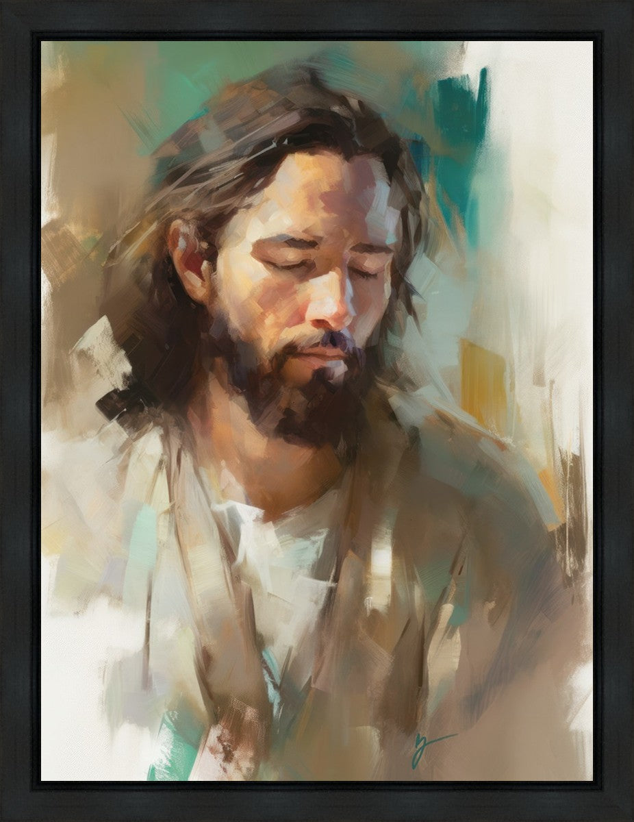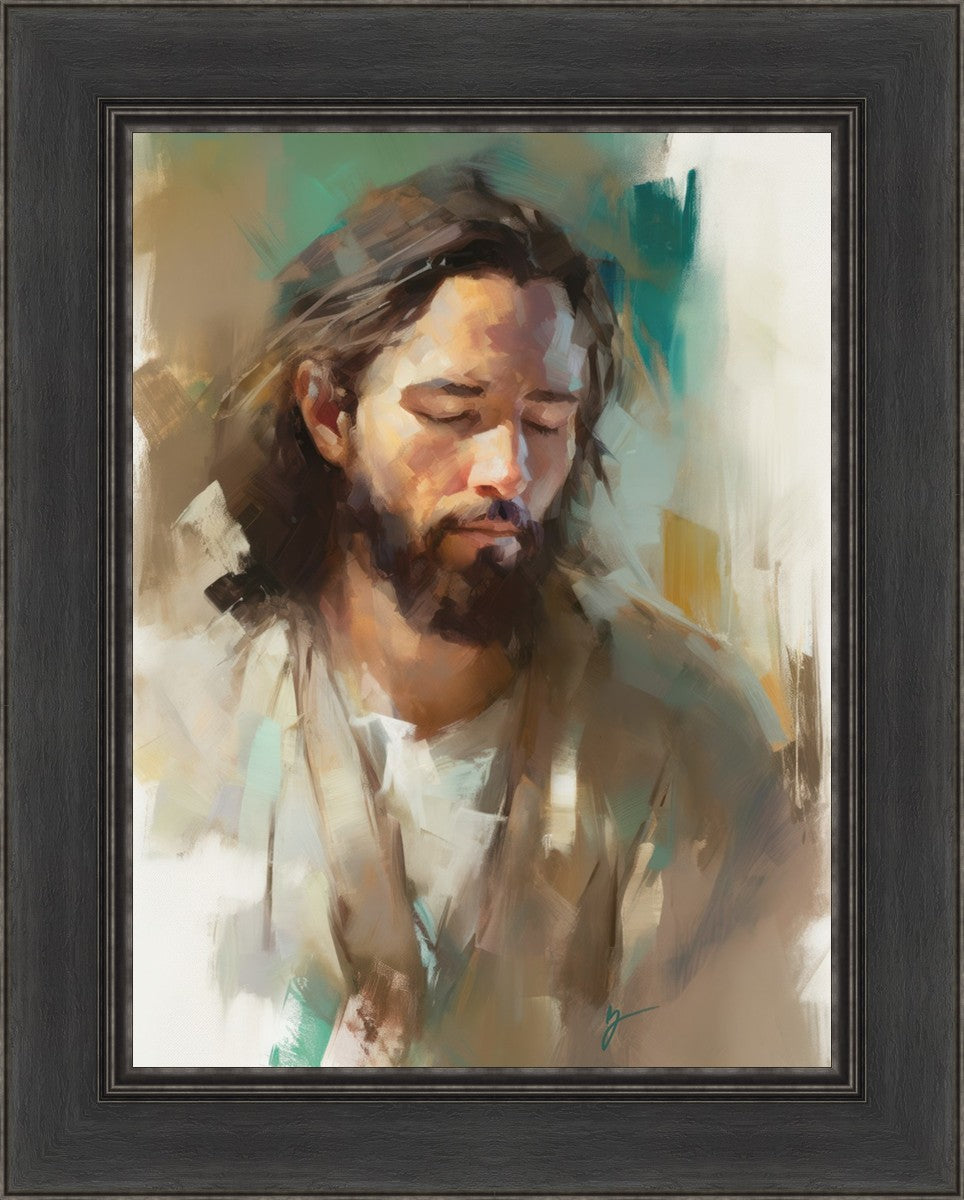 "I Am One With the Father" is a captivating abstract portrait of Jesus Christ. With its delicate loose brushwork and harmonious green and brown tones, this artwork radiates a sense of reverence and spiritual connection. Jesus, in deep communion with His Father, bows His head and closes His eyes, inviting us to join Him in unity. His heartfelt prayer echoes the desire for us to become one with Him, just as He is one with the Father.
