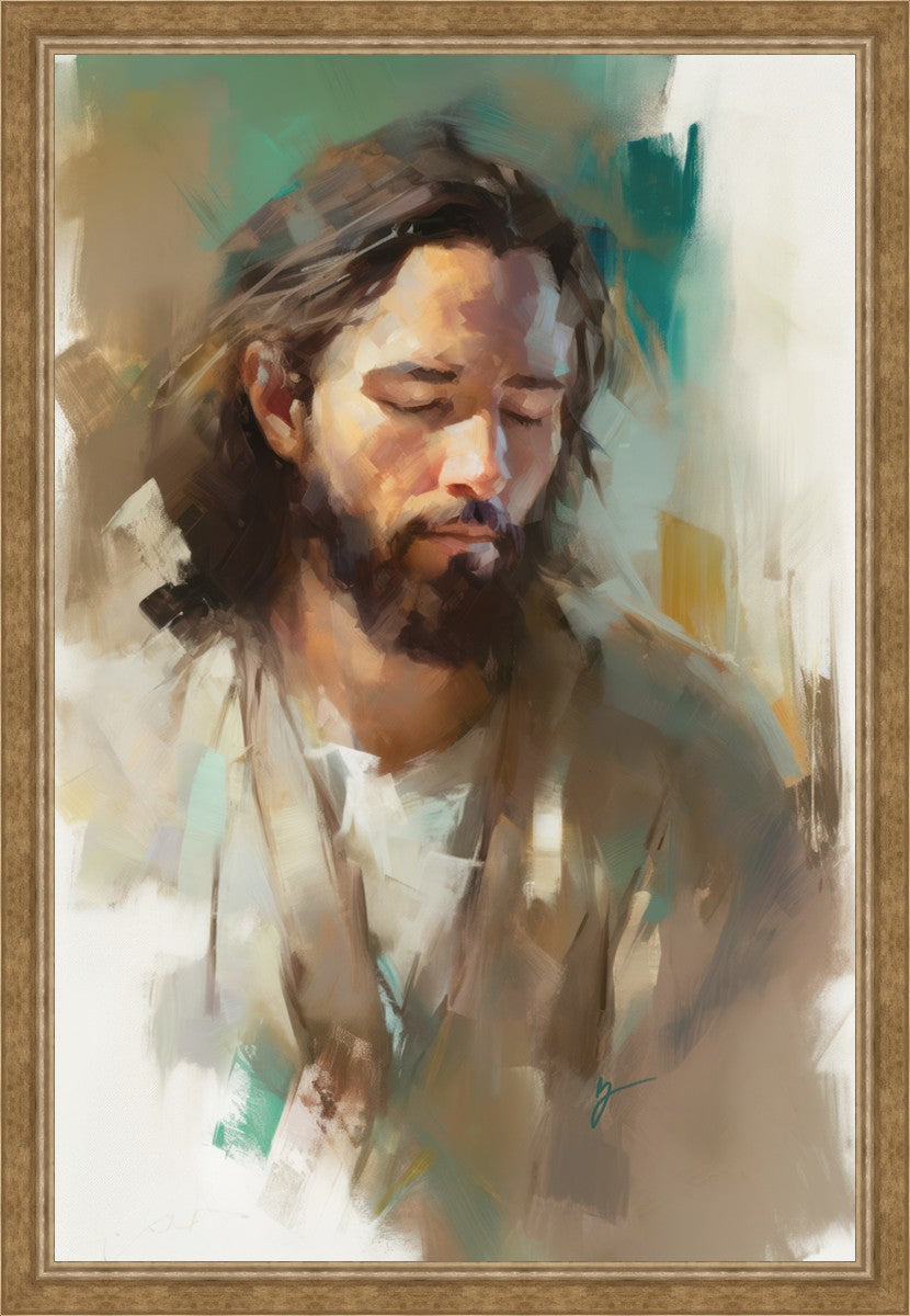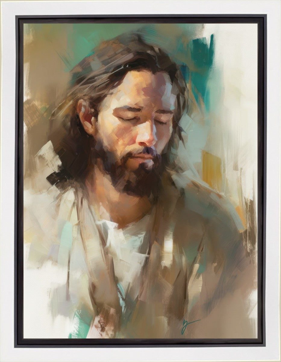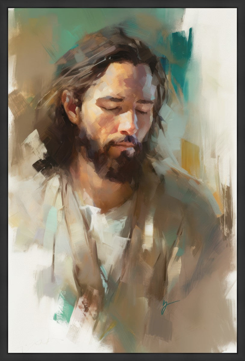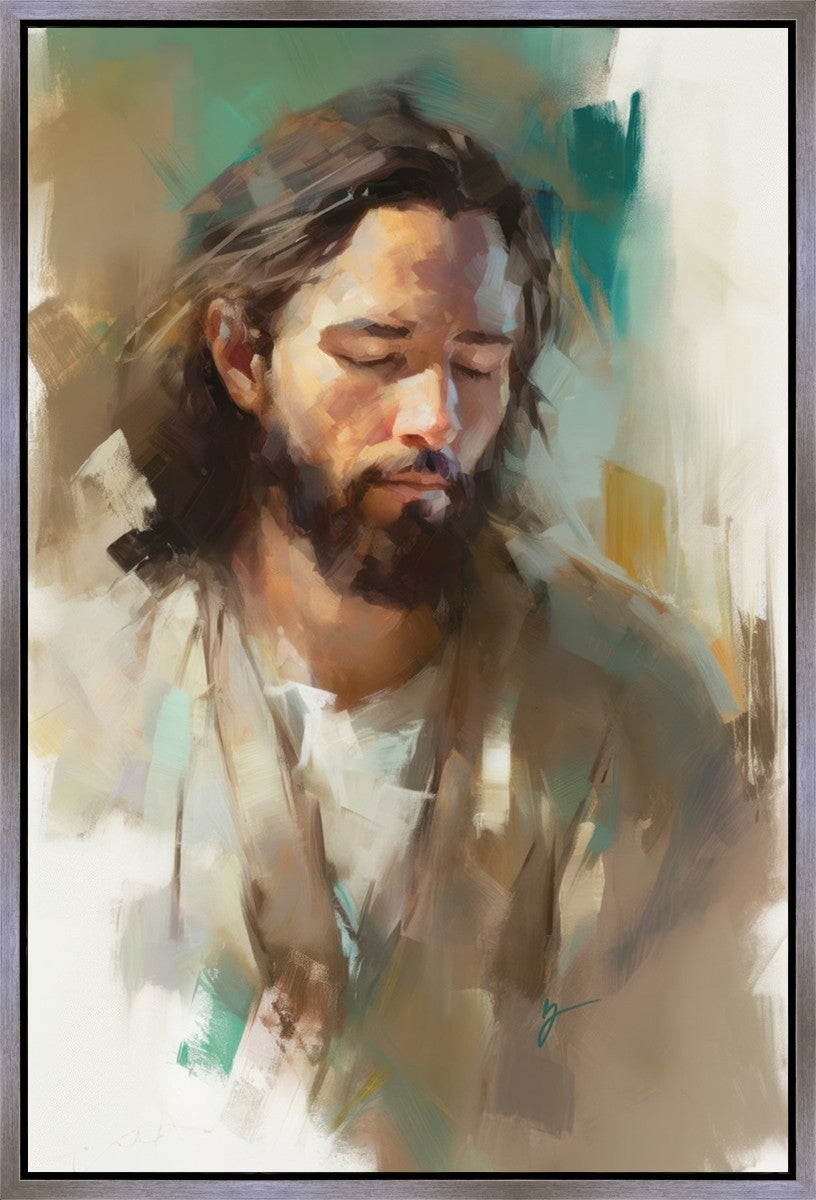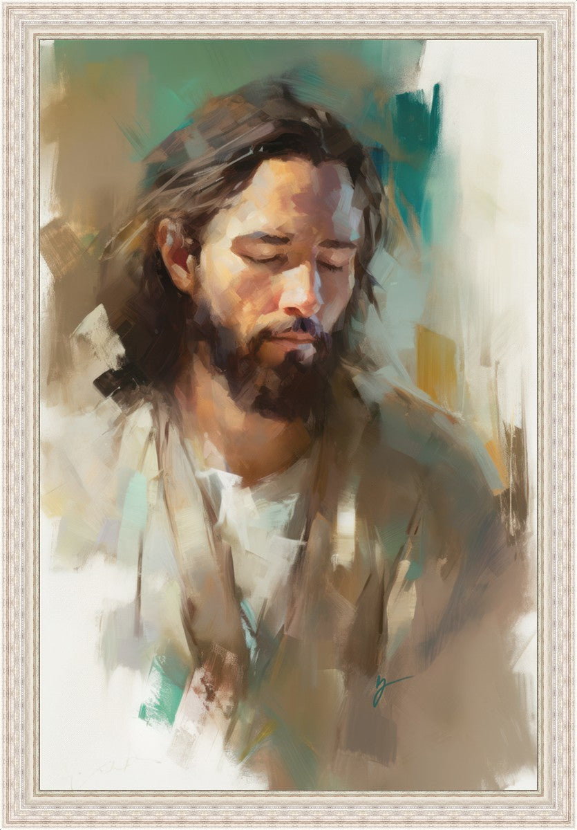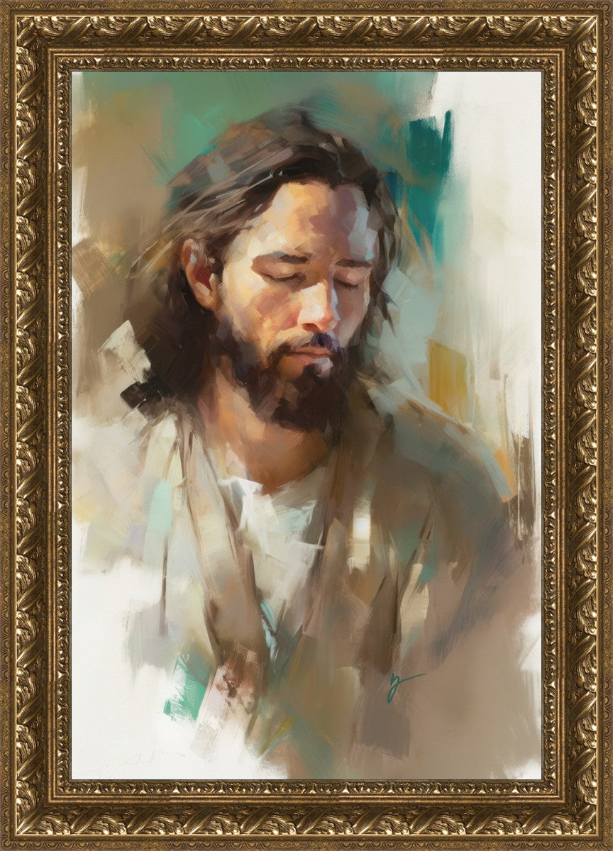 "I Am One With the Father" is a captivating abstract portrait of Jesus Christ. With its delicate loose brushwork and harmonious green and brown tones, this artwork radiates a sense of reverence and spiritual connection. Jesus, in deep communion with His Father, bows His head and closes His eyes, inviting us to join Him in unity. His heartfelt prayer echoes the desire for us to become one with Him, just as He is one with the Father.