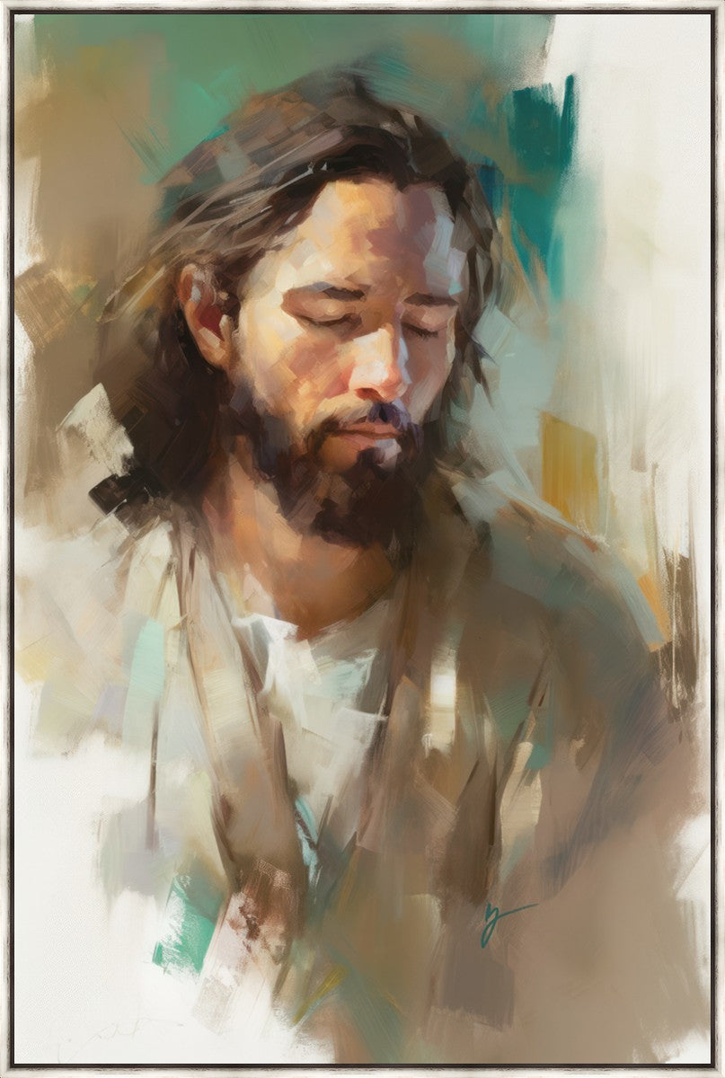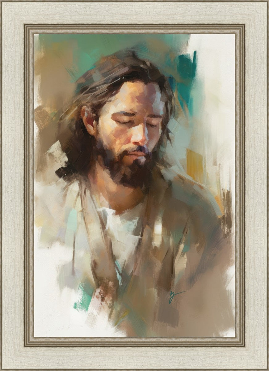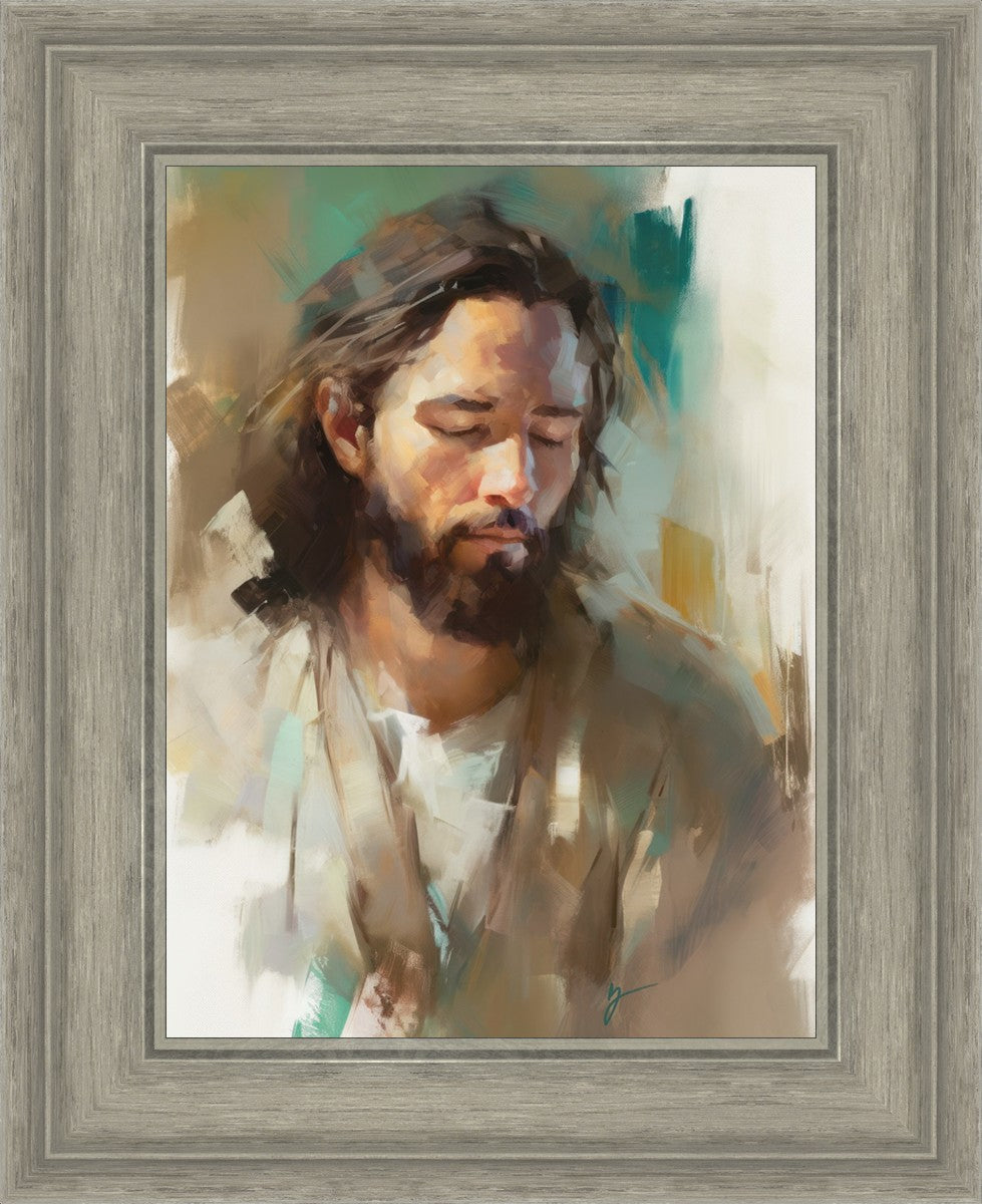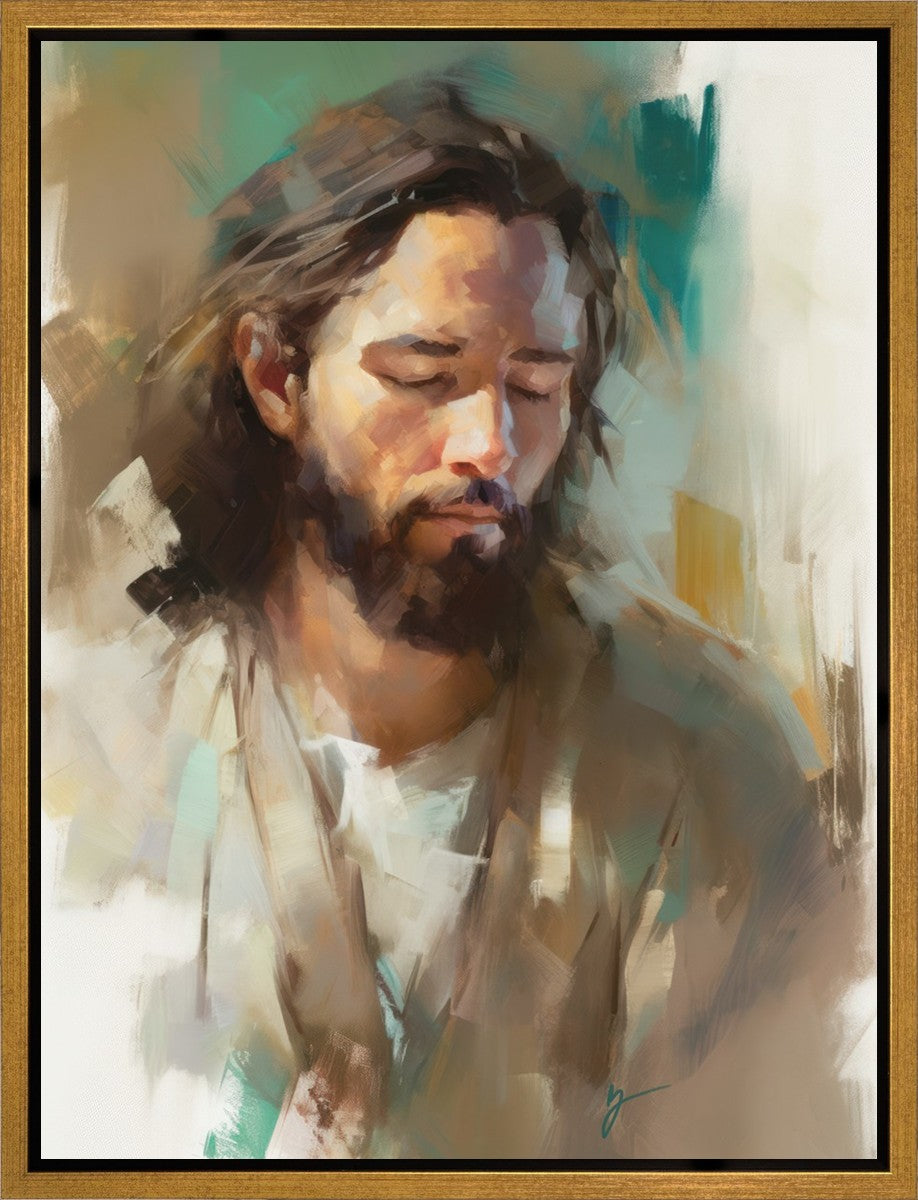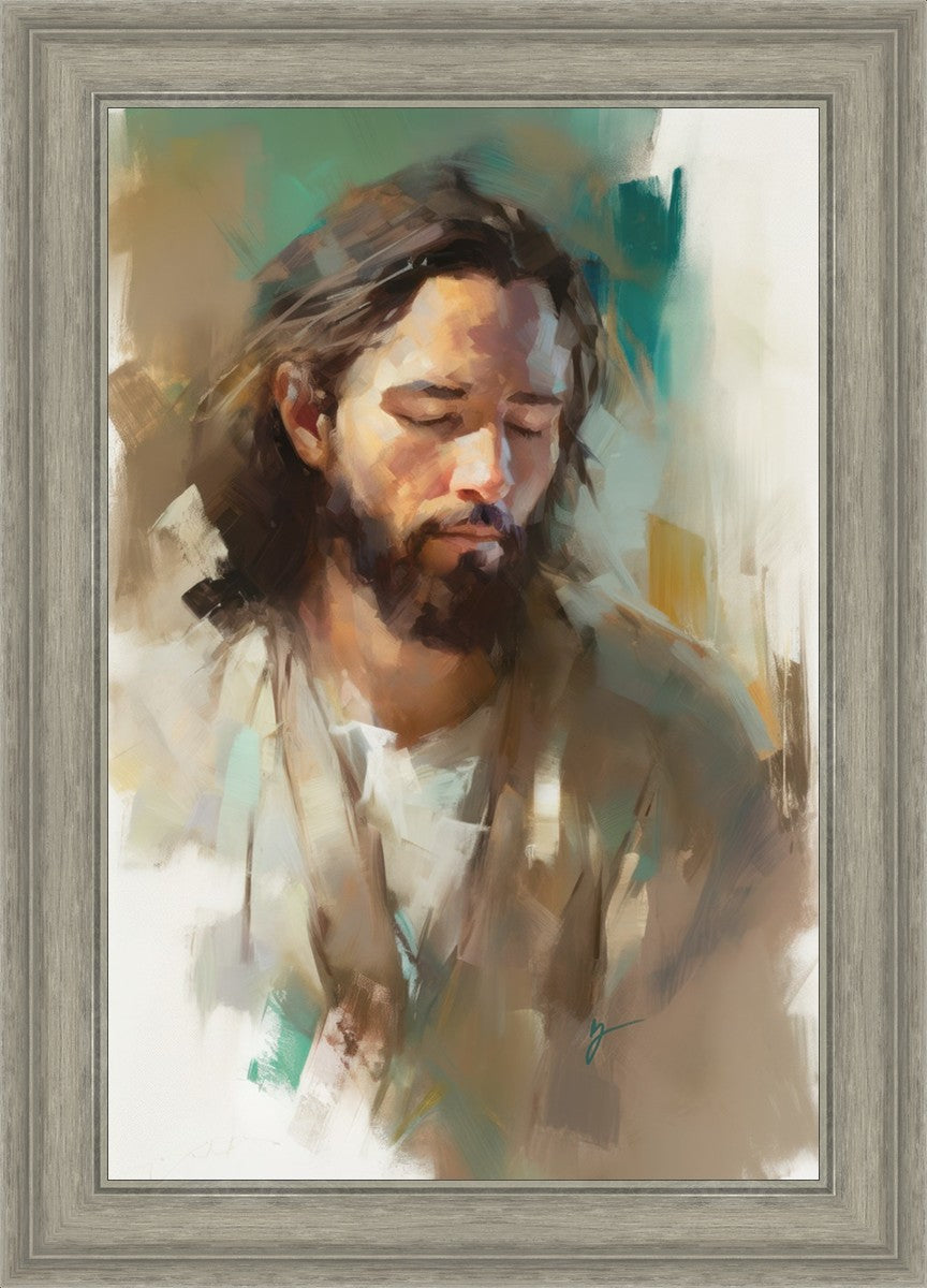 "I Am One With the Father" is a captivating abstract portrait of Jesus Christ. With its delicate loose brushwork and harmonious green and brown tones, this artwork radiates a sense of reverence and spiritual connection. Jesus, in deep communion with His Father, bows His head and closes His eyes, inviting us to join Him in unity. His heartfelt prayer echoes the desire for us to become one with Him, just as He is one with the Father.