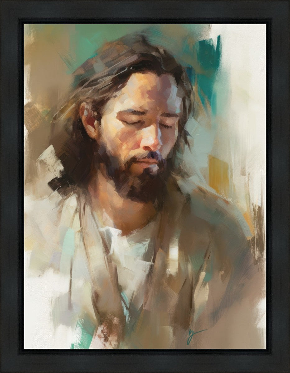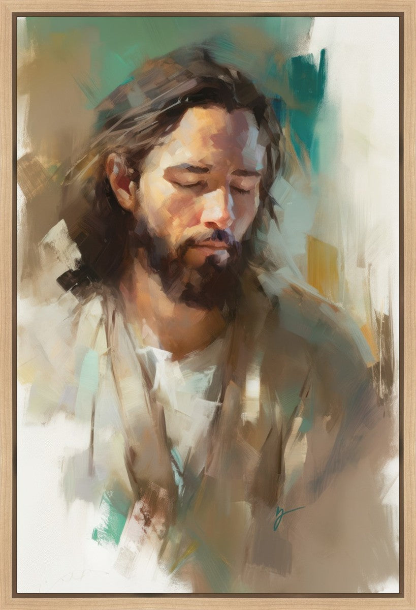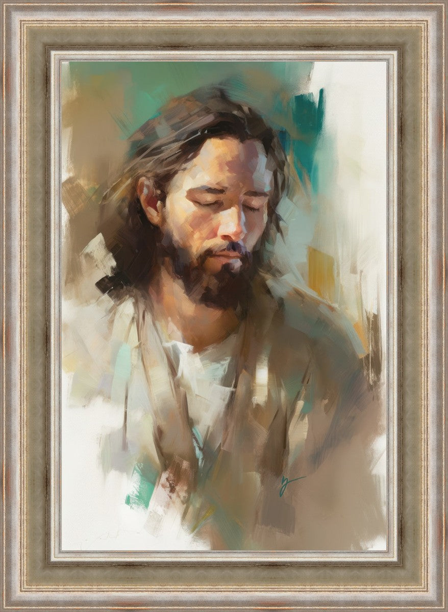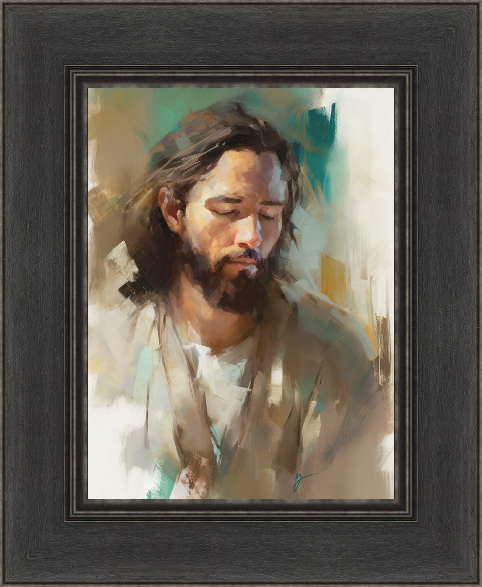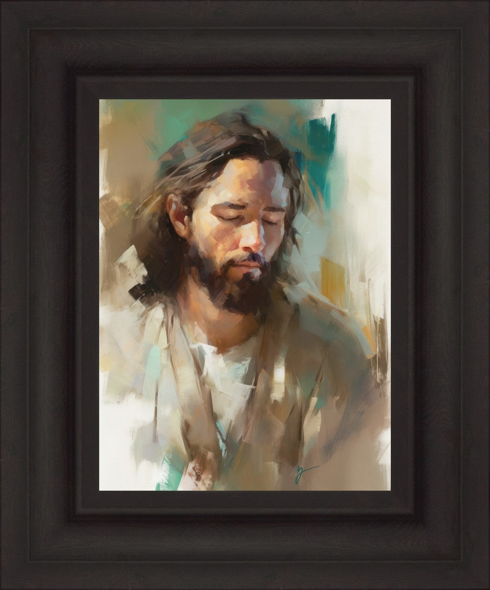 "I Am One With the Father" is a captivating abstract portrait of Jesus Christ. With its delicate loose brushwork and harmonious green and brown tones, this artwork radiates a sense of reverence and spiritual connection. Jesus, in deep communion with His Father, bows His head and closes His eyes, inviting us to join Him in unity. His heartfelt prayer echoes the desire for us to become one with Him, just as He is one with the Father.