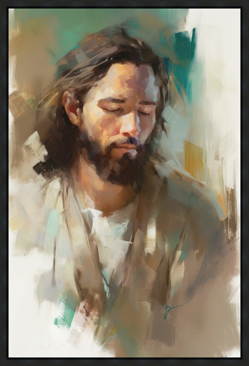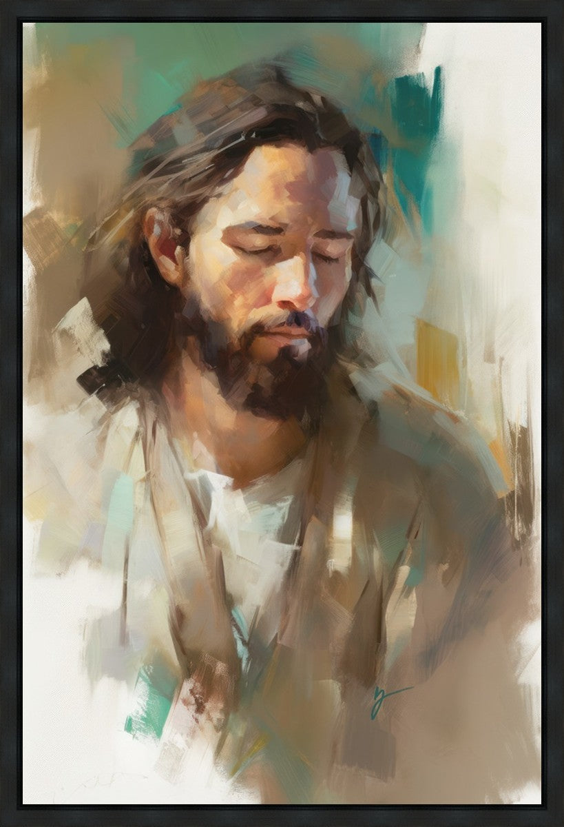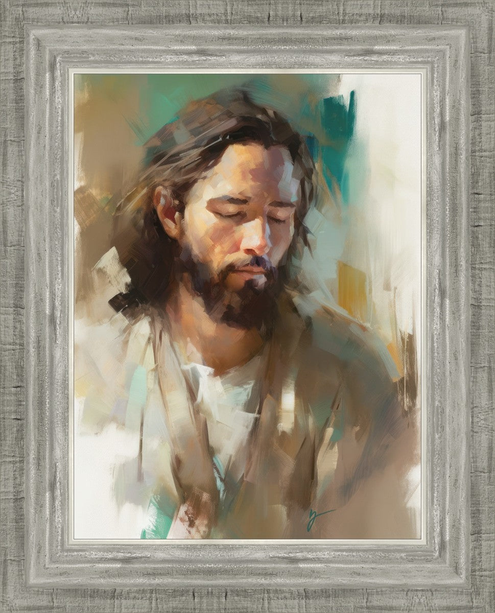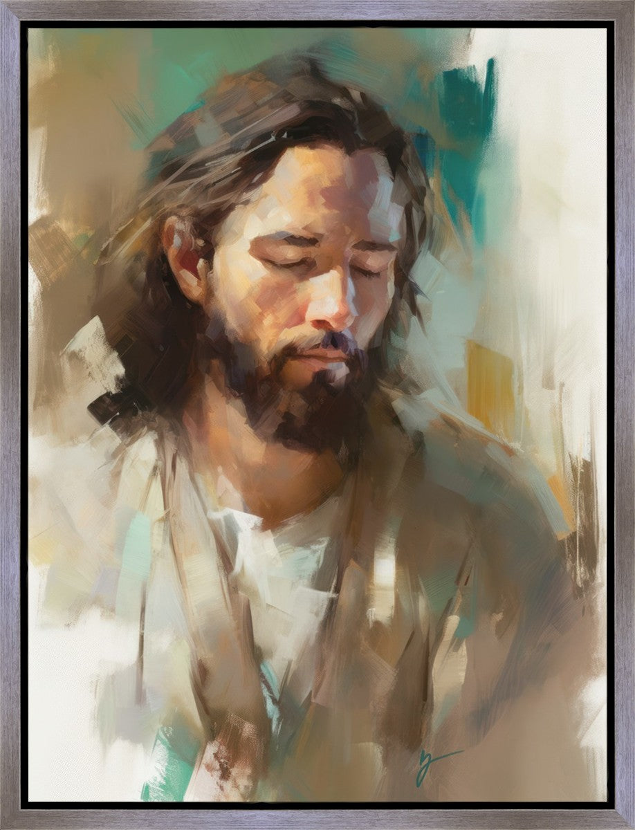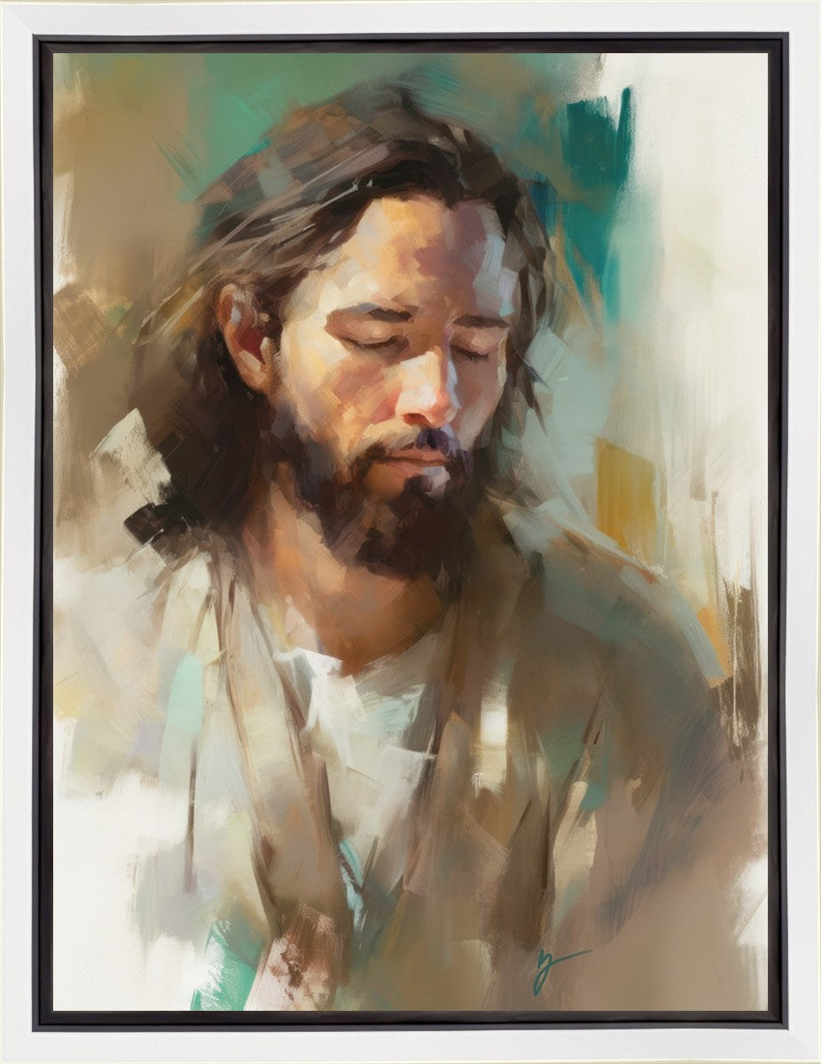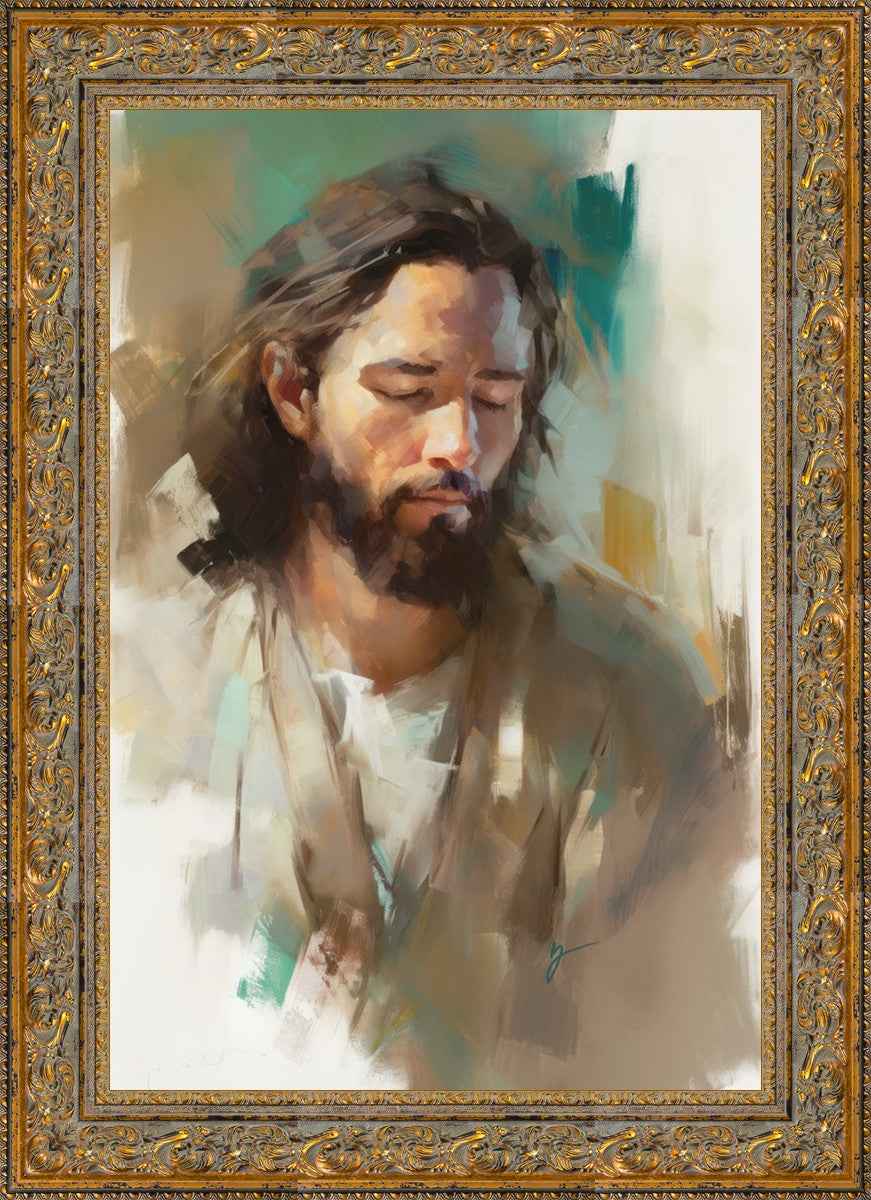 "I Am One With the Father" is a captivating abstract portrait of Jesus Christ. With its delicate loose brushwork and harmonious green and brown tones, this artwork radiates a sense of reverence and spiritual connection. Jesus, in deep communion with His Father, bows His head and closes His eyes, inviting us to join Him in unity. His heartfelt prayer echoes the desire for us to become one with Him, just as He is one with the Father.