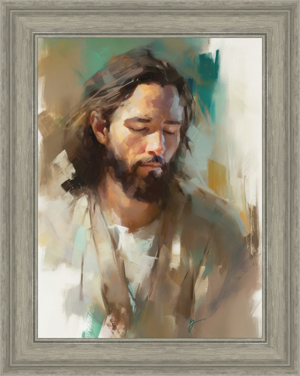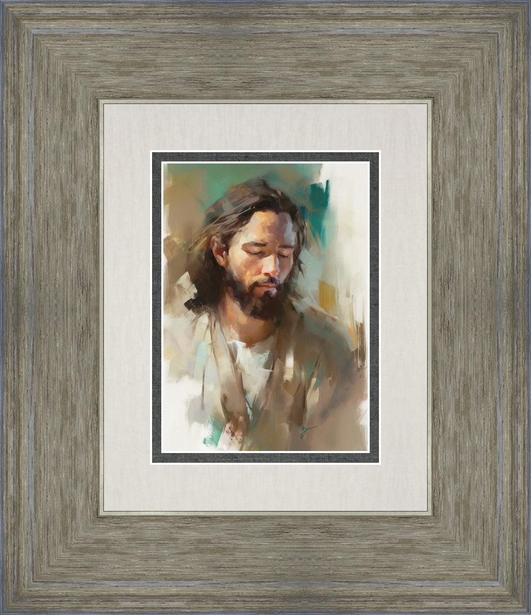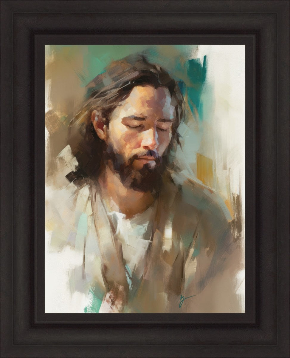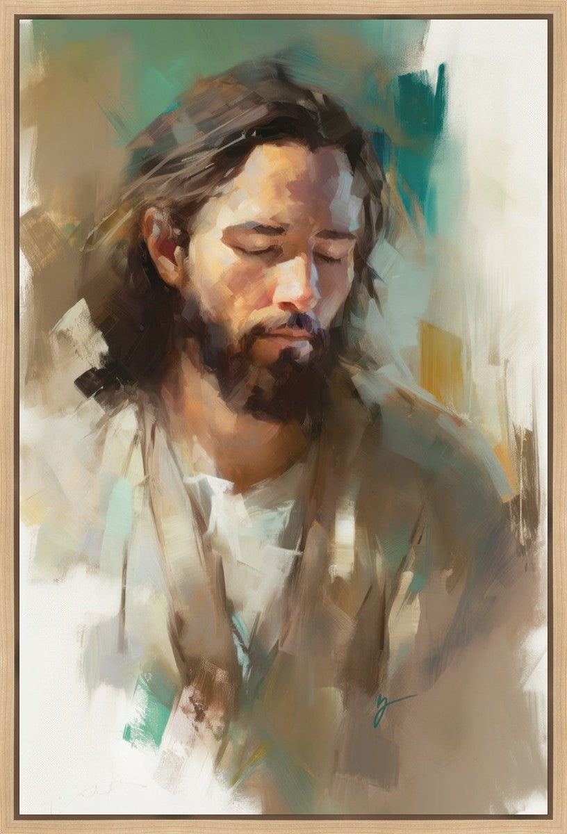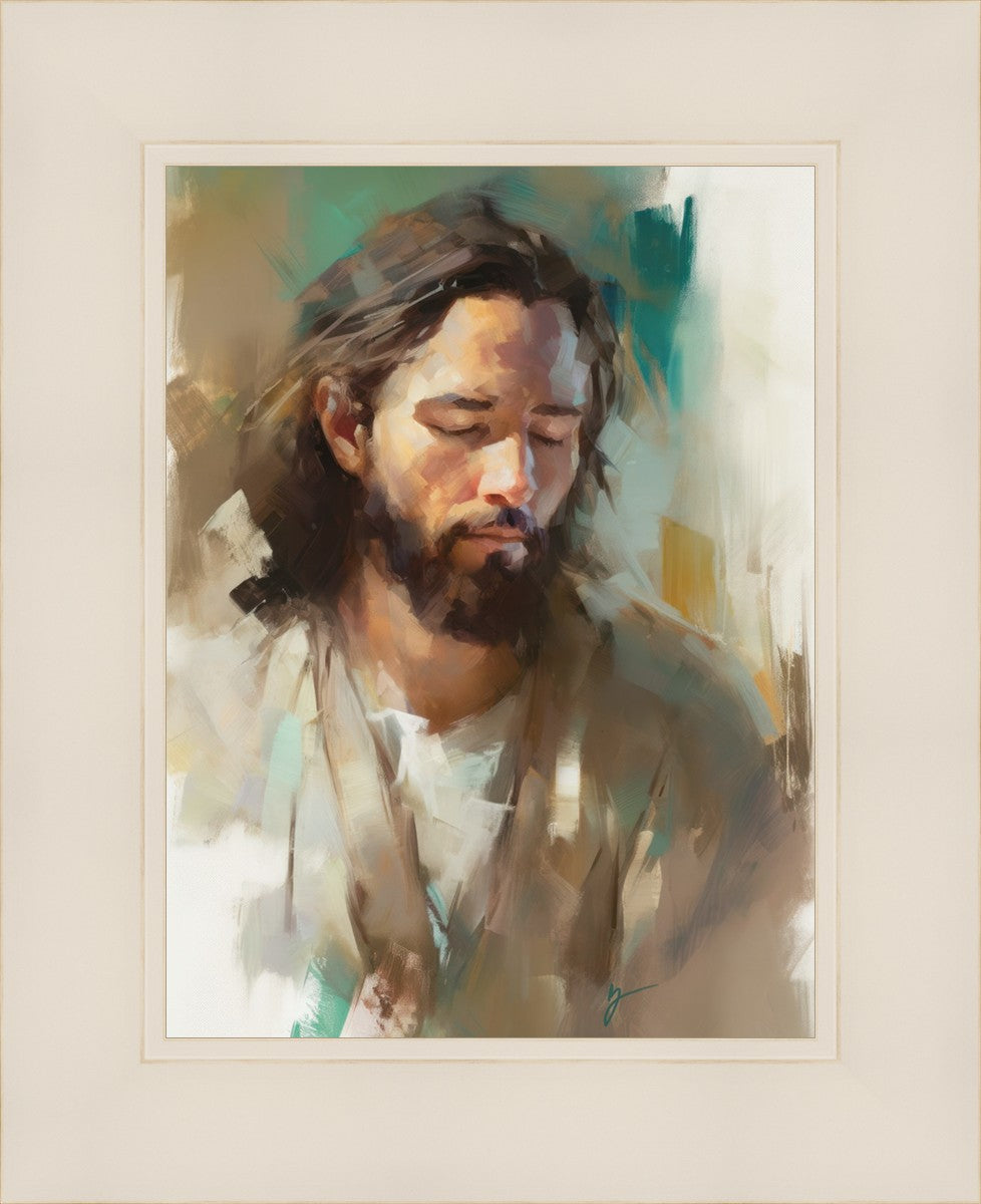 "I Am One With the Father" is a captivating abstract portrait of Jesus Christ. With its delicate loose brushwork and harmonious green and brown tones, this artwork radiates a sense of reverence and spiritual connection. Jesus, in deep communion with His Father, bows His head and closes His eyes, inviting us to join Him in unity. His heartfelt prayer echoes the desire for us to become one with Him, just as He is one with the Father.