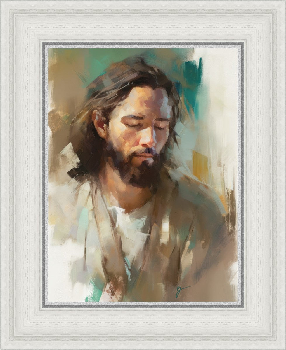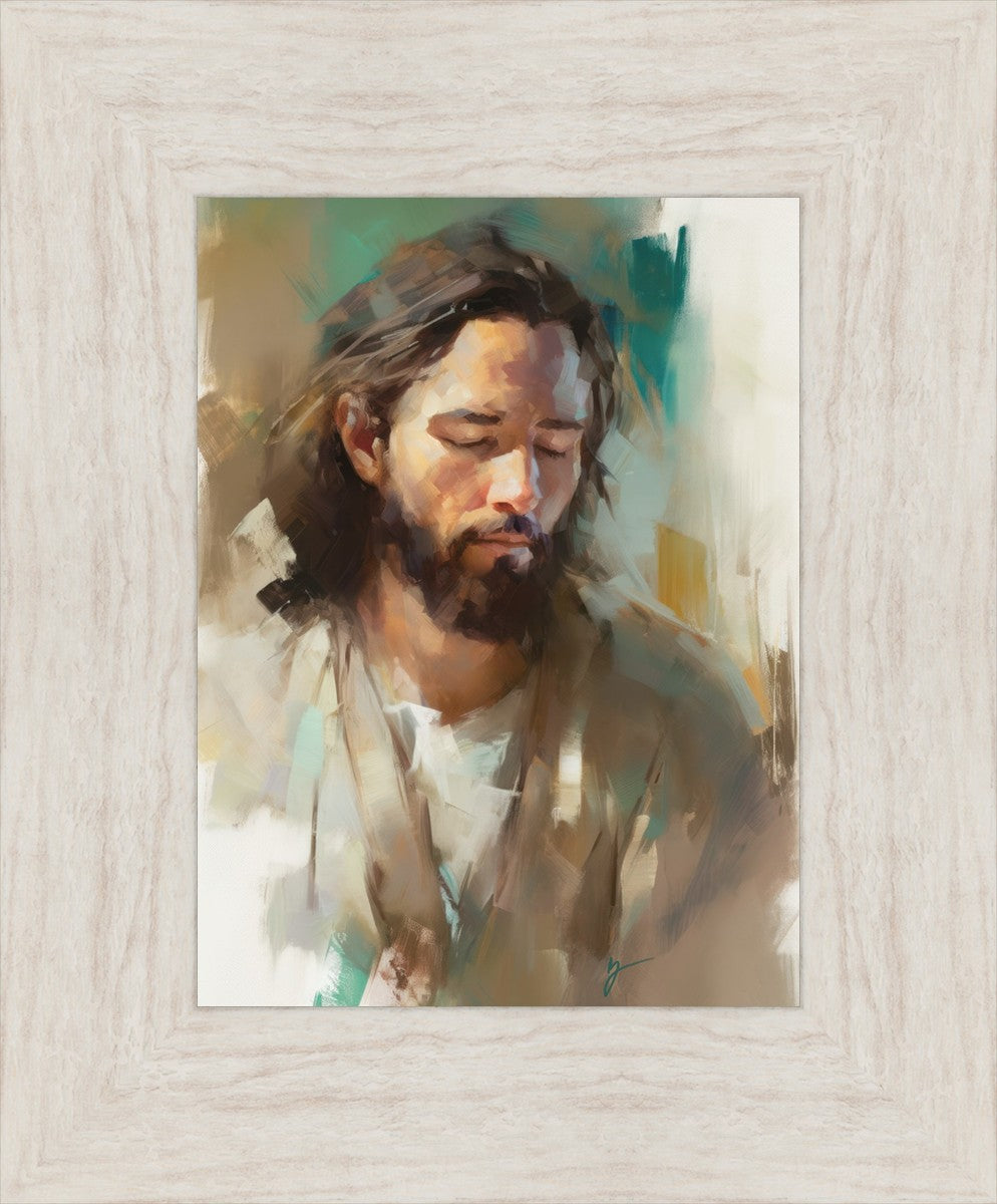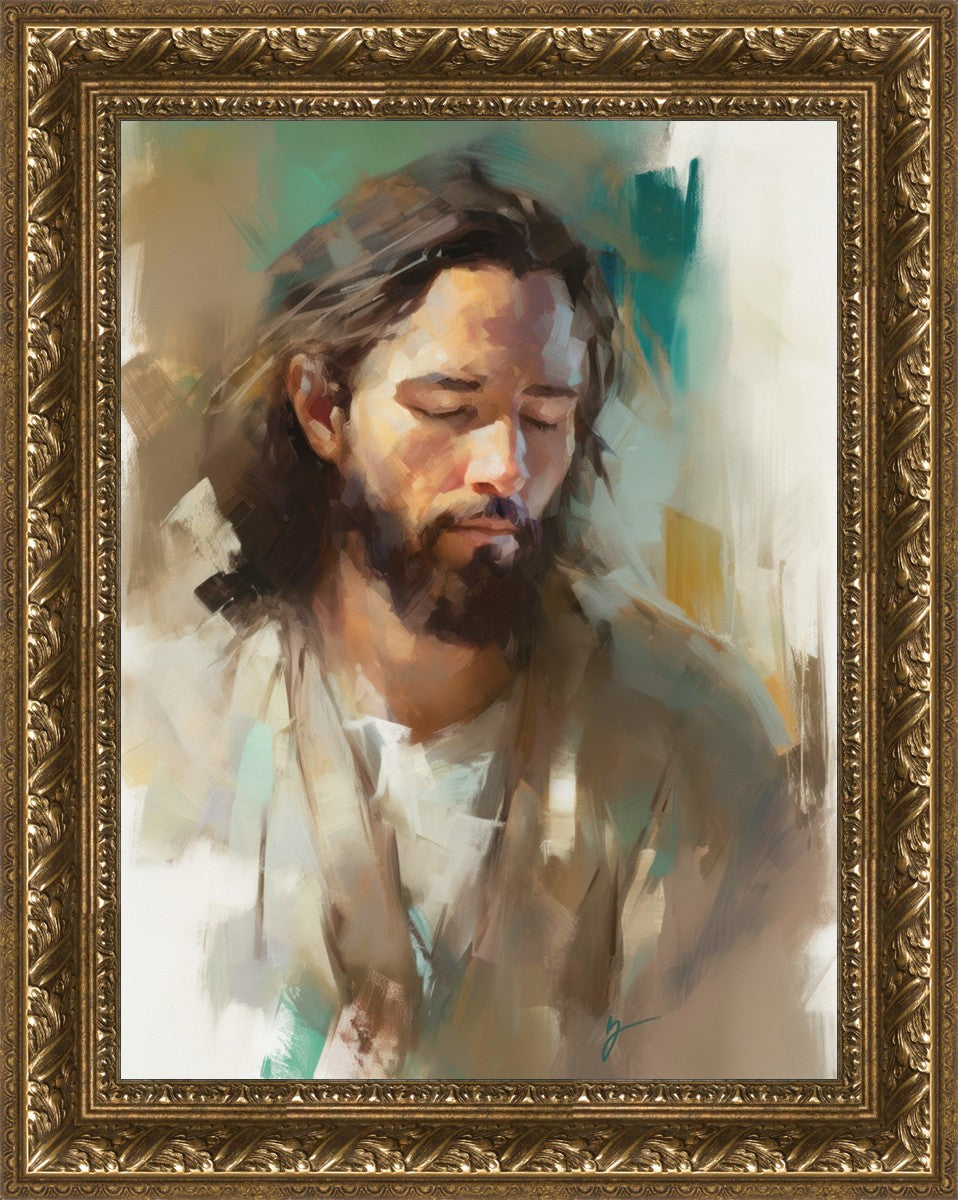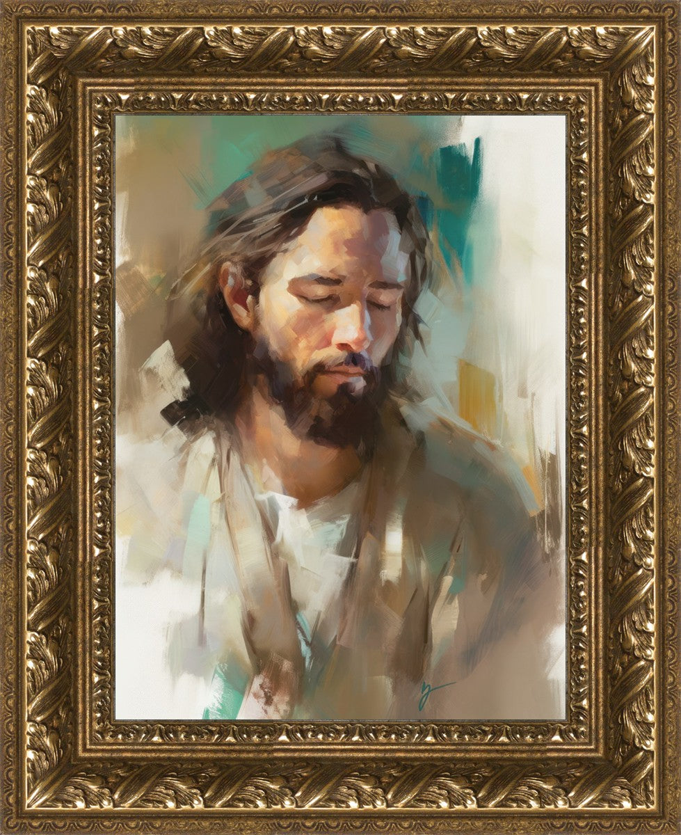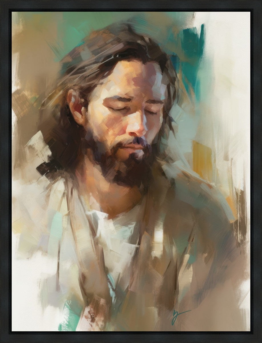 "I Am One With the Father" is a captivating abstract portrait of Jesus Christ. With its delicate loose brushwork and harmonious green and brown tones, this artwork radiates a sense of reverence and spiritual connection. Jesus, in deep communion with His Father, bows His head and closes His eyes, inviting us to join Him in unity. His heartfelt prayer echoes the desire for us to become one with Him, just as He is one with the Father.