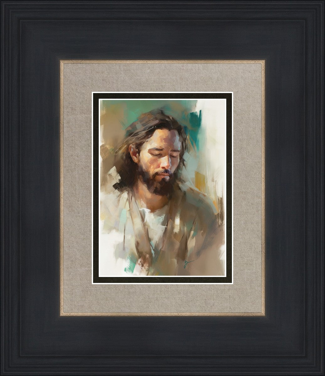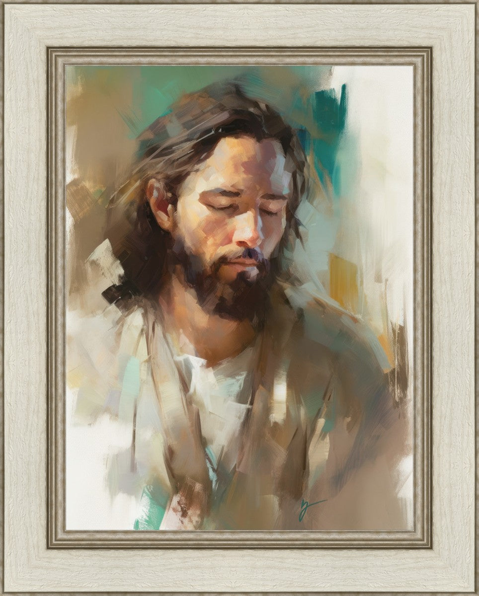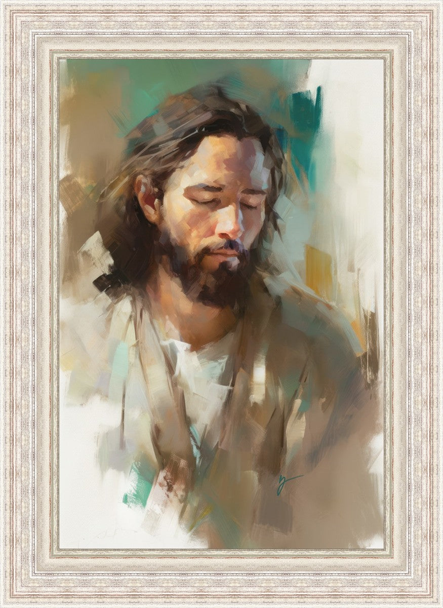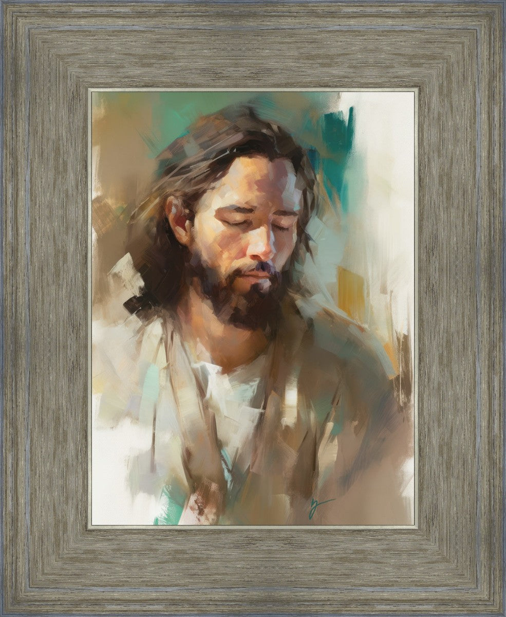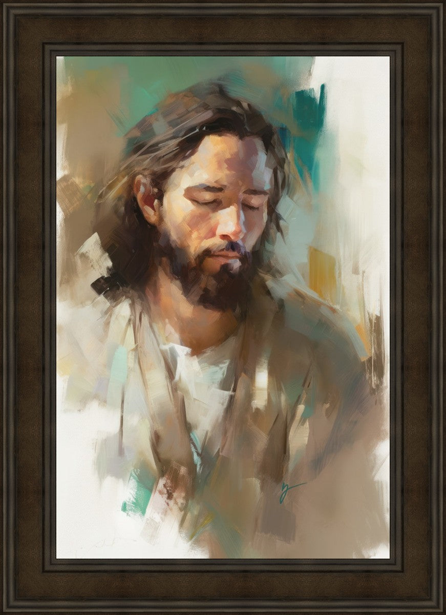 "I Am One With the Father" is a captivating abstract portrait of Jesus Christ. With its delicate loose brushwork and harmonious green and brown tones, this artwork radiates a sense of reverence and spiritual connection. Jesus, in deep communion with His Father, bows His head and closes His eyes, inviting us to join Him in unity. His heartfelt prayer echoes the desire for us to become one with Him, just as He is one with the Father.