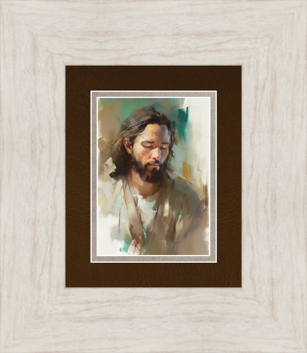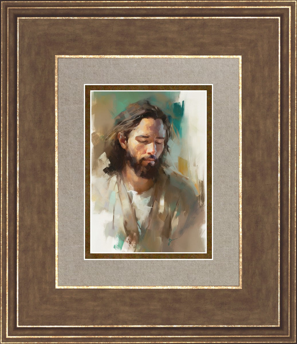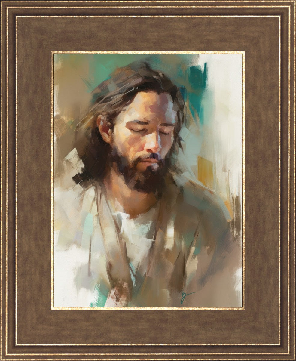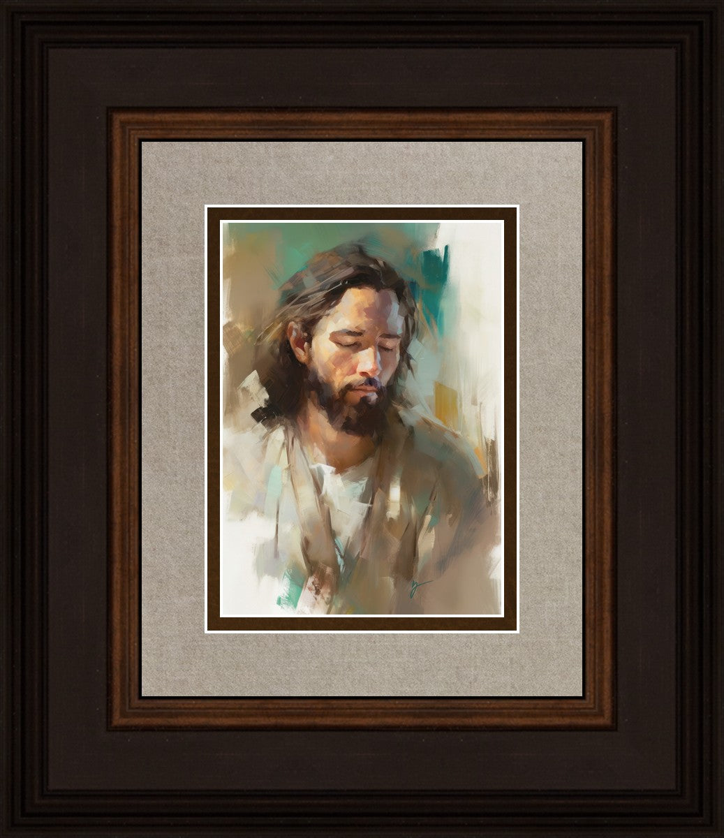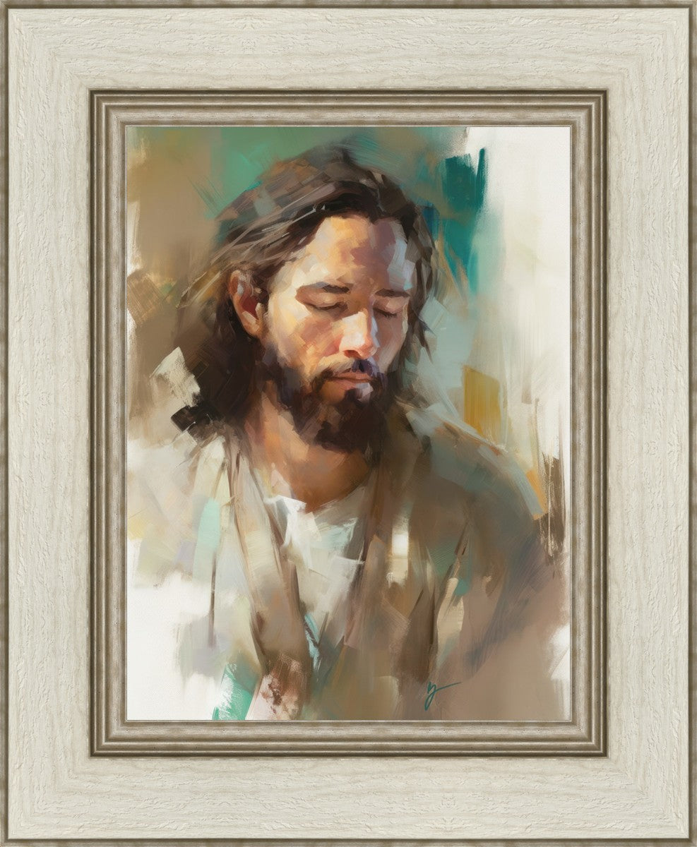 "I Am One With the Father" is a captivating abstract portrait of Jesus Christ. With its delicate loose brushwork and harmonious green and brown tones, this artwork radiates a sense of reverence and spiritual connection. Jesus, in deep communion with His Father, bows His head and closes His eyes, inviting us to join Him in unity. His heartfelt prayer echoes the desire for us to become one with Him, just as He is one with the Father.