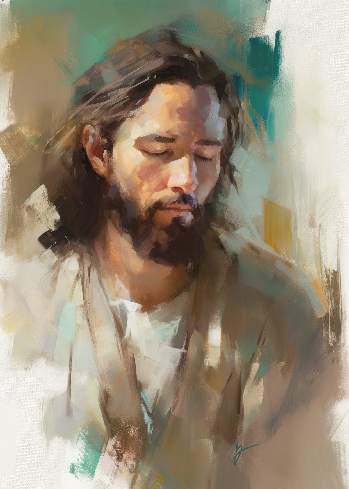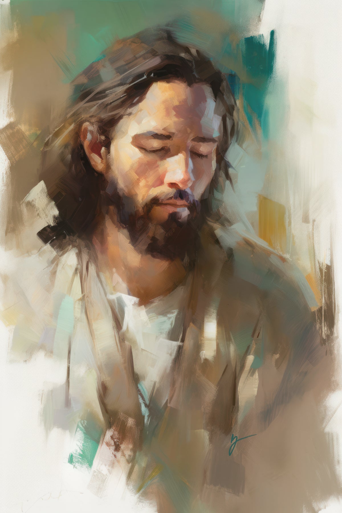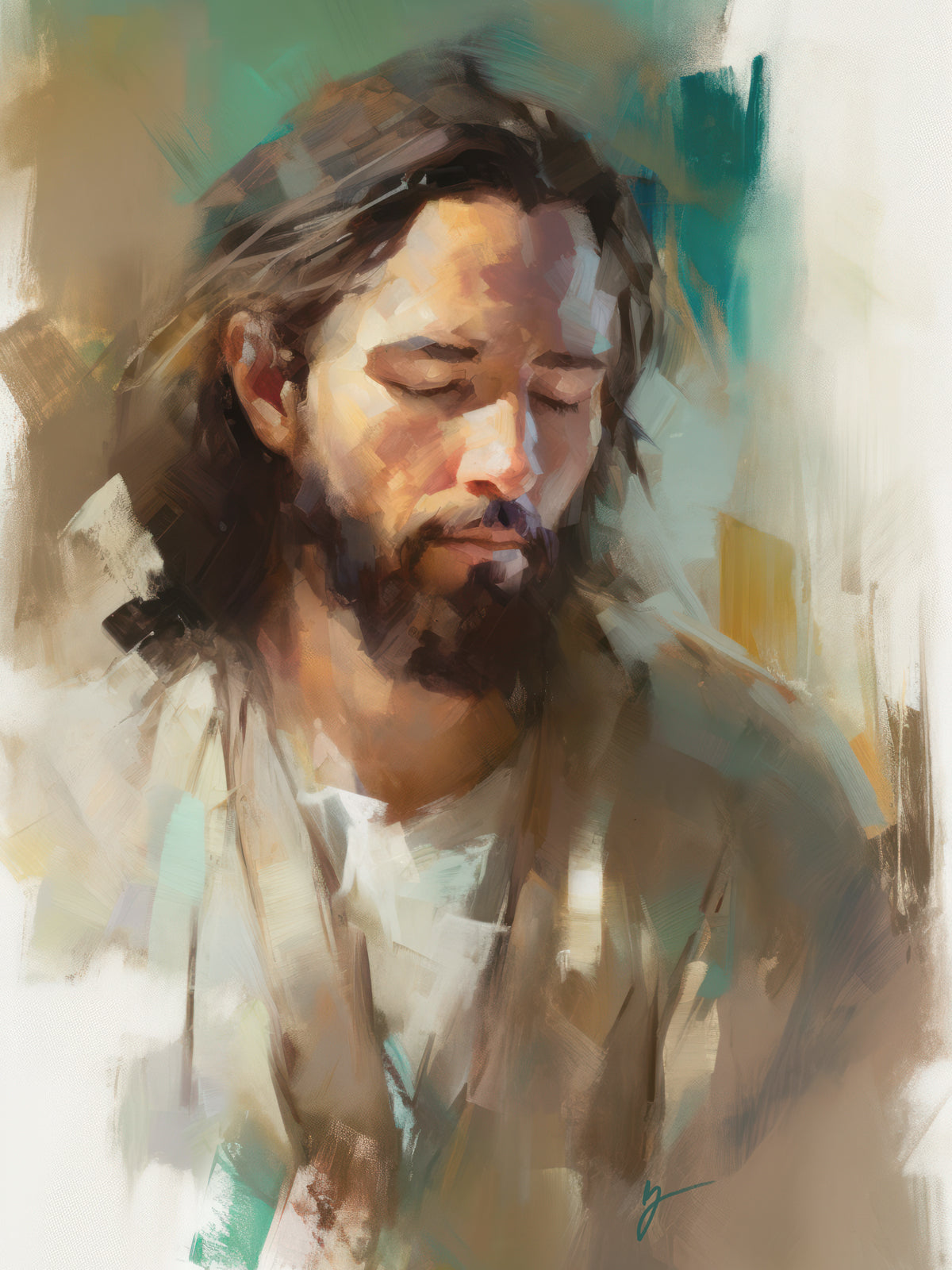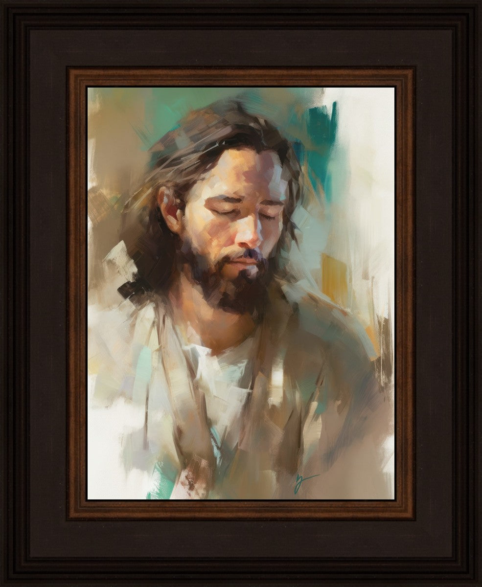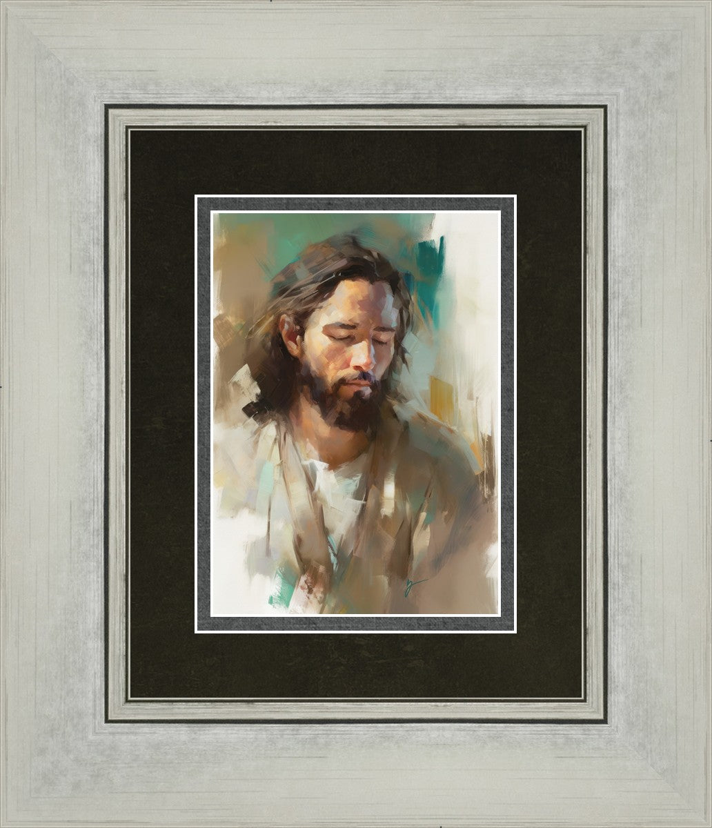 "I Am One With the Father" is a captivating abstract portrait of Jesus Christ. With its delicate loose brushwork and harmonious green and brown tones, this artwork radiates a sense of reverence and spiritual connection. Jesus, in deep communion with His Father, bows His head and closes His eyes, inviting us to join Him in unity. His heartfelt prayer echoes the desire for us to become one with Him, just as He is one with the Father.
