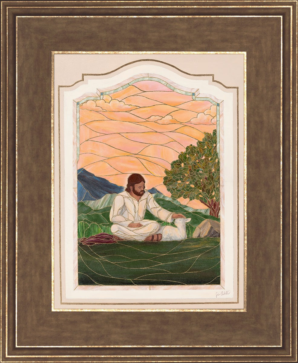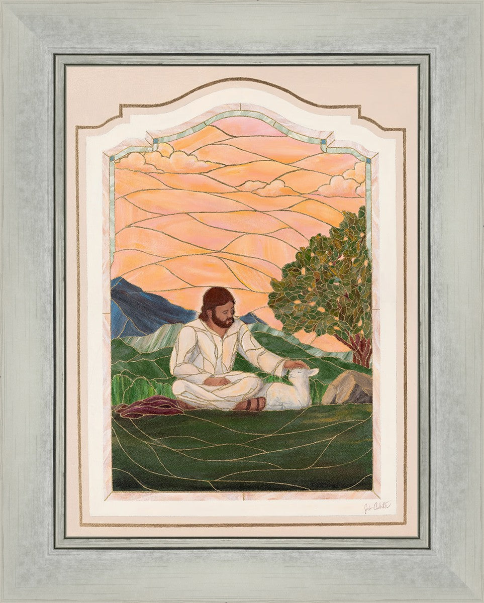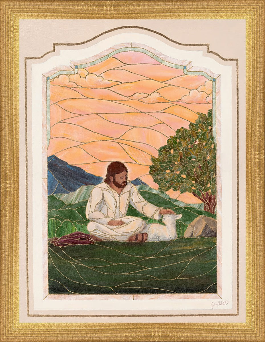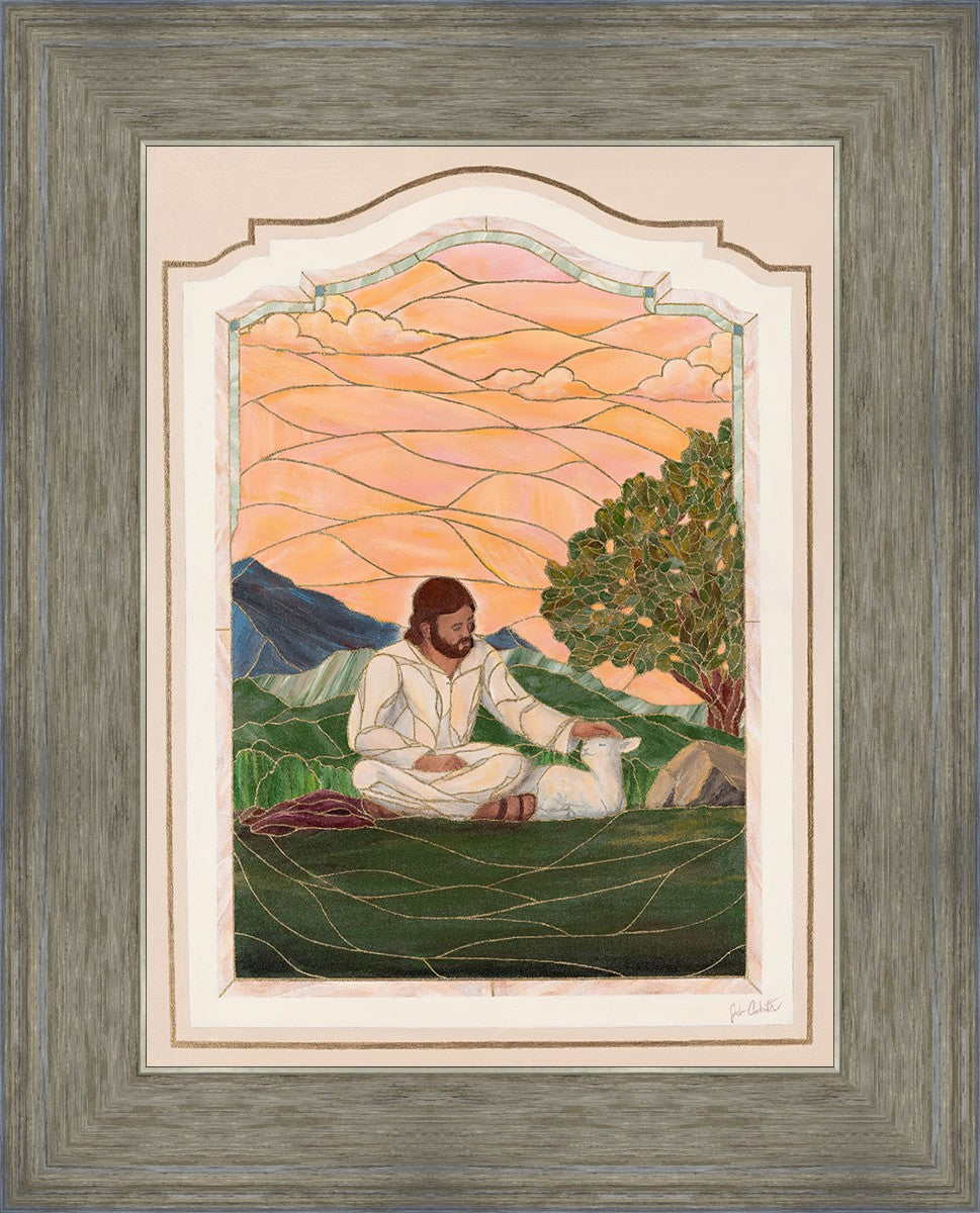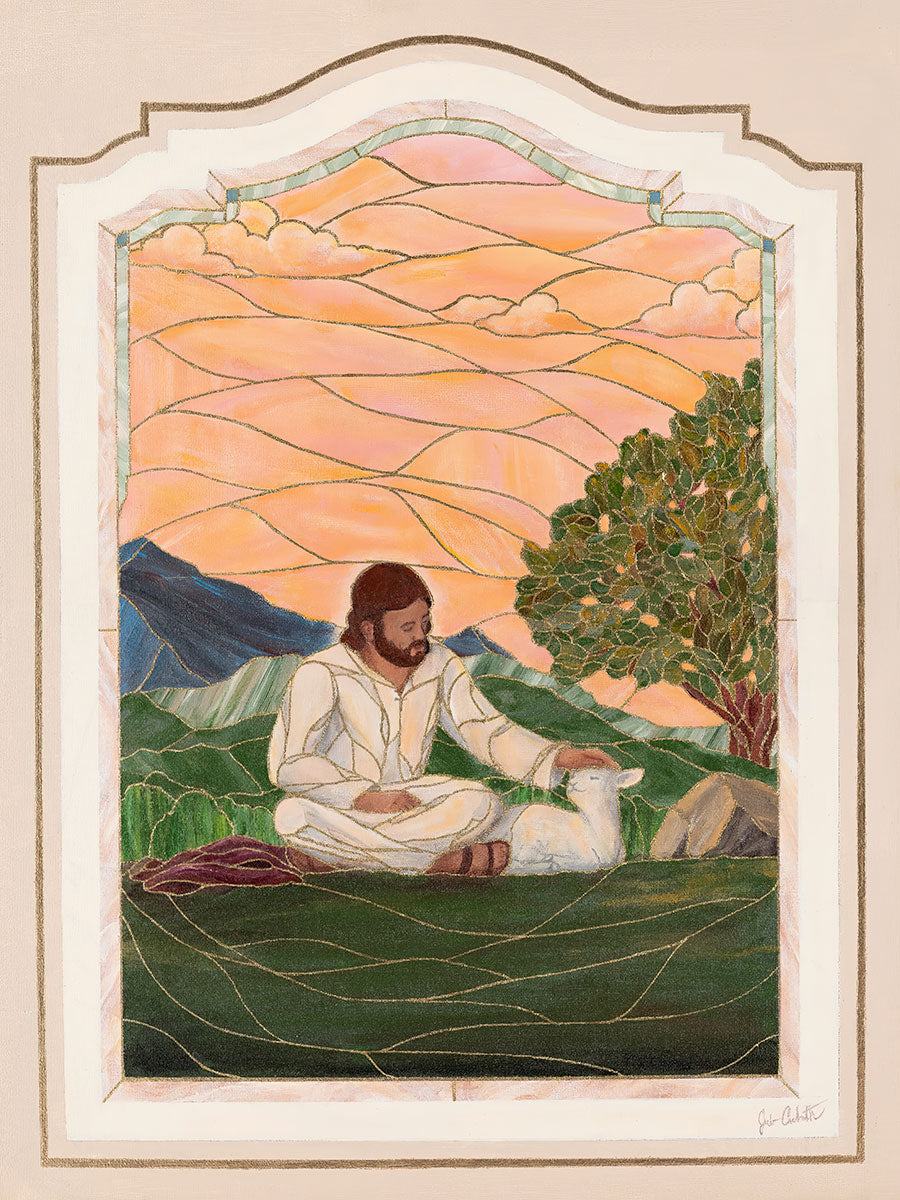 In order for us to know anyone, we must be willing to spend adequate time with them. No one knows us better than our Savior, and He is always reaching out and waiting for us to make the effort to come to better know Him. I intentionally tried to convey a sense that Jesus is there to stay with the lamb. You'll notice that He is sitting on the ground crossed-legged, and that He has removed His outer garments/clothing and has set it on the ground beside Him. In other words, He doesn't have somewhere else He needs to be soon or something else that needs to get done. Finding and ministering to this particular sheep is not just one more thing on a to-do list. Rather, spending time and showing love towards this one sheep is His entire purpose.