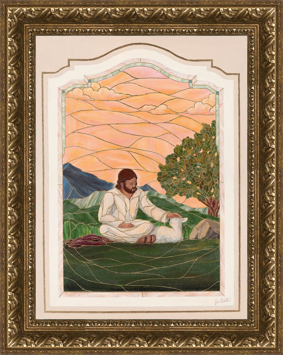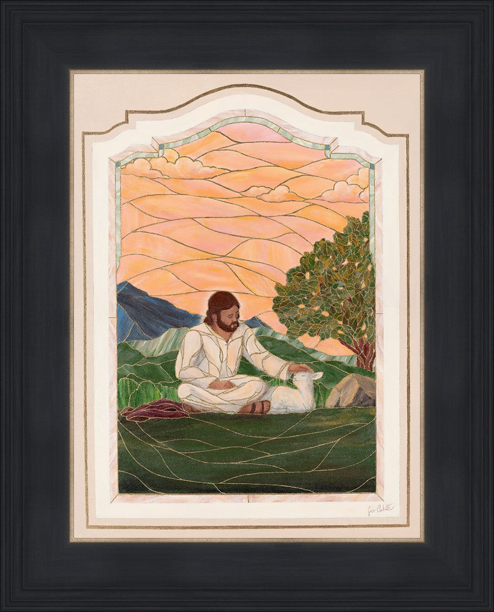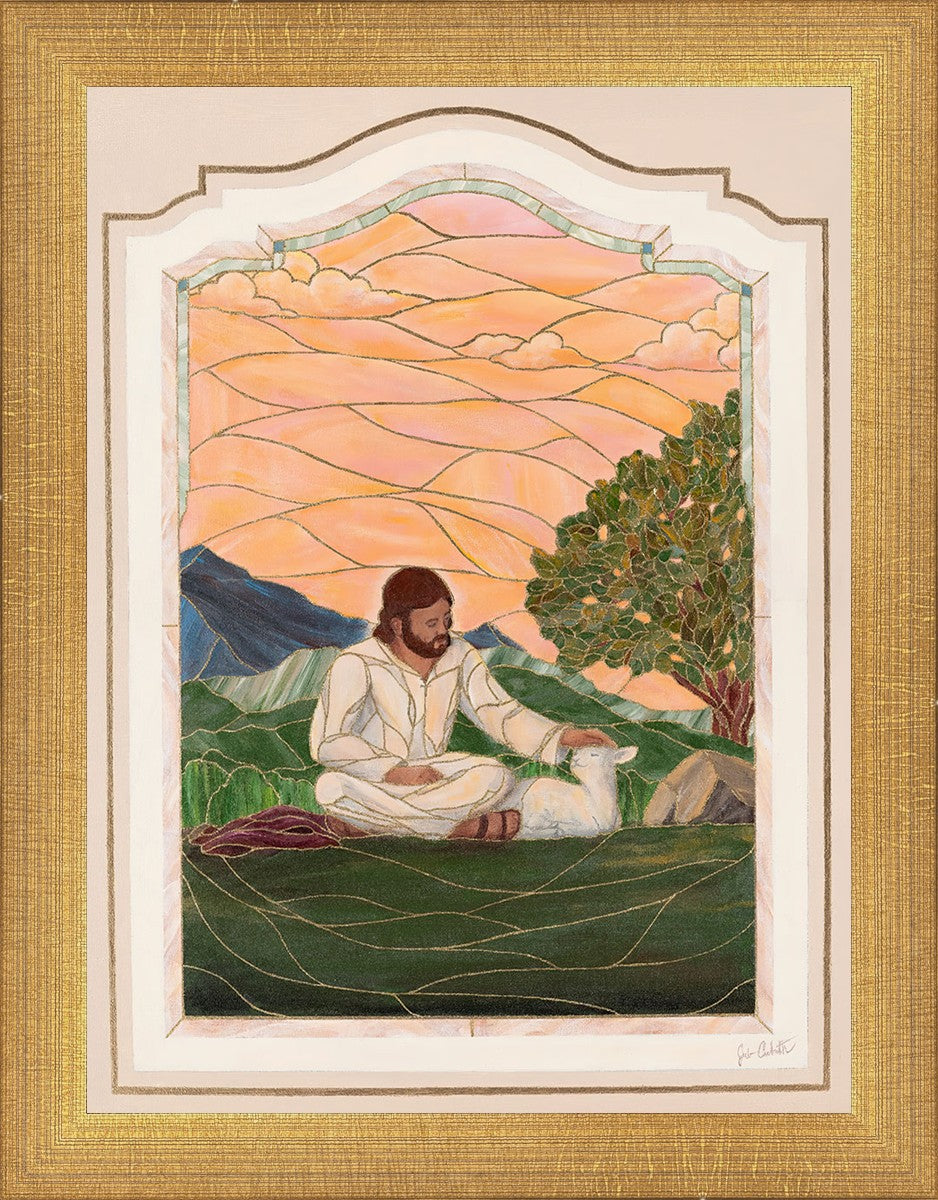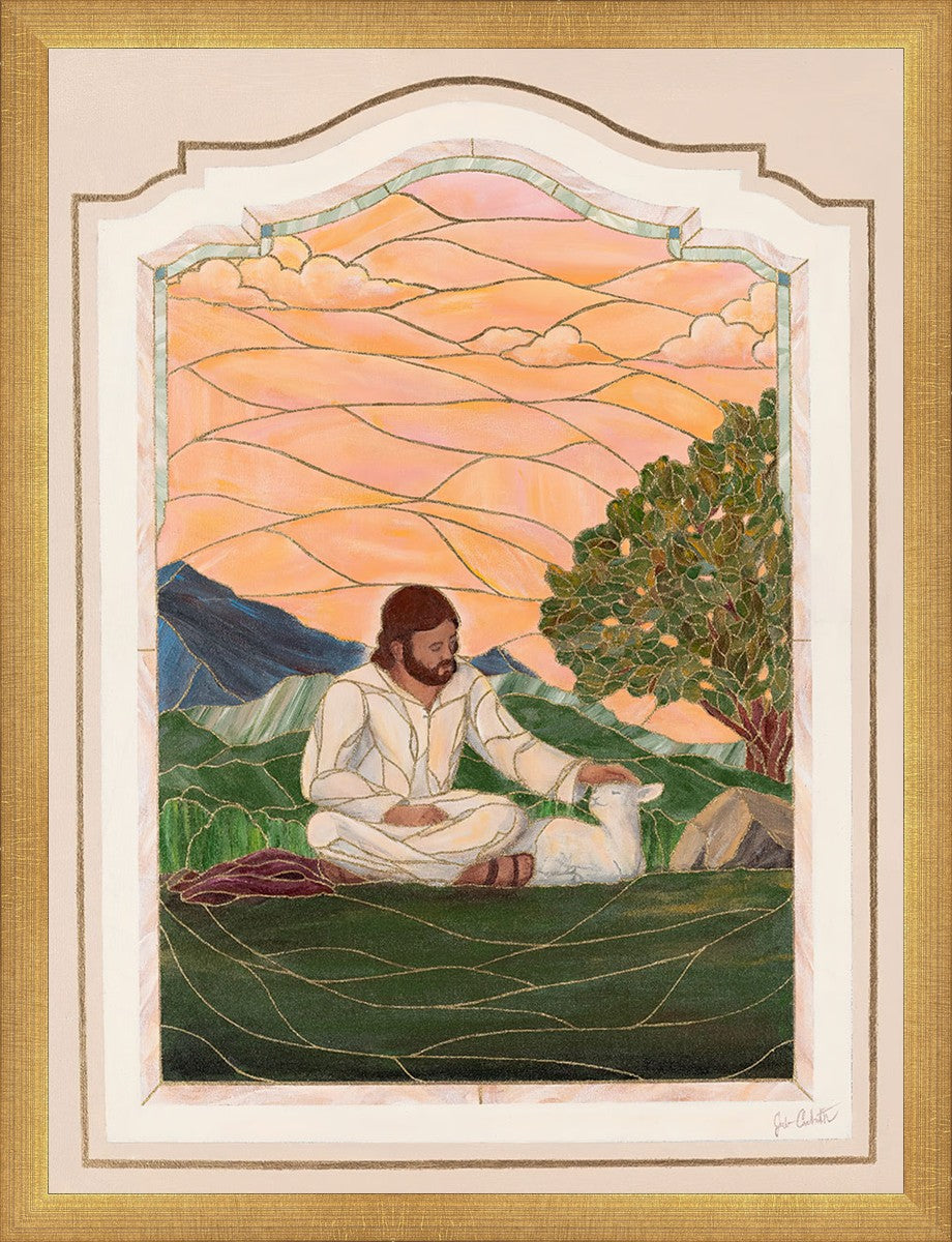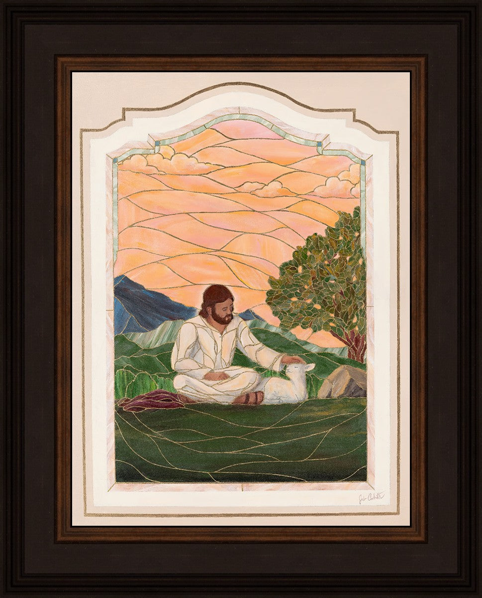 In order for us to know anyone, we must be willing to spend adequate time with them. No one knows us better than our Savior, and He is always reaching out and waiting for us to make the effort to come to better know Him. I intentionally tried to convey a sense that Jesus is there to stay with the lamb. You'll notice that He is sitting on the ground crossed-legged, and that He has removed His outer garments/clothing and has set it on the ground beside Him. In other words, He doesn't have somewhere else He needs to be soon or something else that needs to get done. Finding and ministering to this particular sheep is not just one more thing on a to-do list. Rather, spending time and showing love towards this one sheep is His entire purpose.