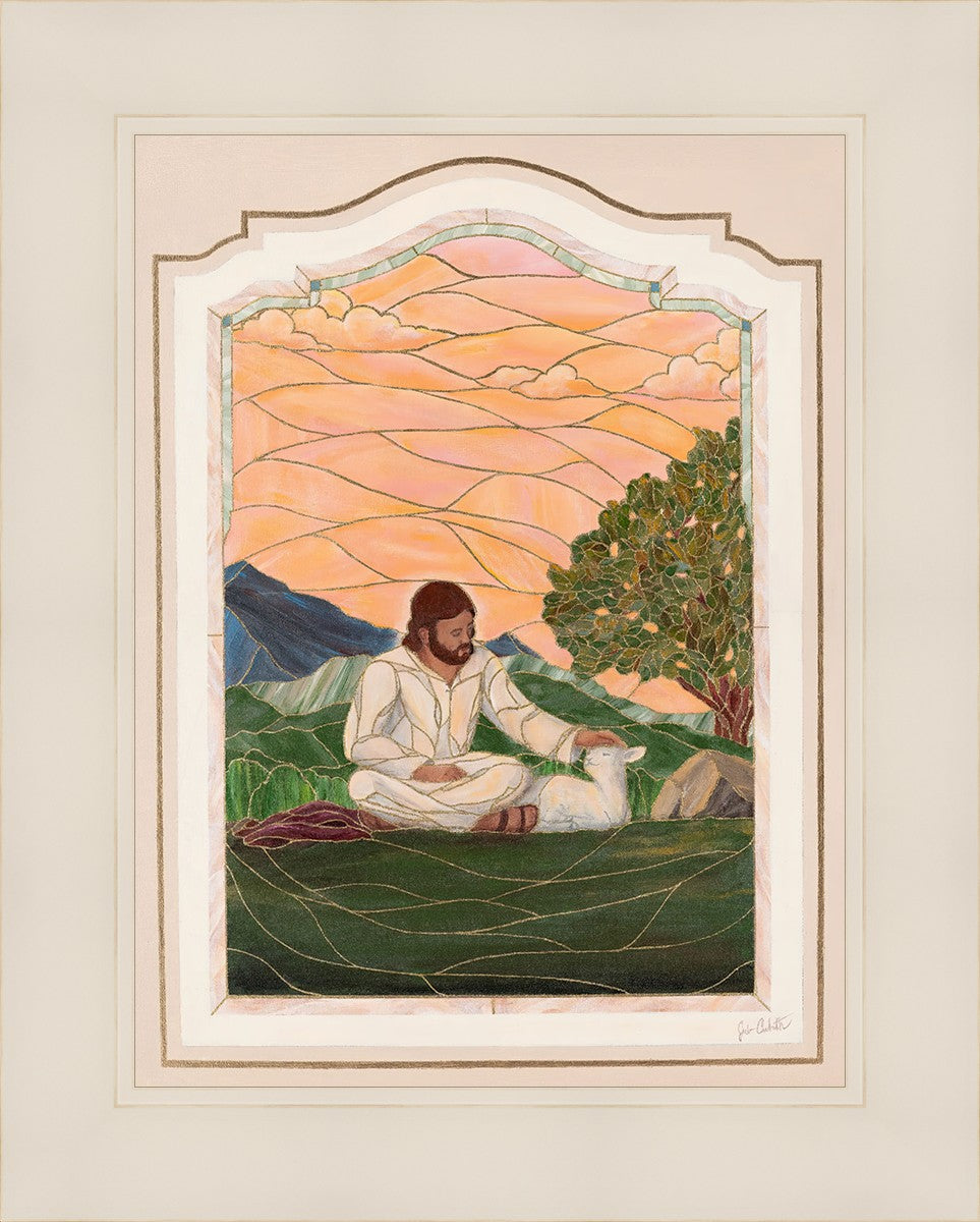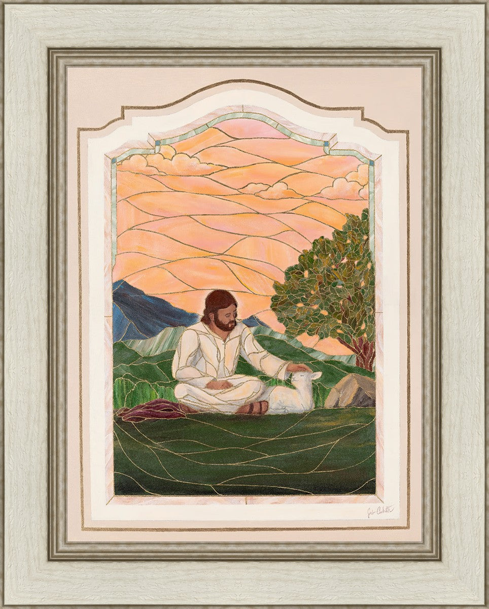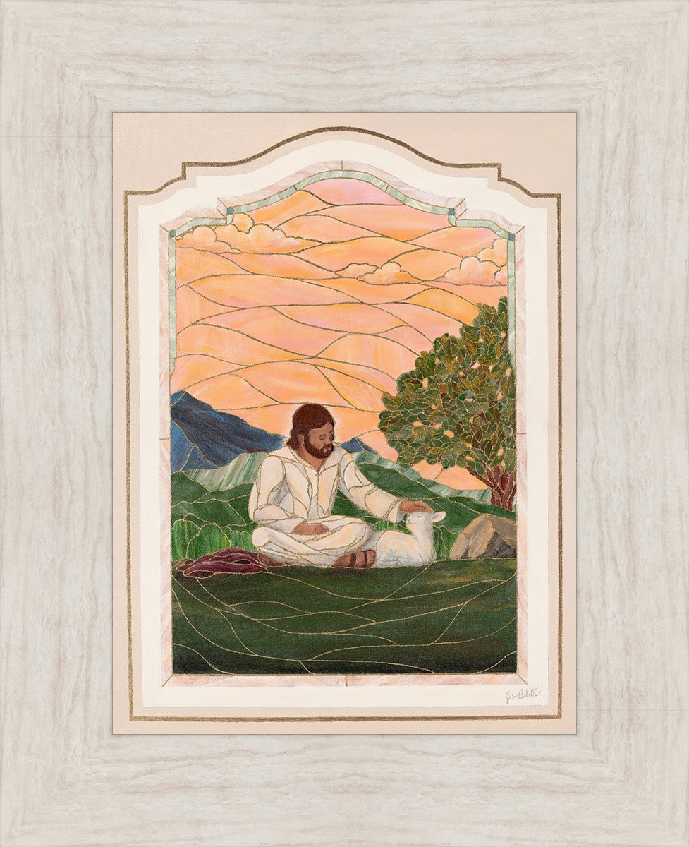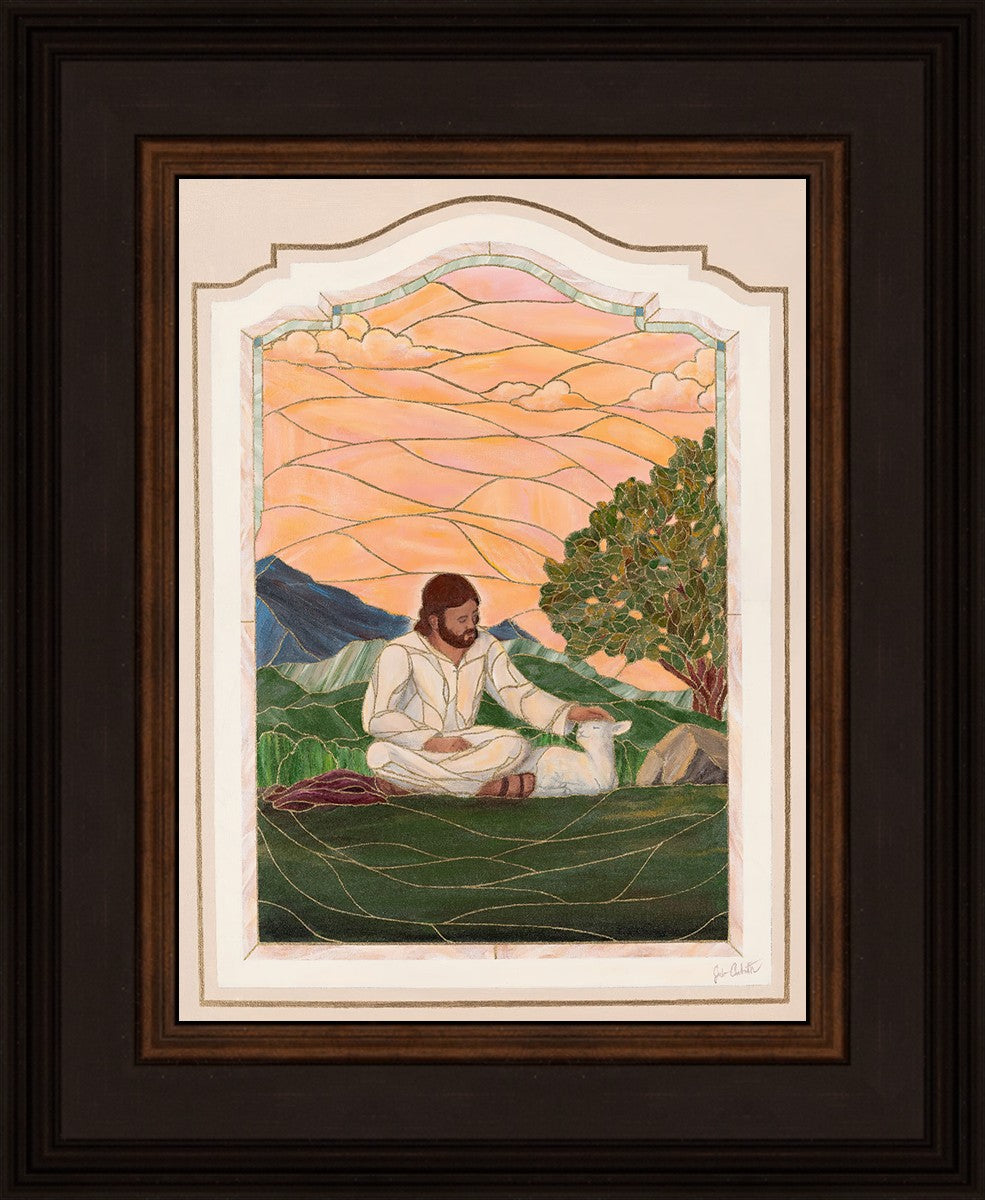 In order for us to know anyone, we must be willing to spend adequate time with them. No one knows us better than our Savior, and He is always reaching out and waiting for us to make the effort to come to better know Him. I intentionally tried to convey a sense that Jesus is there to stay with the lamb. You'll notice that He is sitting on the ground crossed-legged, and that He has removed His outer garments/clothing and has set it on the ground beside Him. In other words, He doesn't have somewhere else He needs to be soon or something else that needs to get done. Finding and ministering to this particular sheep is not just one more thing on a to-do list. Rather, spending time and showing love towards this one sheep is His entire purpose.
