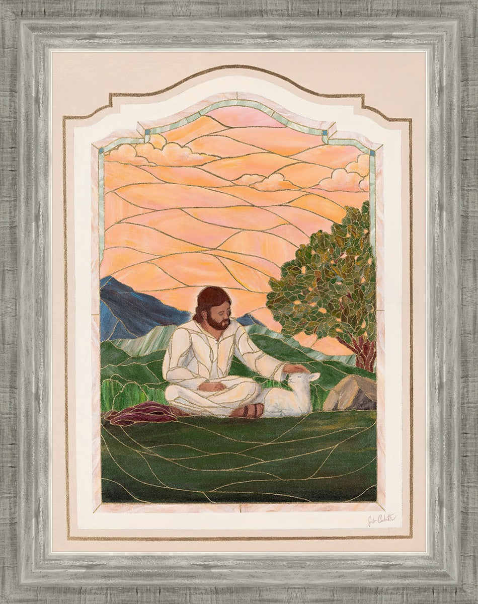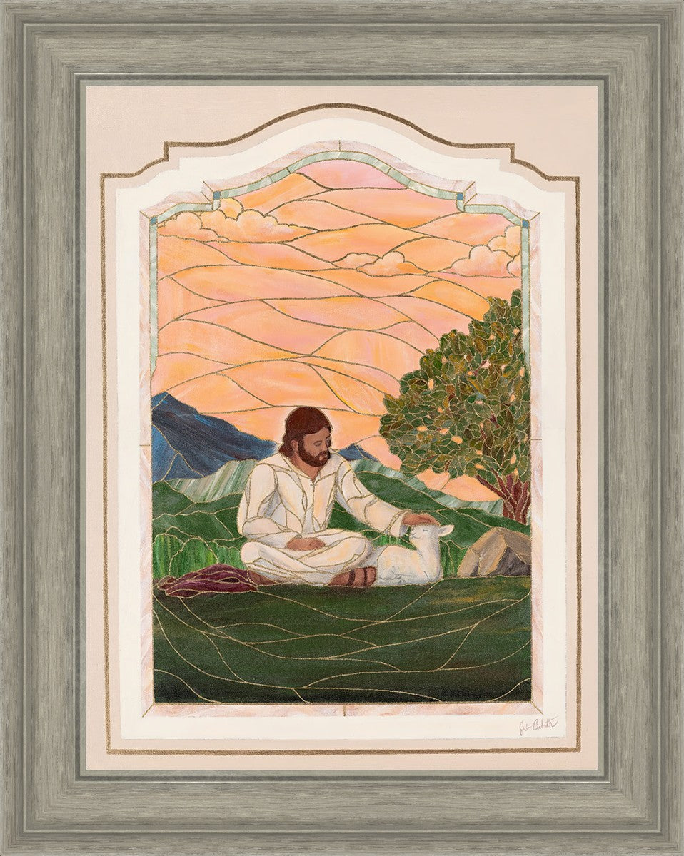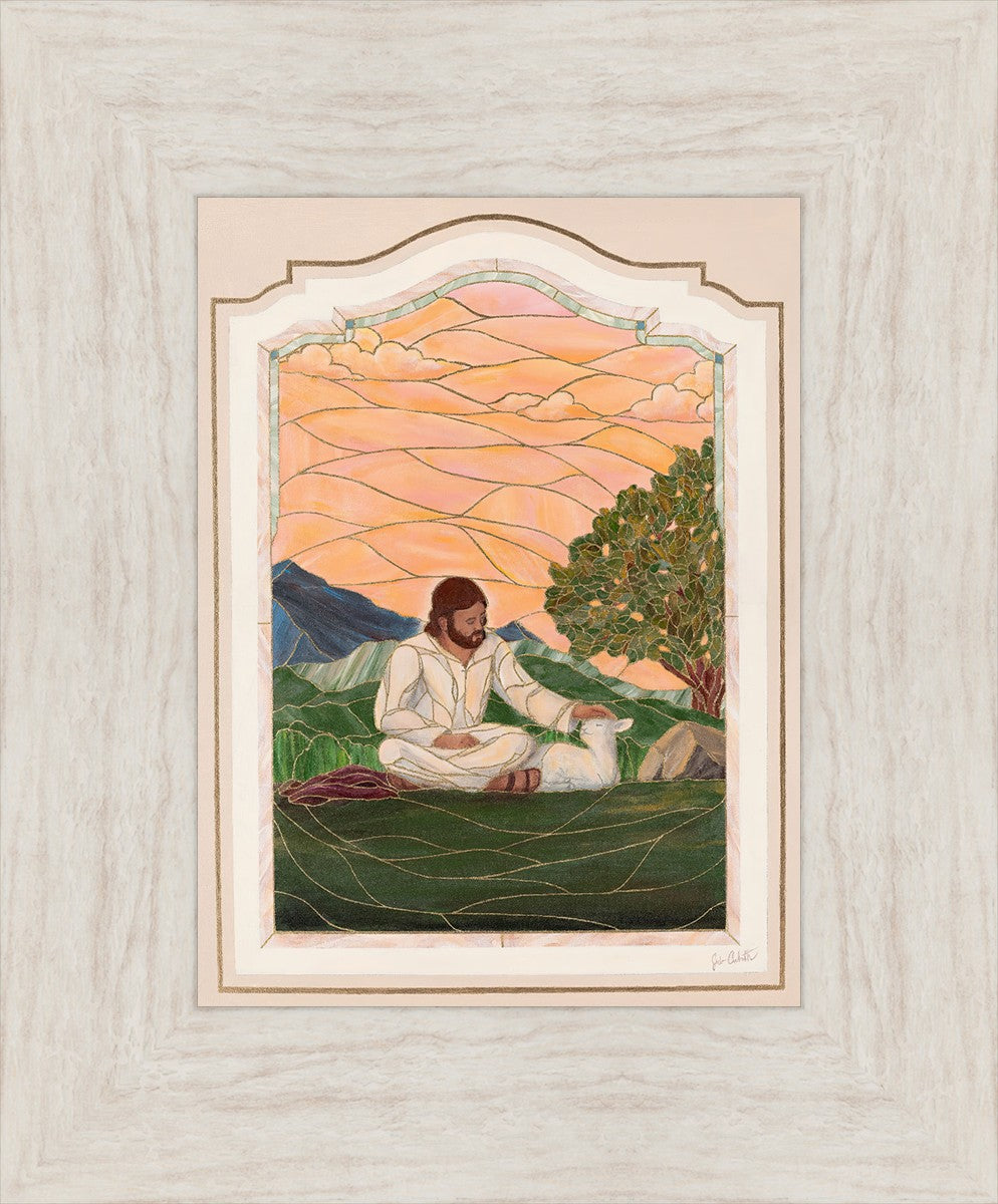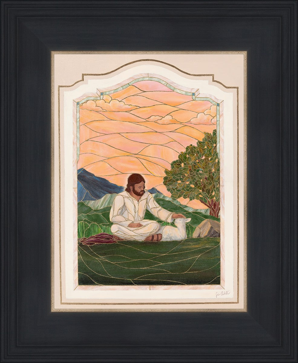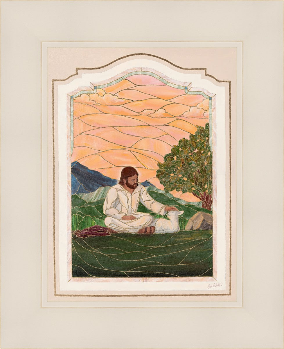 In order for us to know anyone, we must be willing to spend adequate time with them. No one knows us better than our Savior, and He is always reaching out and waiting for us to make the effort to come to better know Him. I intentionally tried to convey a sense that Jesus is there to stay with the lamb. You'll notice that He is sitting on the ground crossed-legged, and that He has removed His outer garments/clothing and has set it on the ground beside Him. In other words, He doesn't have somewhere else He needs to be soon or something else that needs to get done. Finding and ministering to this particular sheep is not just one more thing on a to-do list. Rather, spending time and showing love towards this one sheep is His entire purpose.