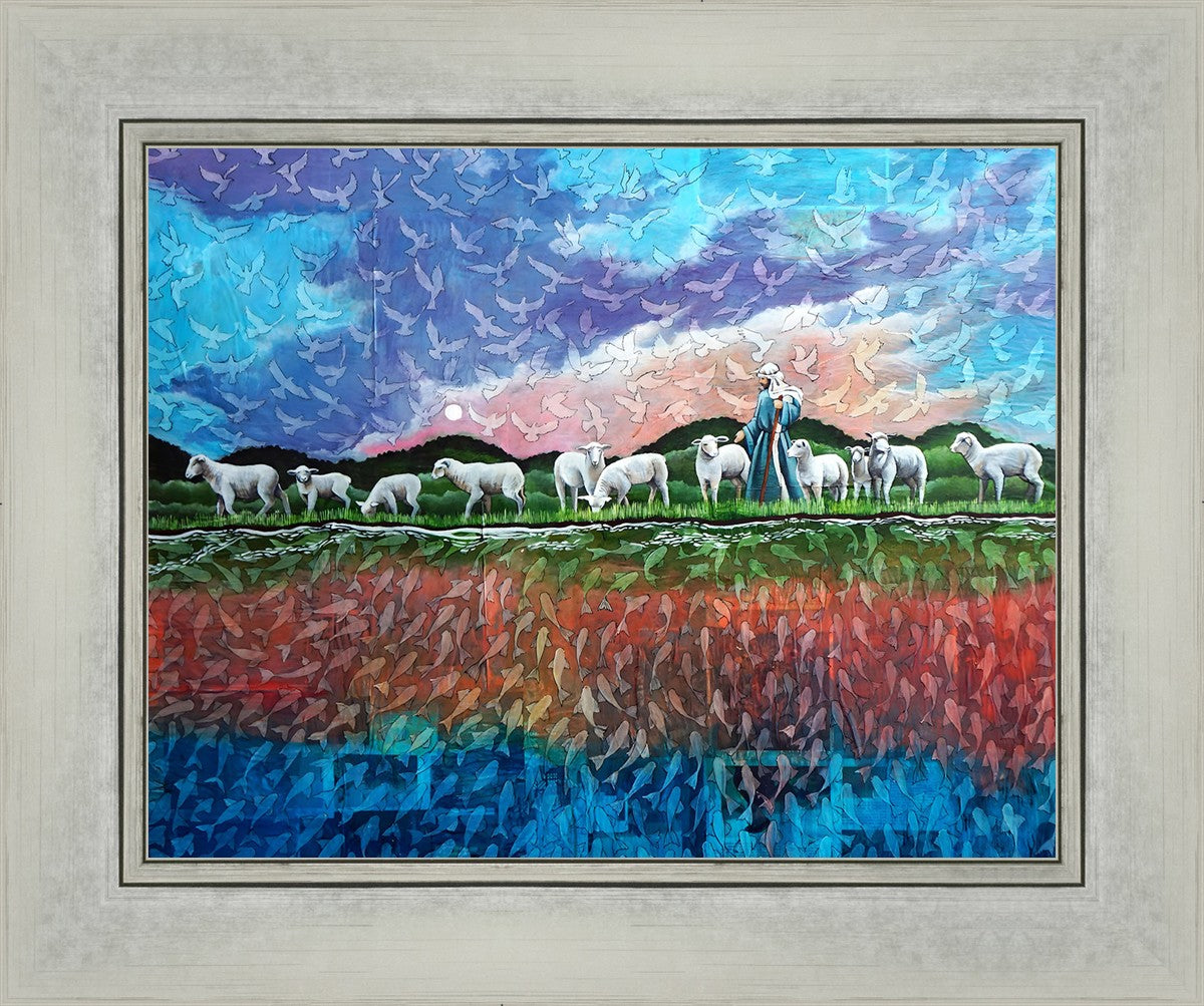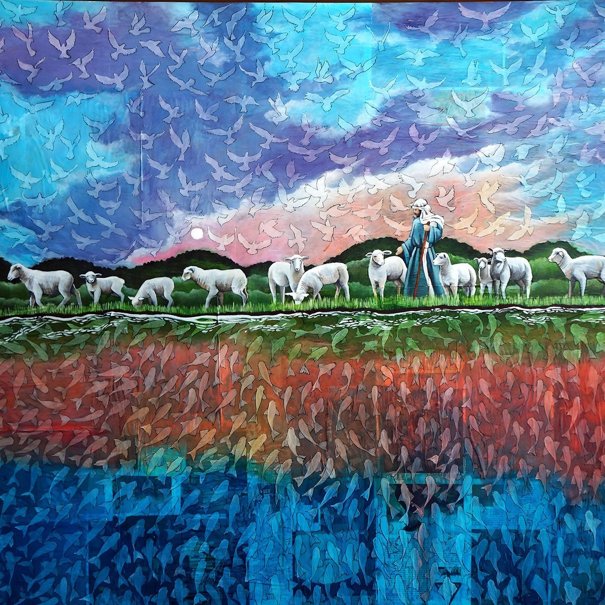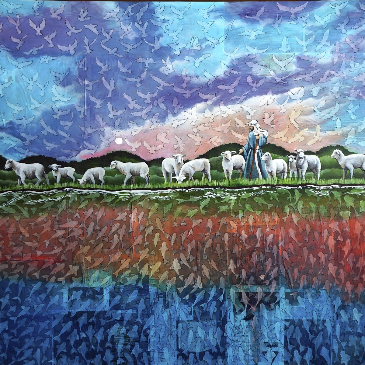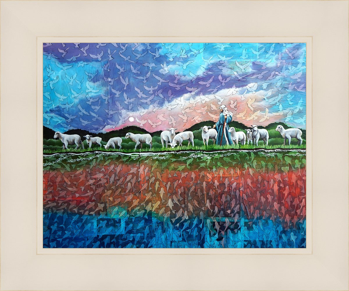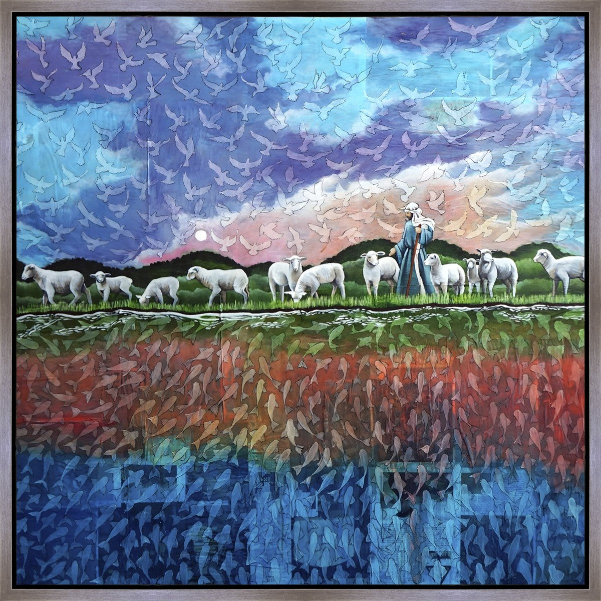 The Shepherd tends to his flock in a verdant pasture, while the sky and the seas are filled with his Spirit