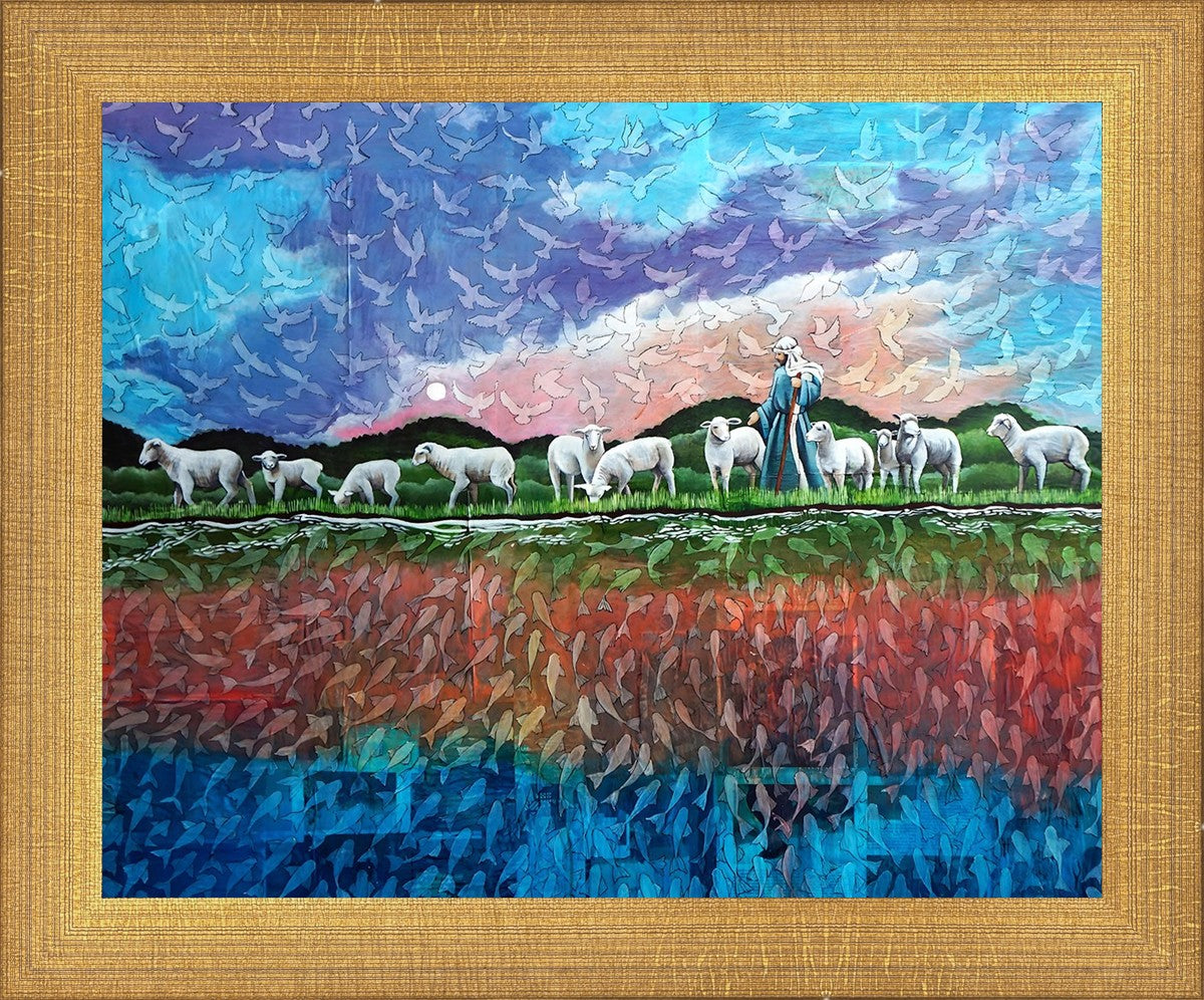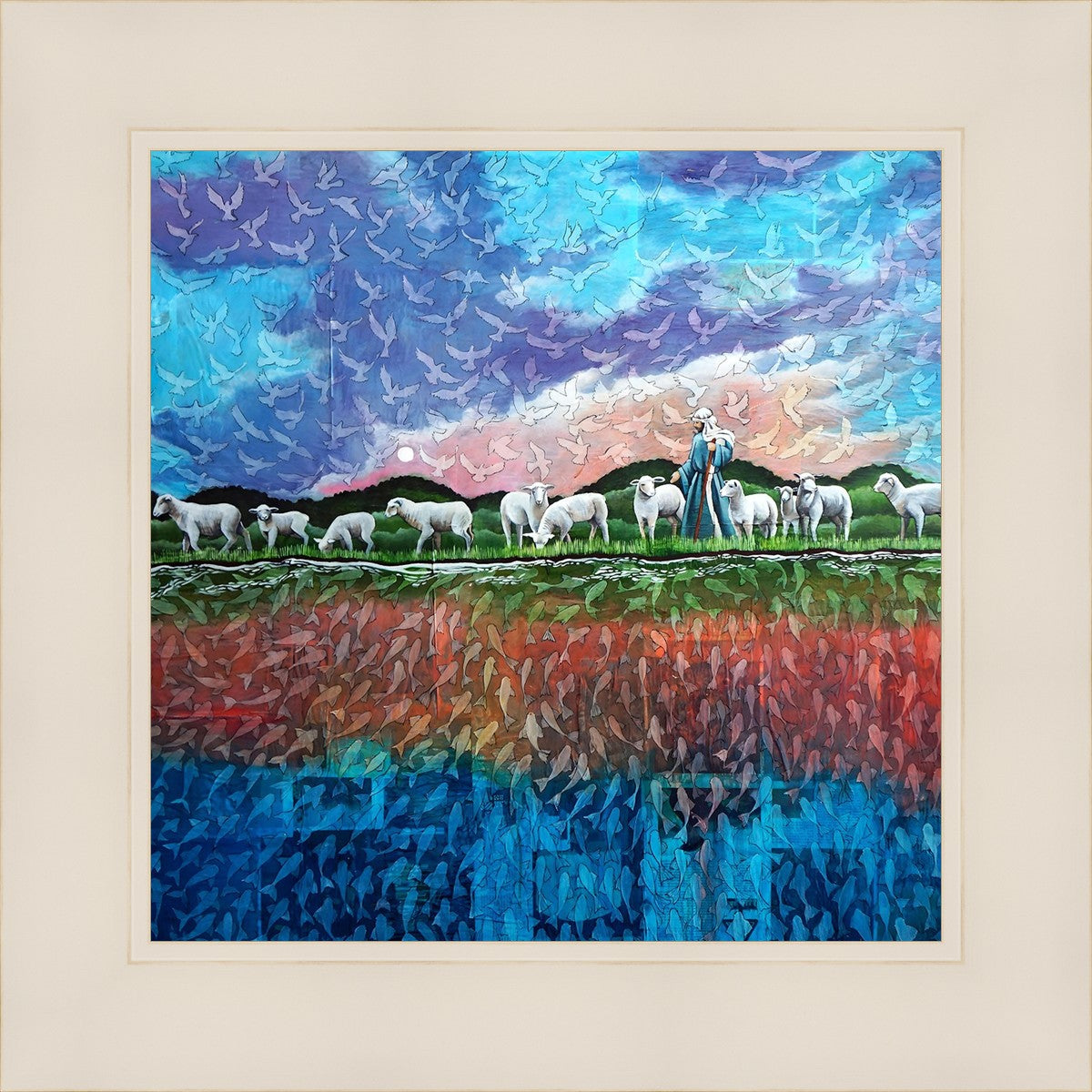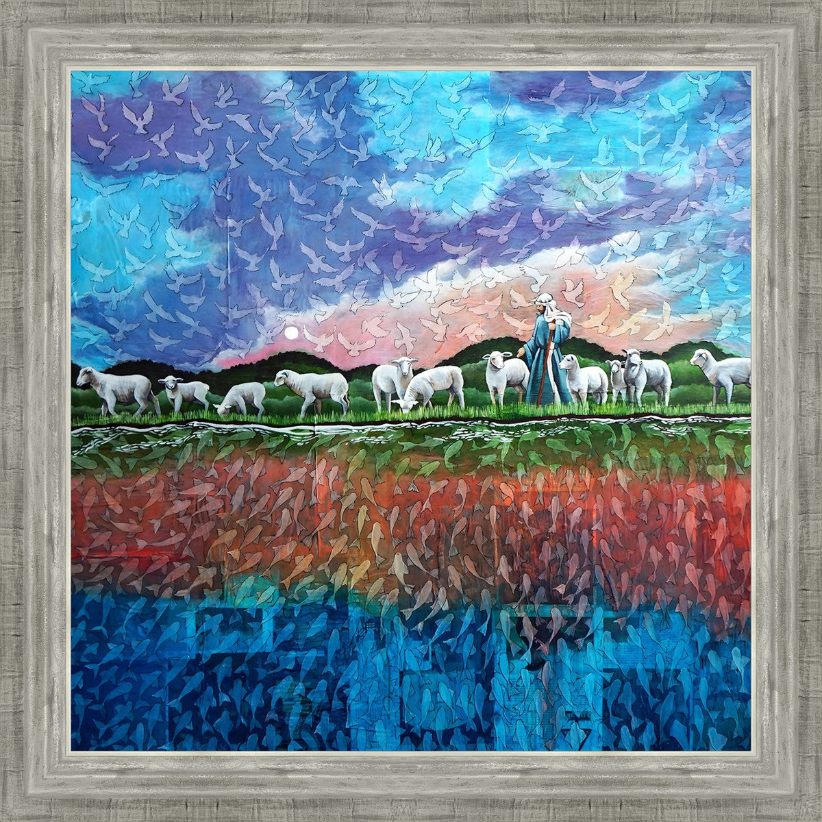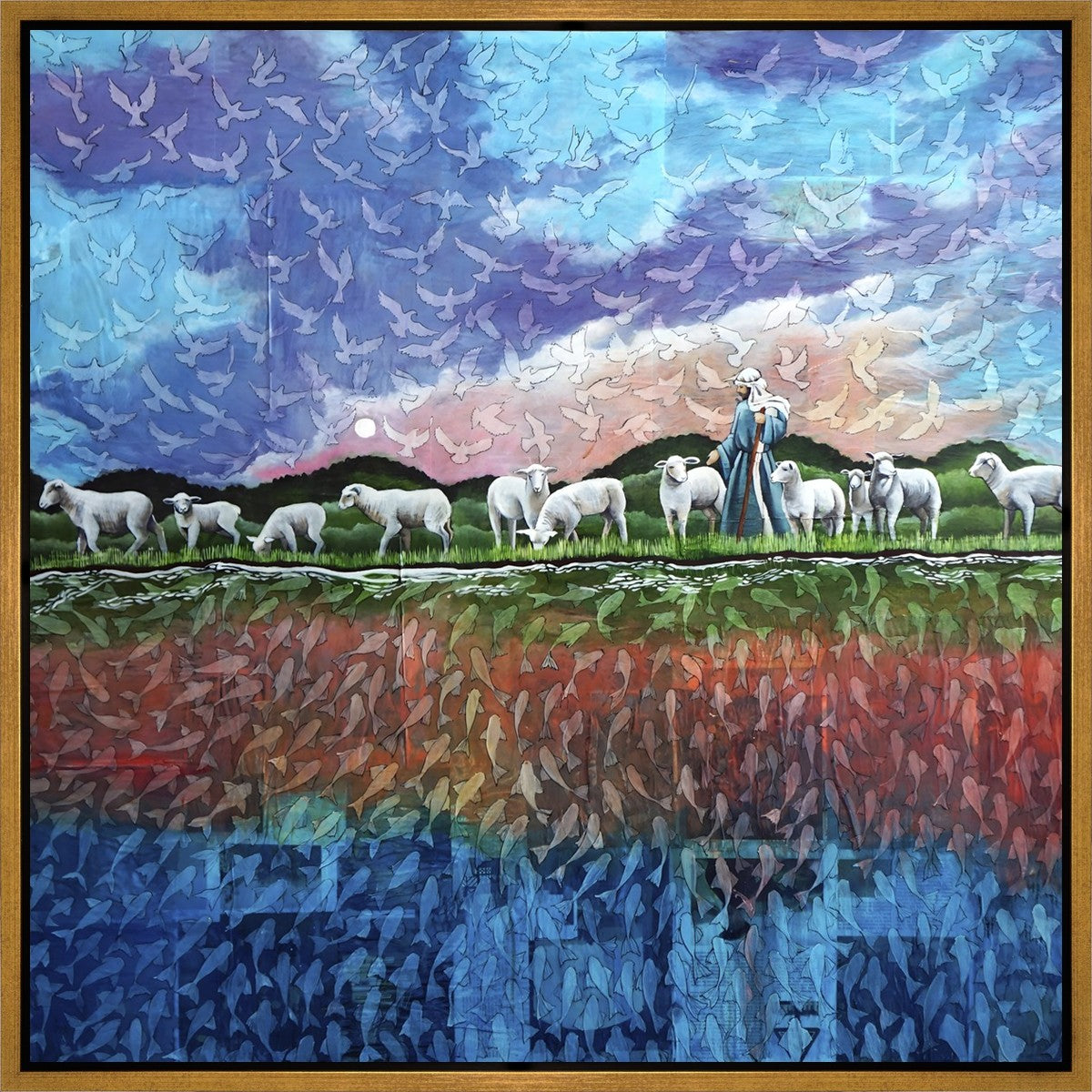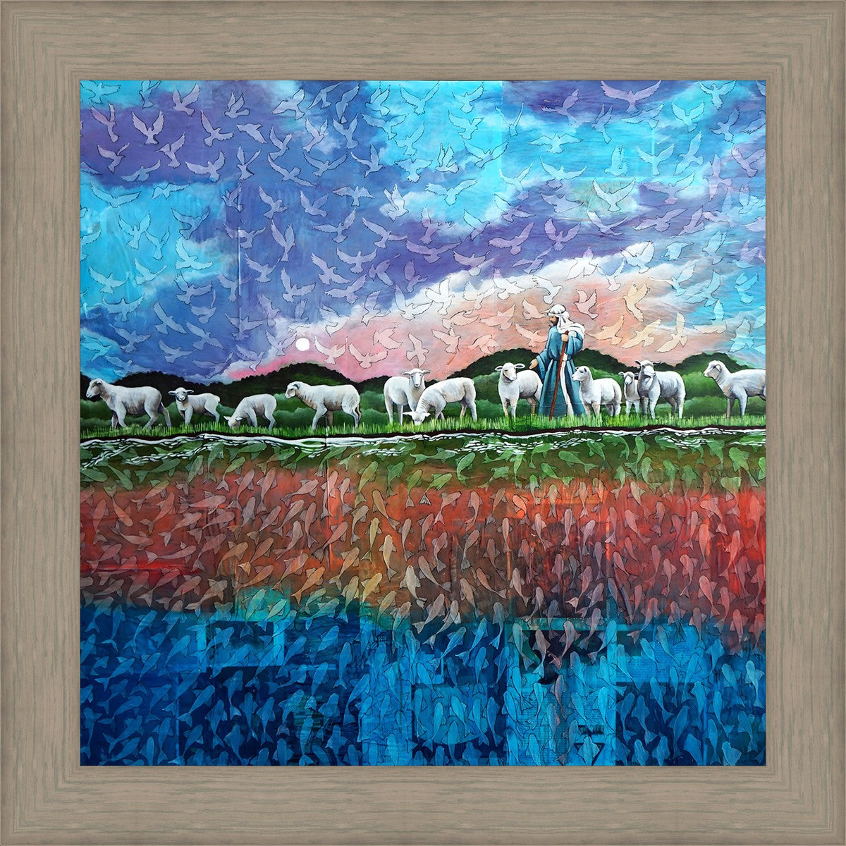 The Shepherd tends to his flock in a verdant pasture, while the sky and the seas are filled with his Spirit