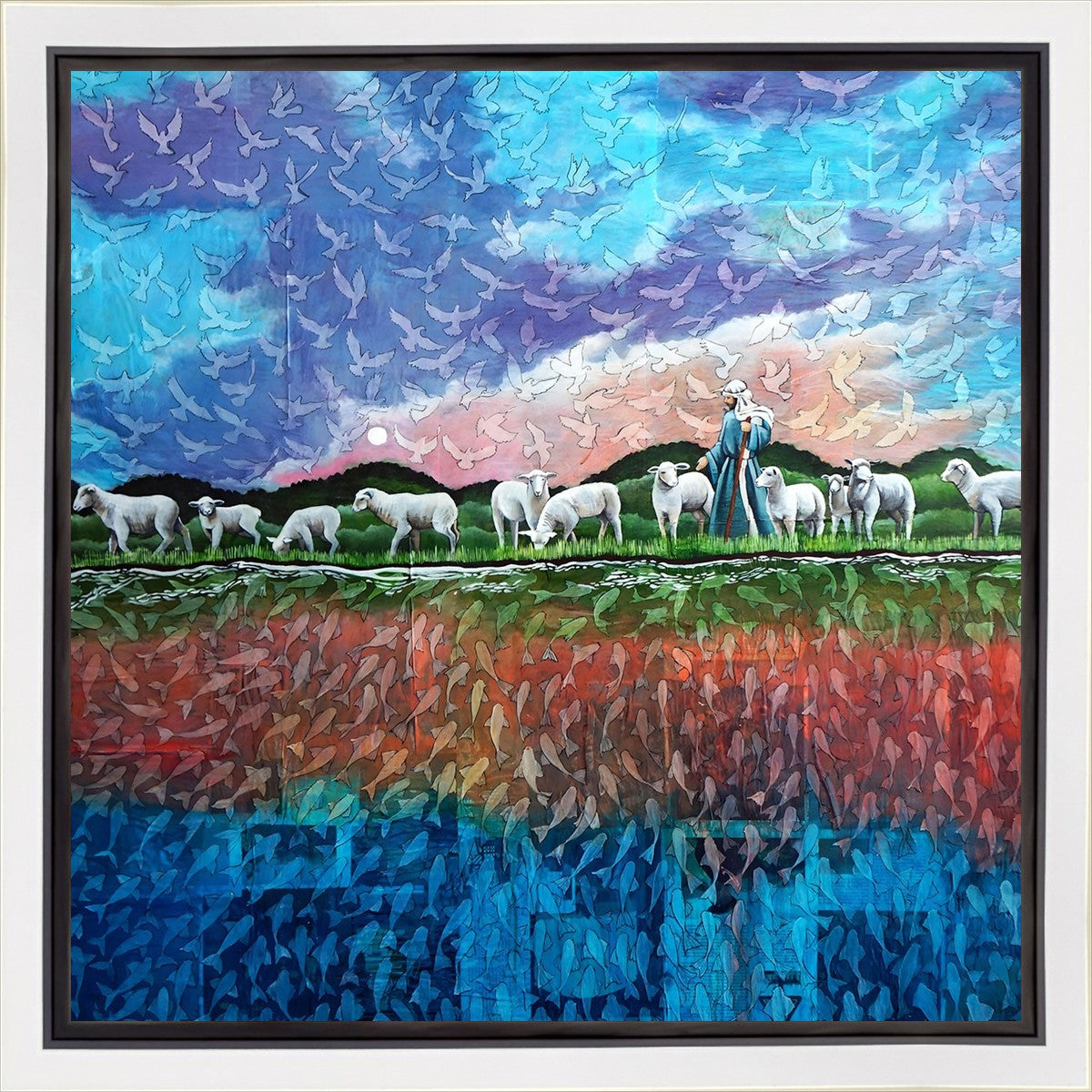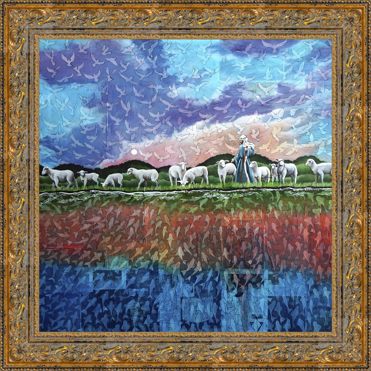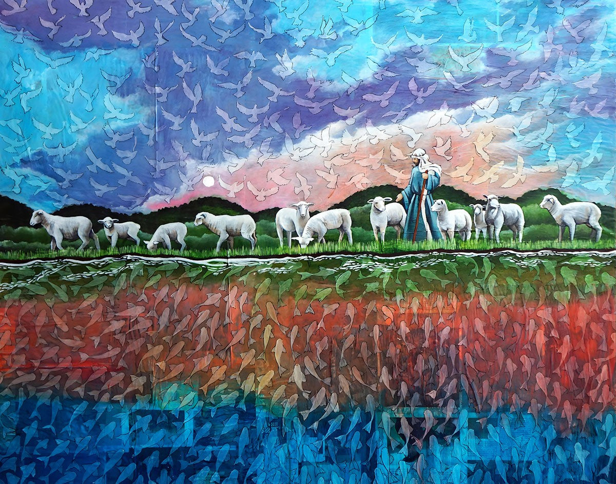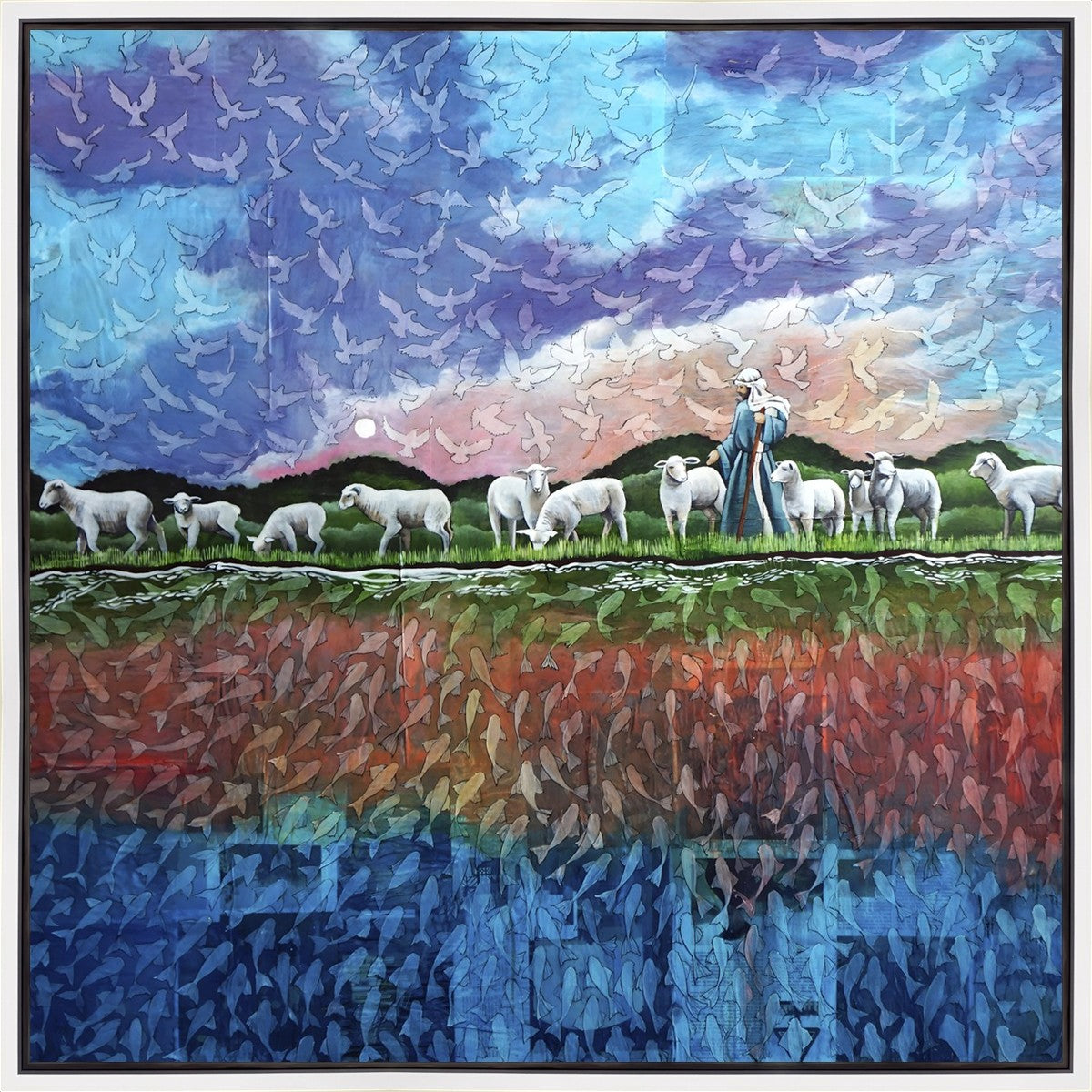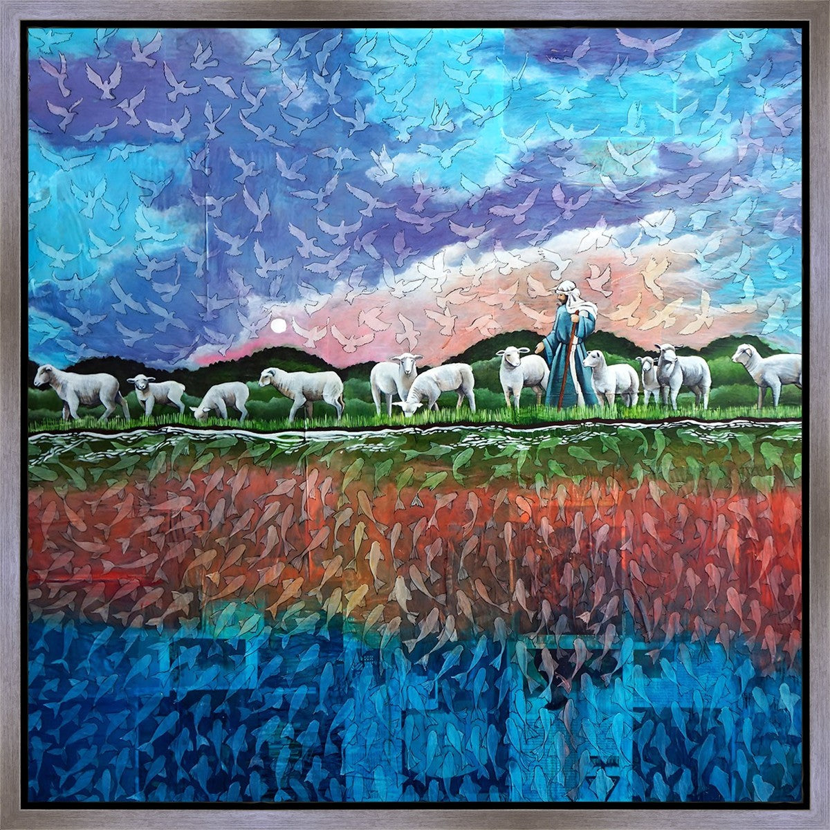 The Shepherd tends to his flock in a verdant pasture, while the sky and the seas are filled with his Spirit