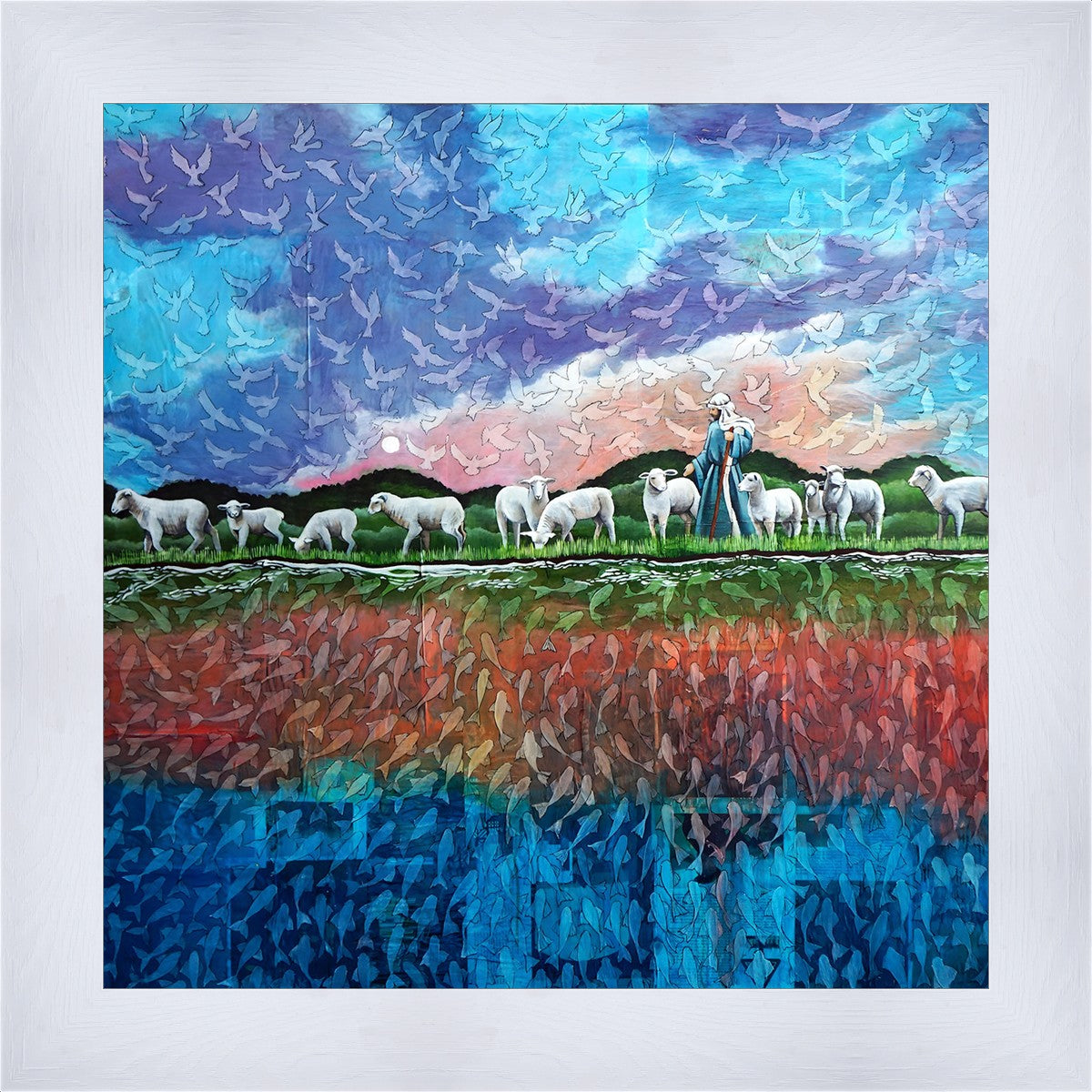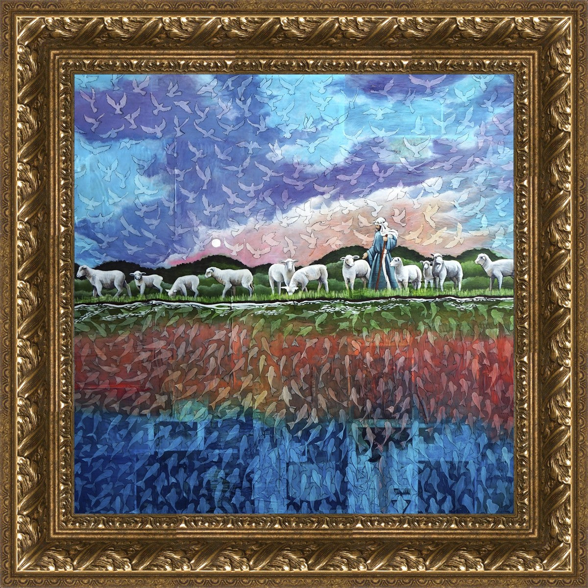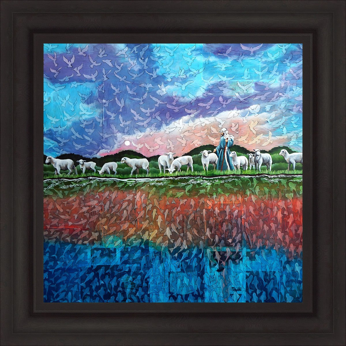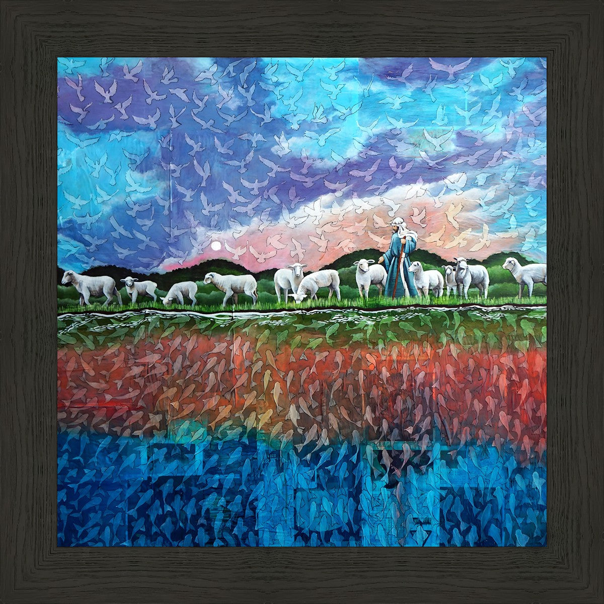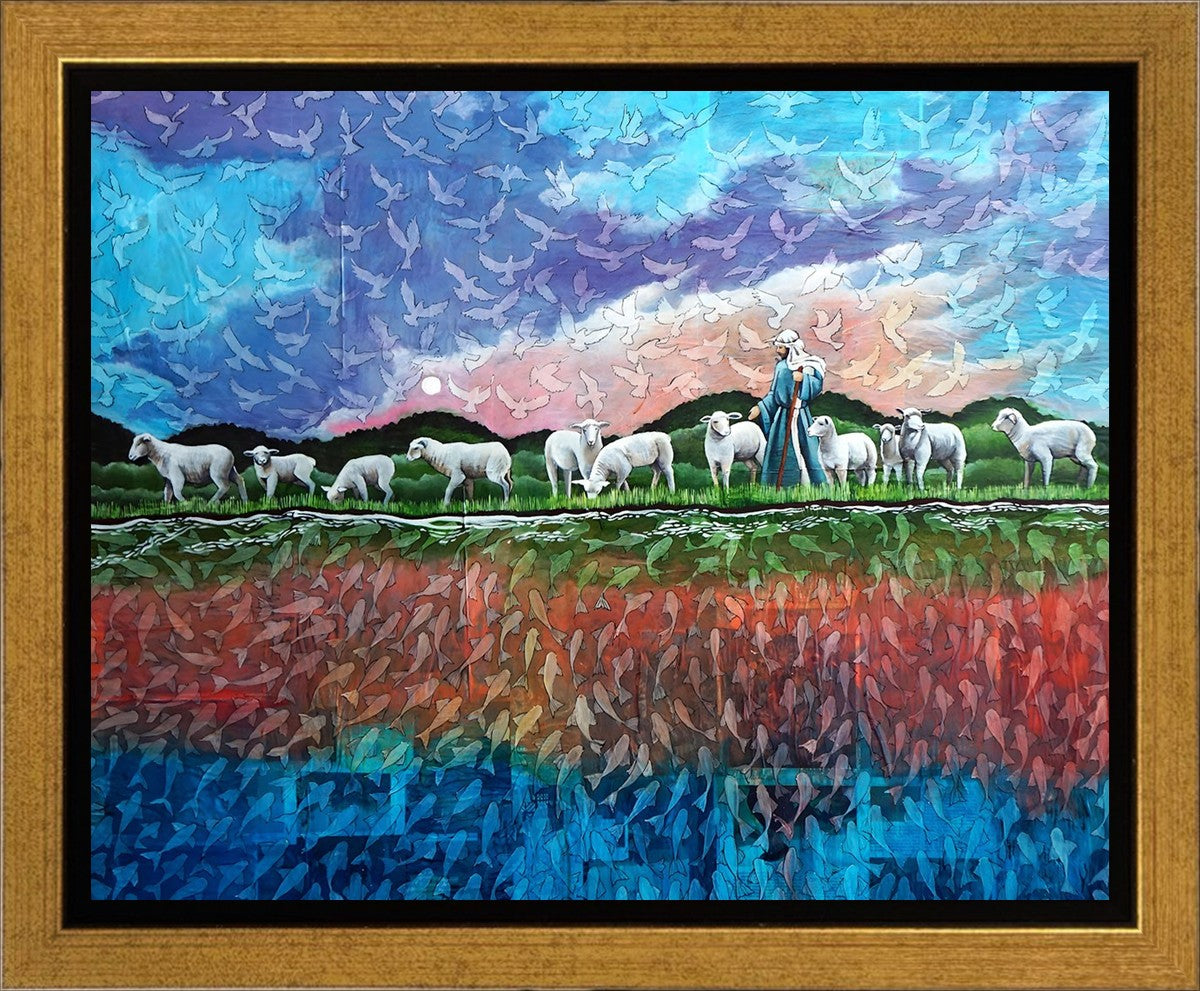 The Shepherd tends to his flock in a verdant pasture, while the sky and the seas are filled with his Spirit