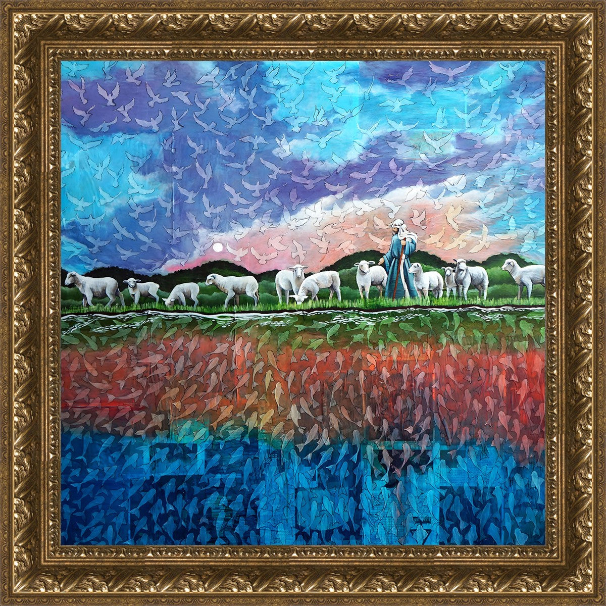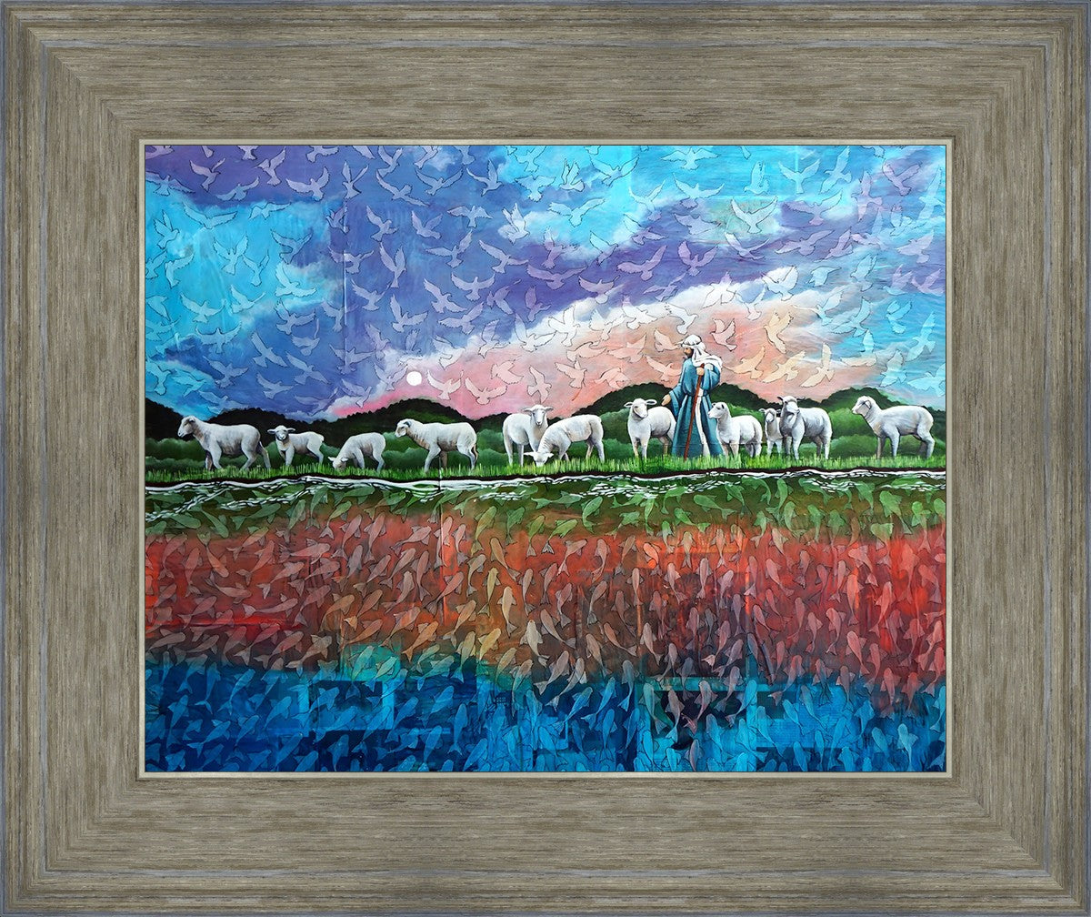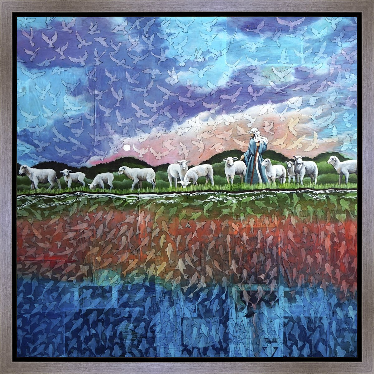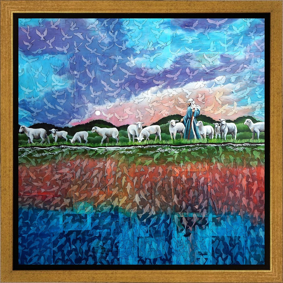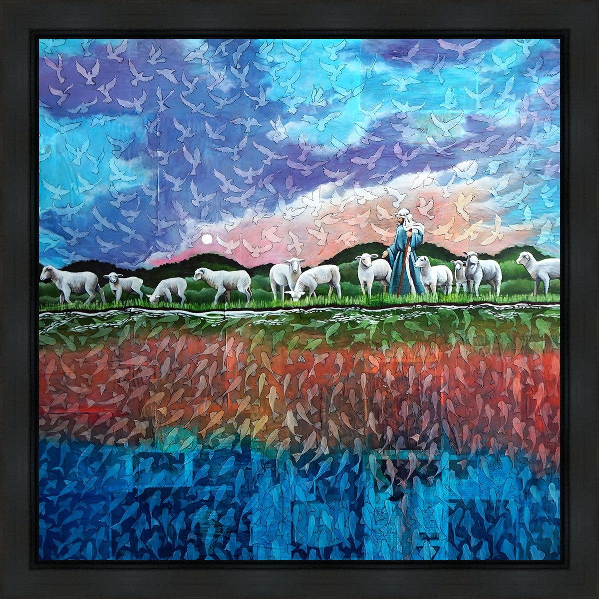 The Shepherd tends to his flock in a verdant pasture, while the sky and the seas are filled with his Spirit