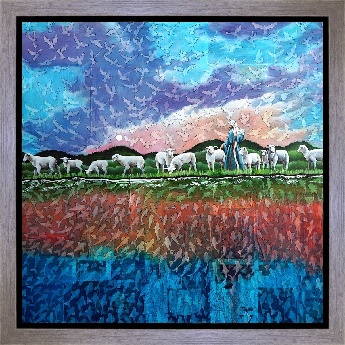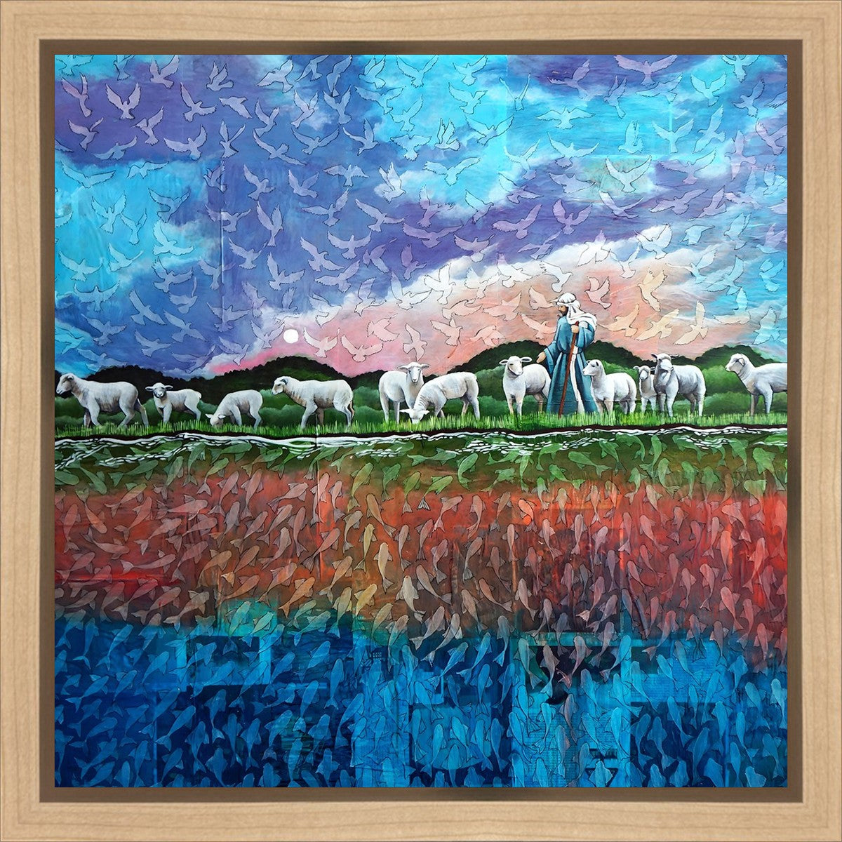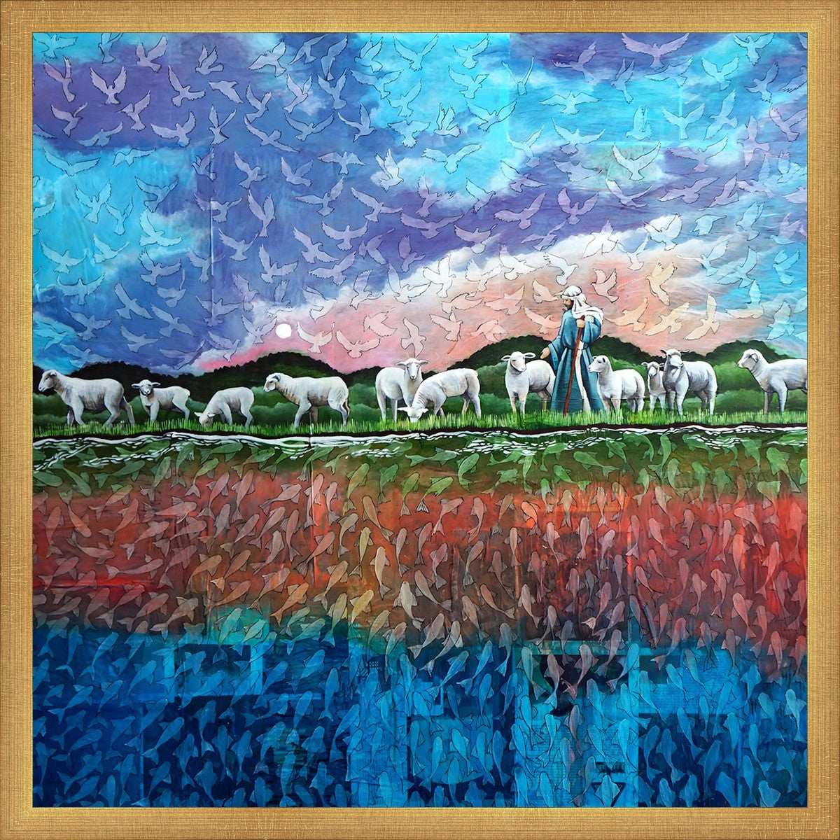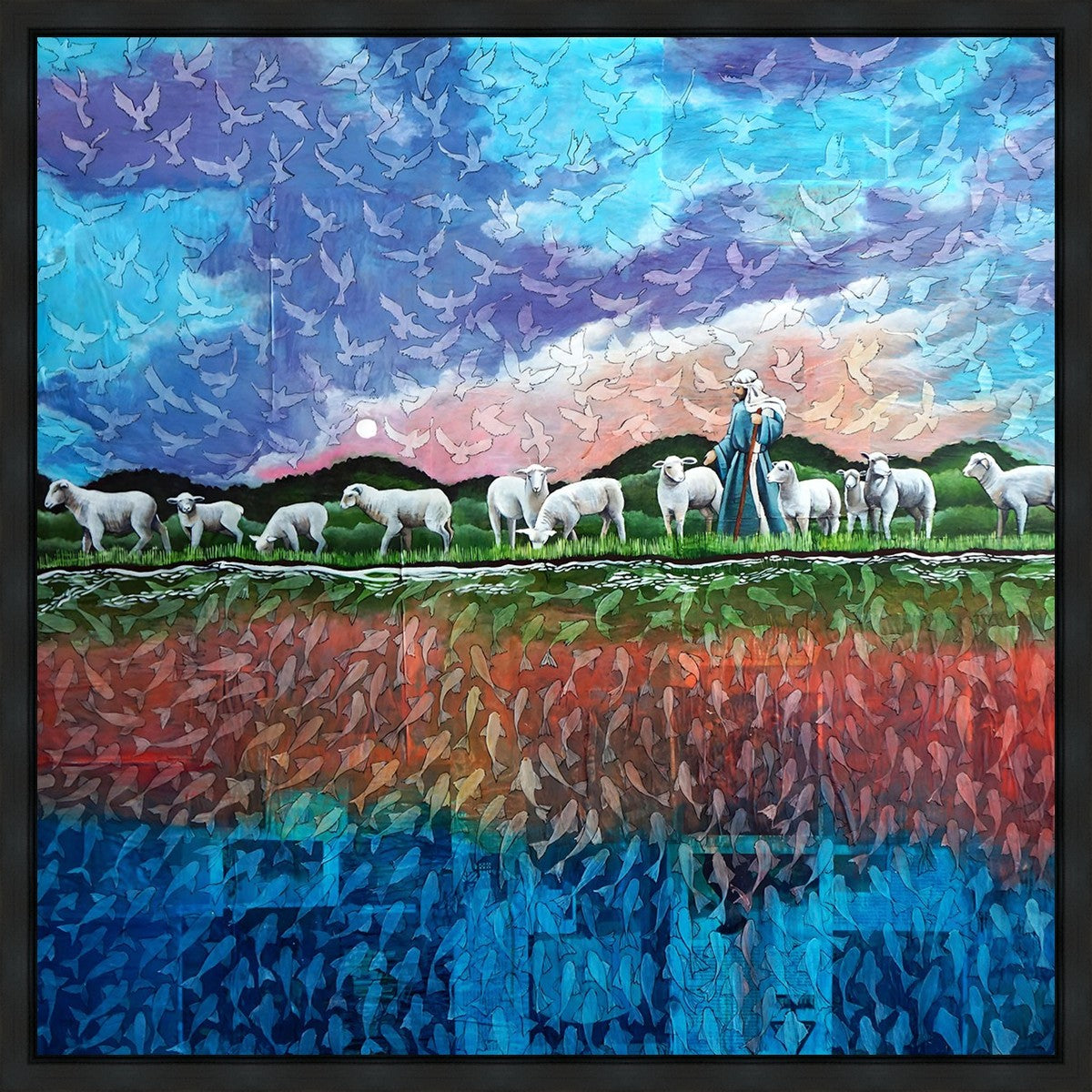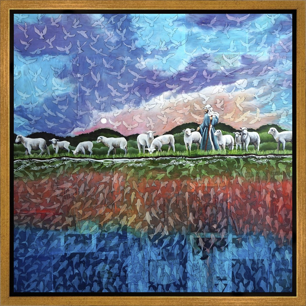 The Shepherd tends to his flock in a verdant pasture, while the sky and the seas are filled with his Spirit