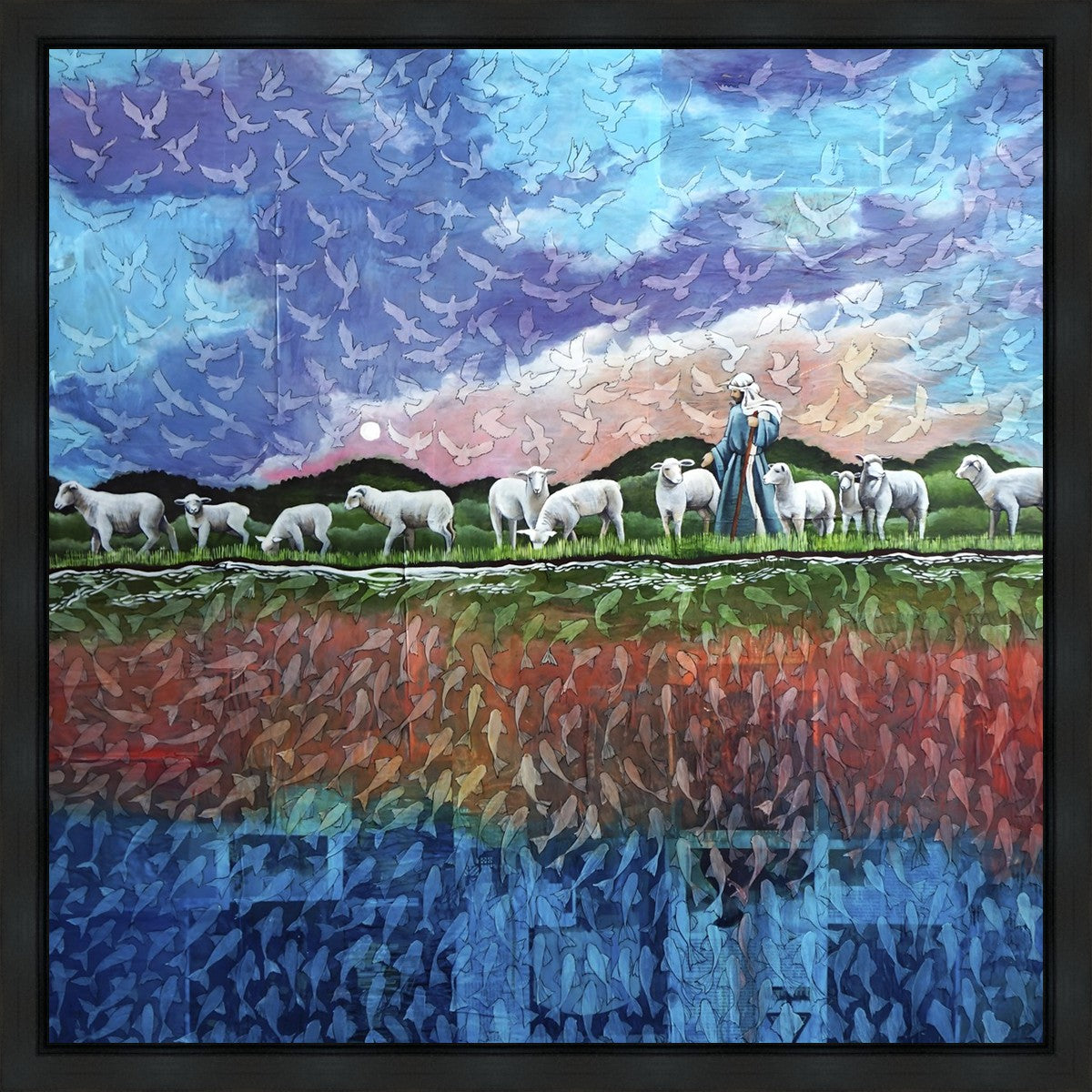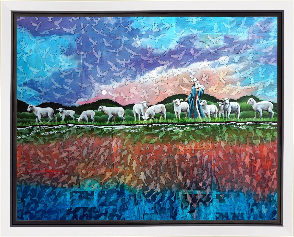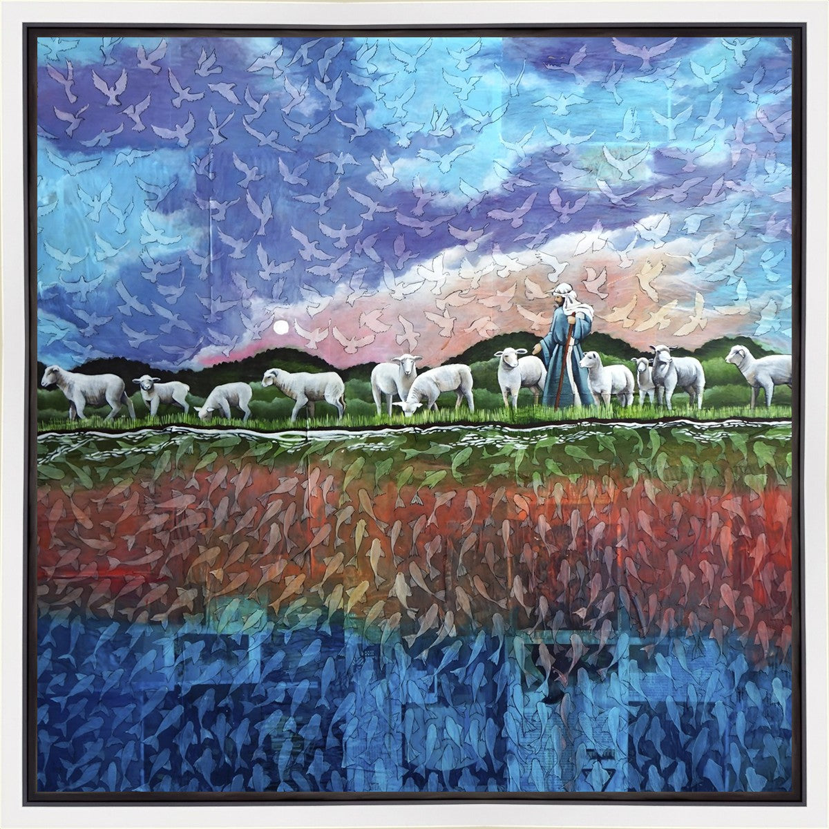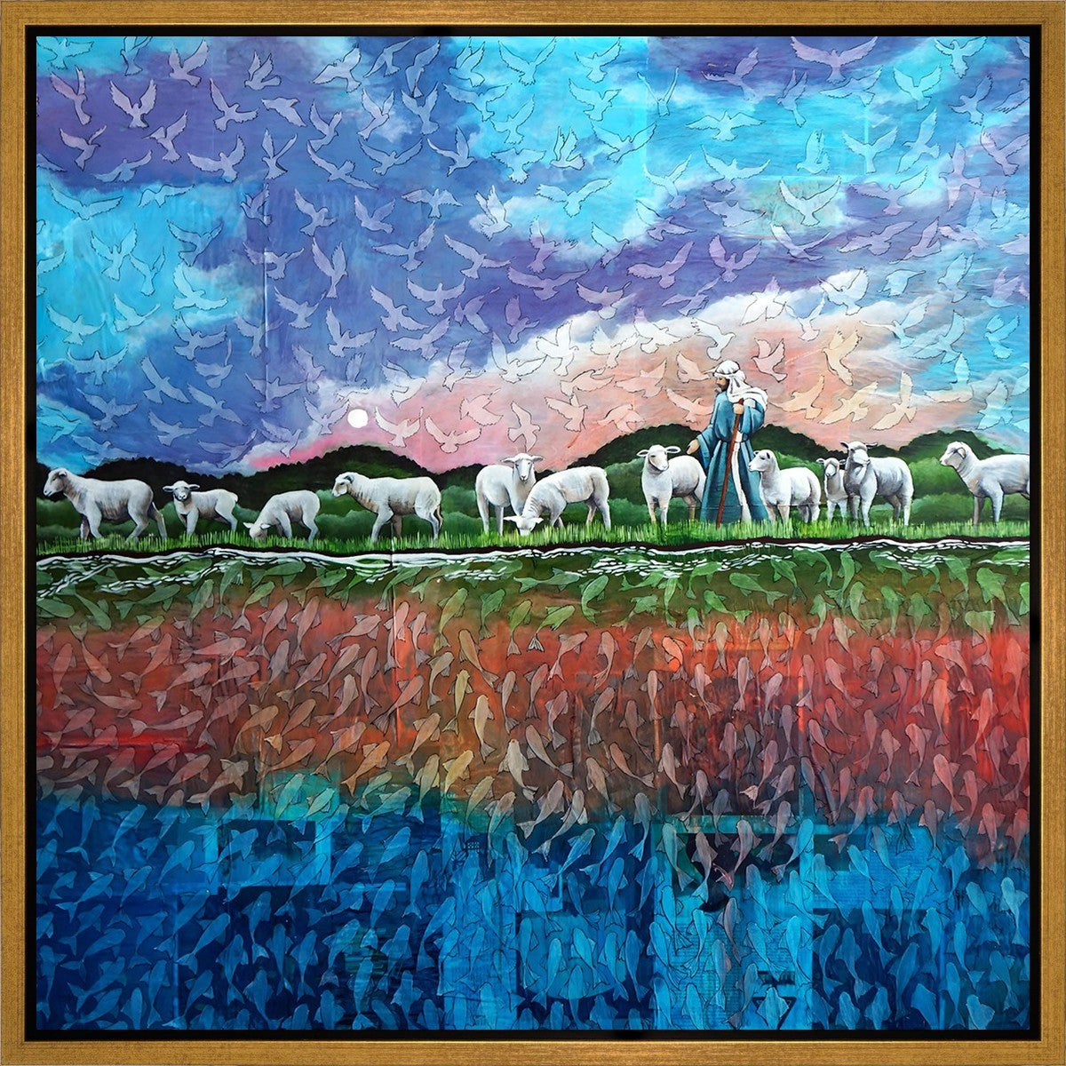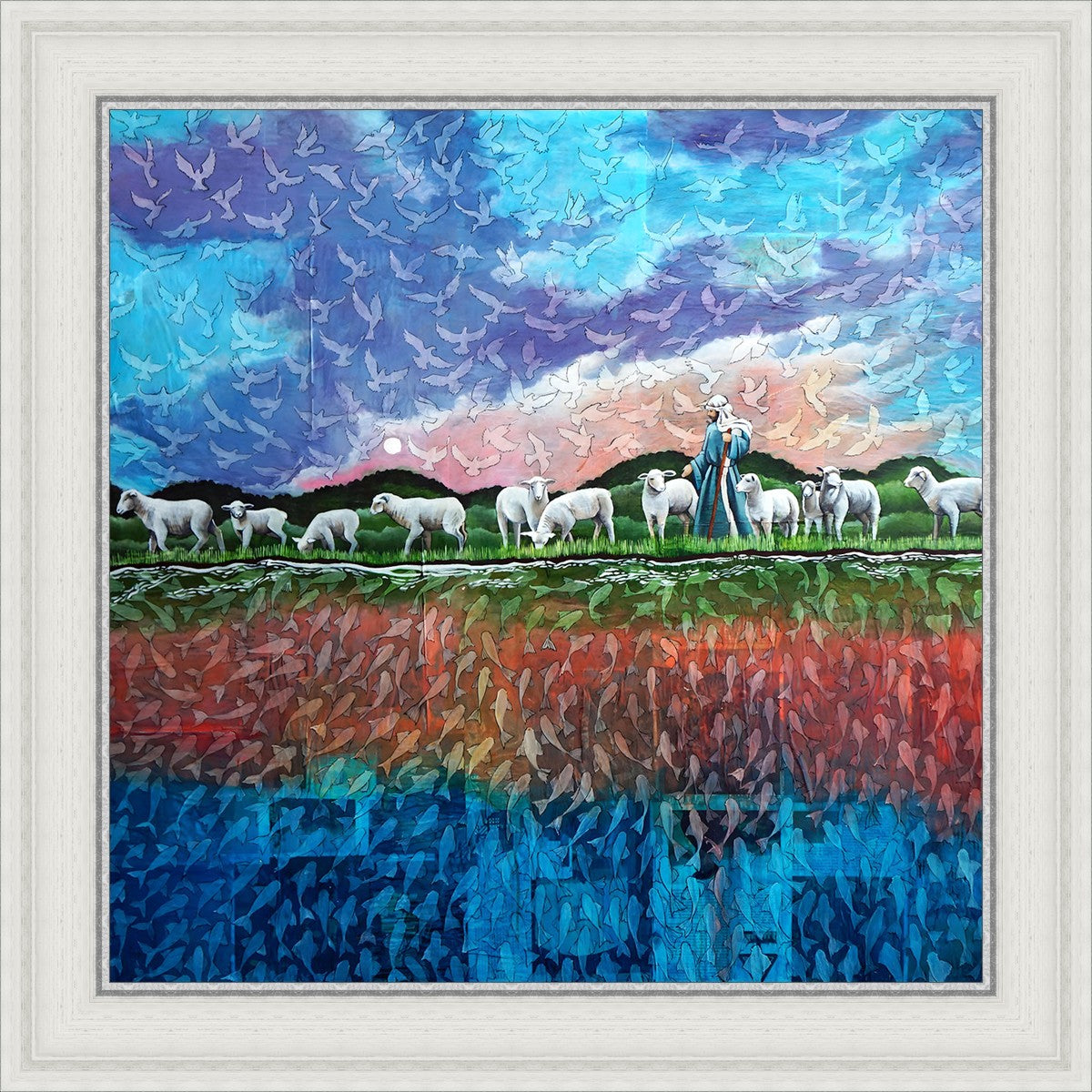 The Shepherd tends to his flock in a verdant pasture, while the sky and the seas are filled with his Spirit