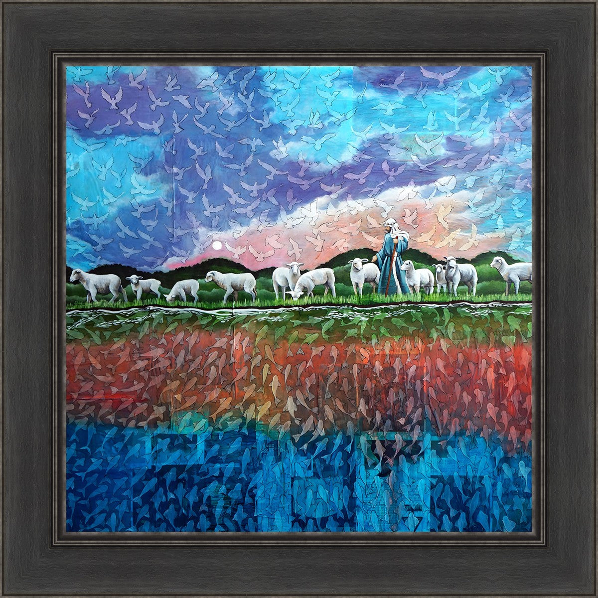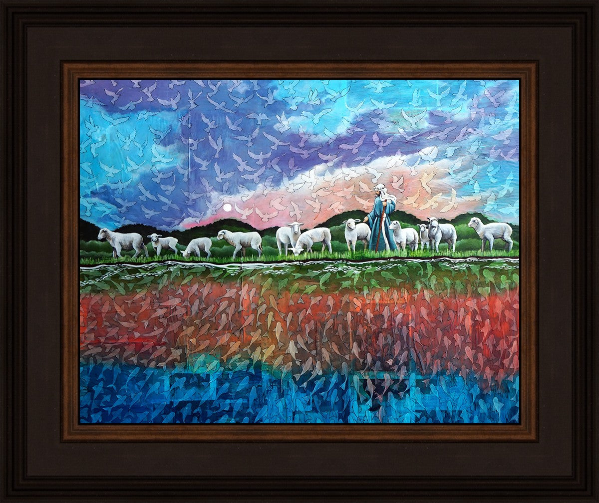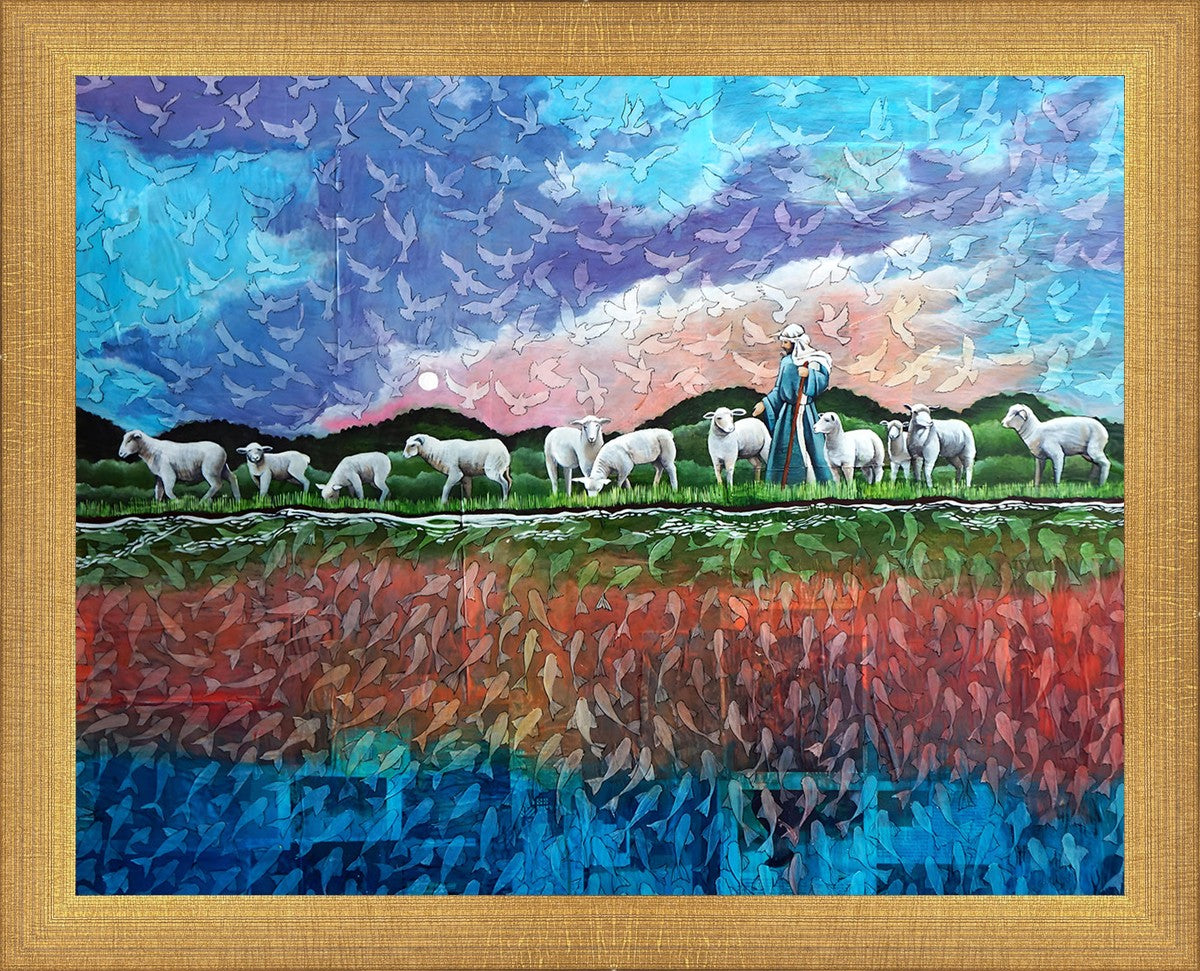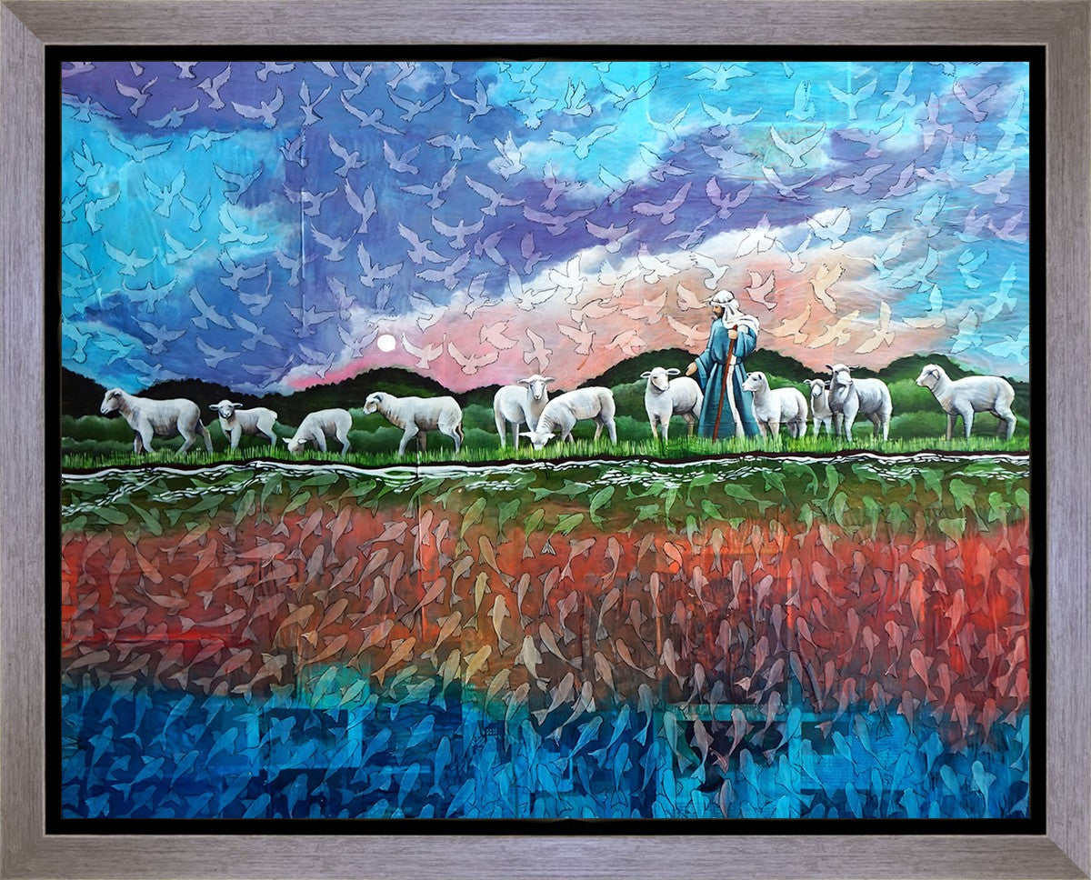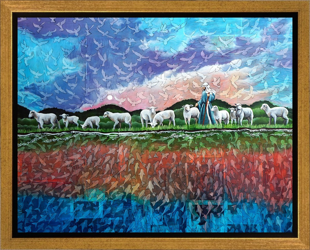 The Shepherd tends to his flock in a verdant pasture, while the sky and the seas are filled with his Spirit