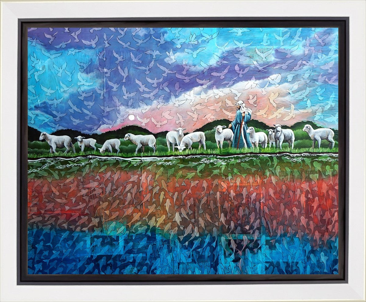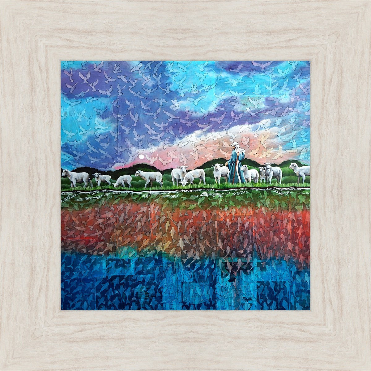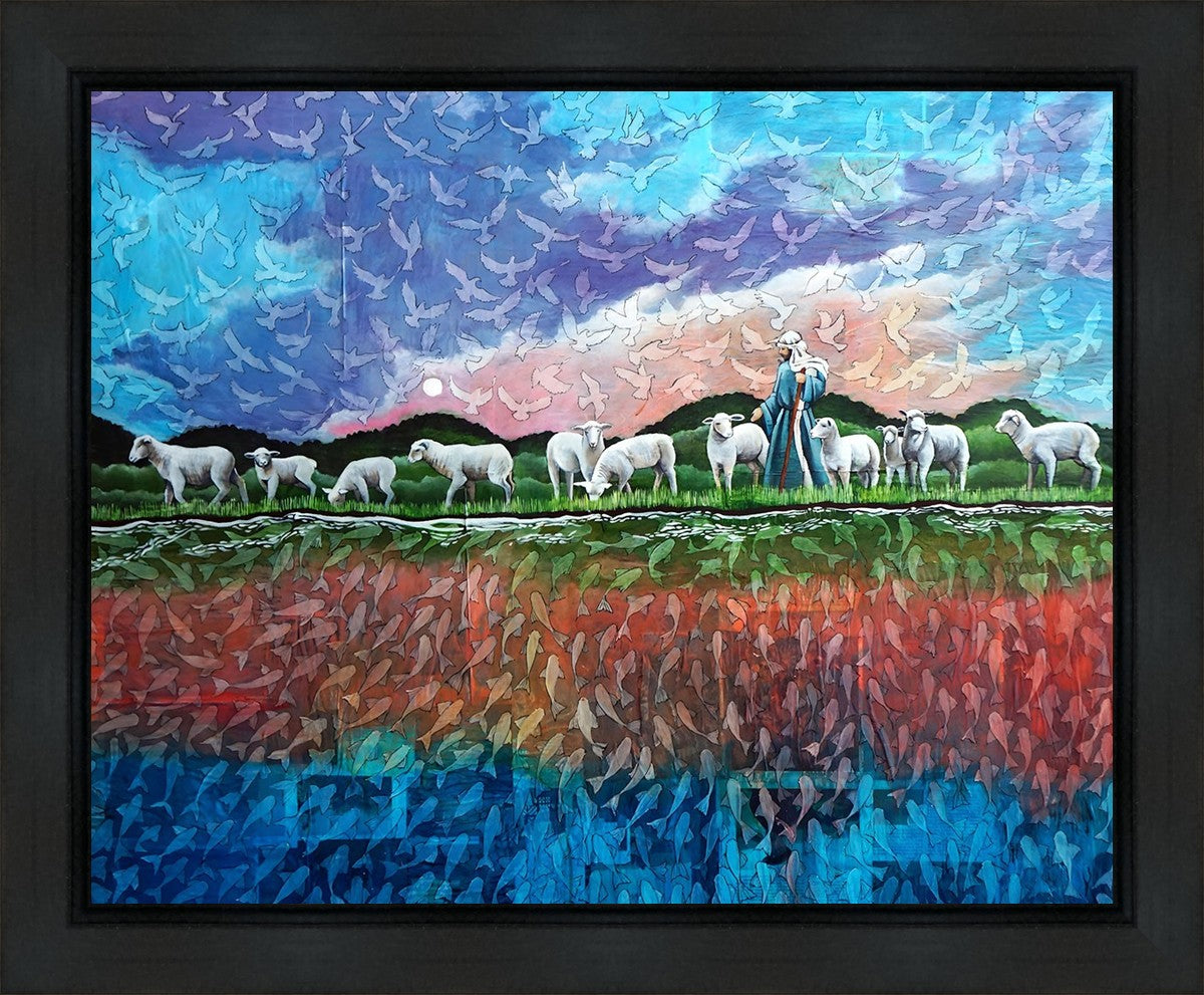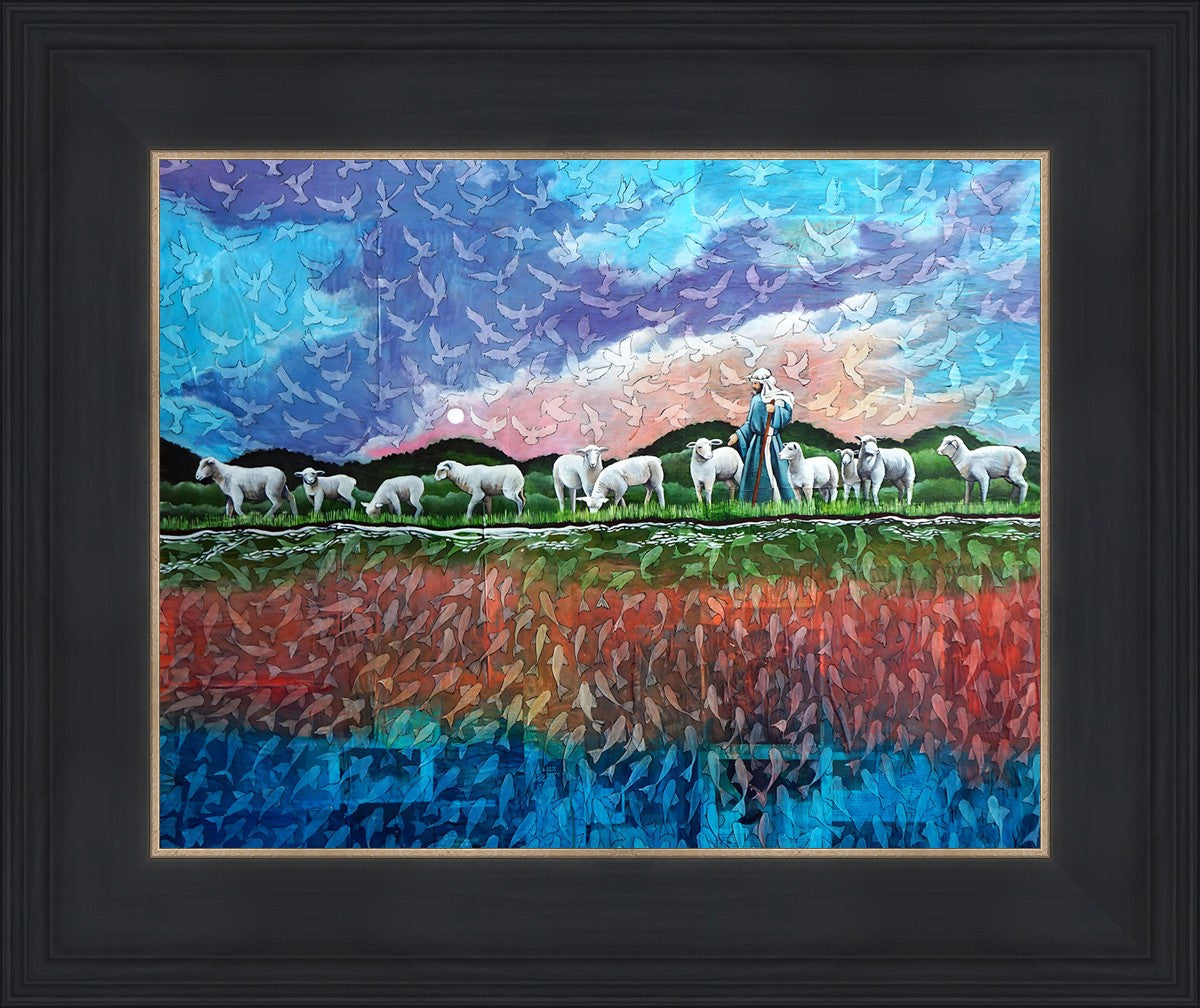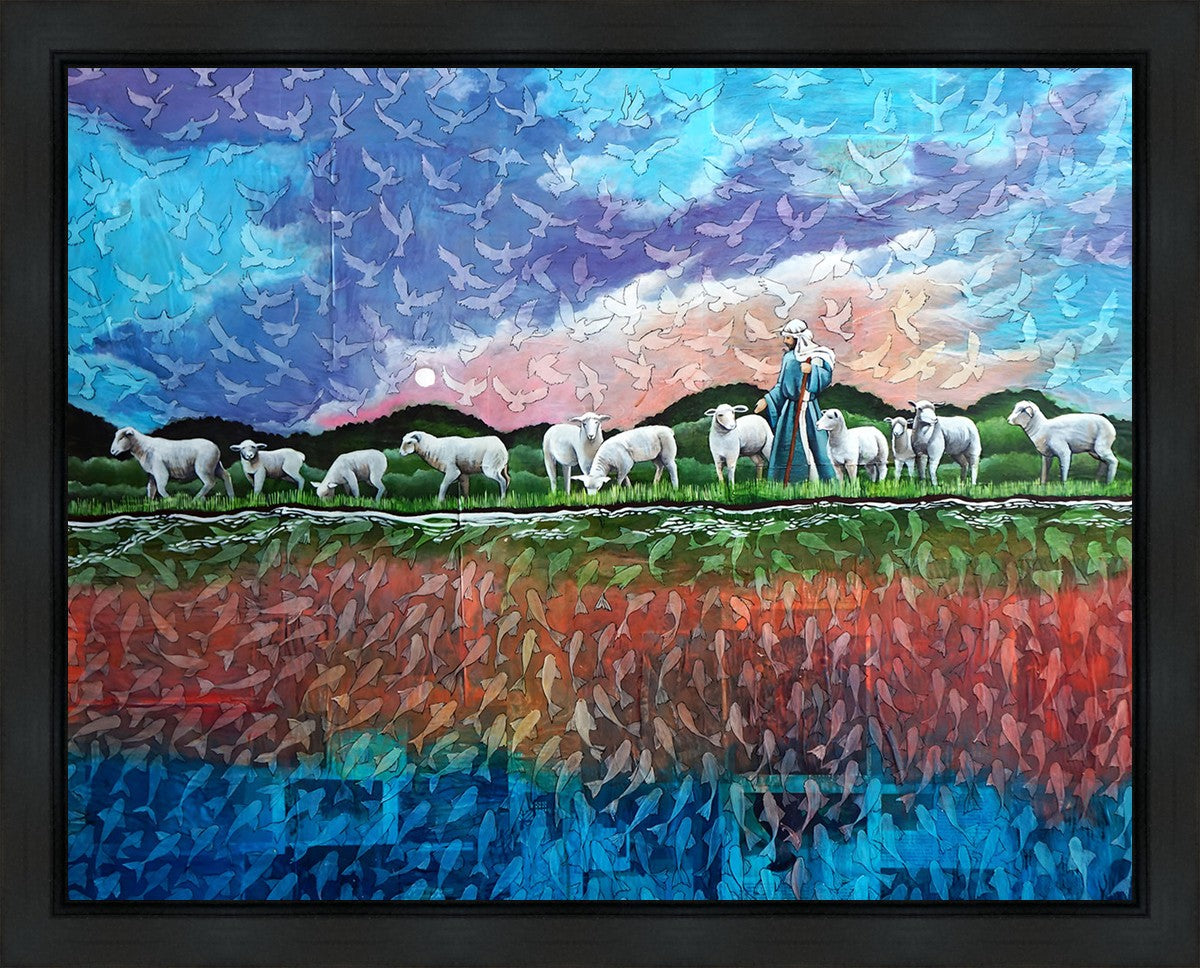 The Shepherd tends to his flock in a verdant pasture, while the sky and the seas are filled with his Spirit