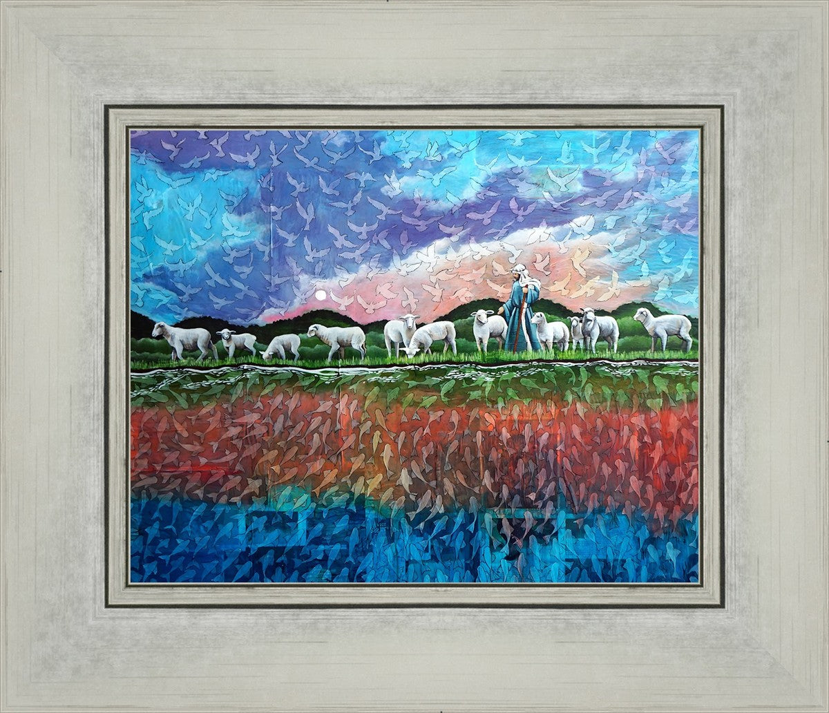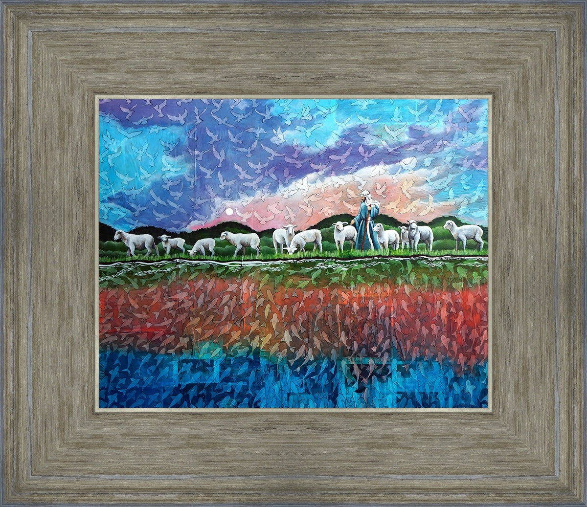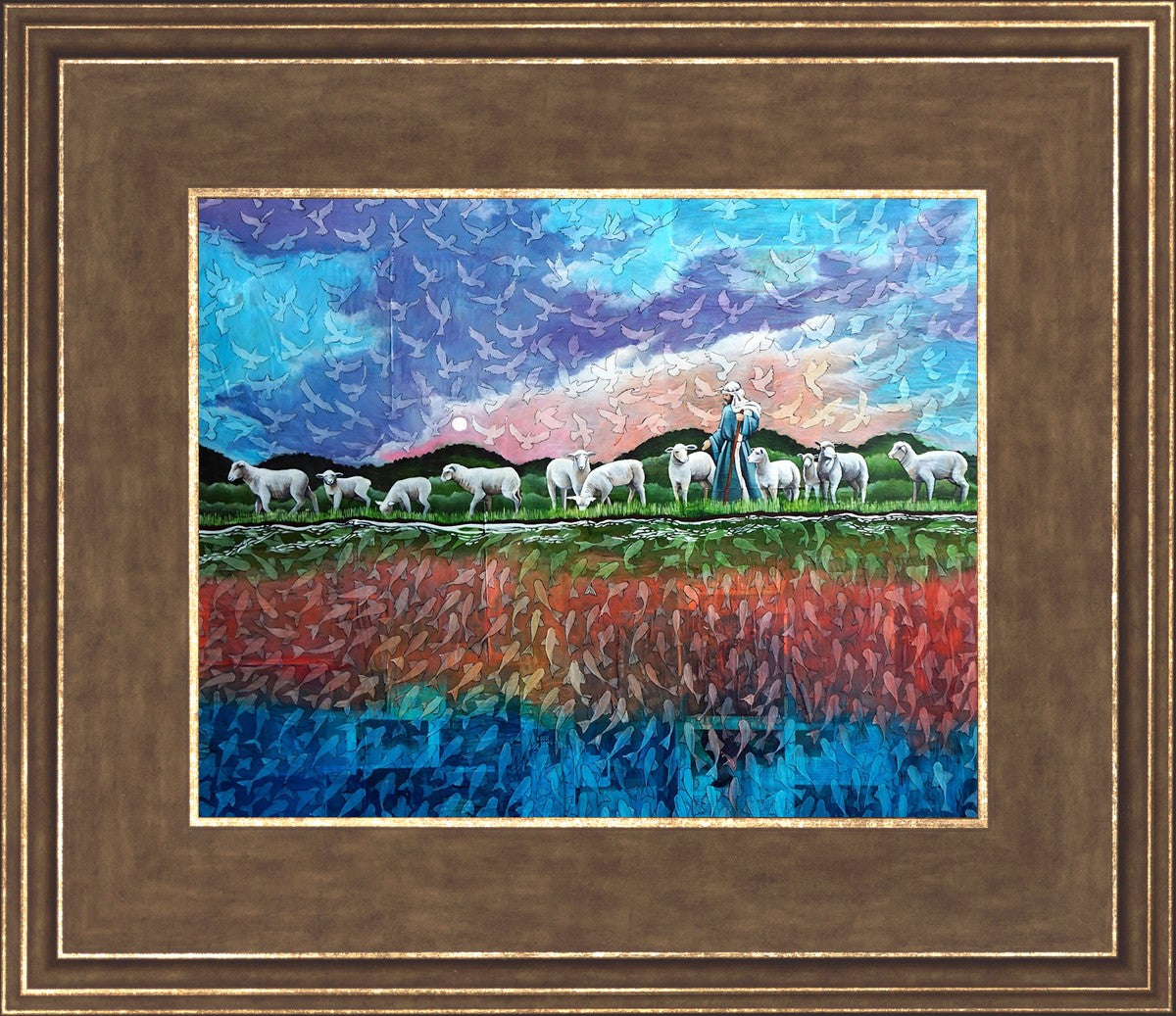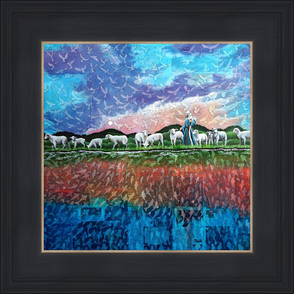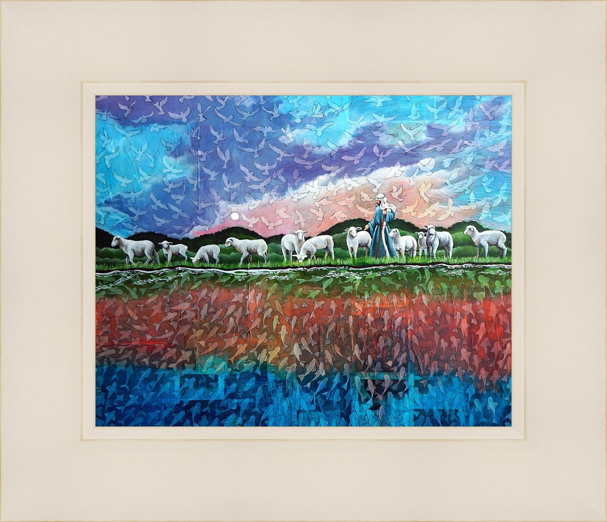 The Shepherd tends to his flock in a verdant pasture, while the sky and the seas are filled with his Spirit