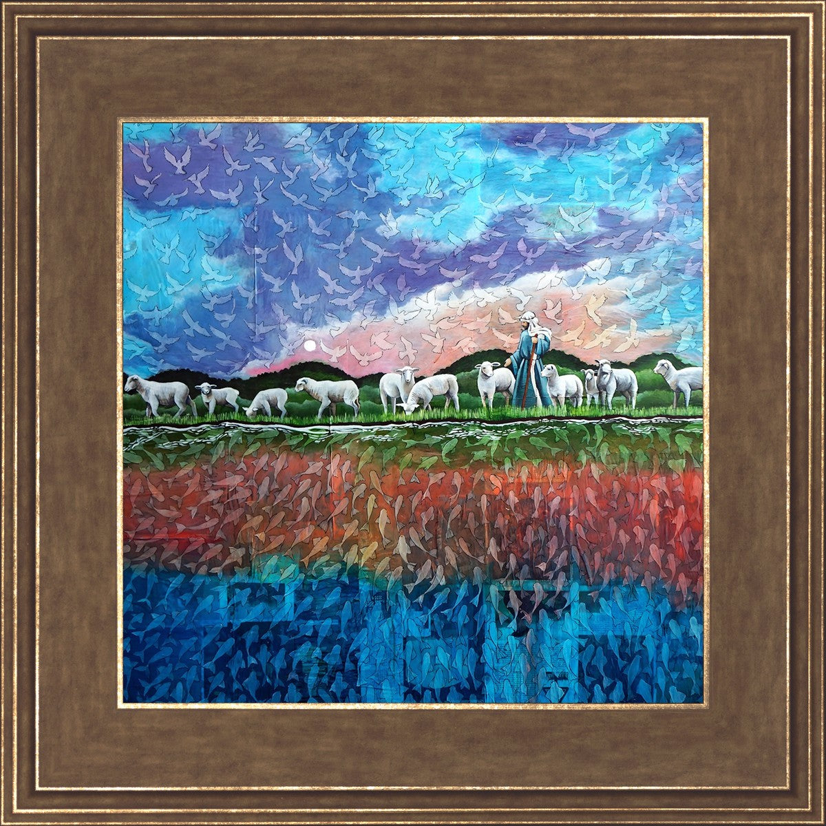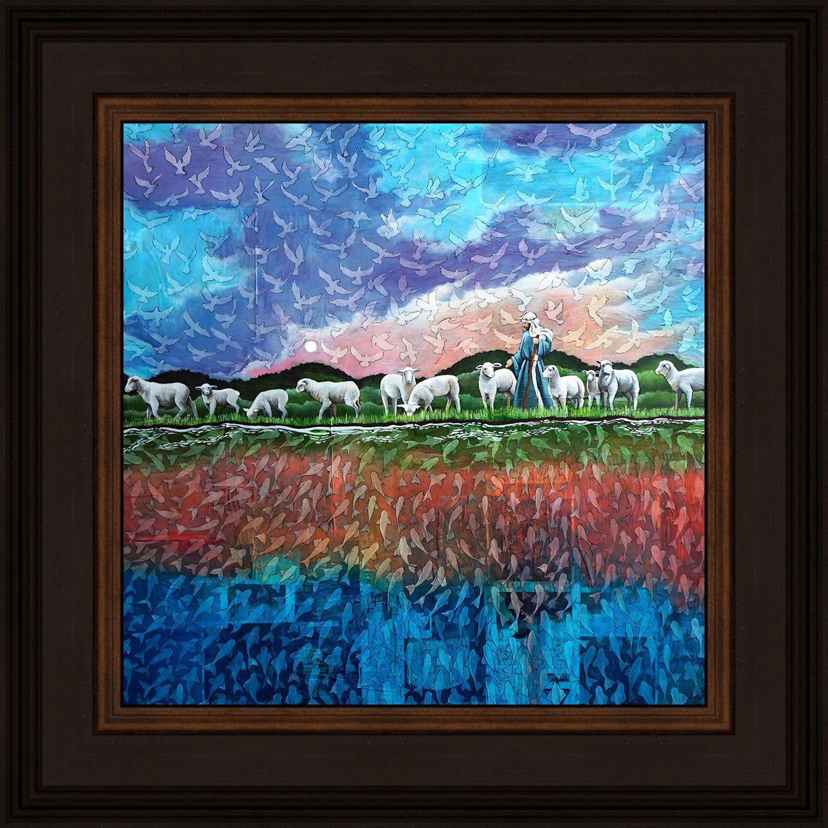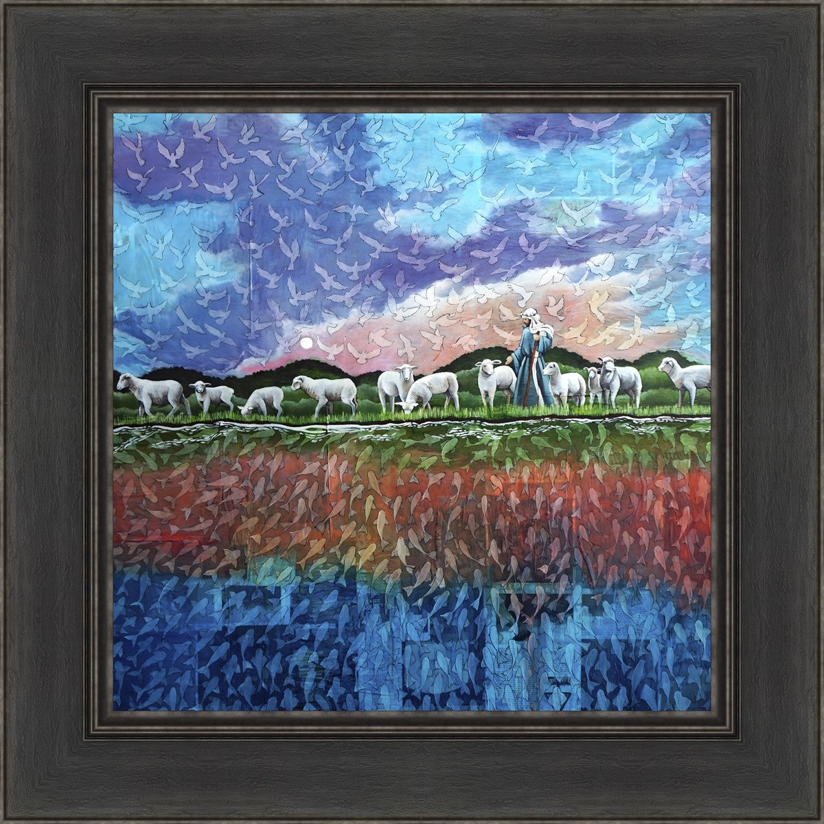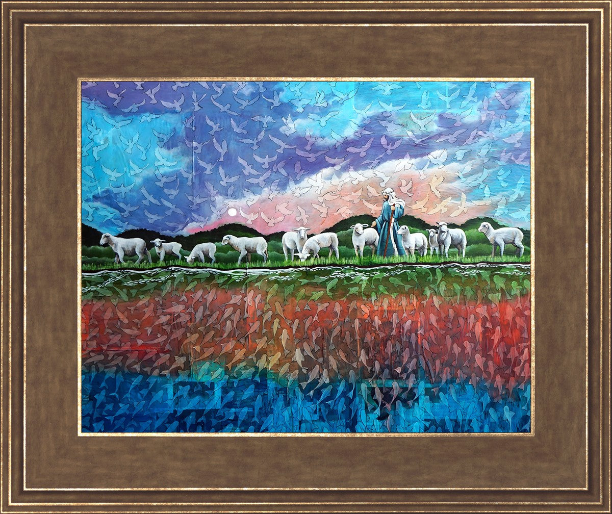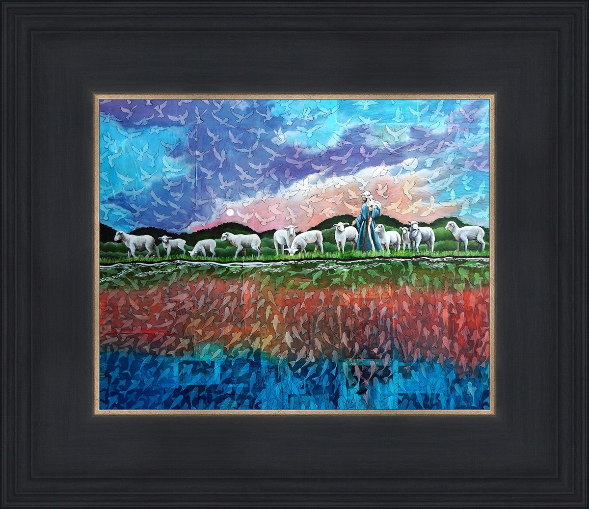 The Shepherd tends to his flock in a verdant pasture, while the sky and the seas are filled with his Spirit