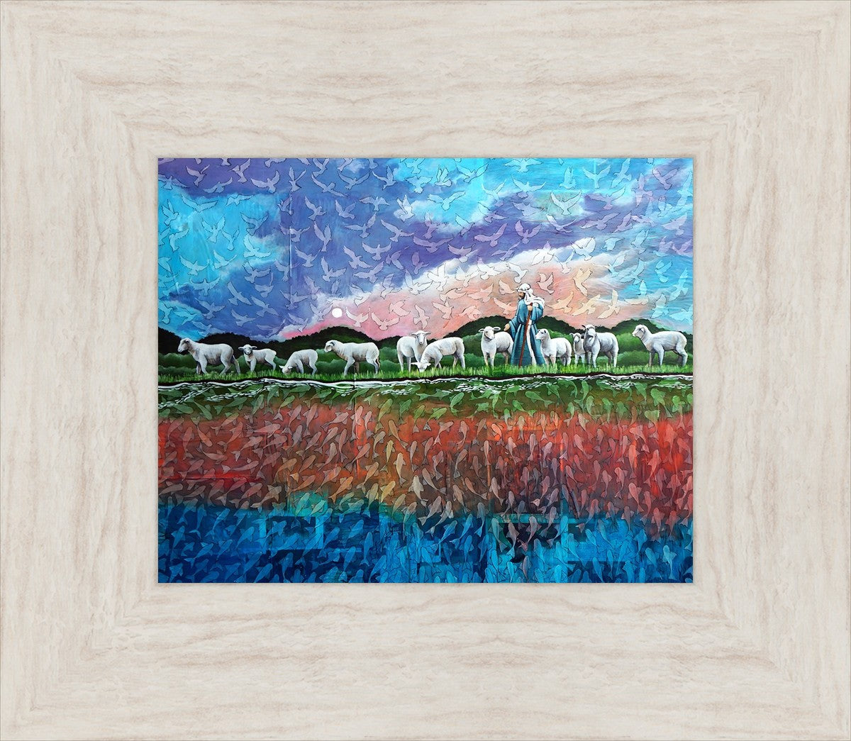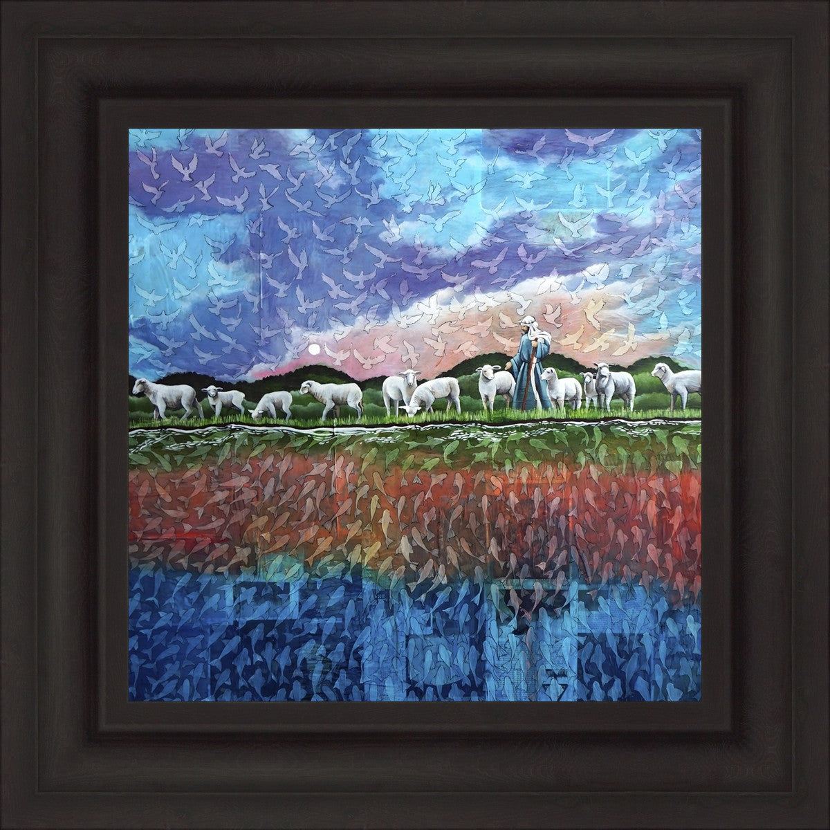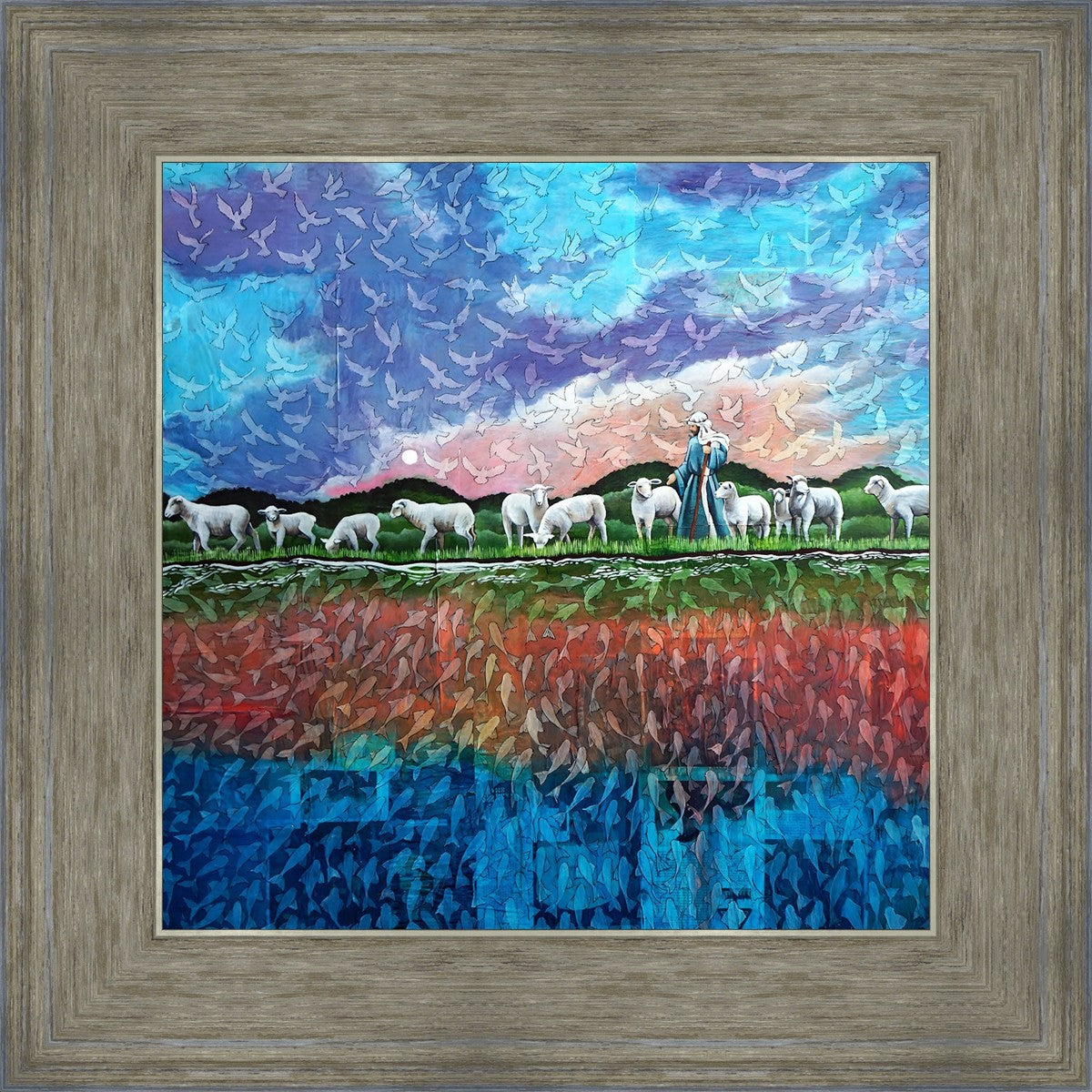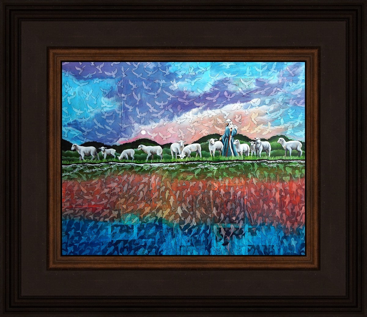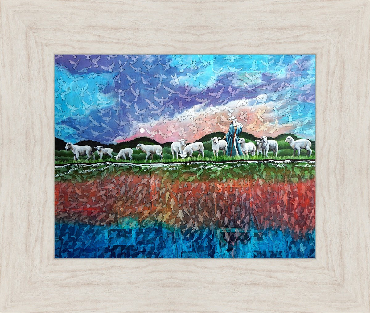 The Shepherd tends to his flock in a verdant pasture, while the sky and the seas are filled with his Spirit