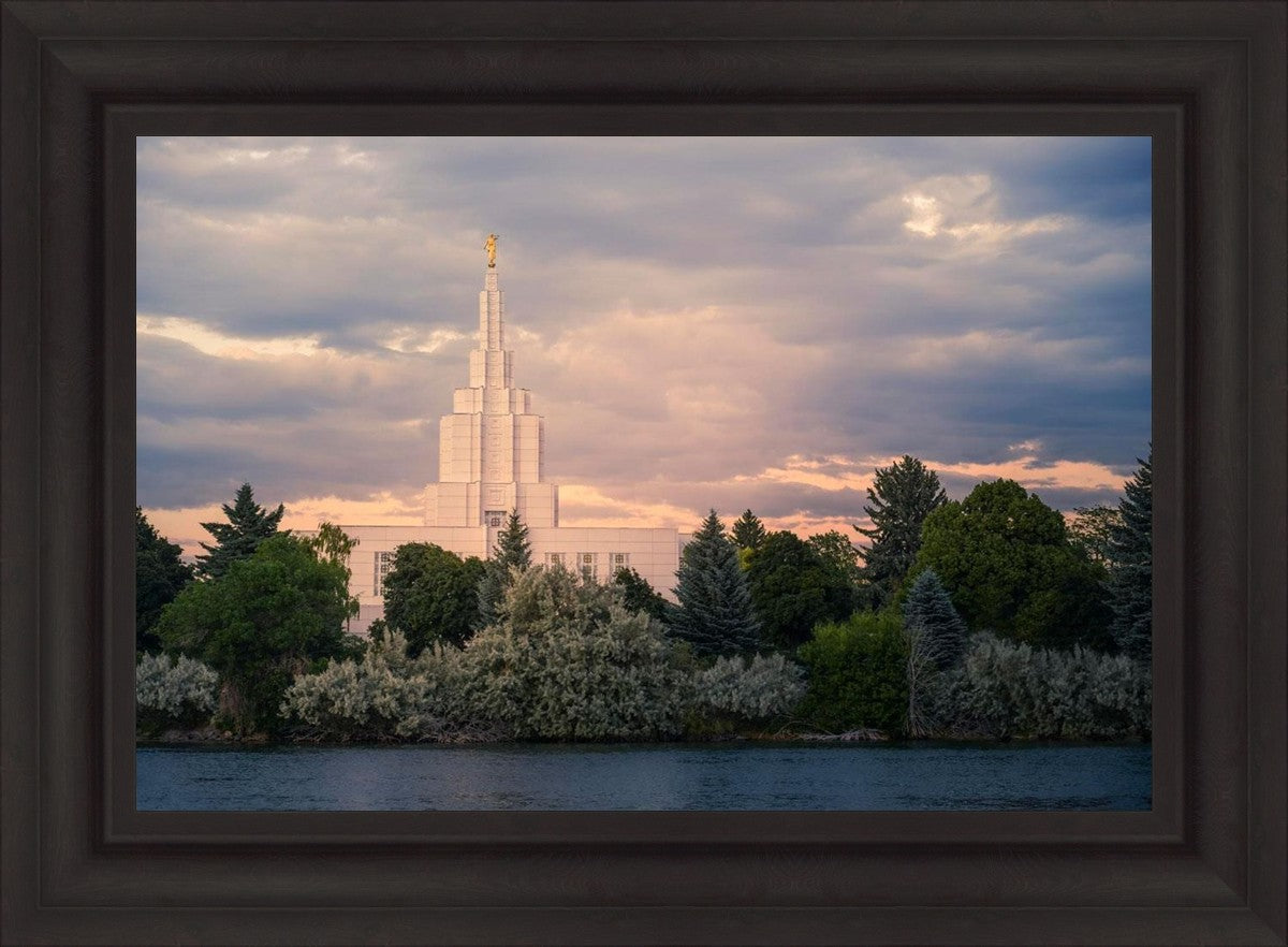 Sun setting over the Snake River and the Idaho Falls Idaho Temple.