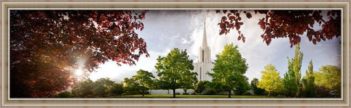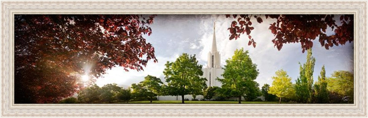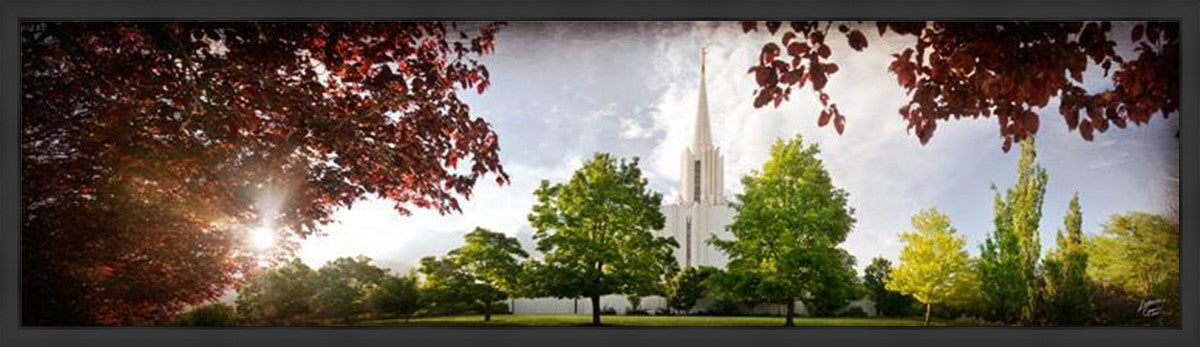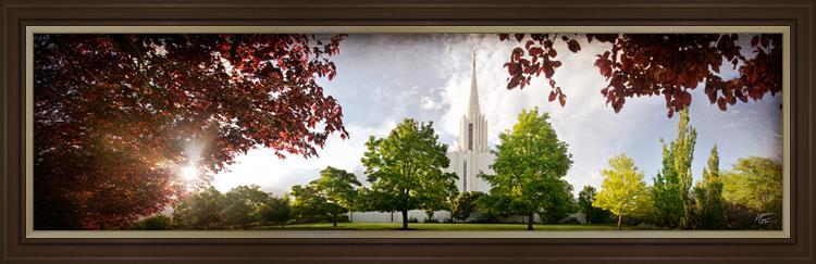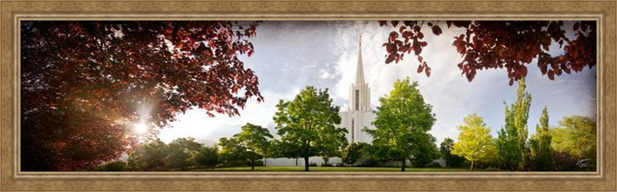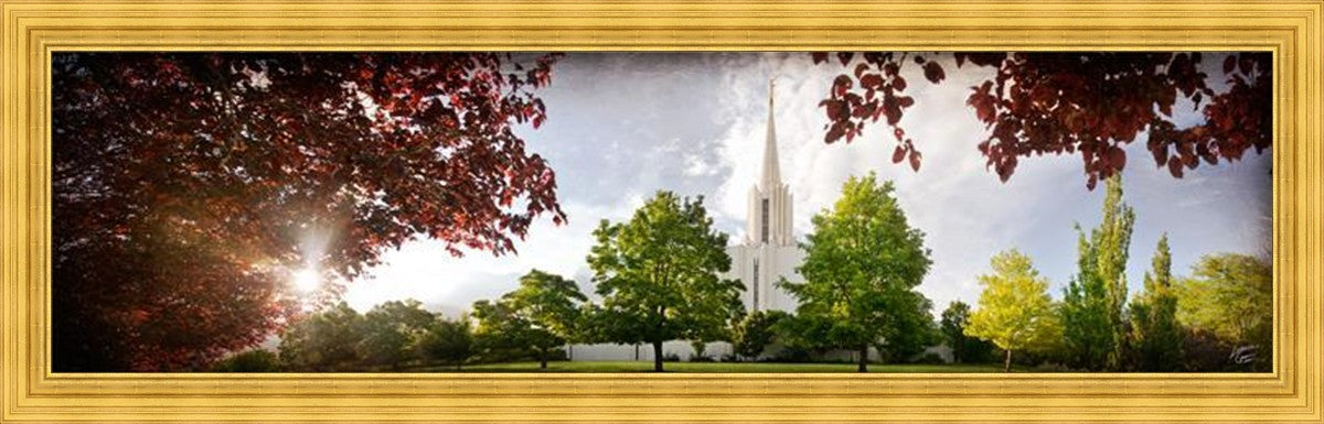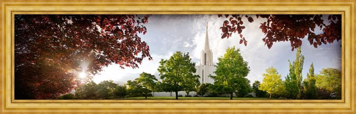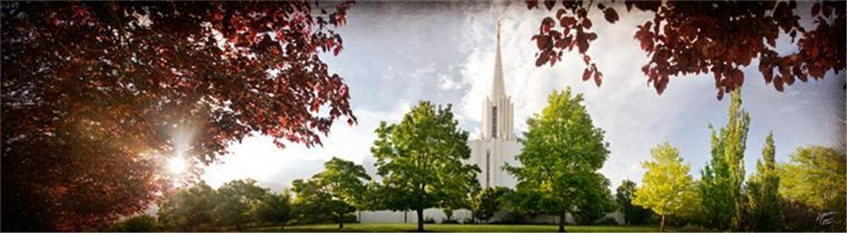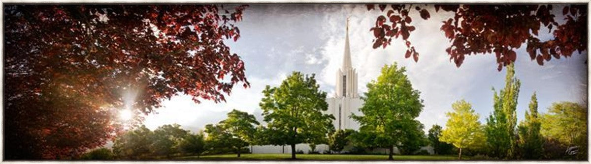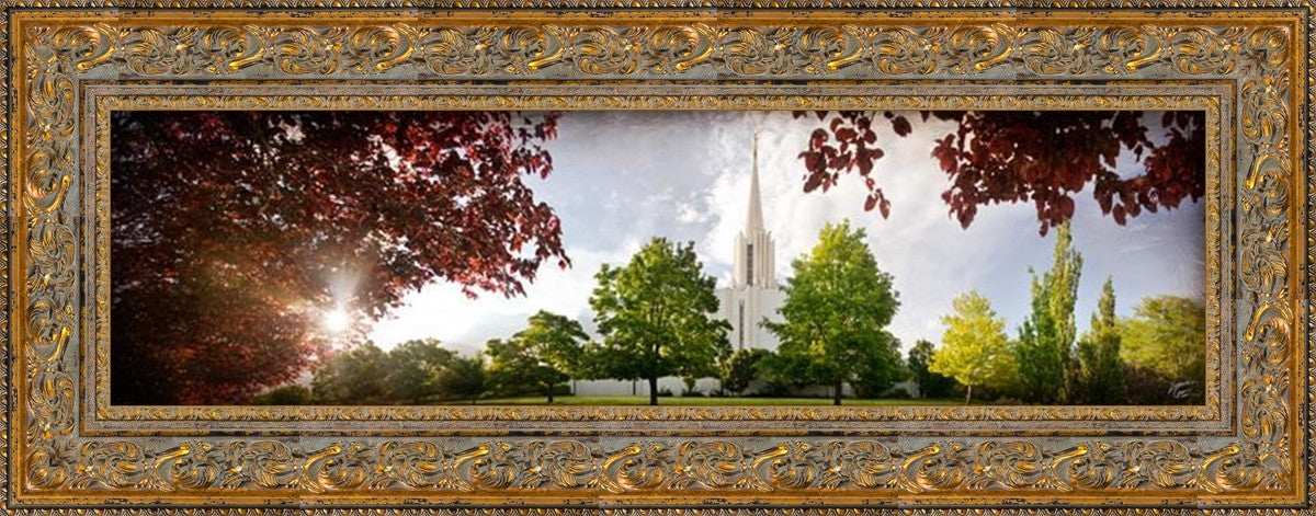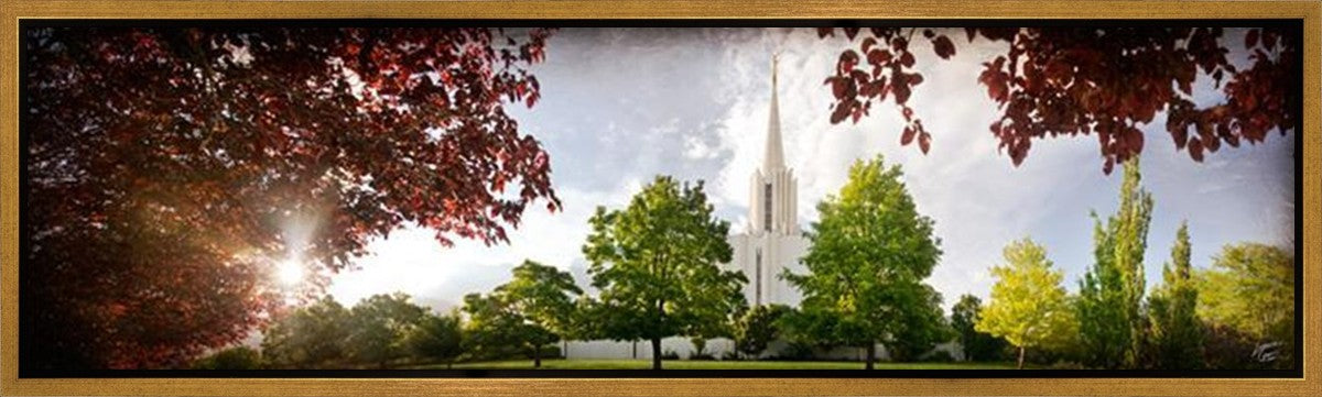 Since 1999 Landon has worked as an artisan in nearly 40 temples doing the decorative paint and gold leaf. He continues to do so as well as wood repair and graining. He was married in 2001 to Jacey Thomas in the Manti Utah temple. When she couldn’t find an image of the temple that she liked enough to purchase for their home, he decided to take one himself. That desire to create something original and different inspired his current series of temple art. They are taken from a panoramic viewpoint and stylized with an artistic border that reflect his paintings. All modern structures apart from the temple have been omitted.