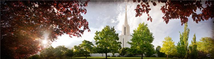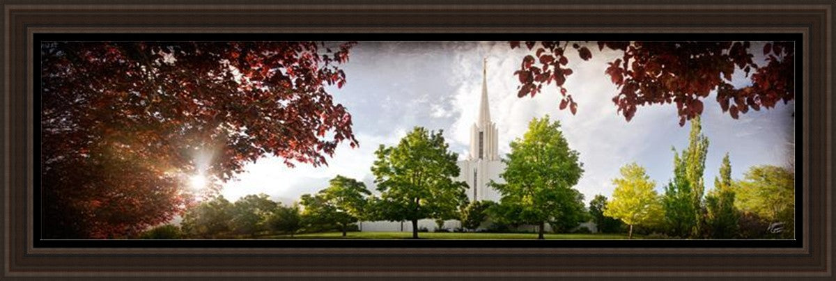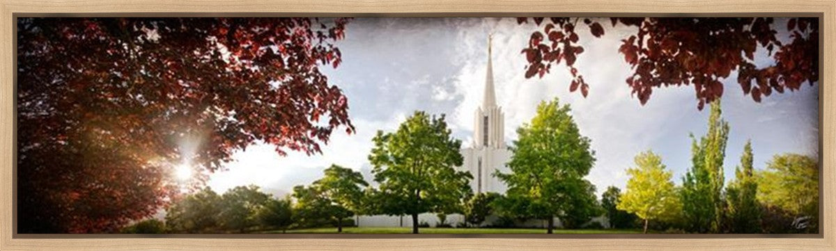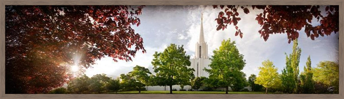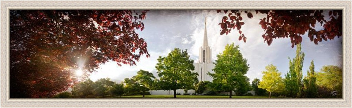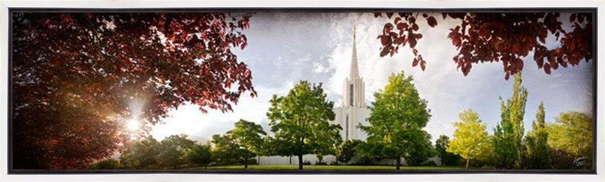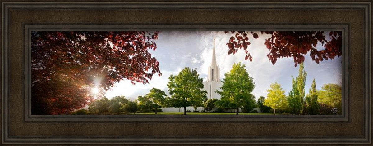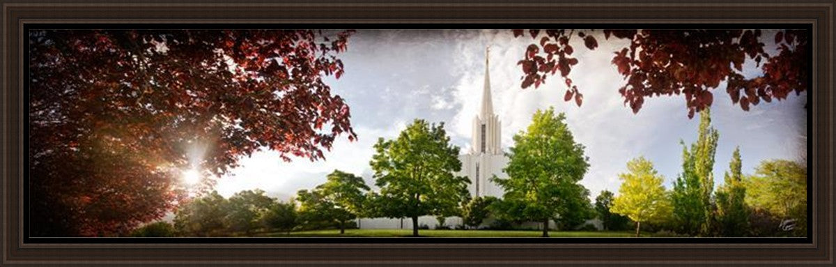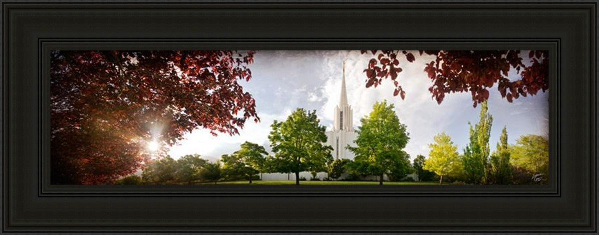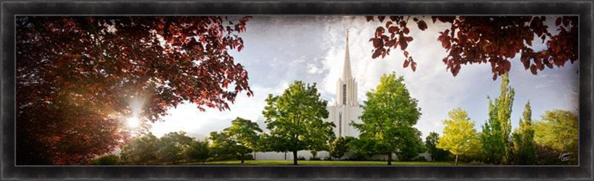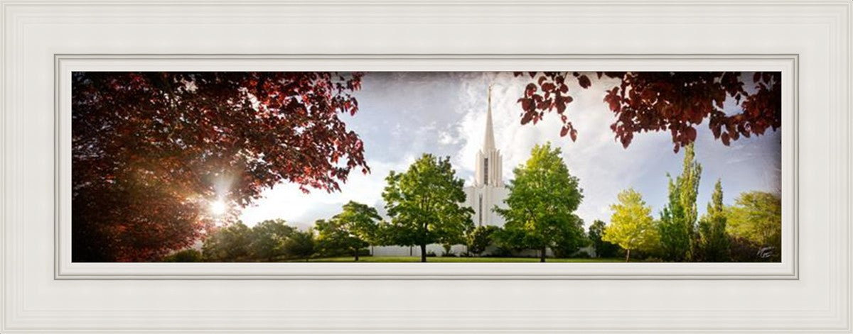 Since 1999 Landon has worked as an artisan in nearly 40 temples doing the decorative paint and gold leaf. He continues to do so as well as wood repair and graining. He was married in 2001 to Jacey Thomas in the Manti Utah temple. When she couldn’t find an image of the temple that she liked enough to purchase for their home, he decided to take one himself. That desire to create something original and different inspired his current series of temple art. They are taken from a panoramic viewpoint and stylized with an artistic border that reflect his paintings. All modern structures apart from the temple have been omitted.