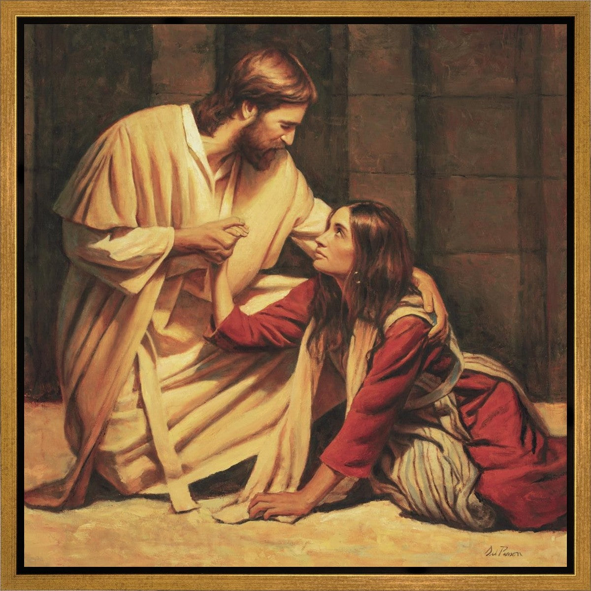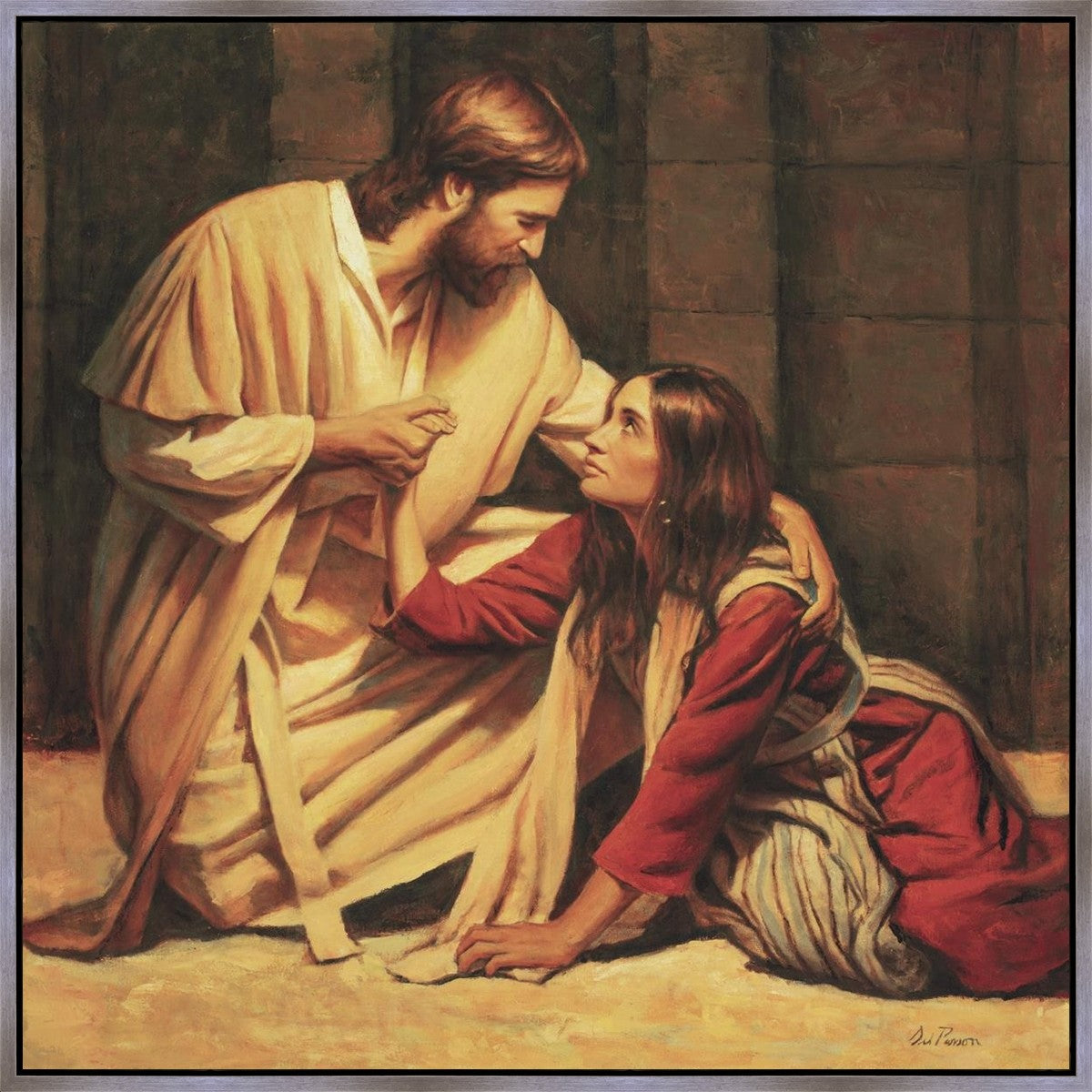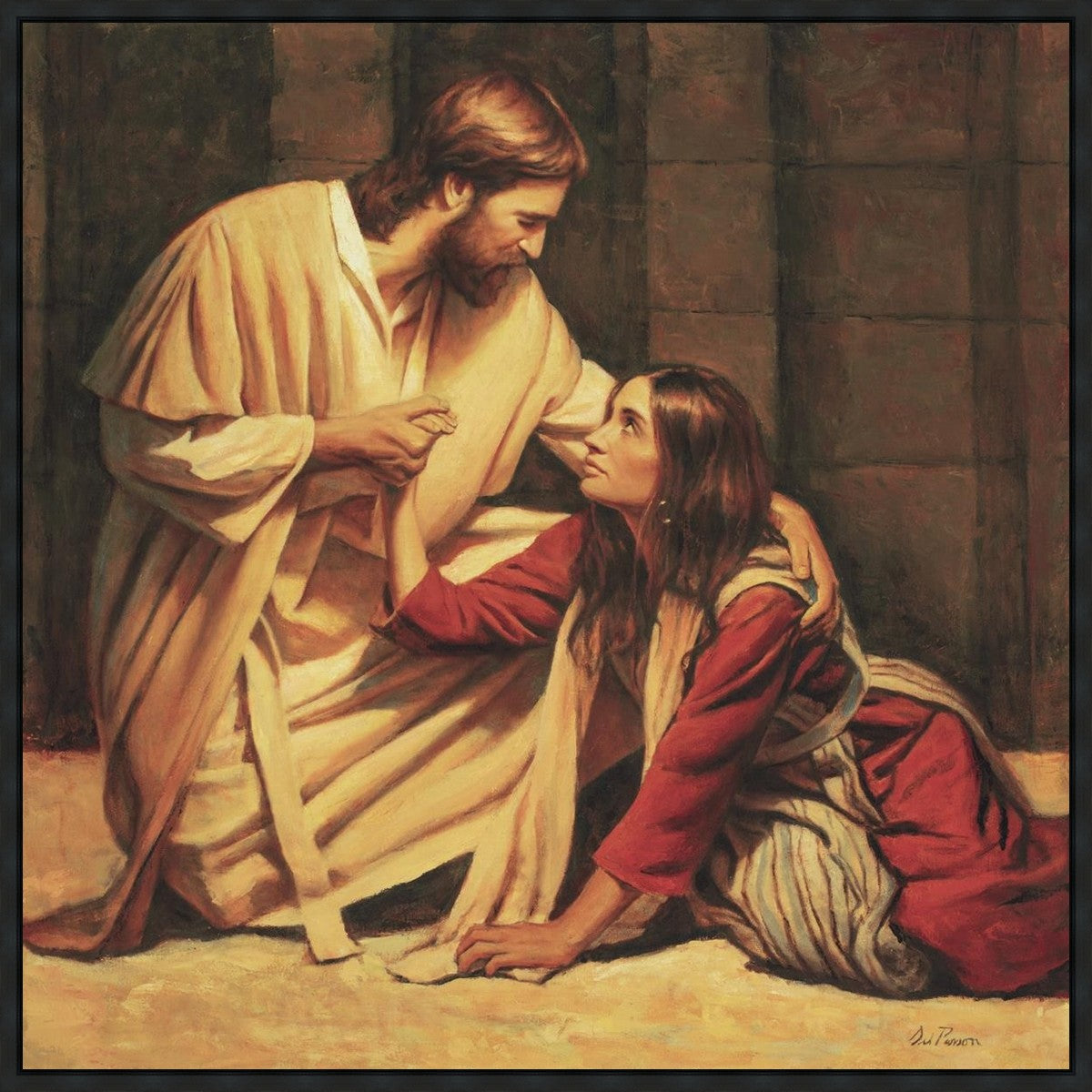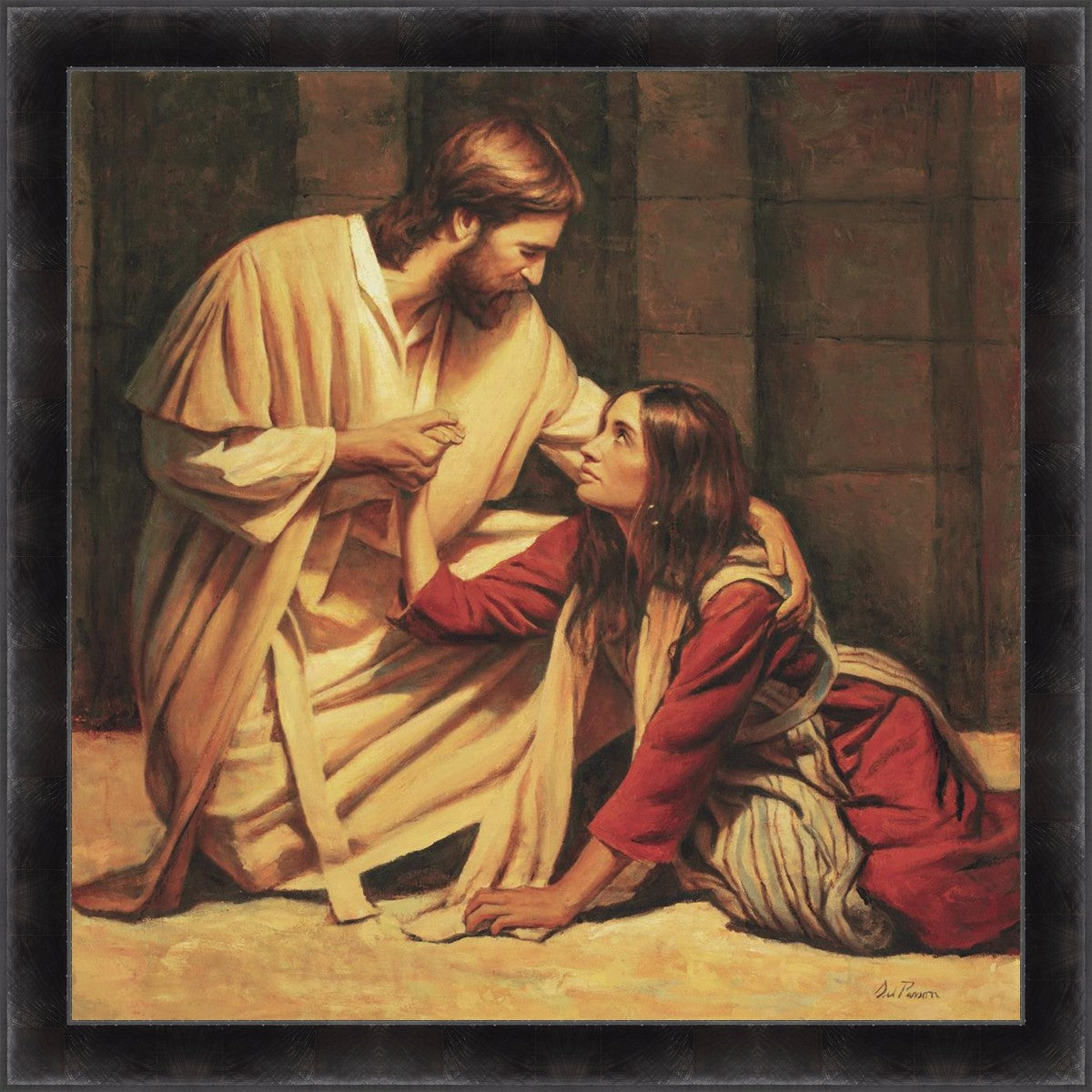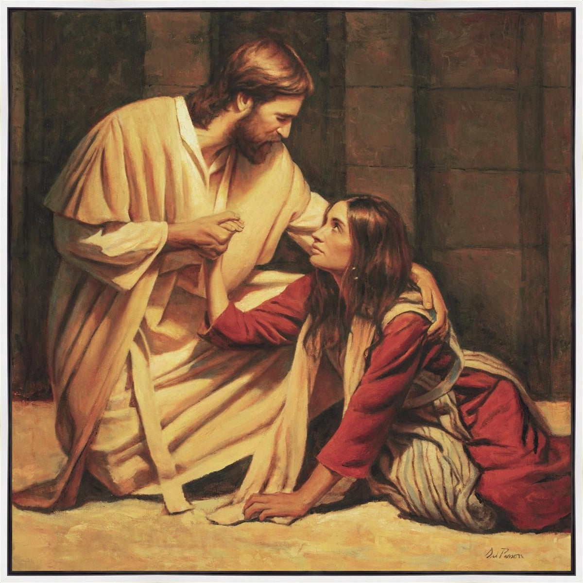 The woman taken in adultery. Christ wrote on the ground with His finger "Judge Not".