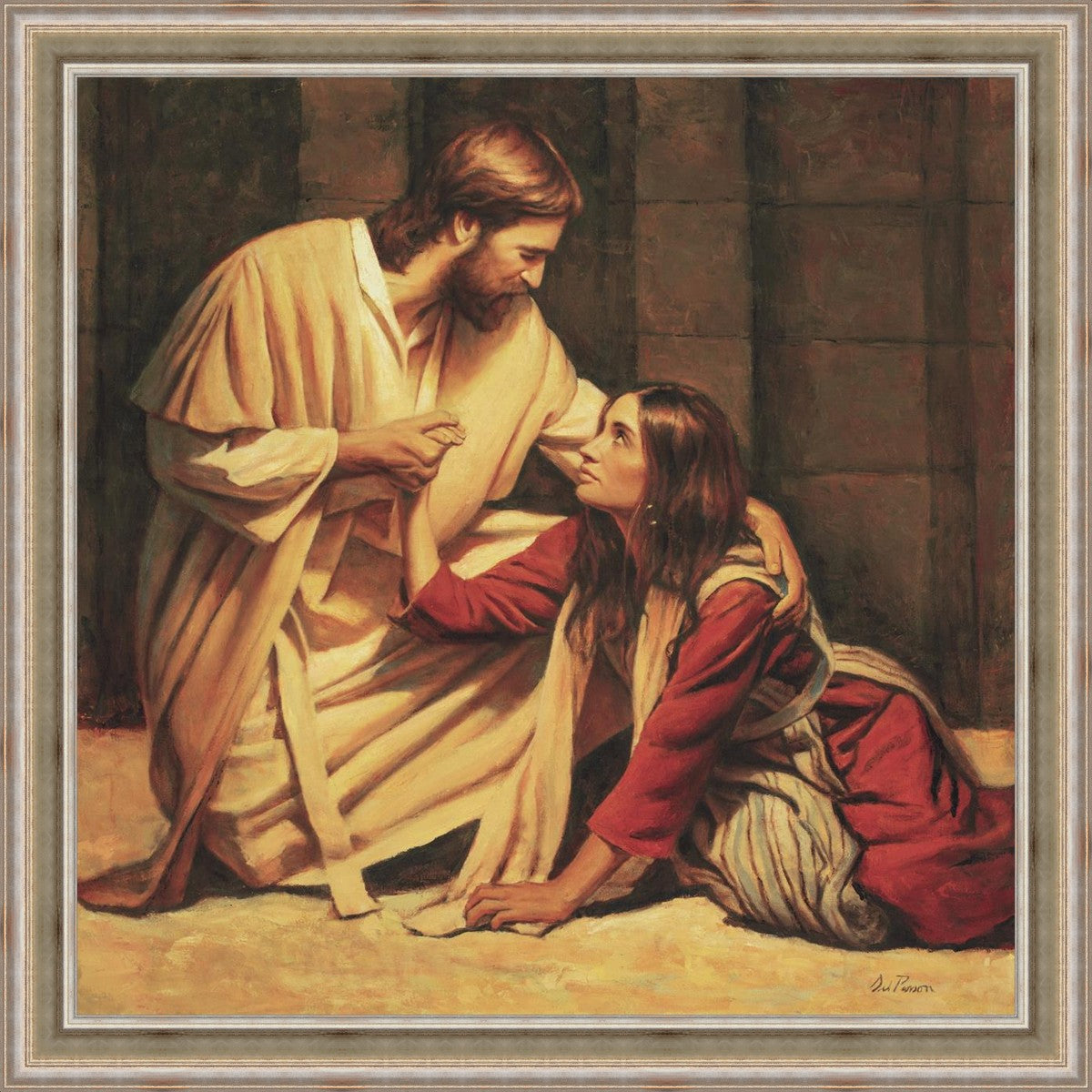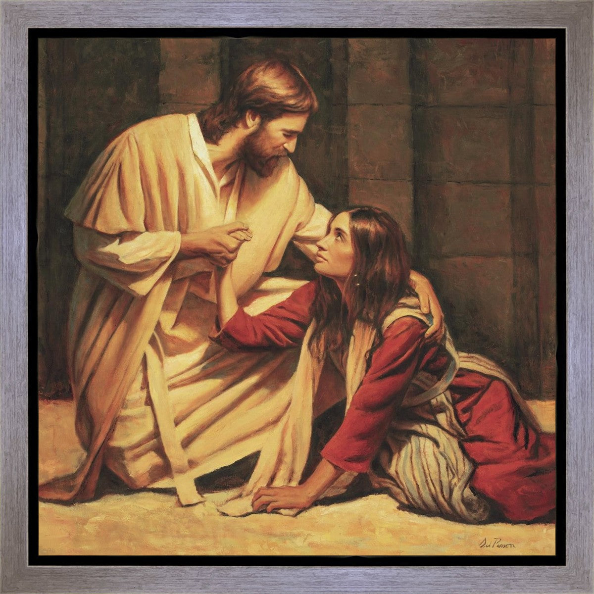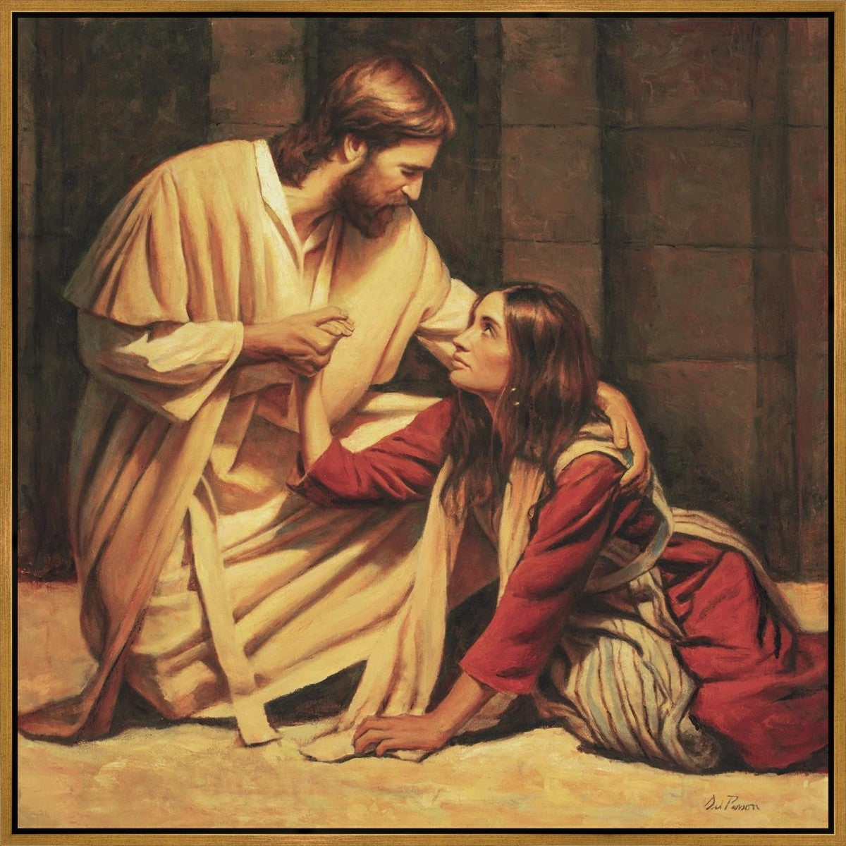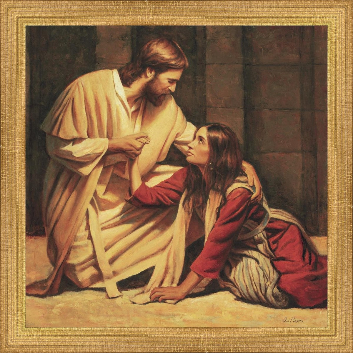 The woman taken in adultery. Christ wrote on the ground with His finger "Judge Not".