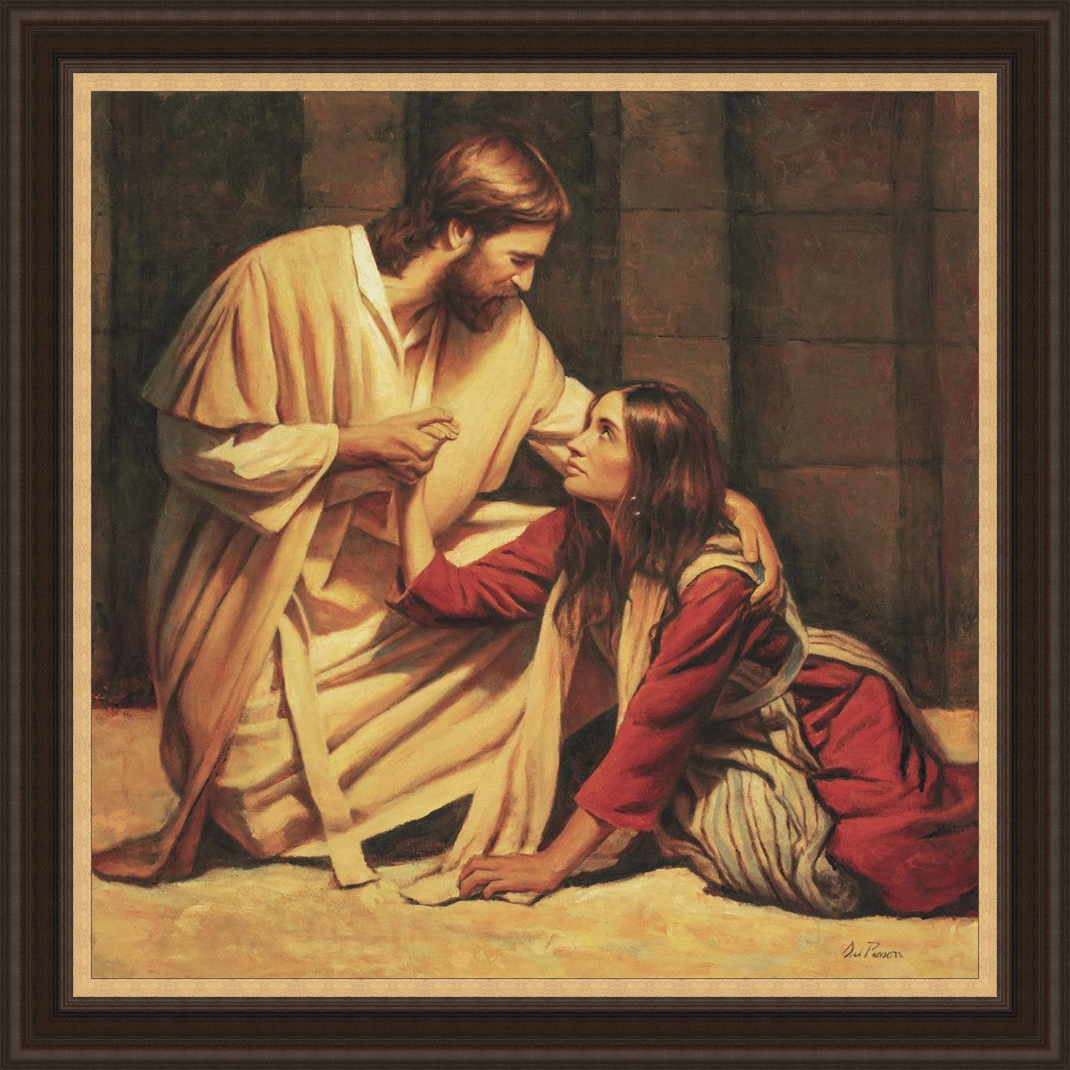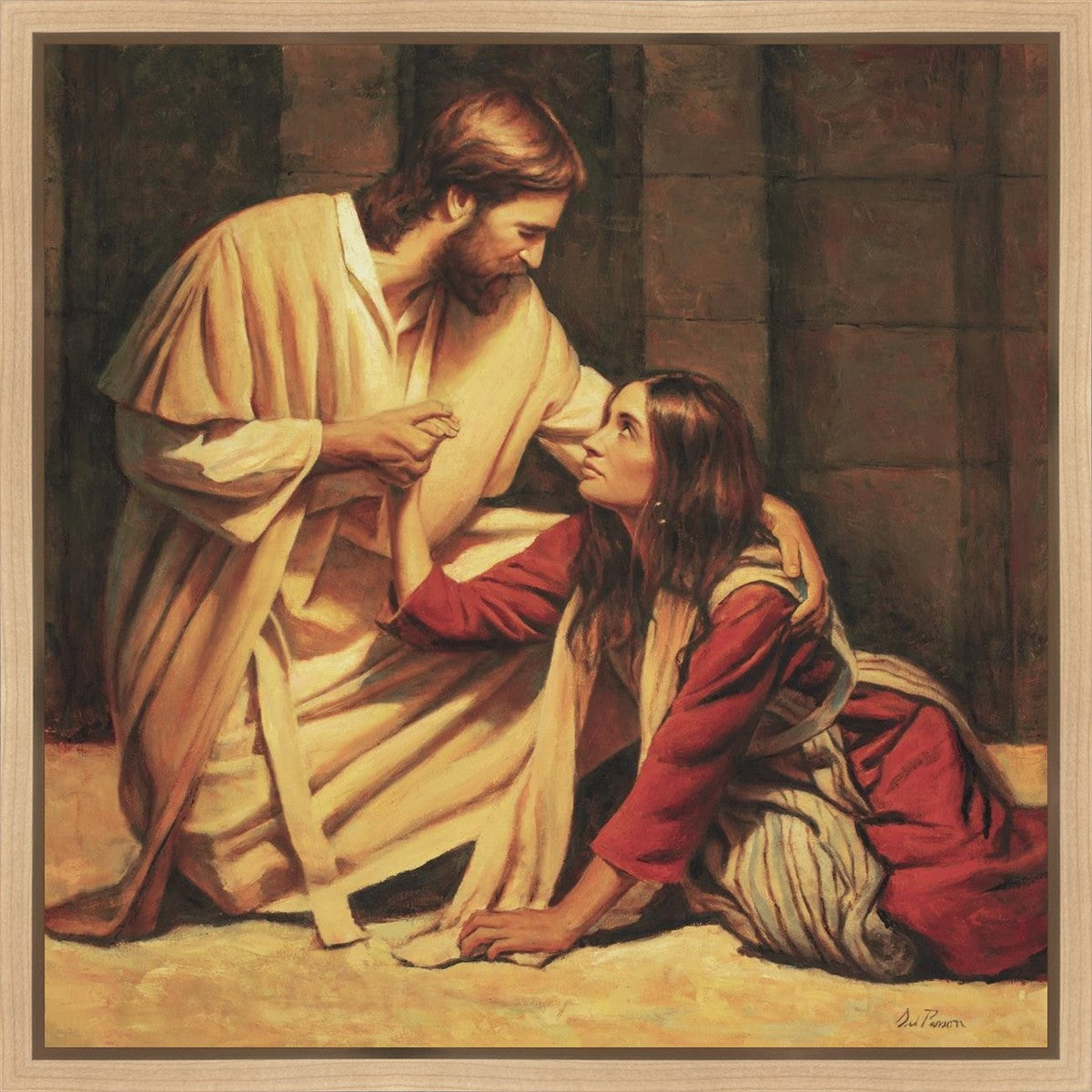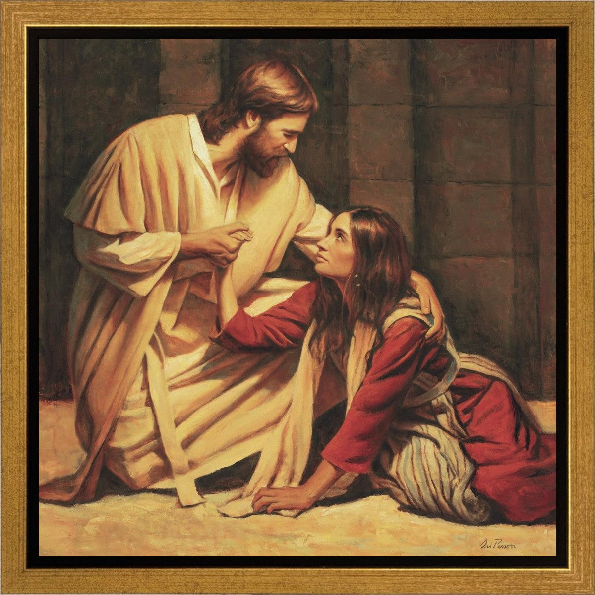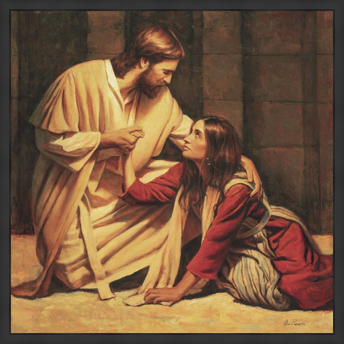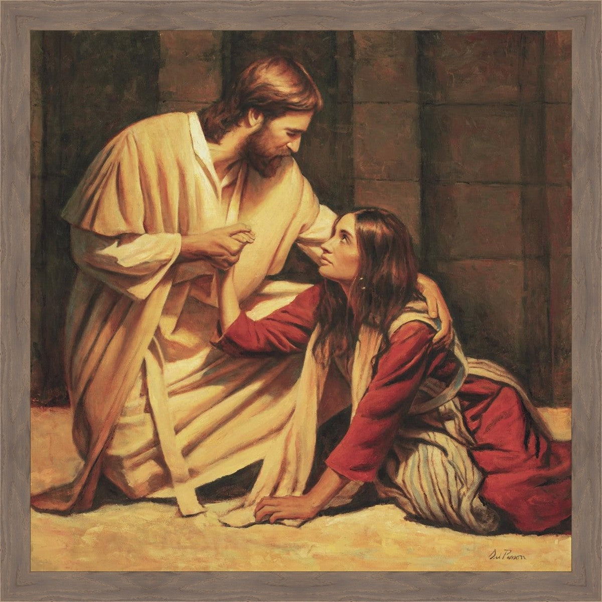 The woman taken in adultery. Christ wrote on the ground with His finger "Judge Not".