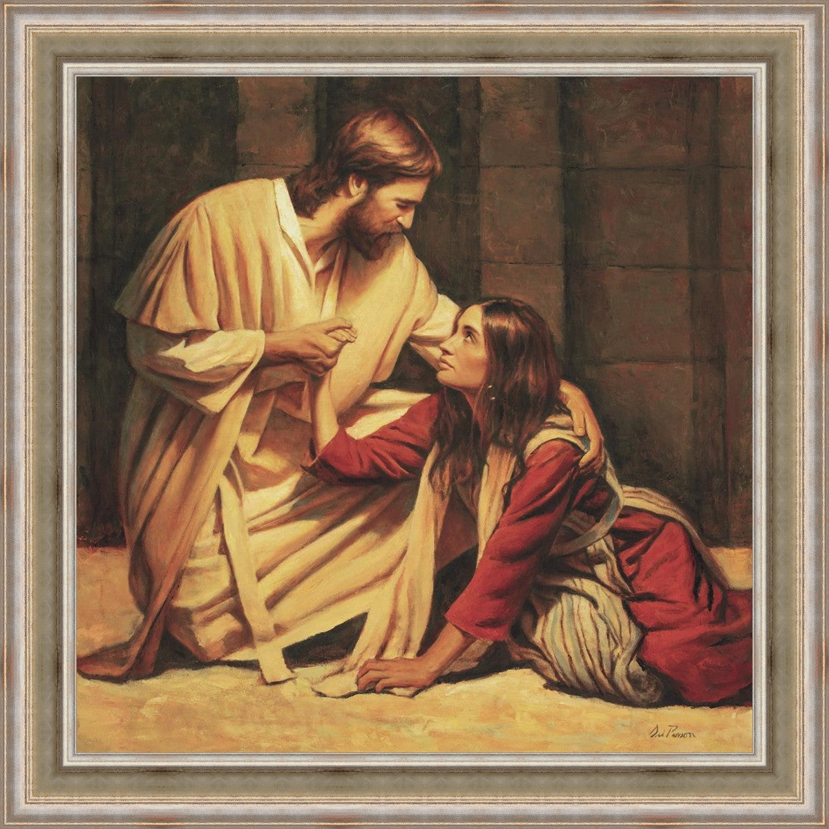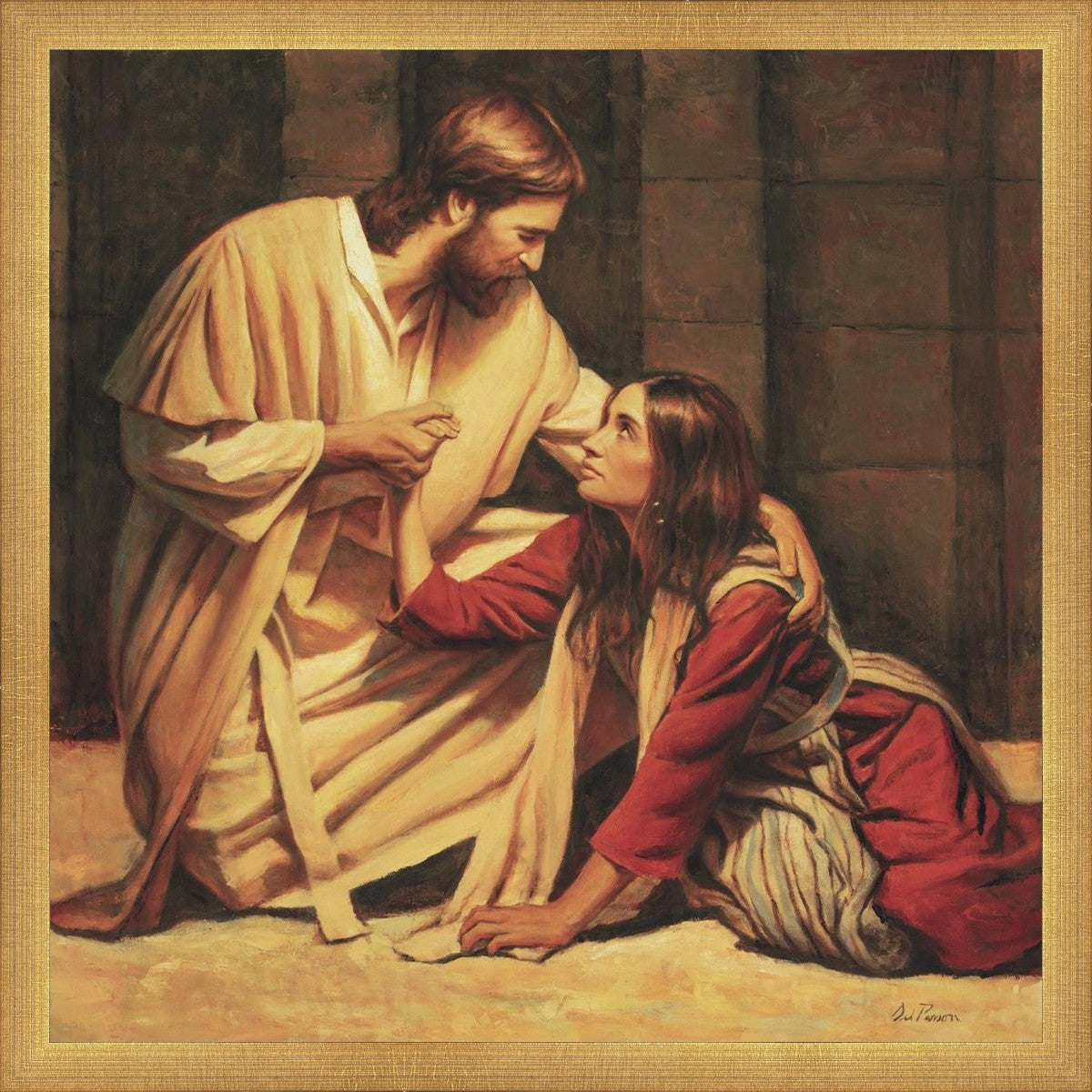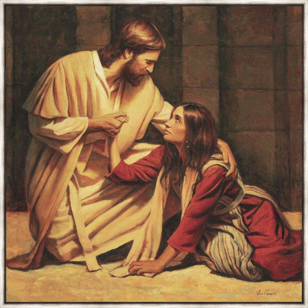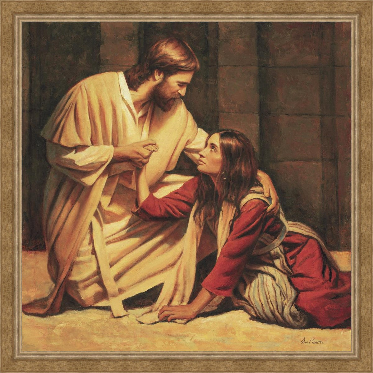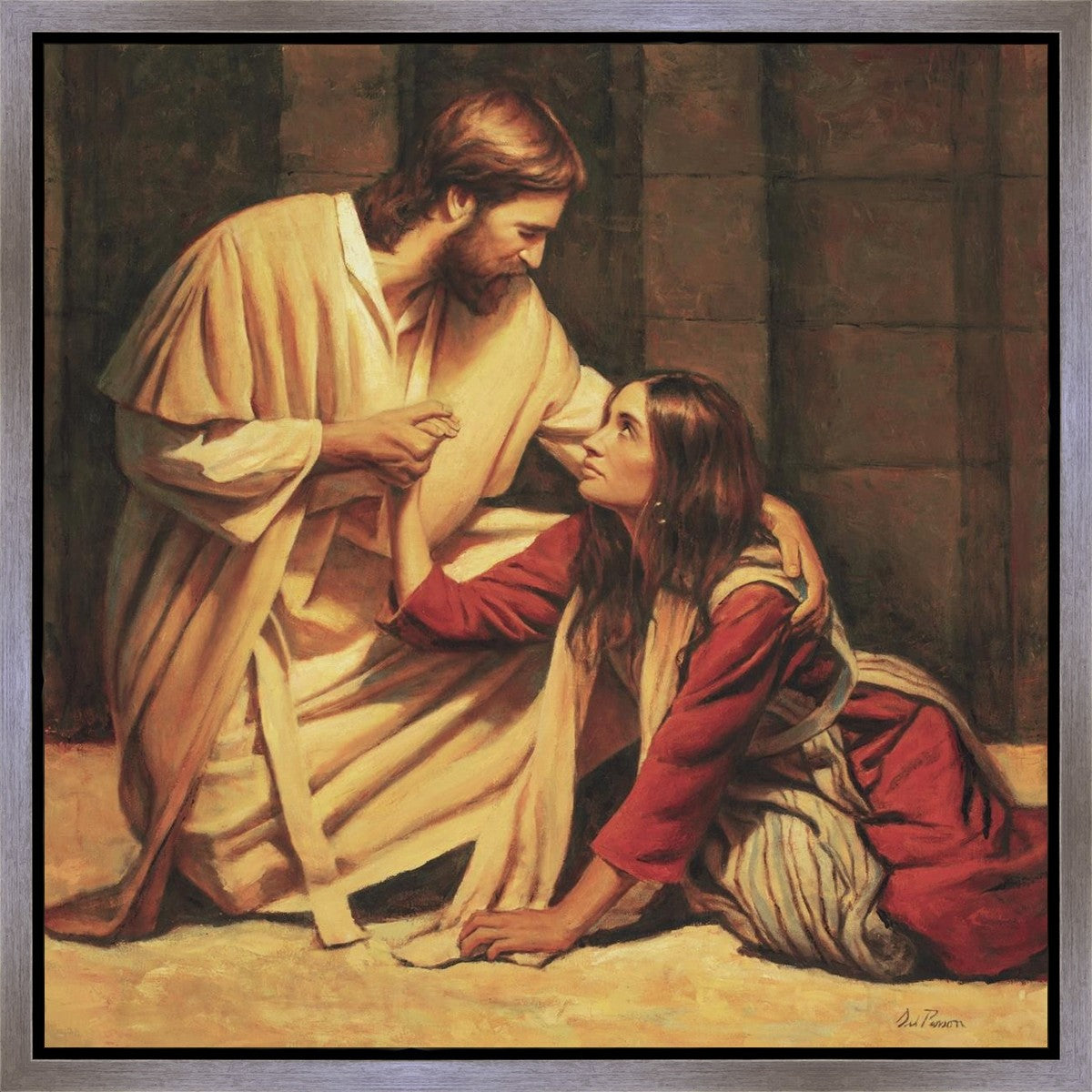 The woman taken in adultery. Christ wrote on the ground with His finger "Judge Not".