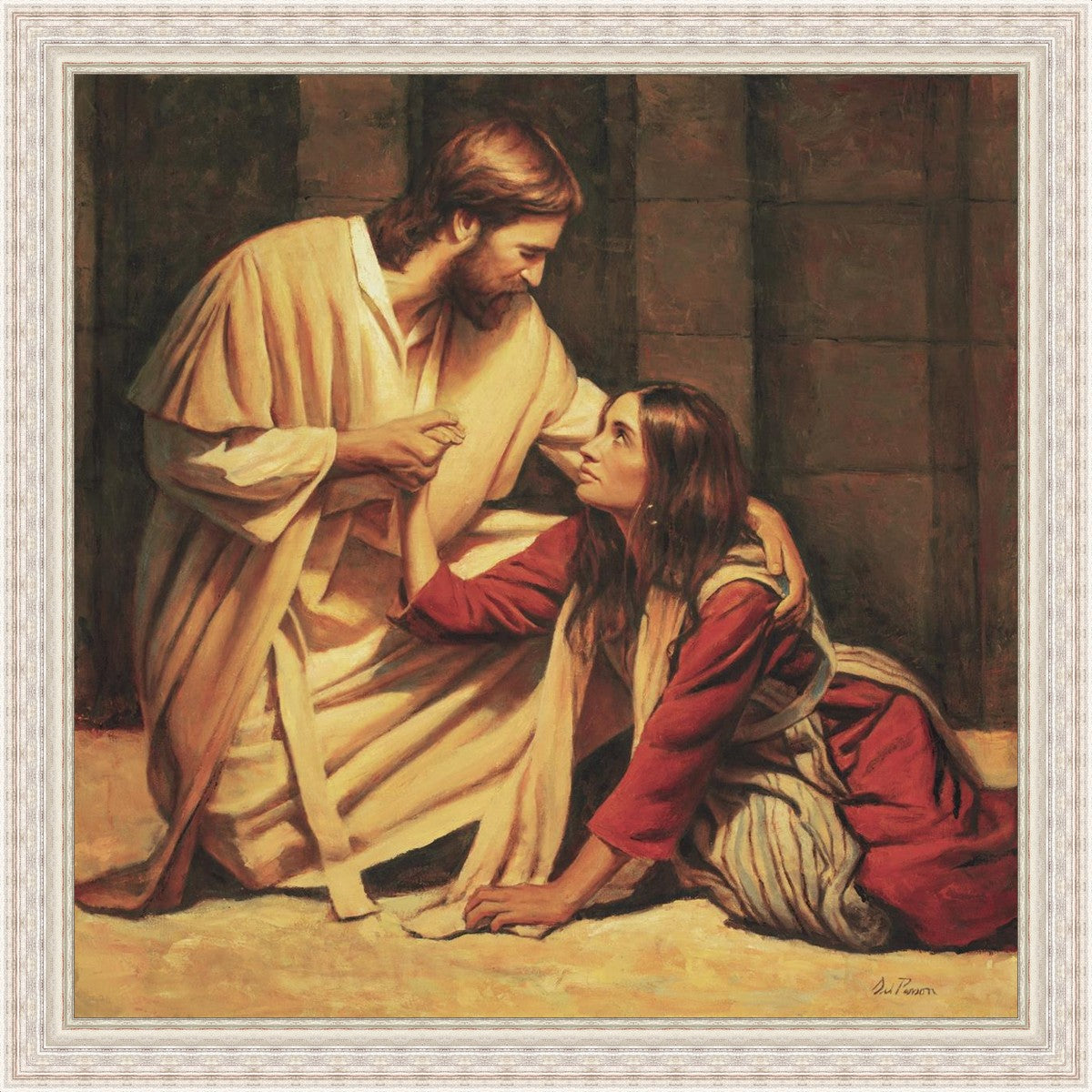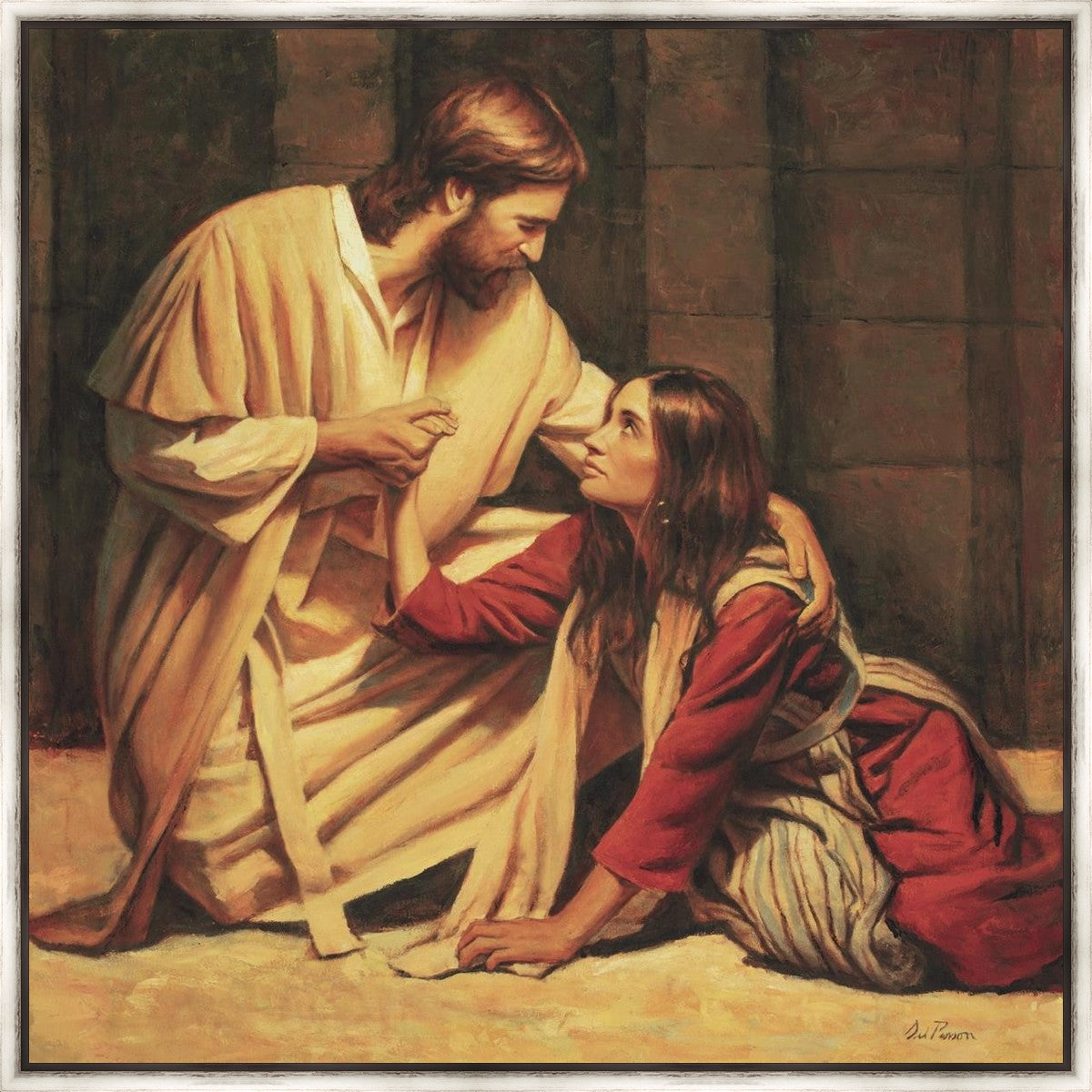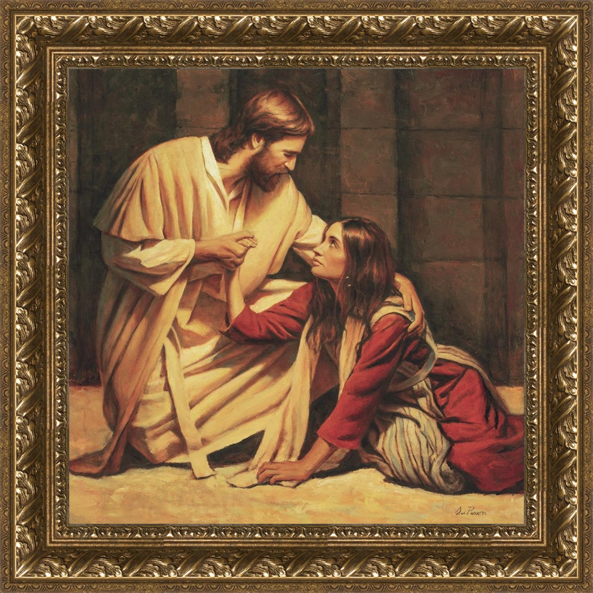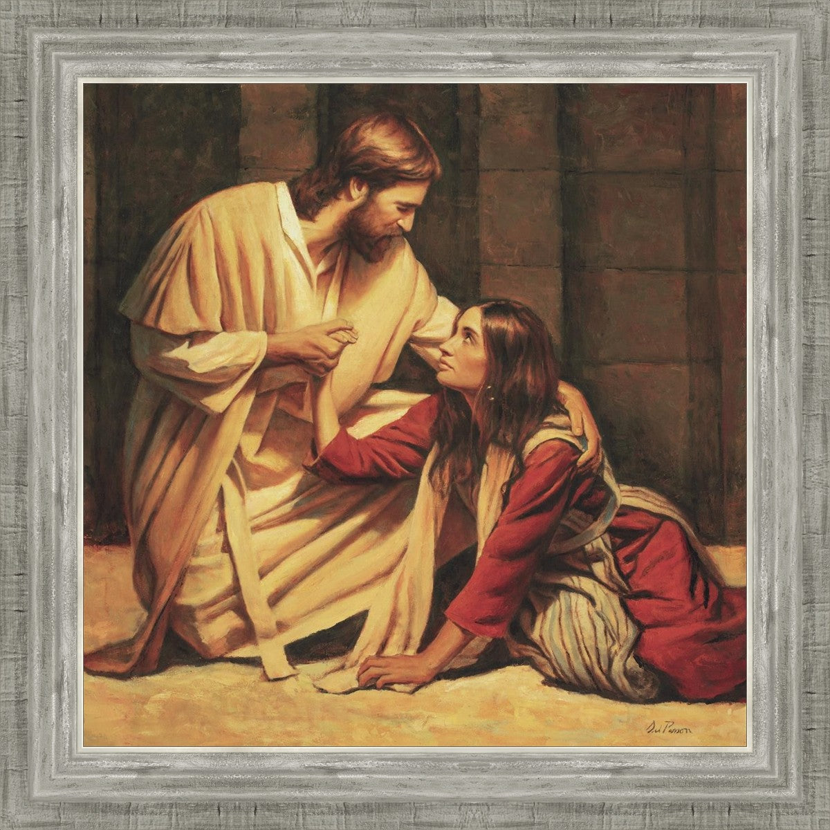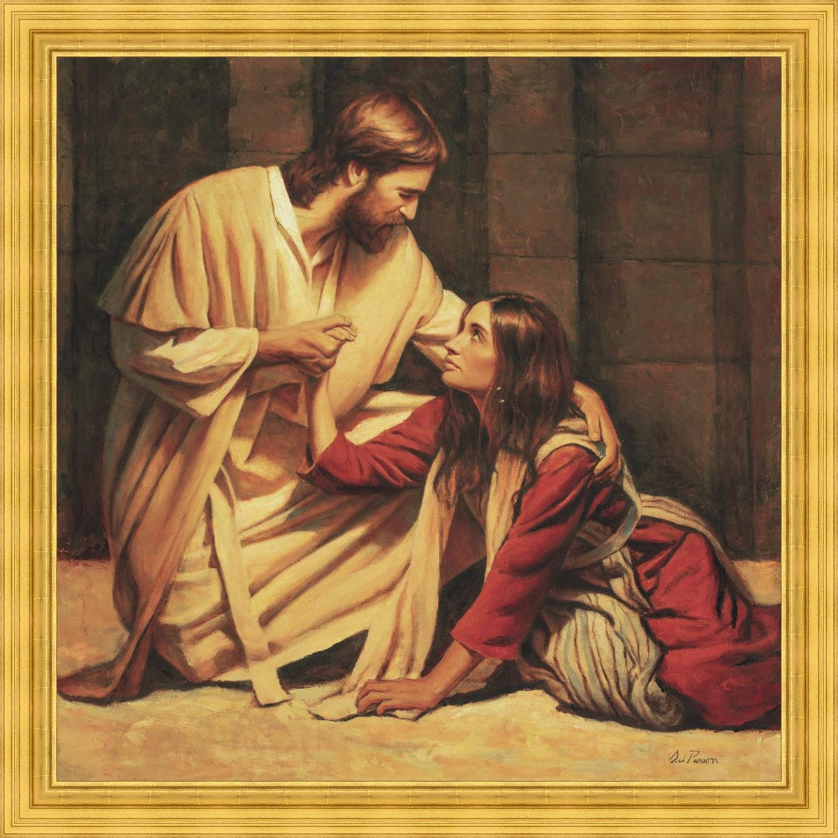 The woman taken in adultery. Christ wrote on the ground with His finger "Judge Not".