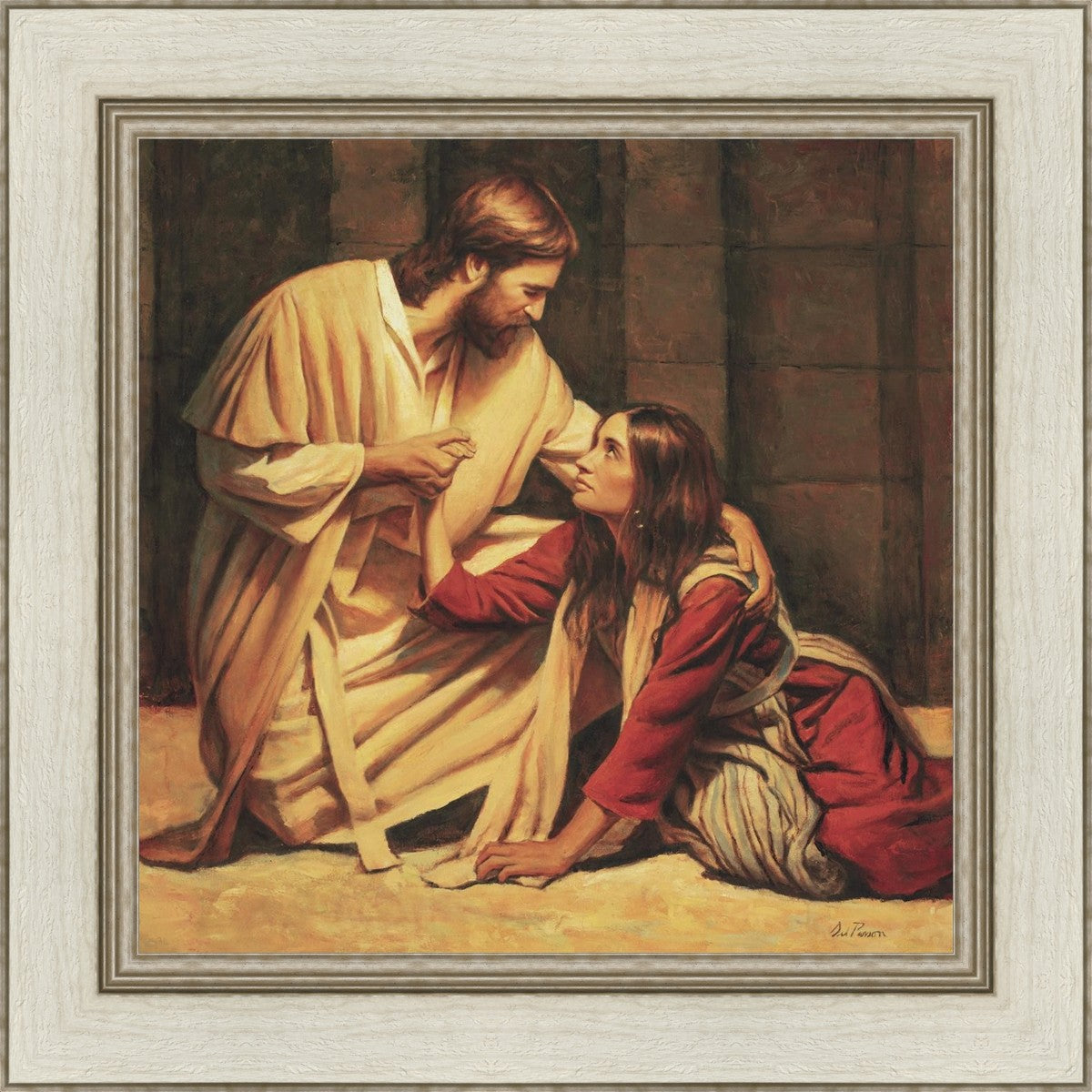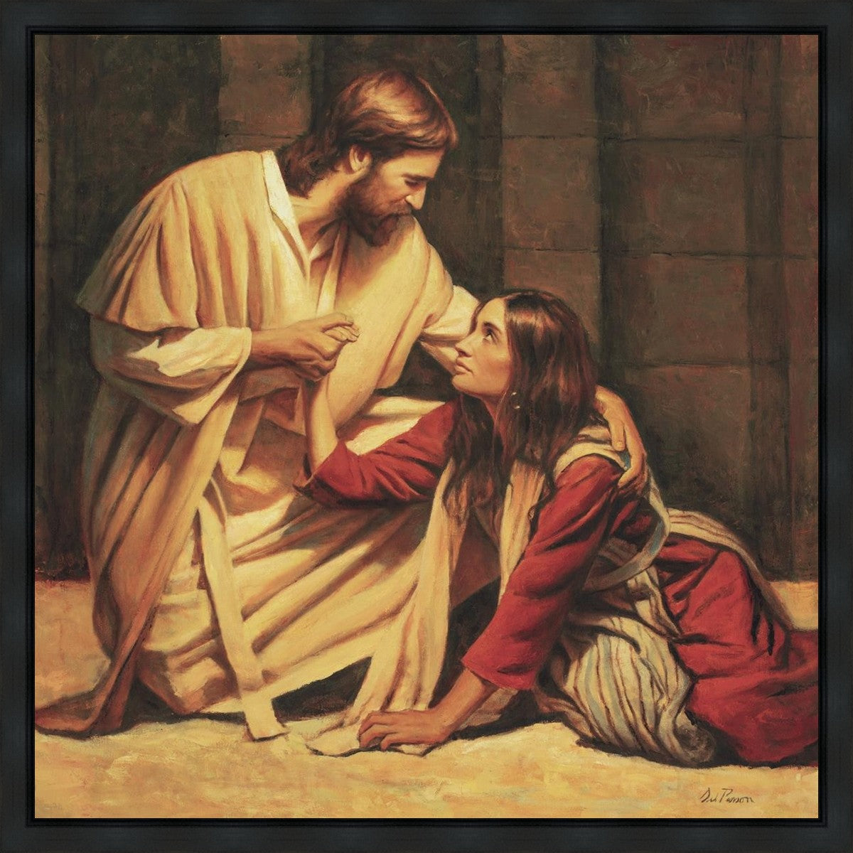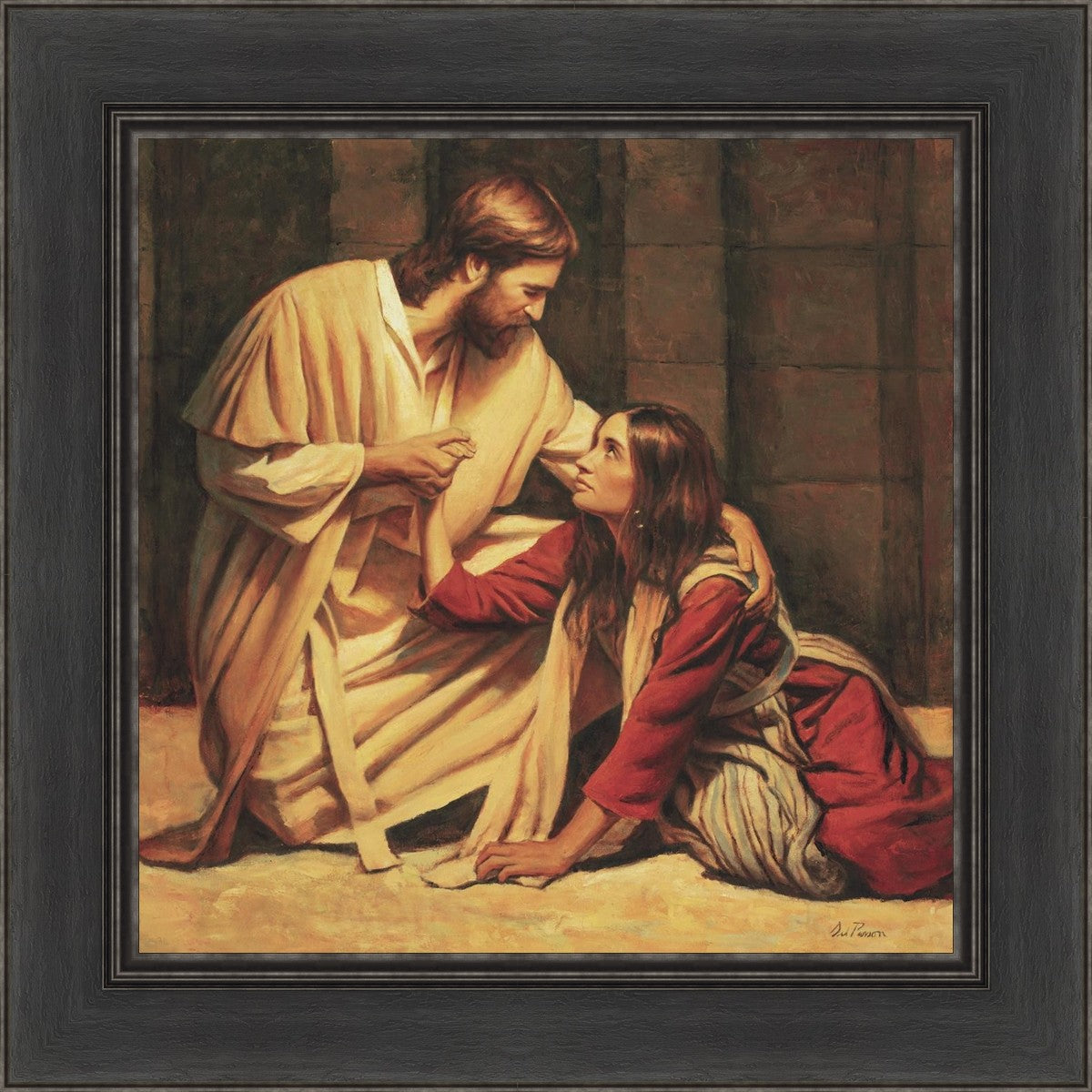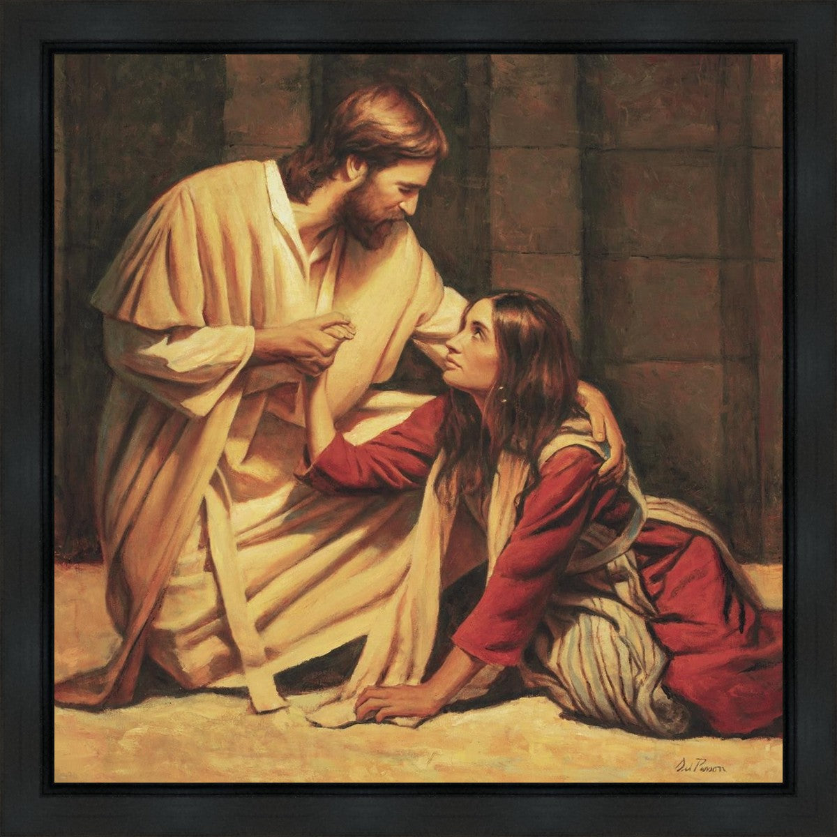 The woman taken in adultery. Christ wrote on the ground with His finger "Judge Not".