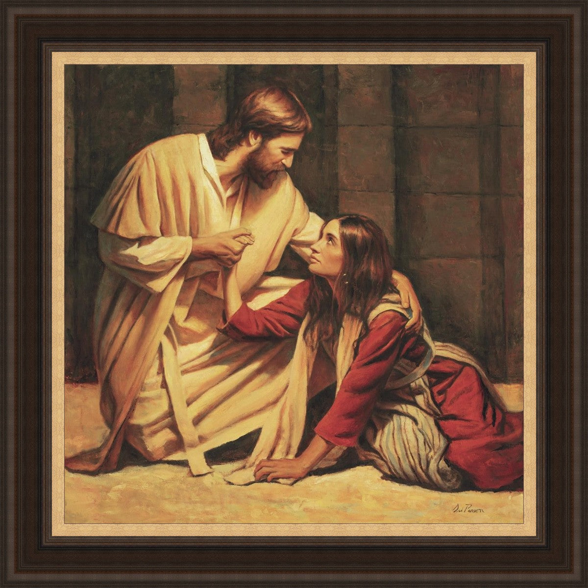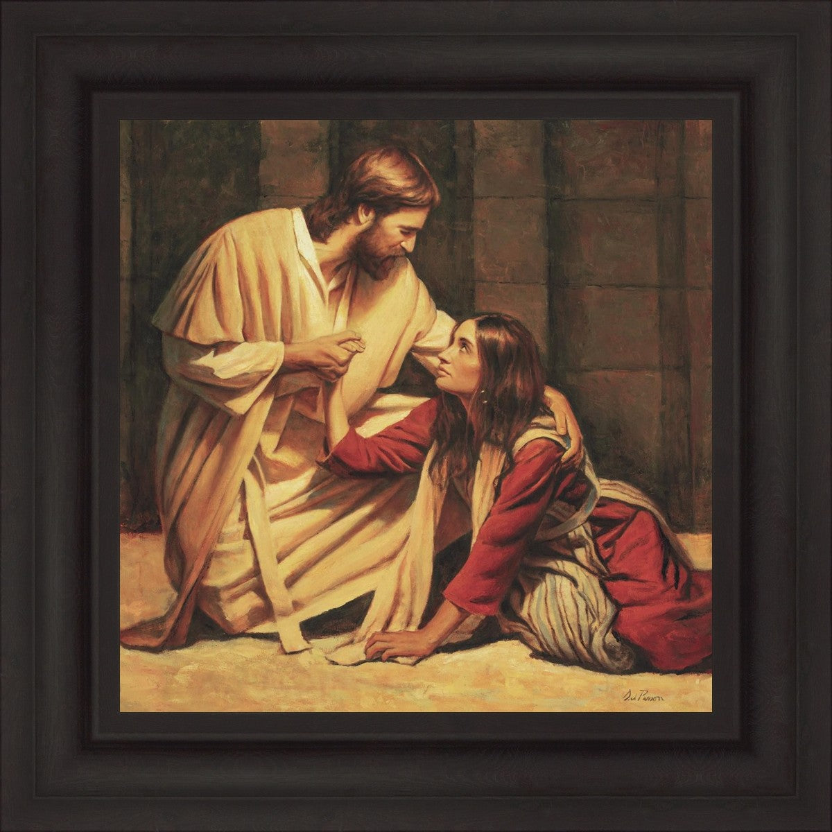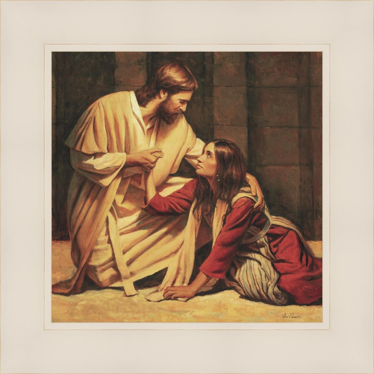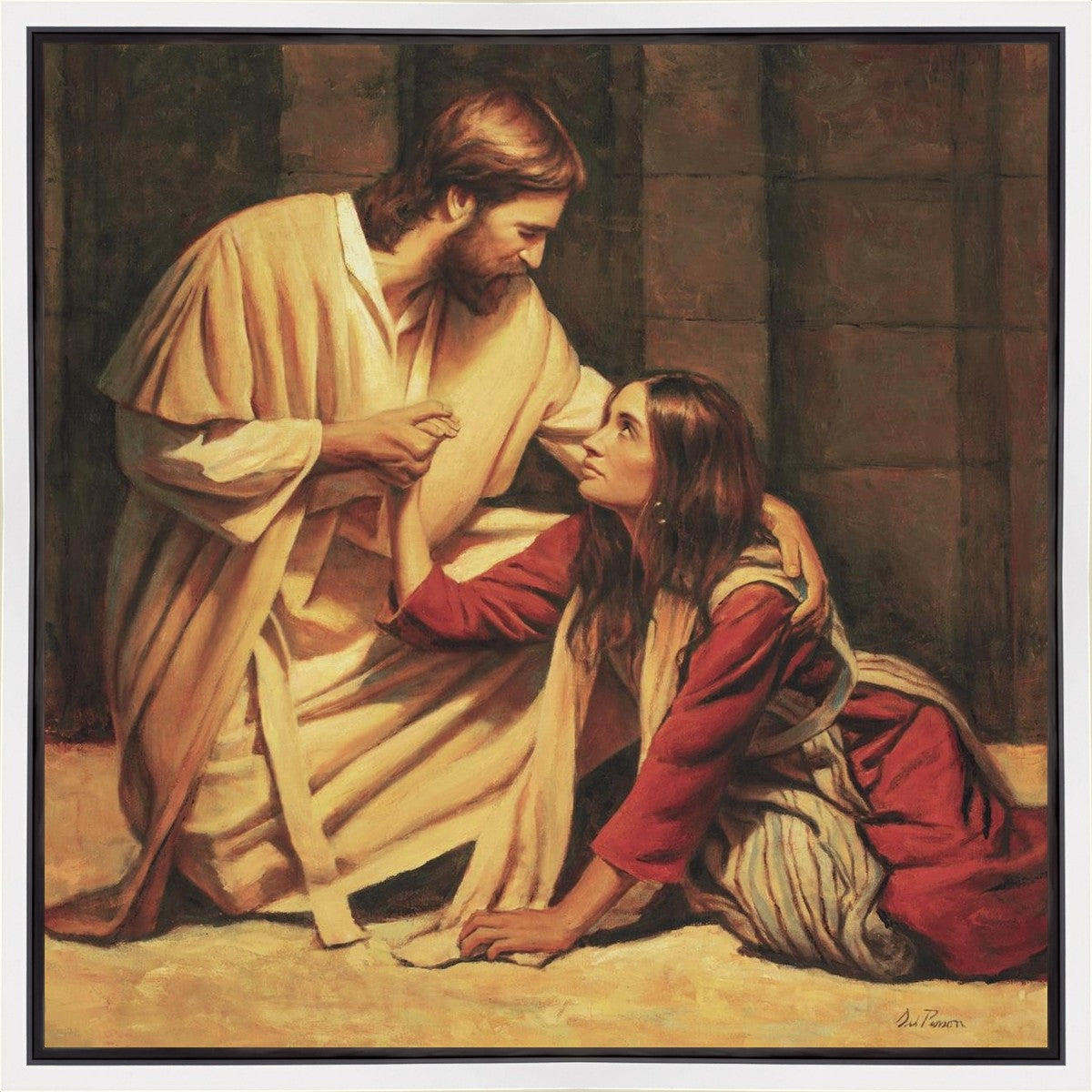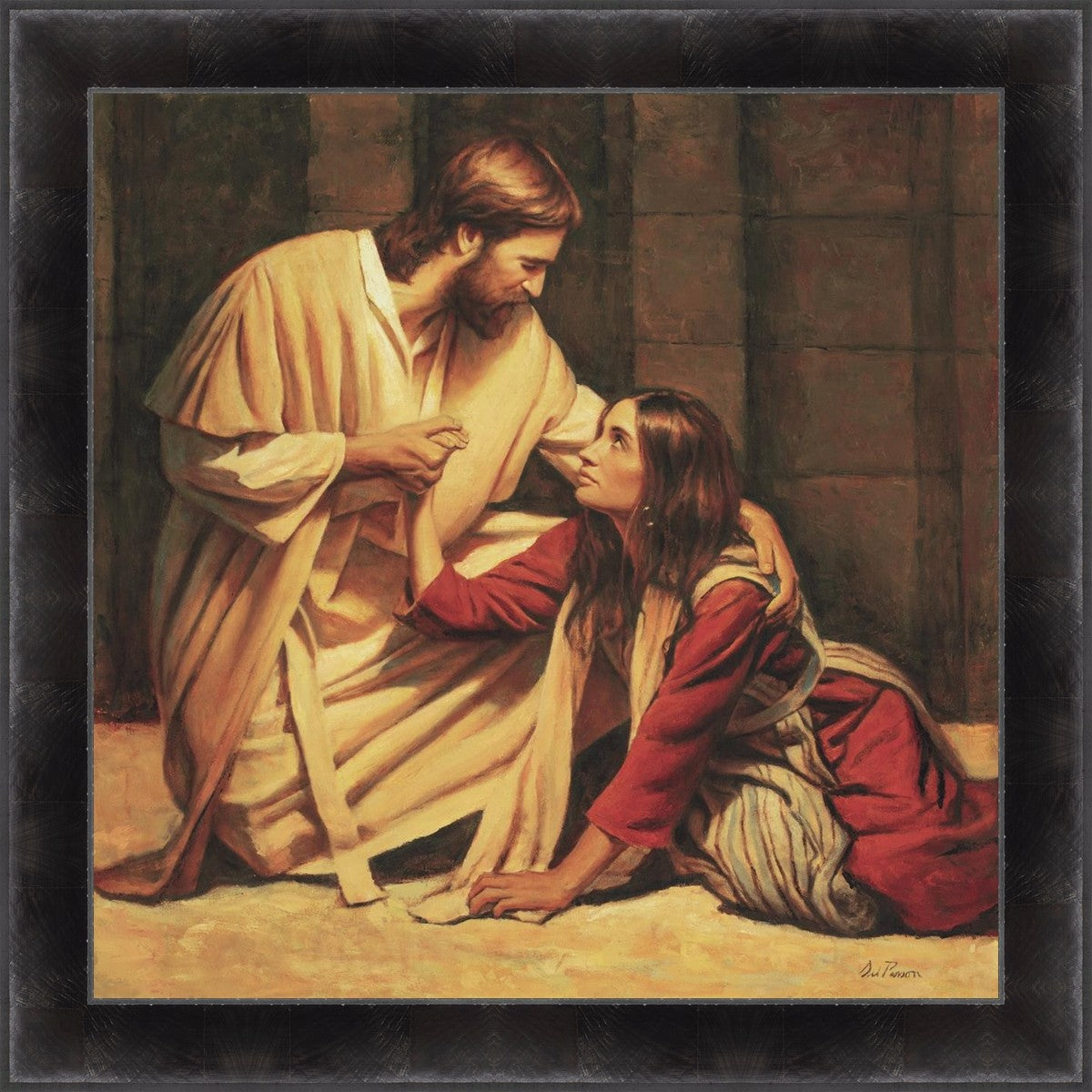 The woman taken in adultery. Christ wrote on the ground with His finger "Judge Not".