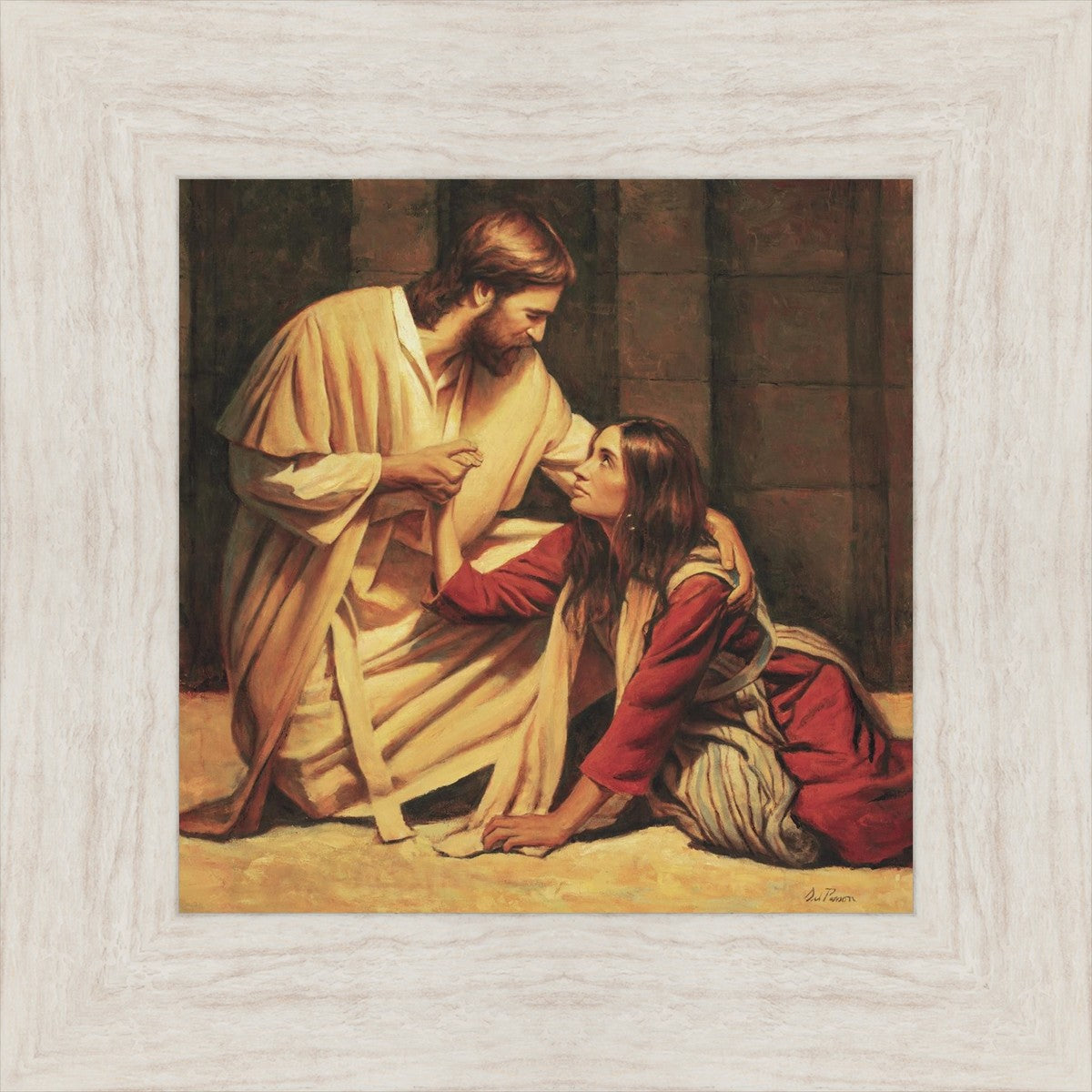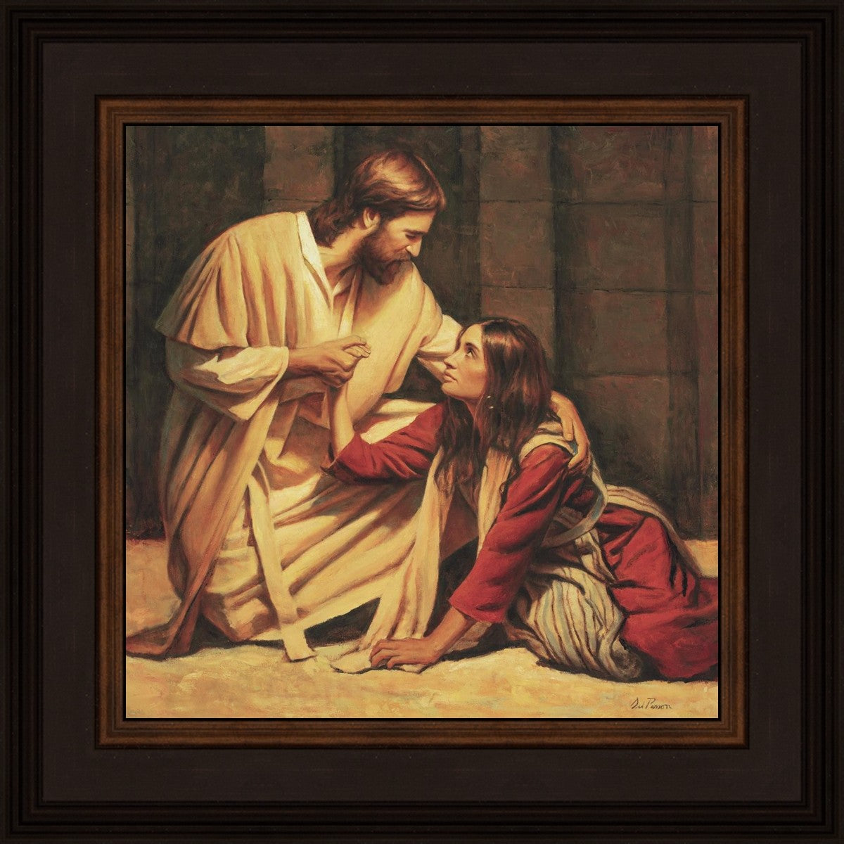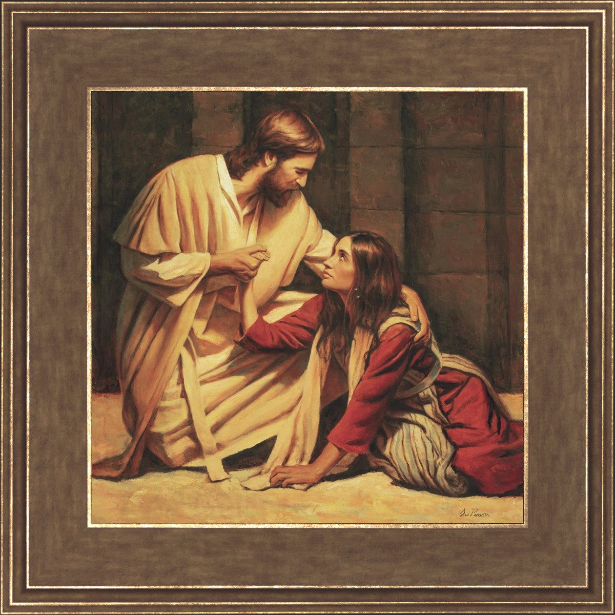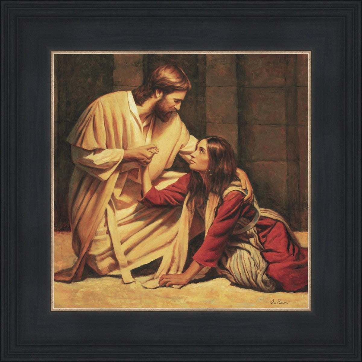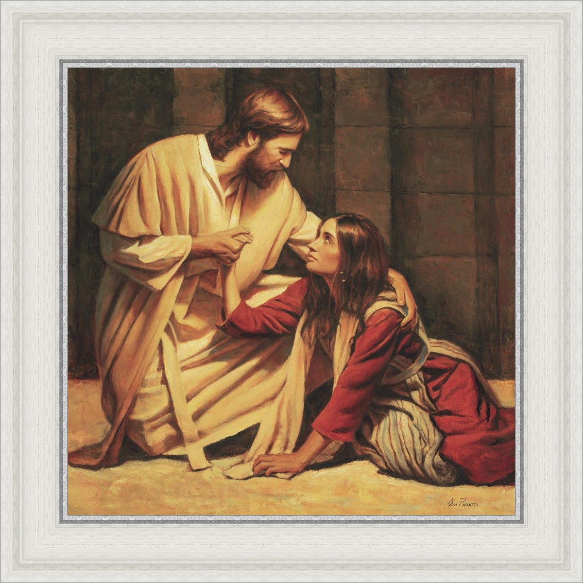 The woman taken in adultery. Christ wrote on the ground with His finger "Judge Not".