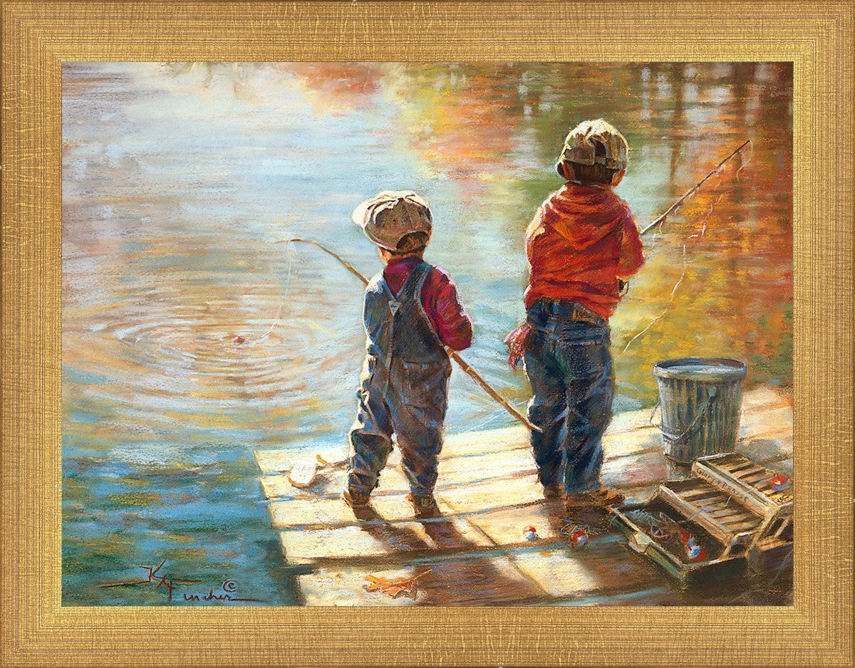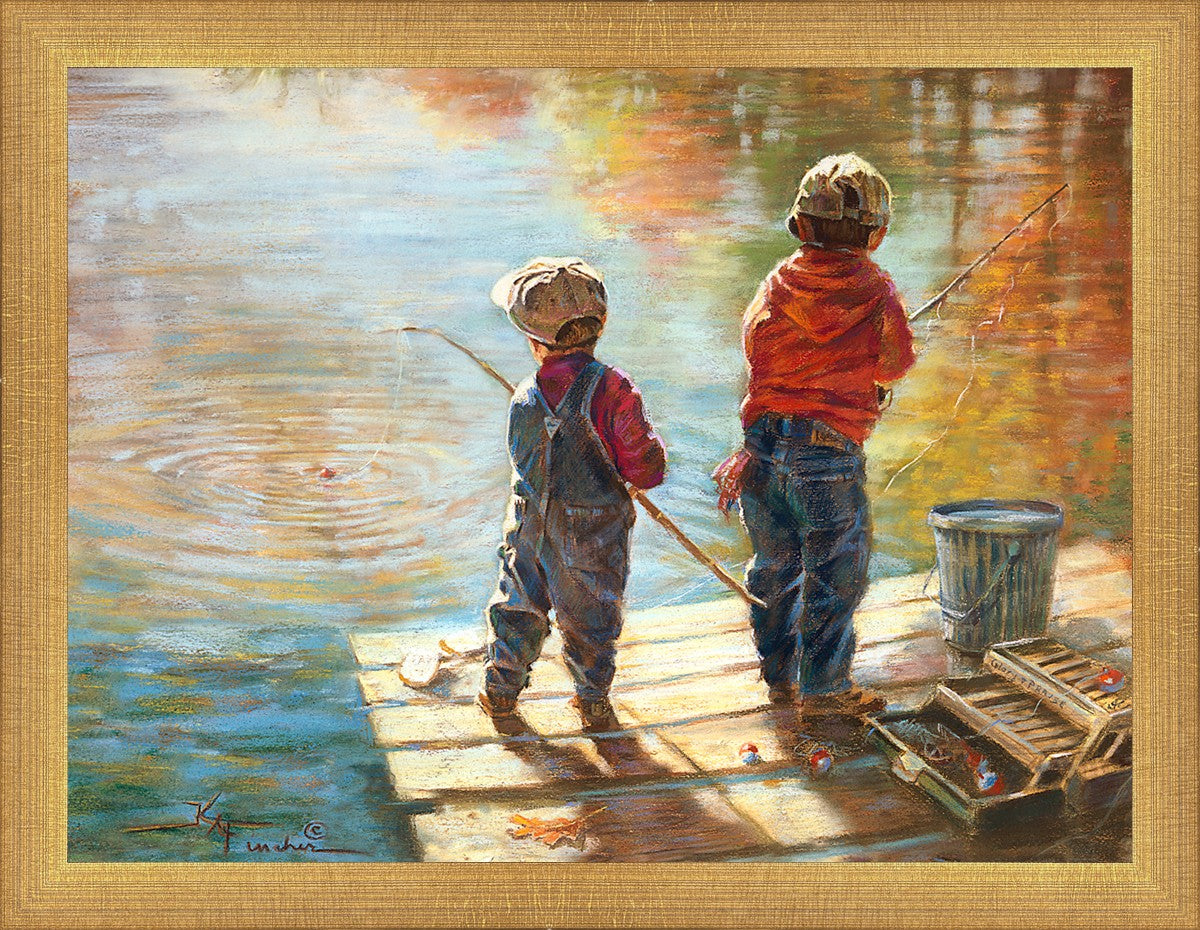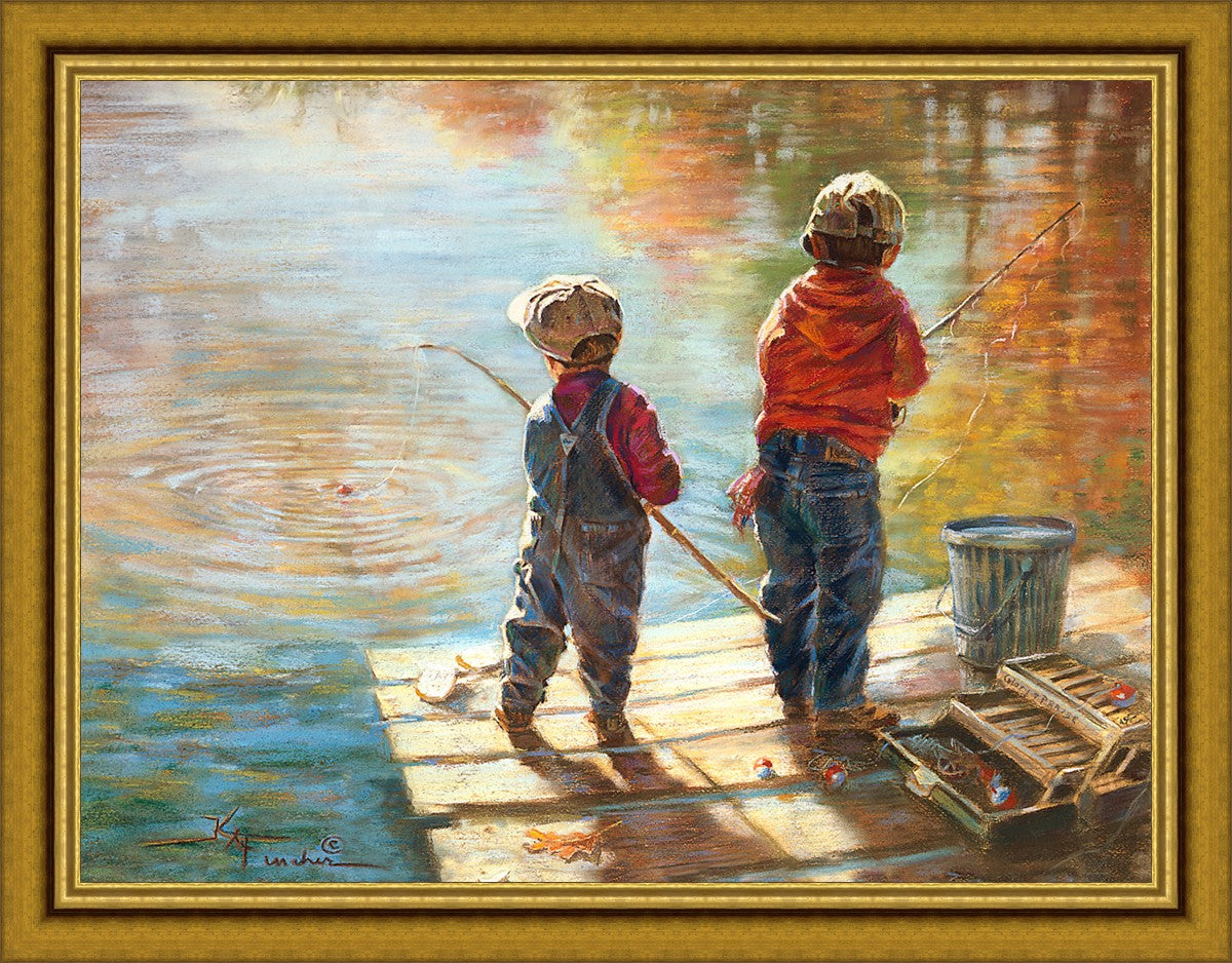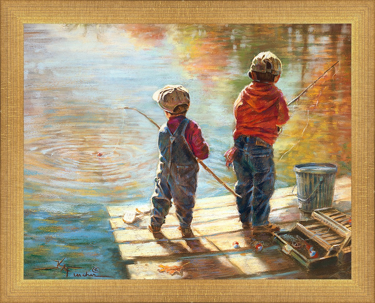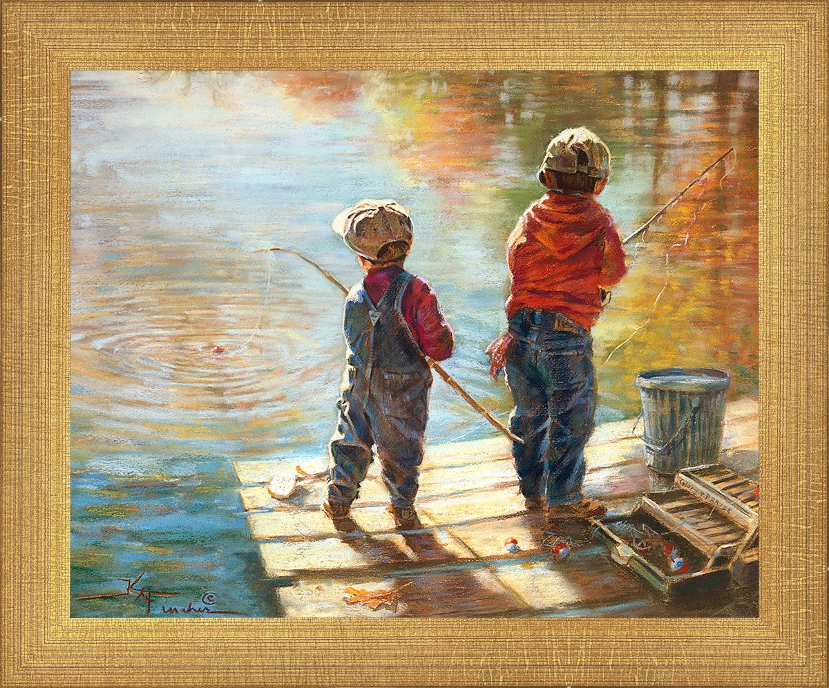 You’re a Keeper shares the story of two brothers learning to fish. The older brother proudly holds a new rod and reel with a fully stocked tacklebox at his feet. It is doubtful he will catch anything, for his line is slack and knotted. His younger brother is fishing with the basics—a cane pole and bread ball. He is awarded a bouncing bobber with a bite and quickly learns that it’s no longer fishing when you have a bite!