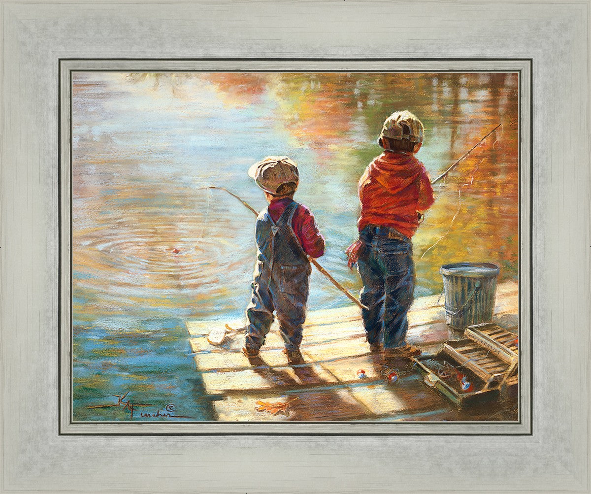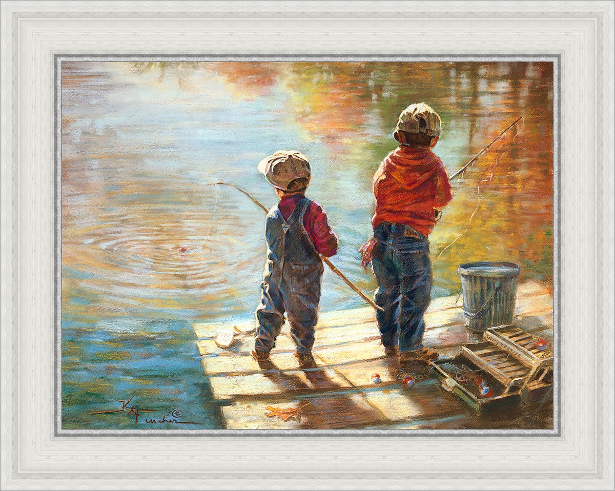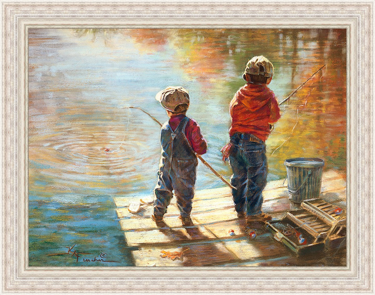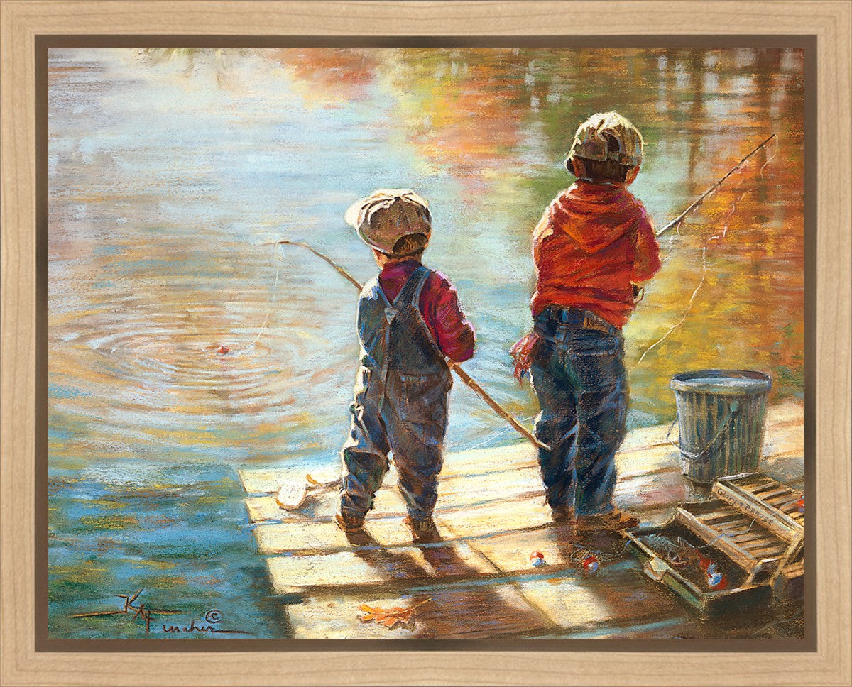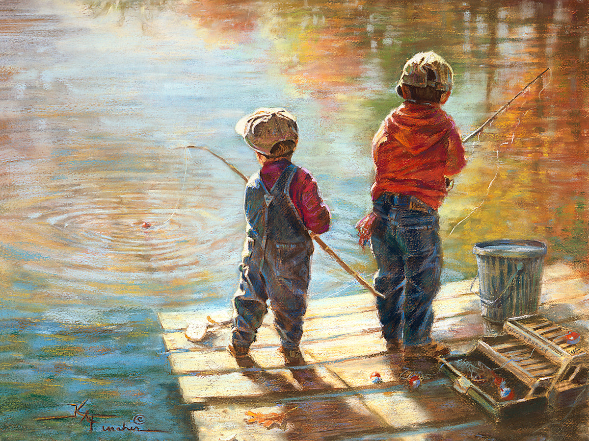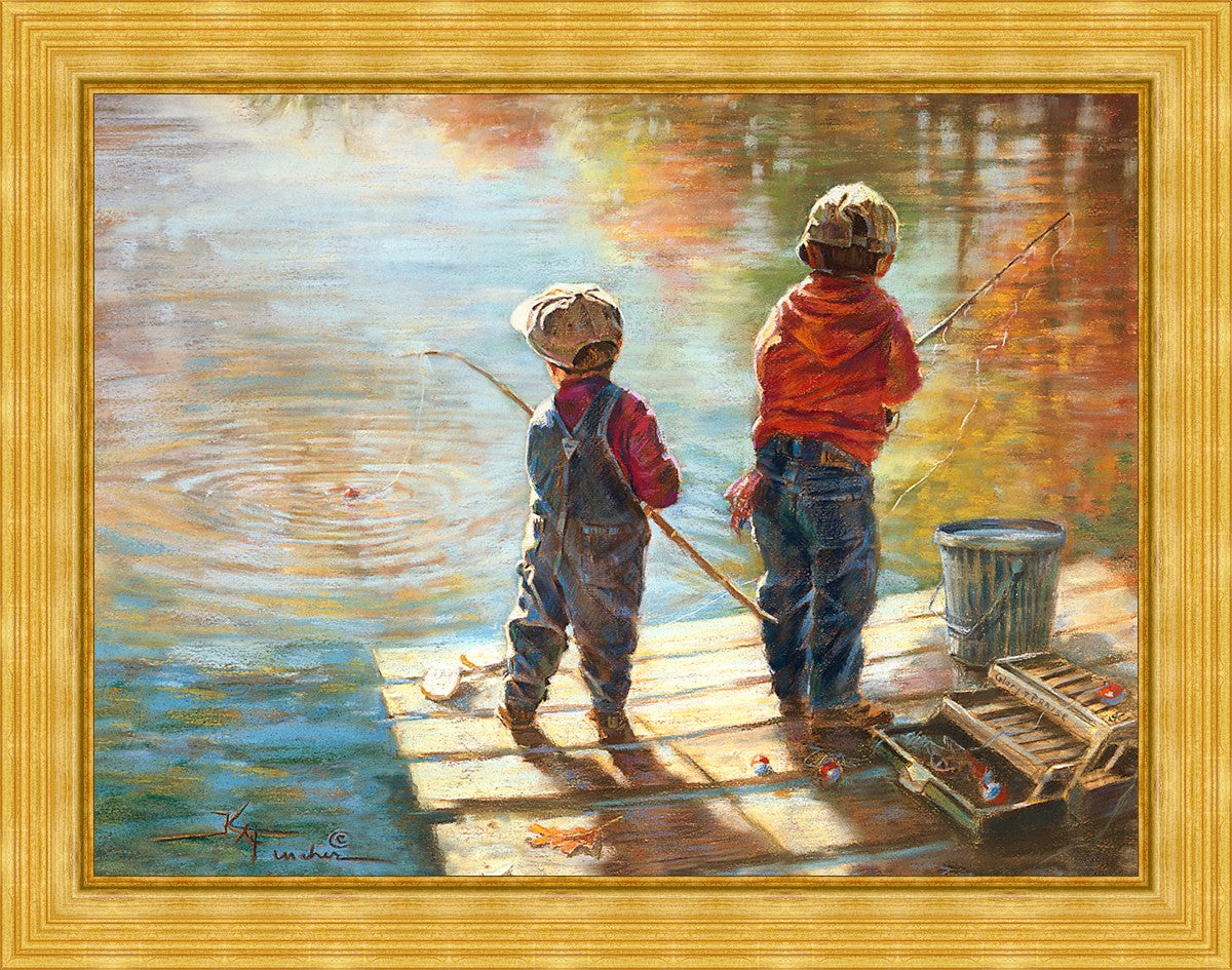 You’re a Keeper shares the story of two brothers learning to fish. The older brother proudly holds a new rod and reel with a fully stocked tacklebox at his feet. It is doubtful he will catch anything, for his line is slack and knotted. His younger brother is fishing with the basics—a cane pole and bread ball. He is awarded a bouncing bobber with a bite and quickly learns that it’s no longer fishing when you have a bite!