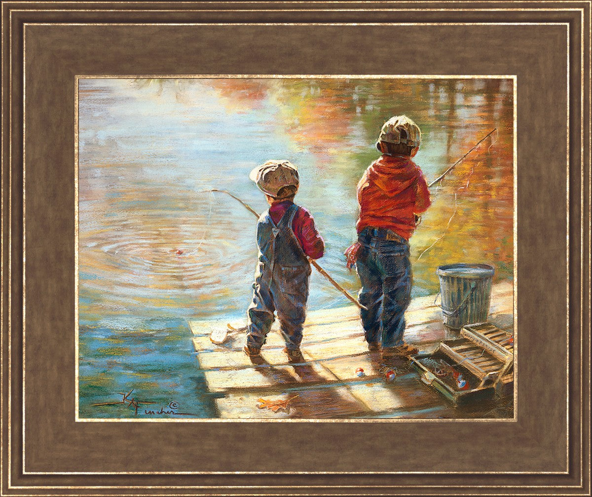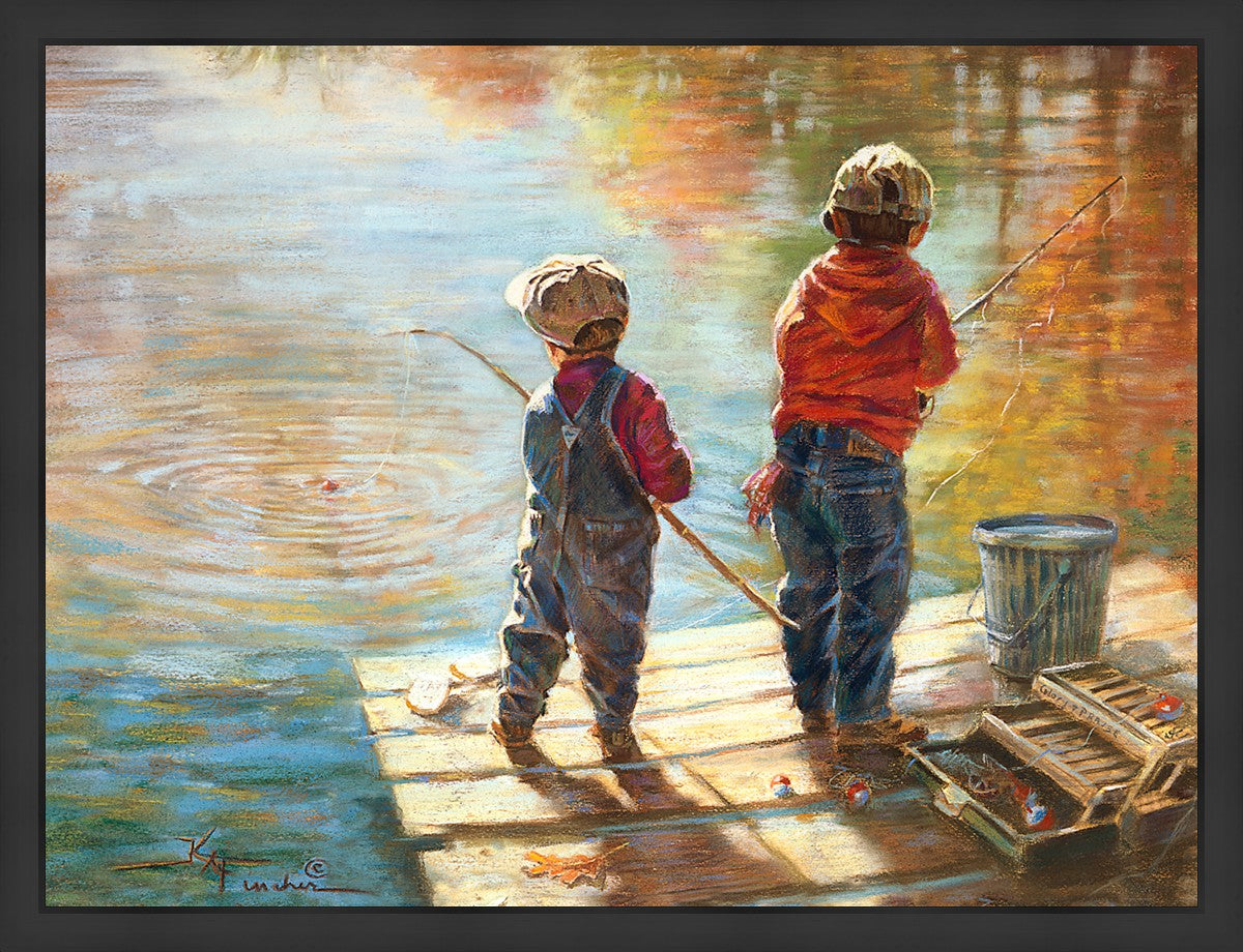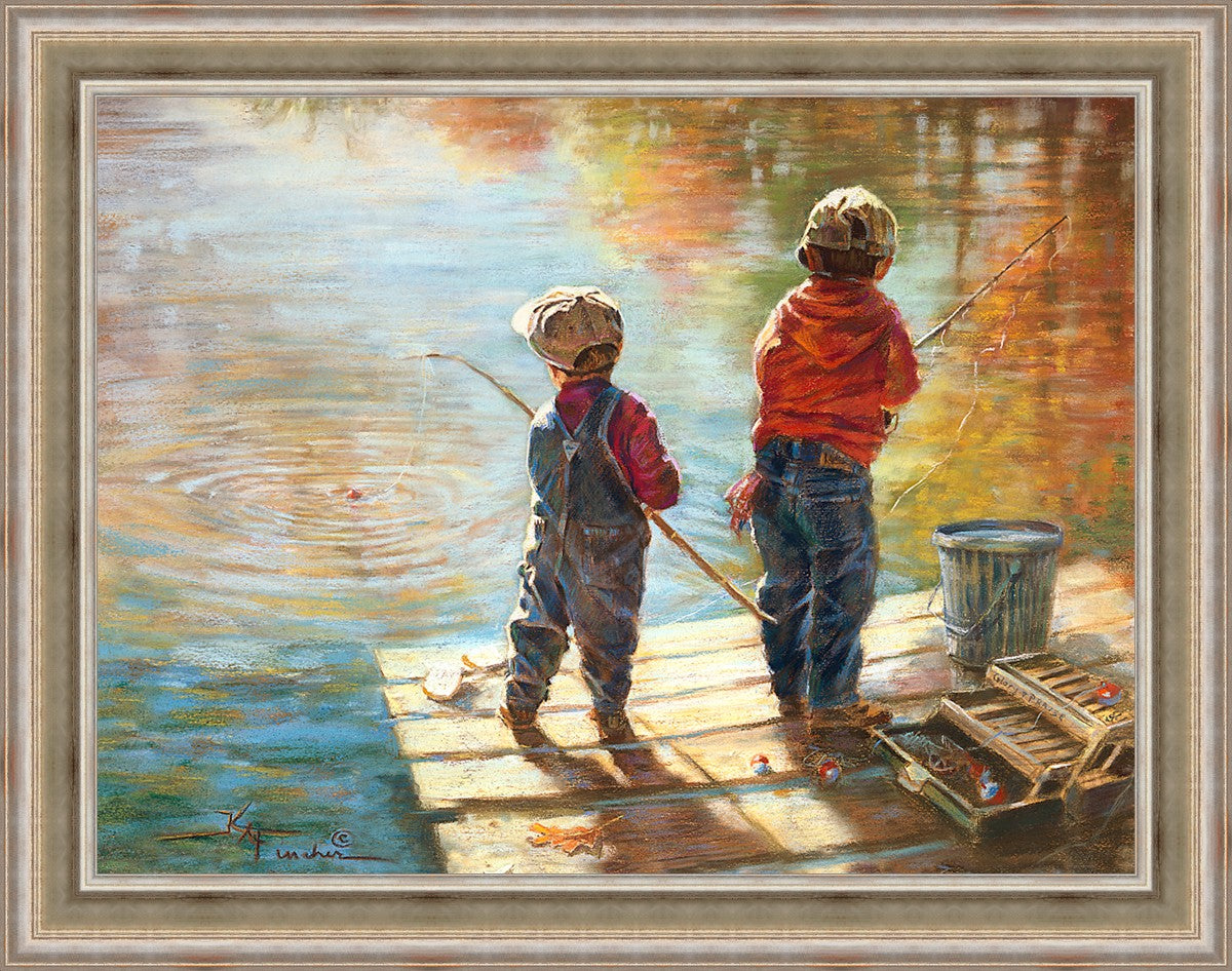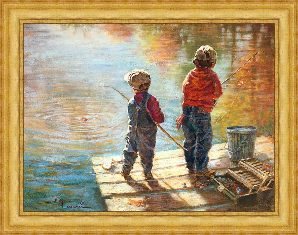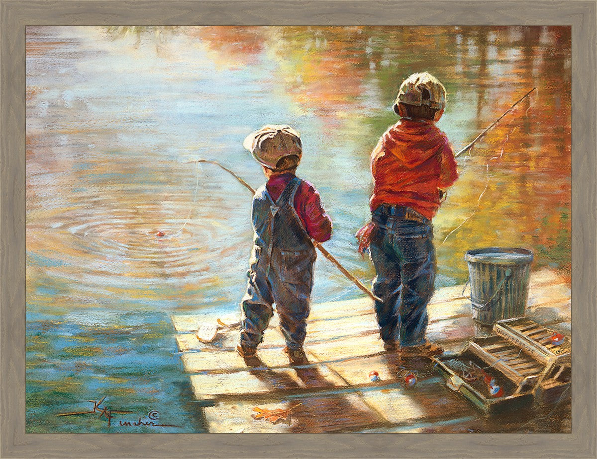 You’re a Keeper shares the story of two brothers learning to fish. The older brother proudly holds a new rod and reel with a fully stocked tacklebox at his feet. It is doubtful he will catch anything, for his line is slack and knotted. His younger brother is fishing with the basics—a cane pole and bread ball. He is awarded a bouncing bobber with a bite and quickly learns that it’s no longer fishing when you have a bite!