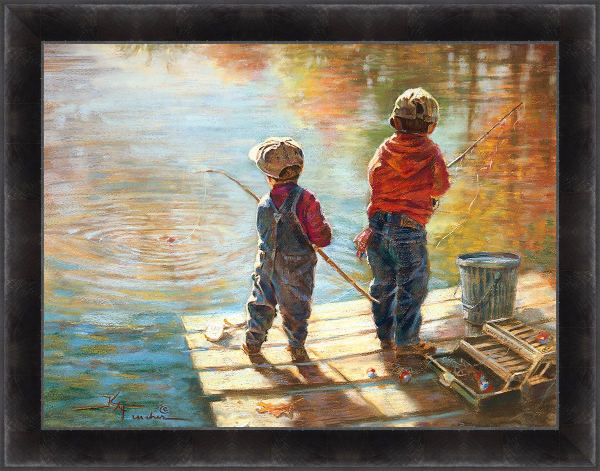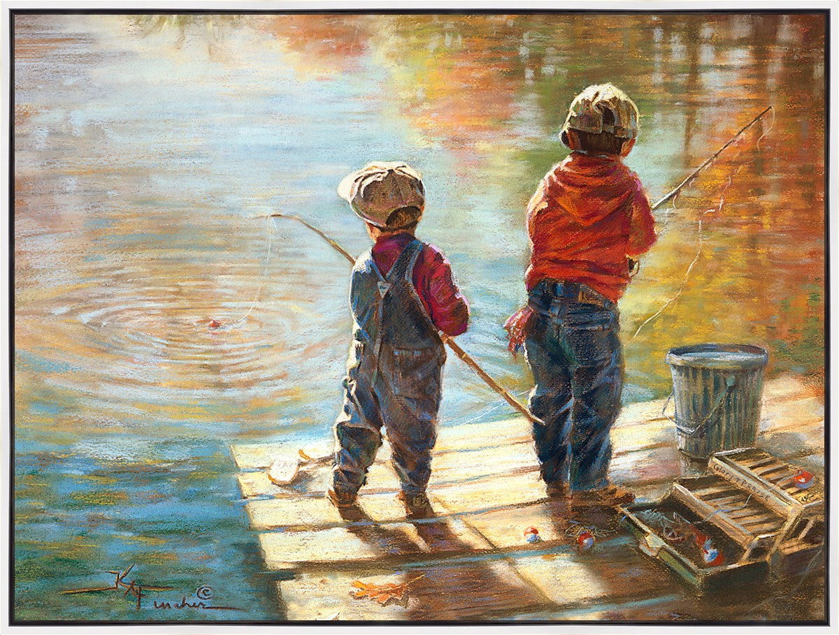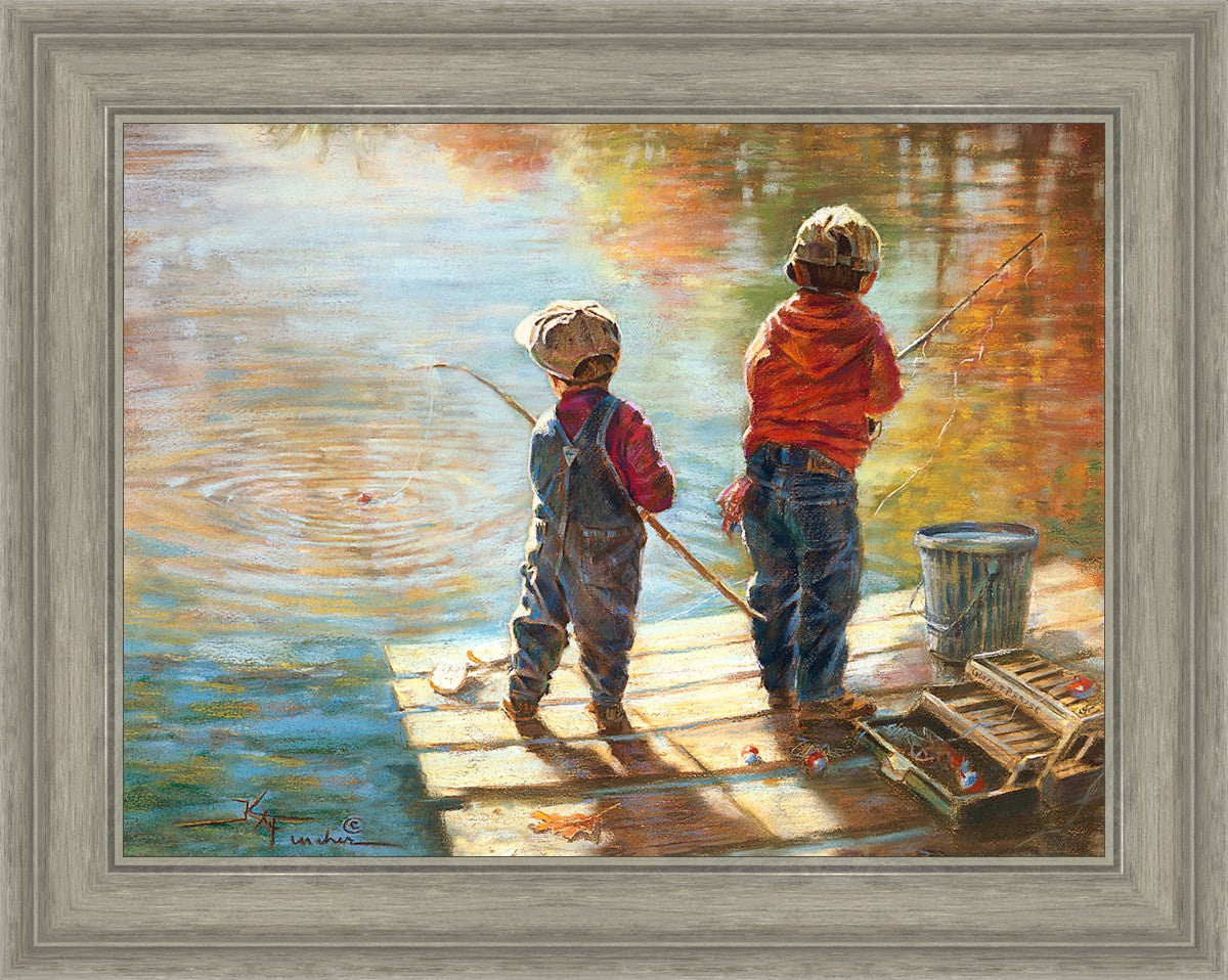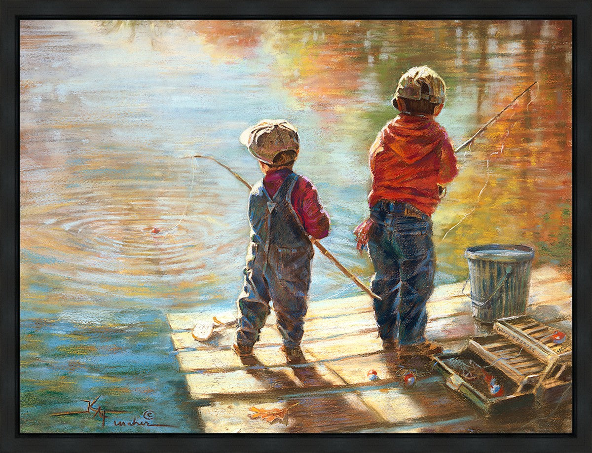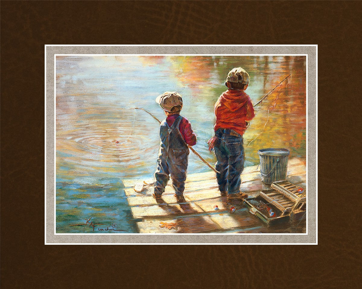 You’re a Keeper shares the story of two brothers learning to fish. The older brother proudly holds a new rod and reel with a fully stocked tacklebox at his feet. It is doubtful he will catch anything, for his line is slack and knotted. His younger brother is fishing with the basics—a cane pole and bread ball. He is awarded a bouncing bobber with a bite and quickly learns that it’s no longer fishing when you have a bite!