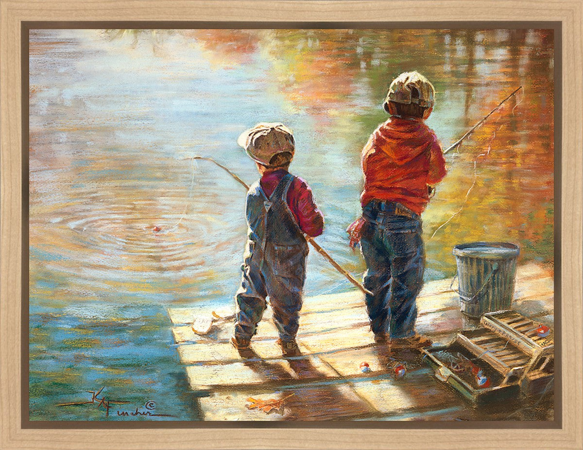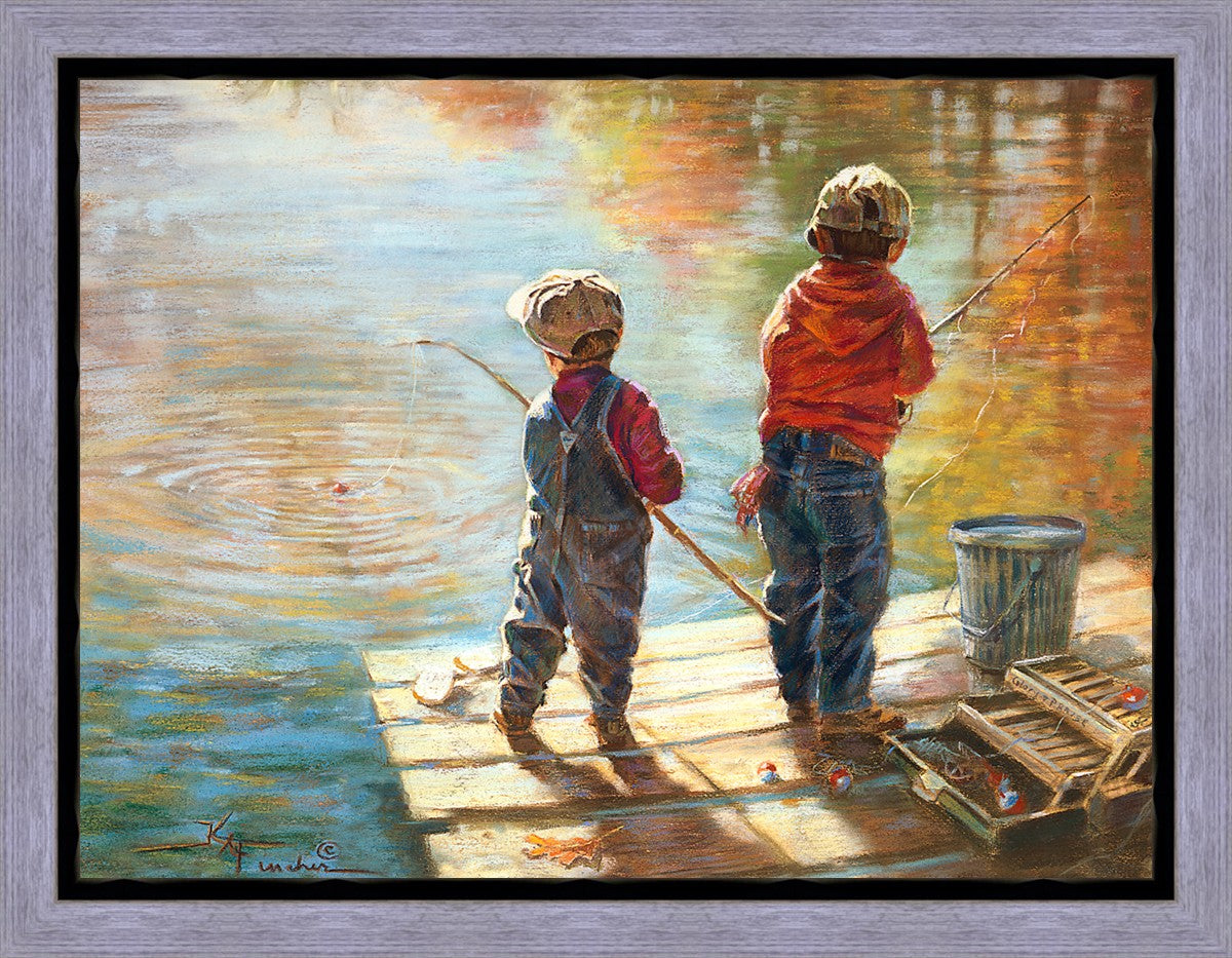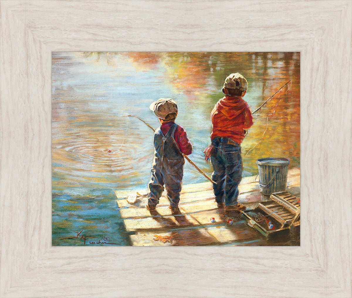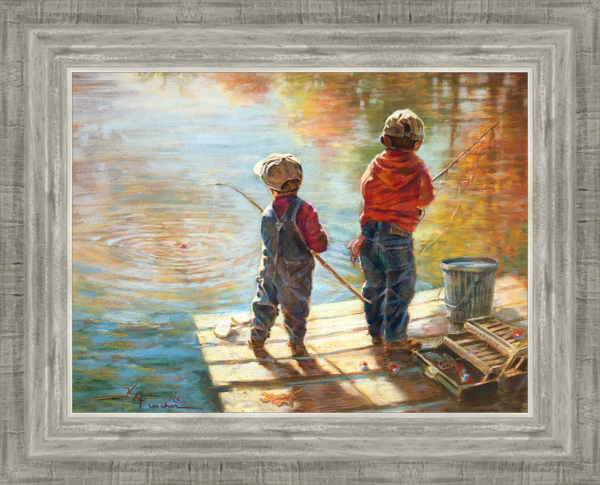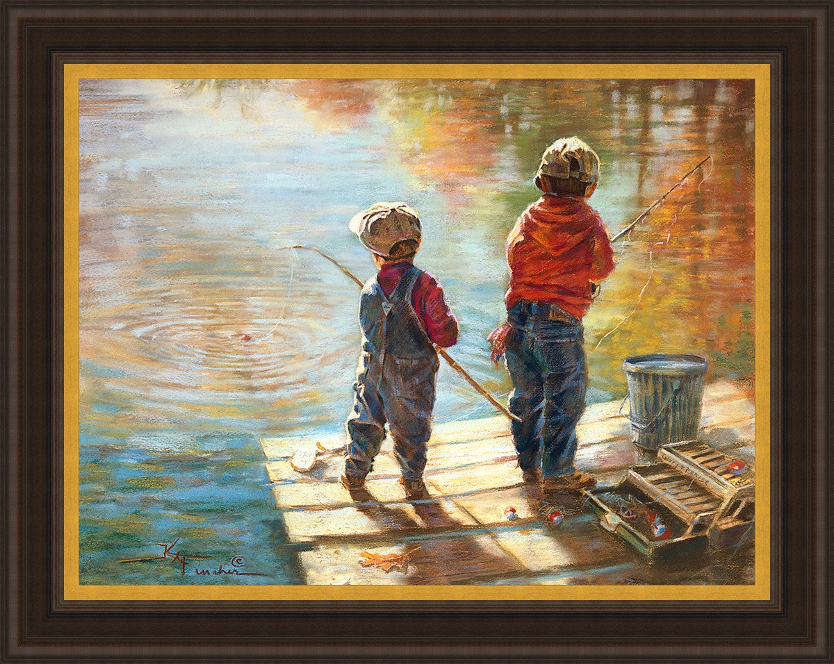 You’re a Keeper shares the story of two brothers learning to fish. The older brother proudly holds a new rod and reel with a fully stocked tacklebox at his feet. It is doubtful he will catch anything, for his line is slack and knotted. His younger brother is fishing with the basics—a cane pole and bread ball. He is awarded a bouncing bobber with a bite and quickly learns that it’s no longer fishing when you have a bite!