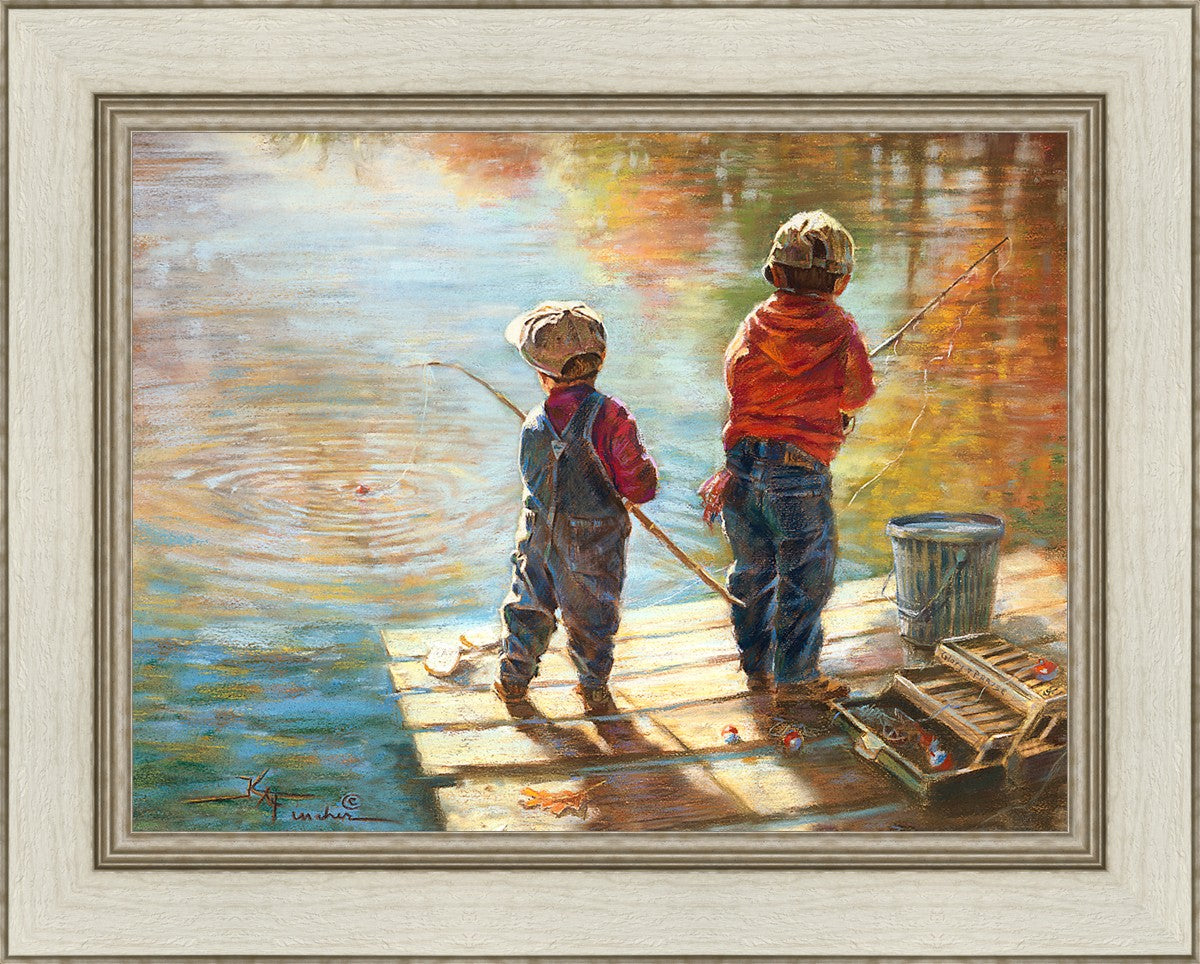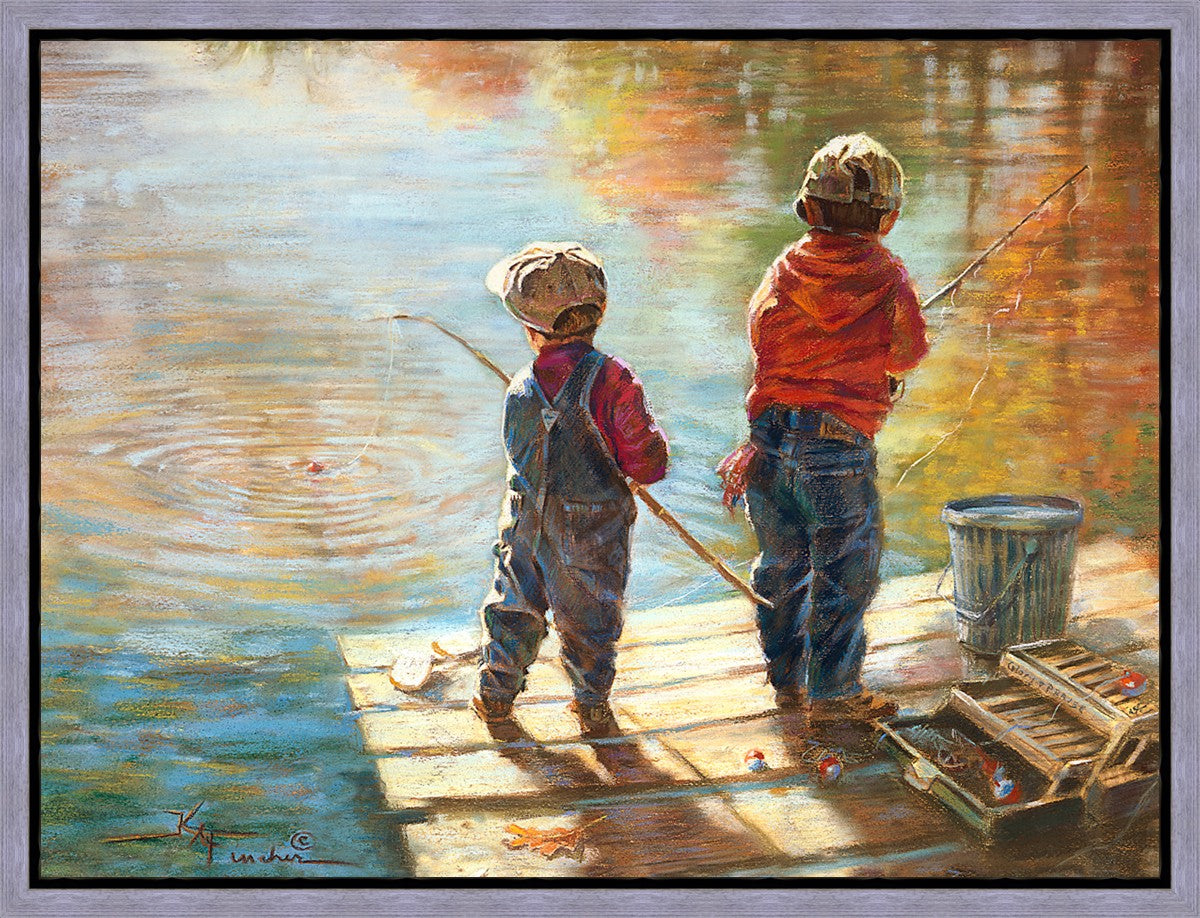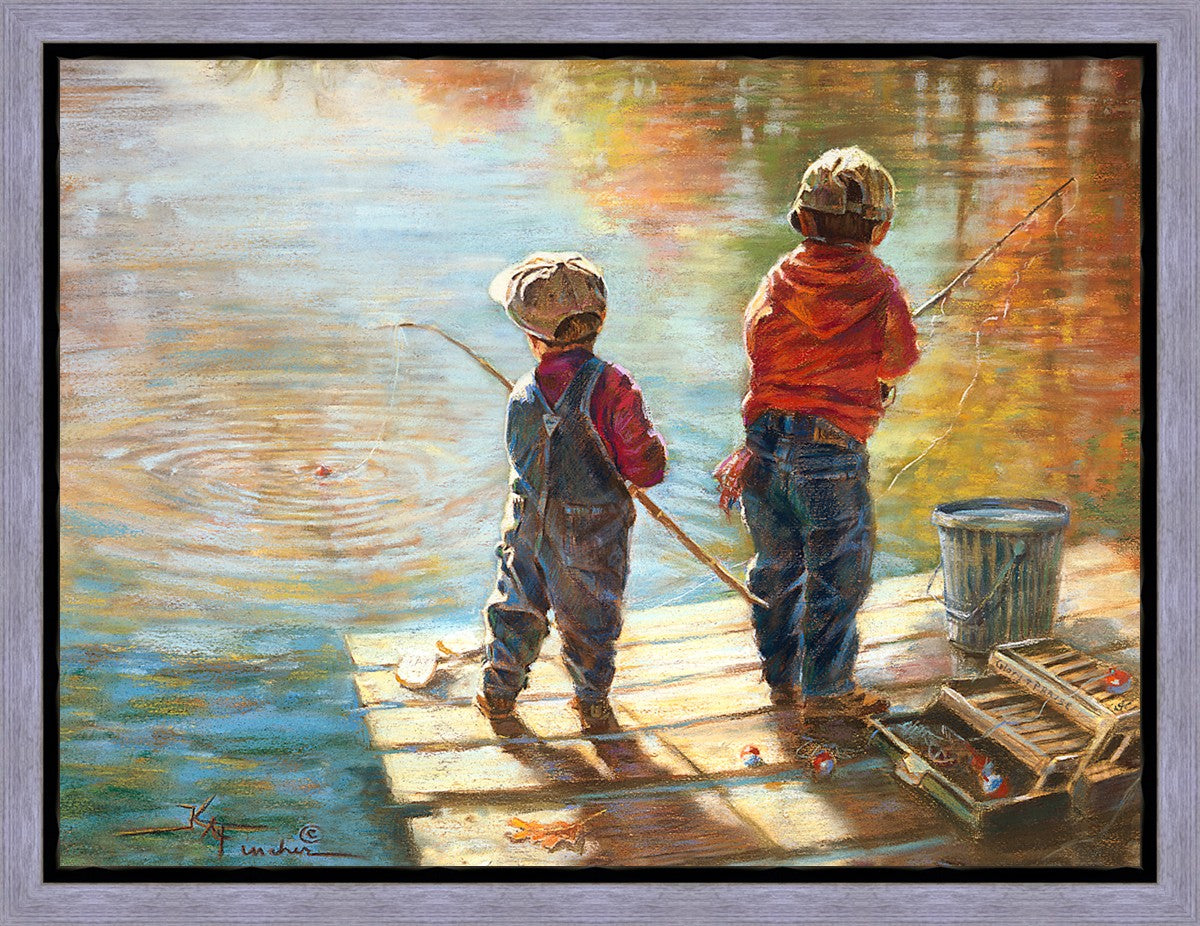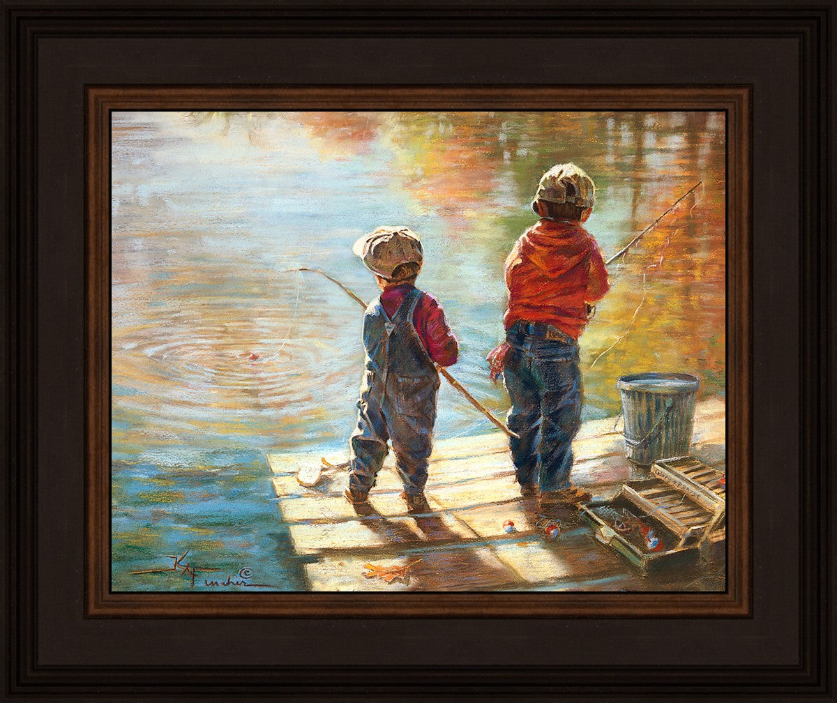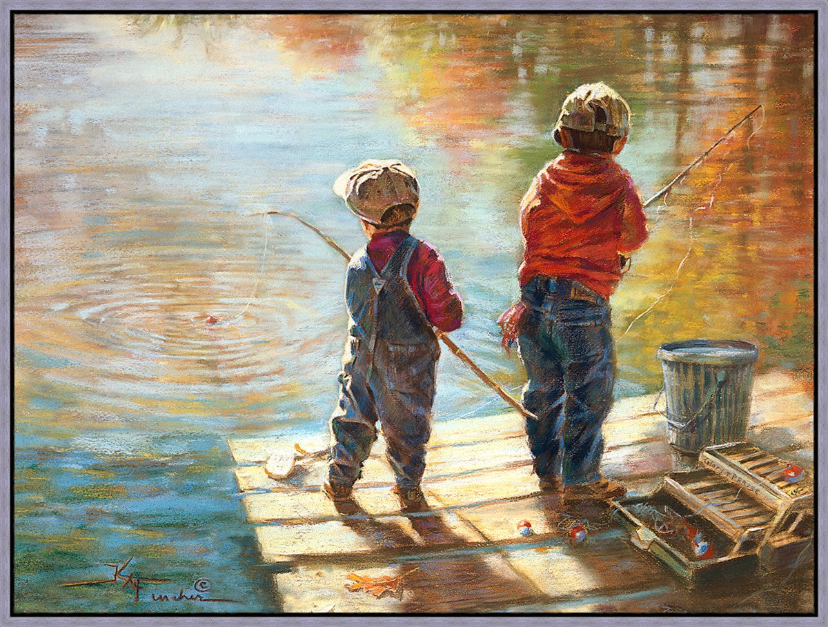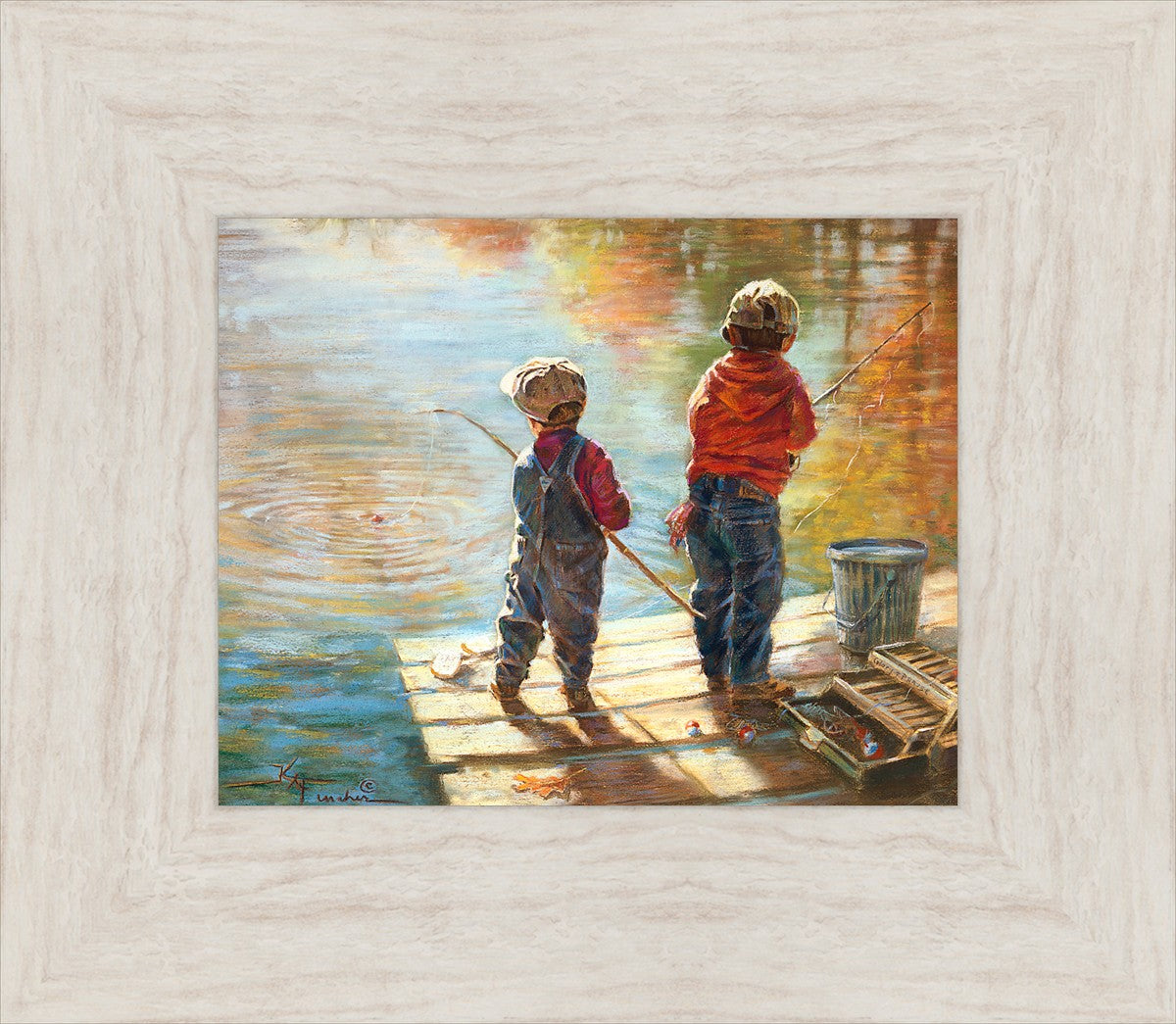You’re a Keeper shares the story of two brothers learning to fish. The older brother proudly holds a new rod and reel with a fully stocked tacklebox at his feet. It is doubtful he will catch anything, for his line is slack and knotted. His younger brother is fishing with the basics—a cane pole and bread ball. He is awarded a bouncing bobber with a bite and quickly learns that it’s no longer fishing when you have a bite!