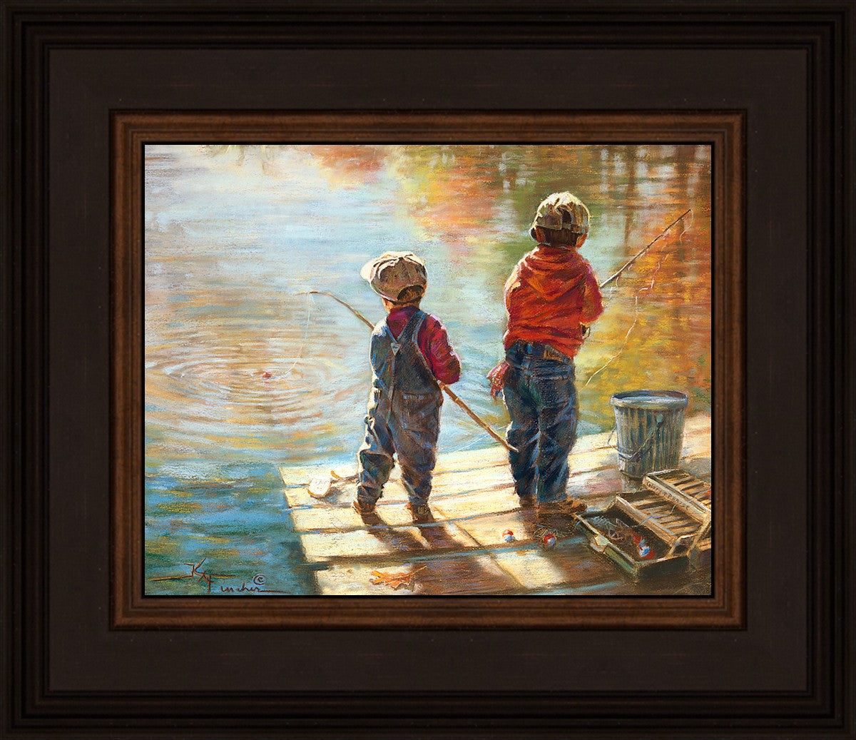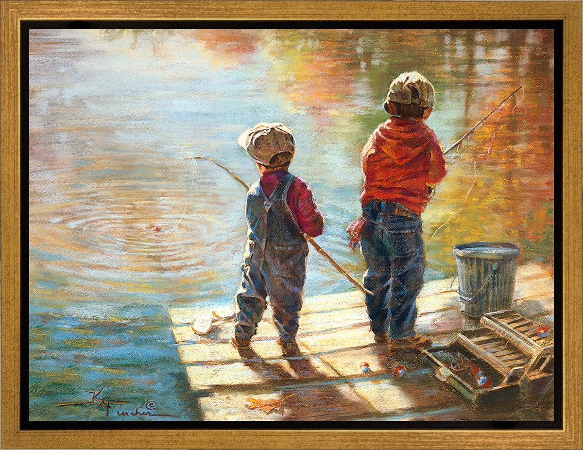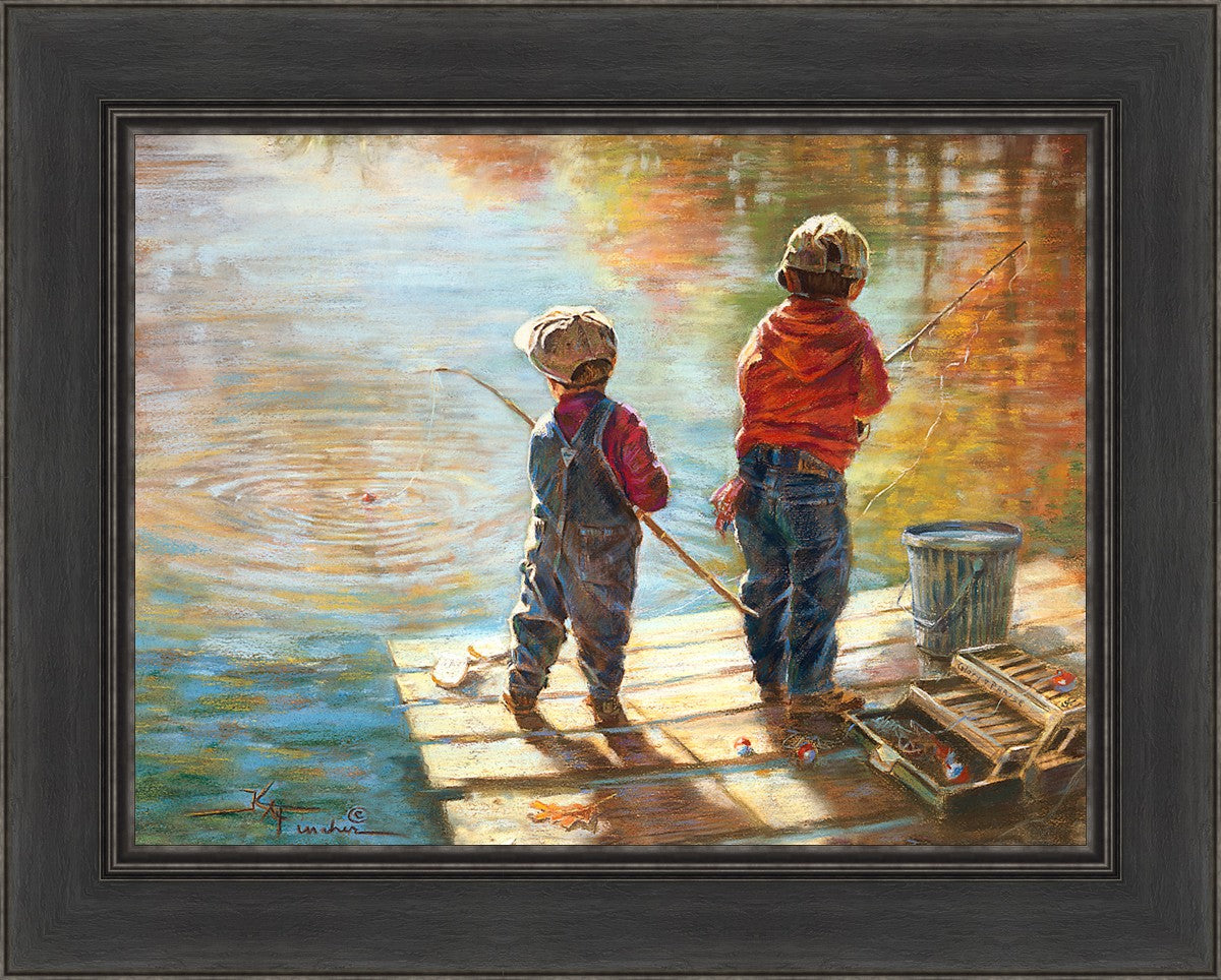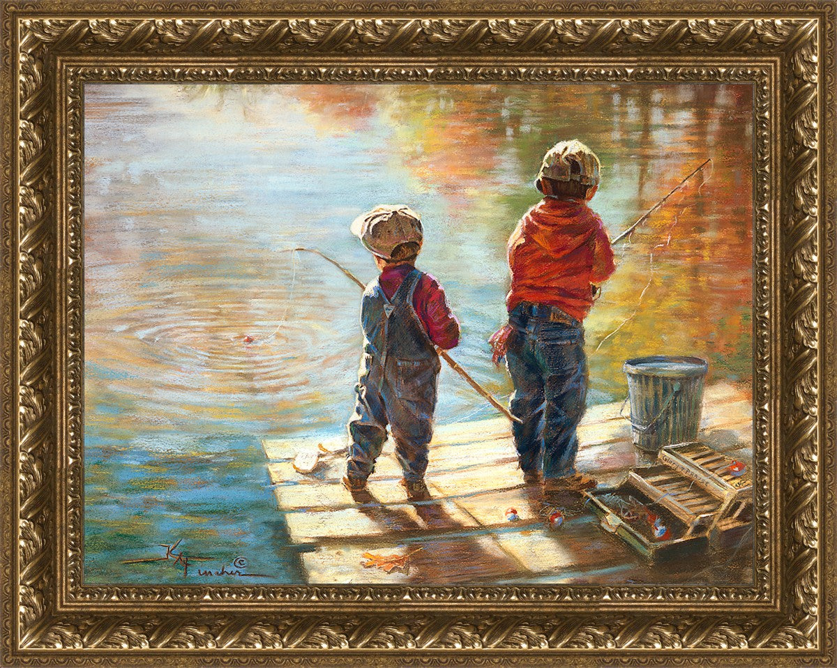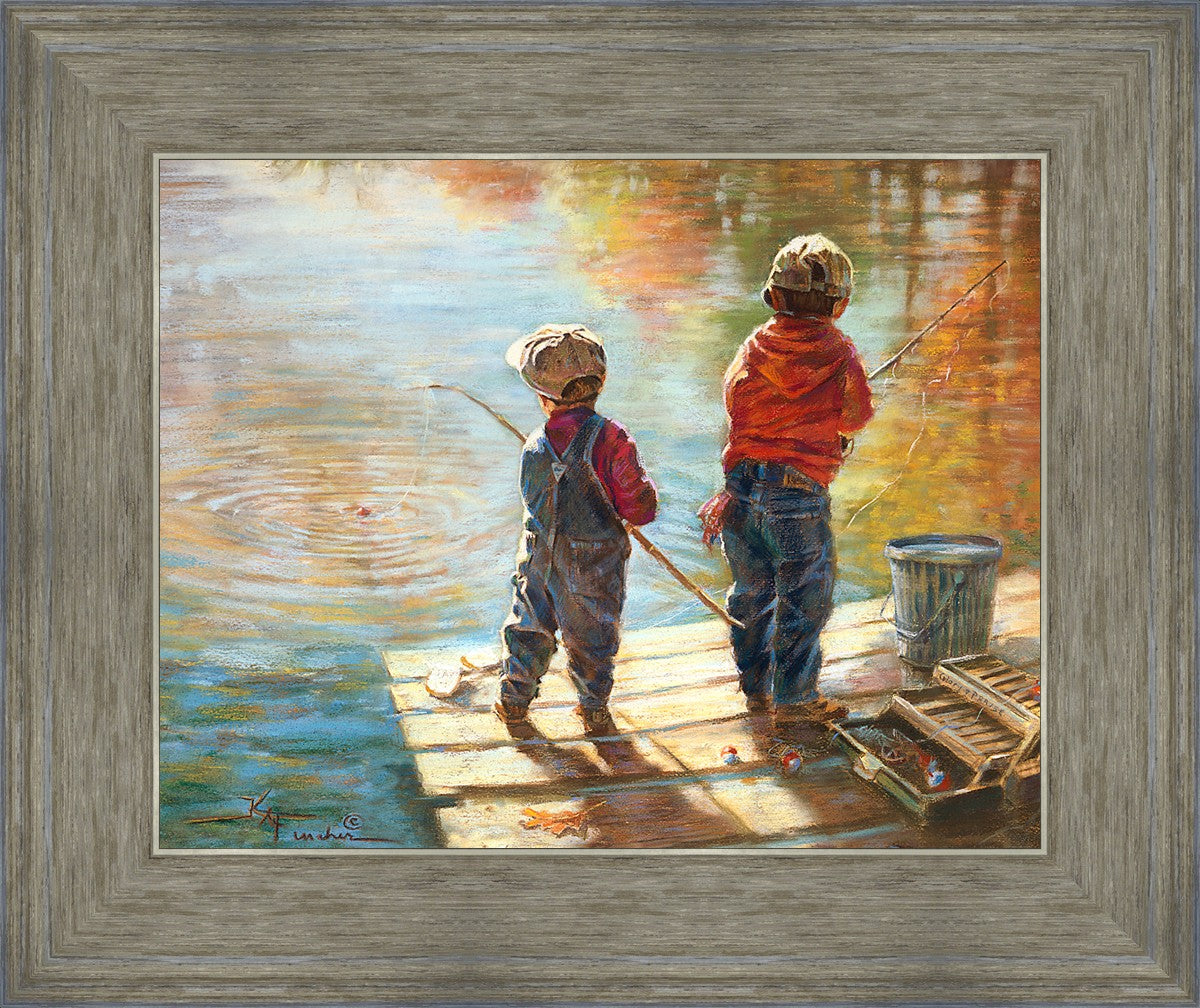 You’re a Keeper shares the story of two brothers learning to fish. The older brother proudly holds a new rod and reel with a fully stocked tacklebox at his feet. It is doubtful he will catch anything, for his line is slack and knotted. His younger brother is fishing with the basics—a cane pole and bread ball. He is awarded a bouncing bobber with a bite and quickly learns that it’s no longer fishing when you have a bite!